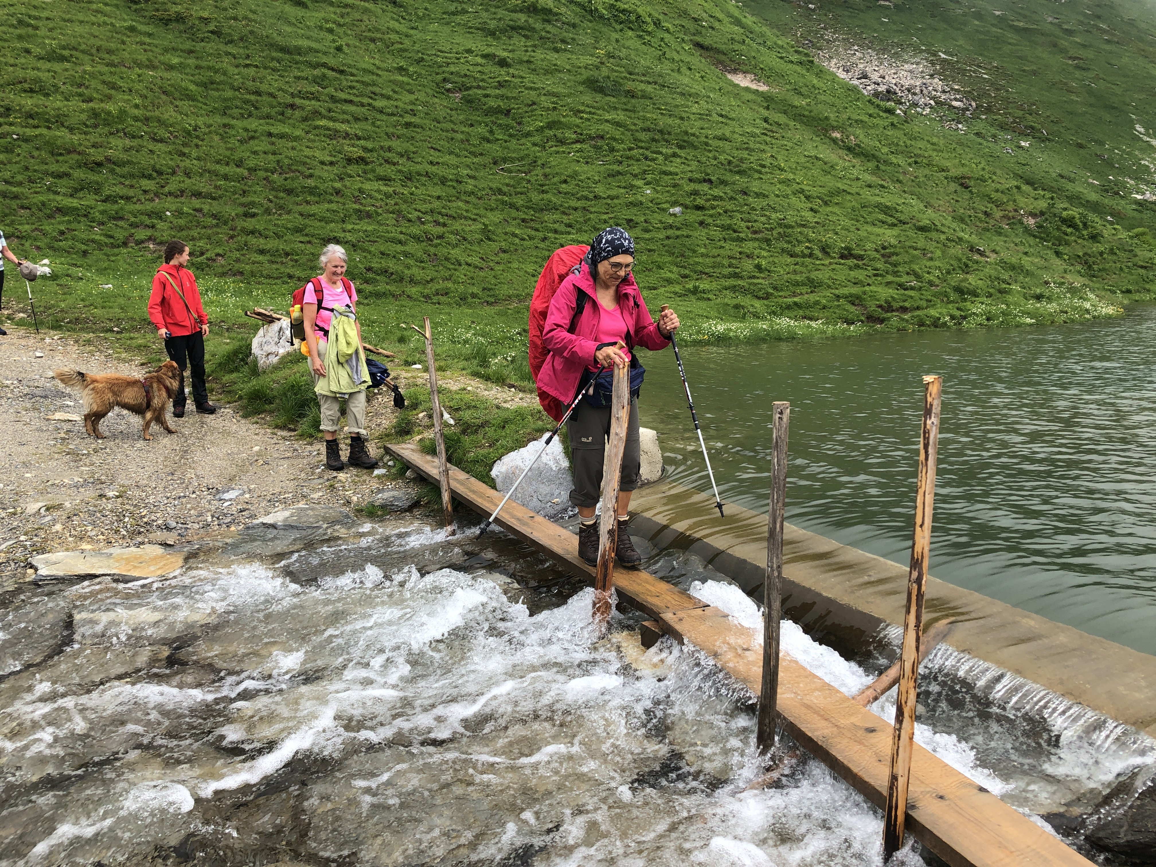 Der Anreisetag war mit der bangen Frage verbunden, wie die Wetterlage vor Ort denn sein werde, denn in der Nacht vorher hatte es in weiten Teilen der Alpen Starkregen, Hochwasser und Murenabgänge gegeben. Doch die Radstädter Tauern blieben vor Schlimmerem verschont und so konnte der Zustieg zur Hütte zwar in Regenkleidung, aber ohne Störungen bewältigt werden. Die Niederschläge der letzten Tage machten allerdings die geplante Wanderung Richtung Windischscharte unmöglich. Wo eigentlich Wege sein sollten, waren Bäche. Also zurück in die gemütliche, vor 8 Jahren völlig neu gebaute Hütte. Die überaus gastfreundlichen Pächter bieten hier ausschließlich vegetarische Küche, den acht Frauen war das nur recht!