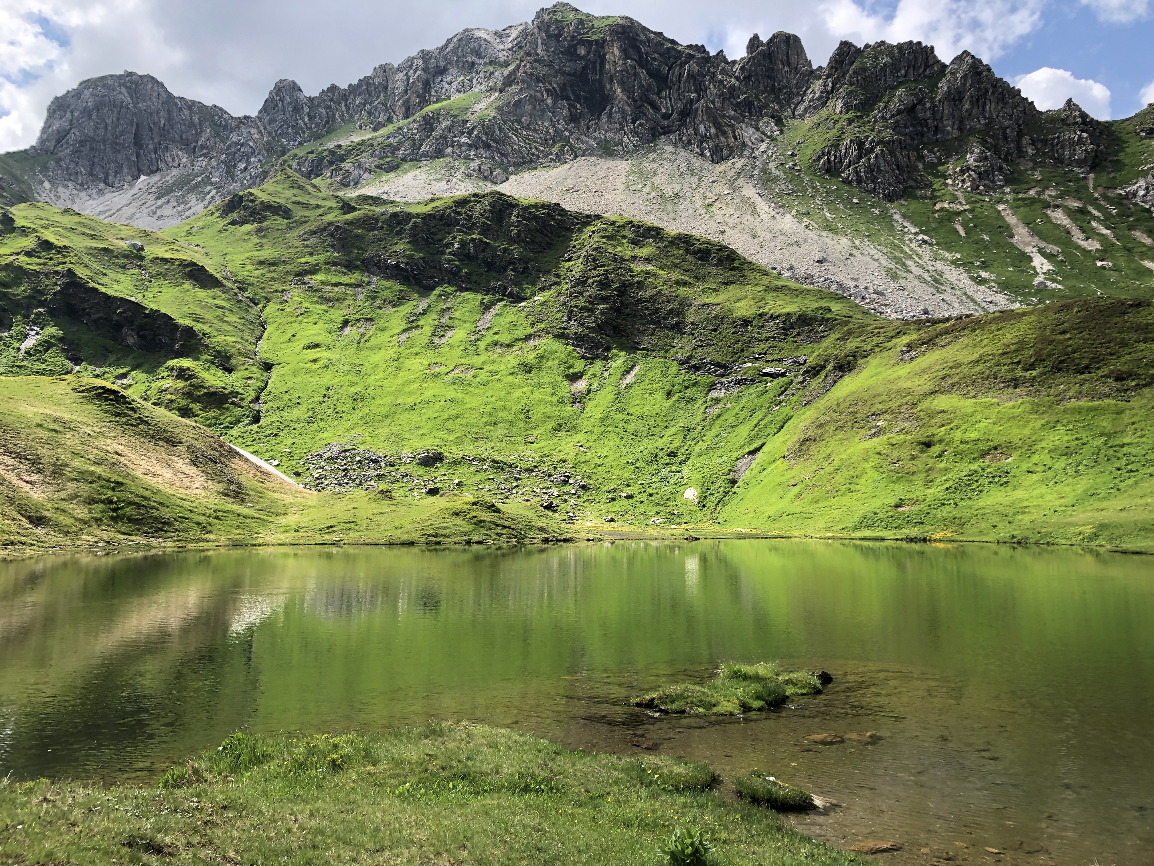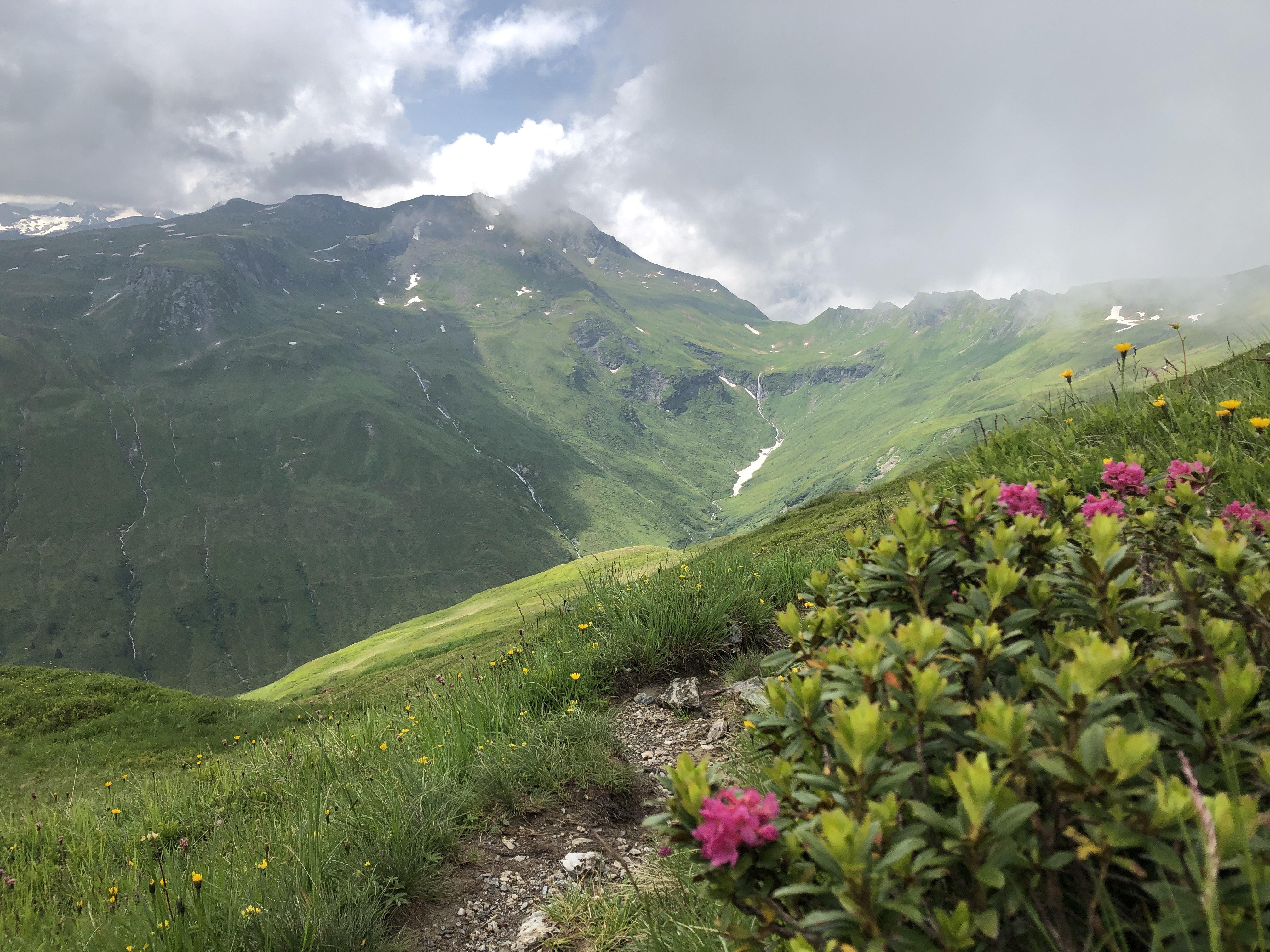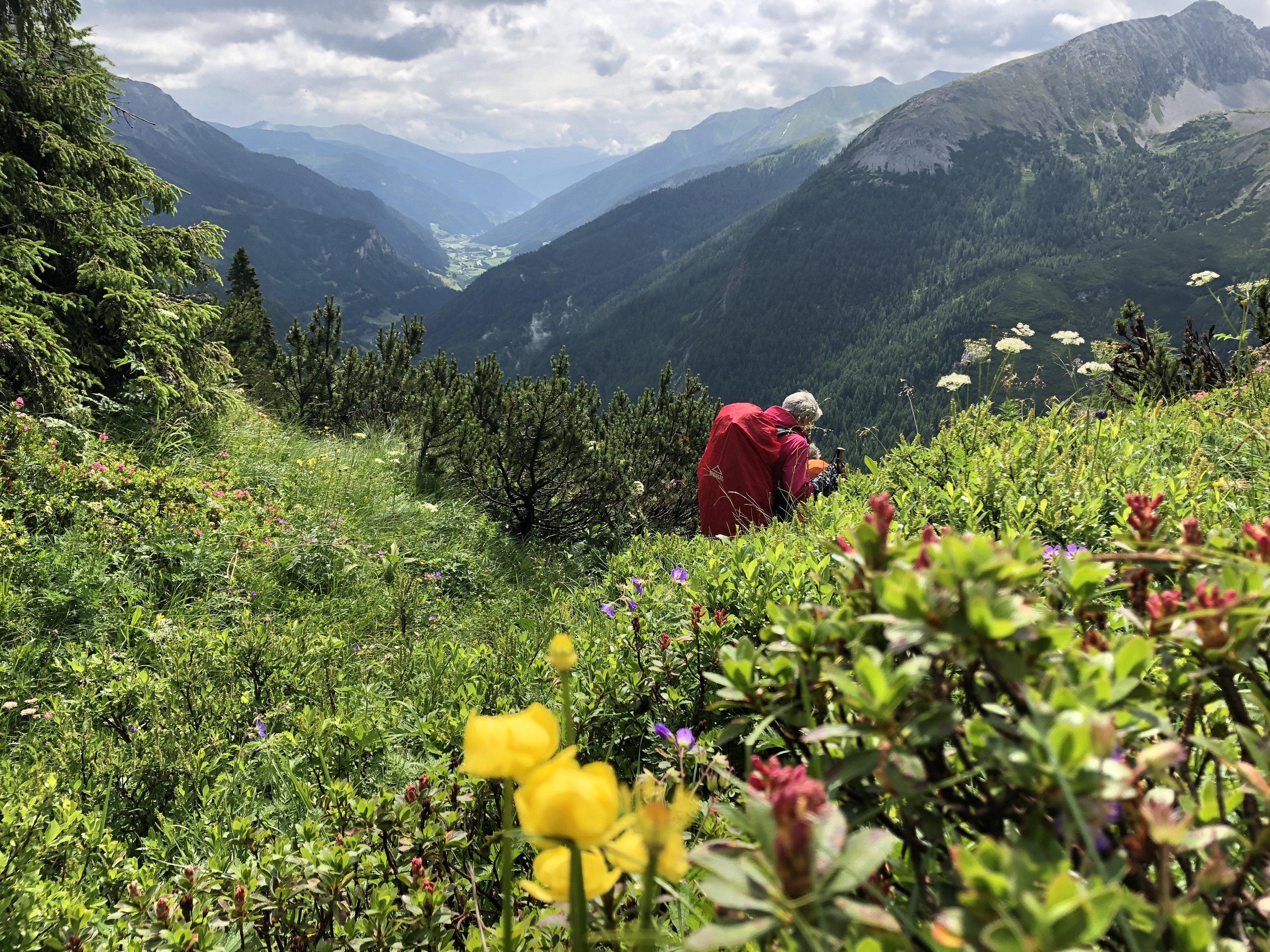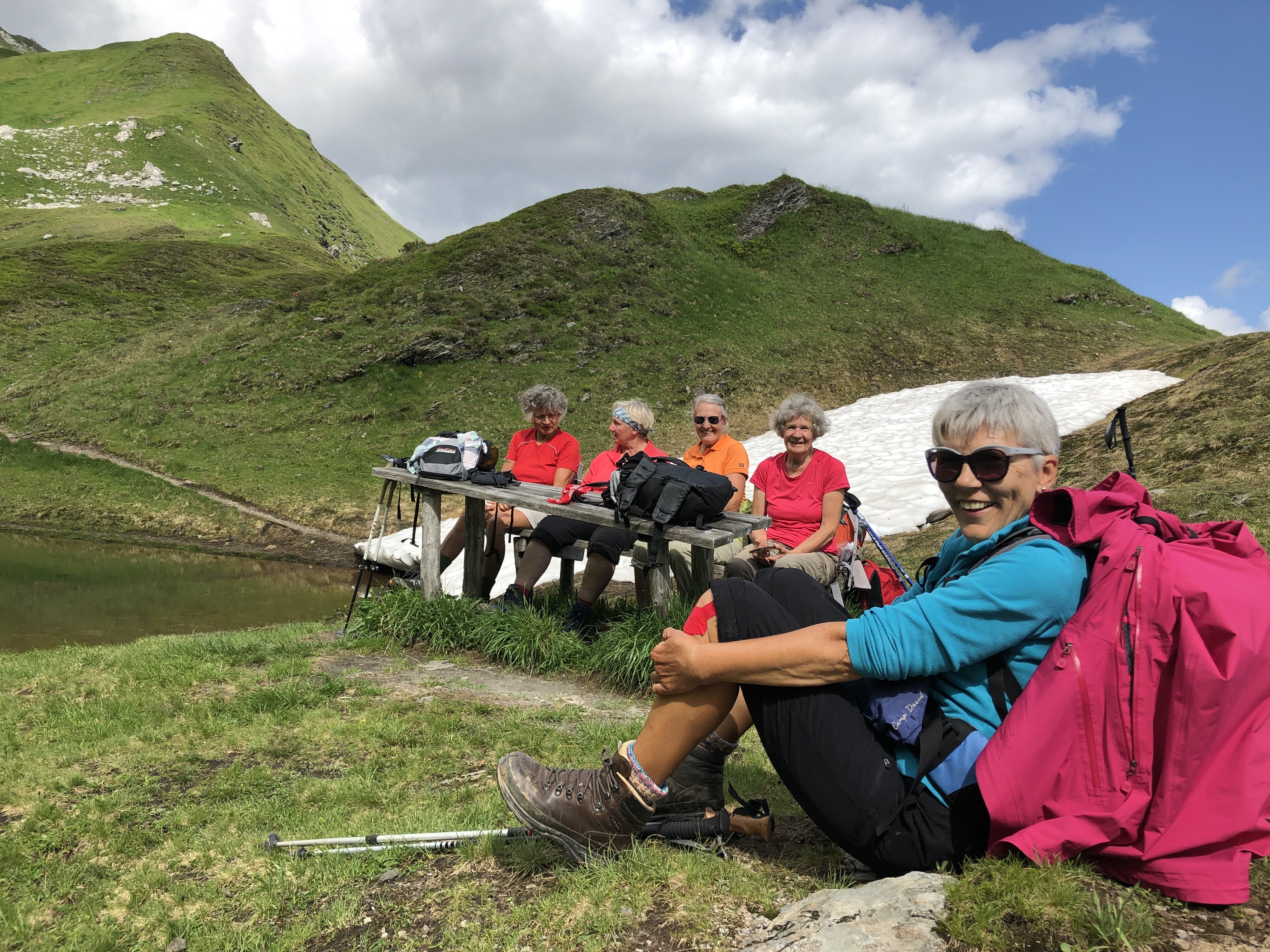 Am zweiten Tag konnte Tourenleiterin Inge Hitzenberger das Programm dann wie geplant und bei bestem Wetter durchführen. Eine lange Wanderung führte in stetem Auf und Ab zunächst über die Ilgseen, wo immer noch Schneefelder zu queren waren, und das Haselloch Richtung Tappenkarsee. Für den Rückweg über die Weißgrubenscharte waren weitere 400 Höhenmeter zu überwinden, bevor es wieder bergab Richtung Hütte ging. Den ganzen Tag gab es viel zu schauen, denn hier oben stehen Alpenrosen, Enziane, Soldanellen und vieles mehr in voller Blüte – einige Wochen später als üblich.