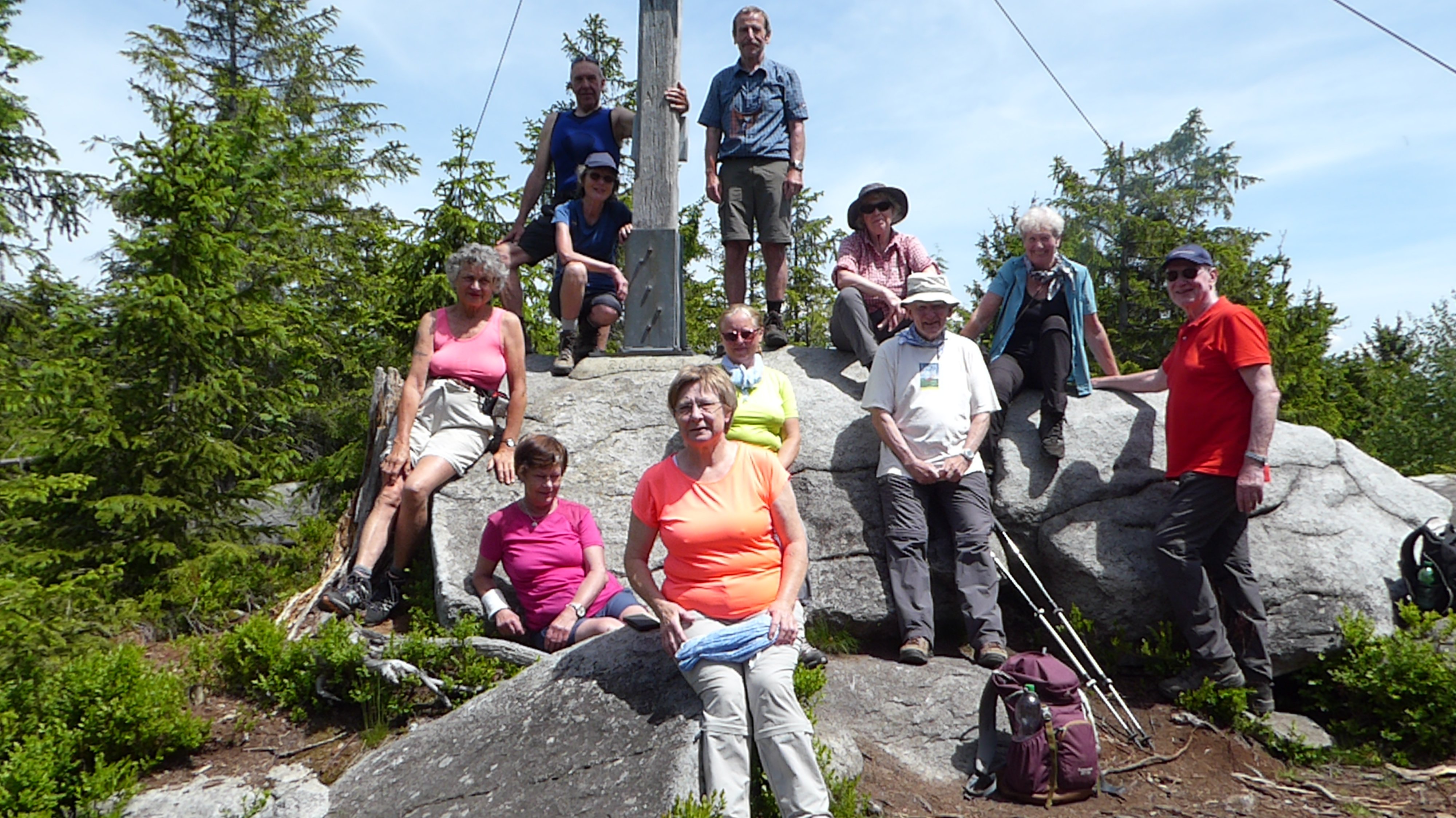 Nach langer Coronapause unternahmen auch die Alpenvereinssenioren ihre erste Wanderung. 12 Wanderer starteten zu einer Tour um Bischofsmais im Bay. Wald. Mit Tourenleiterin Elfriede Niedermeier wurde zuerst über die Wastlsäge zum "Teufelstisch" aufgestiegen. Auf felsigem Steig, vorbei an schönen Aussichtsplätzen (beste Aussicht zur Stadt Regen) und aufgetürmten Felsformationen ging es weiter nach Unterbreitenau. Von der Talstation der Gaiskopfbahn führte der Weg auf Forstwegen, dannauf einem Waldsteig zum Einödriegel 1121 m. Beim großen Gipfelkreuz , auf einer Lichtung mit Aussicht, umgeben von Steinblöcken, wurde eine Rast eingelegt. Das nächste Ziel war der Gaiskopfgipfel mit seinem Aussichtsturm (1097 m). Hier konnten die umliegenden Berge auf Schautafeln bestimmt werden. Auf schönem Waldweg gelangten die Wanderer zum Bergwirtshaus "Landshuter Haus", wo noch eine Rast eingelegt wurde. Der Abstieg auf einem Waldsteig führte noch nach St. Hermann, ein Wallfahrtsort, der früher große Bedeutung hatte. Mit vielen interessanten Eindrücken kehrten die Wanderer nach Bischofsmais zurück.
