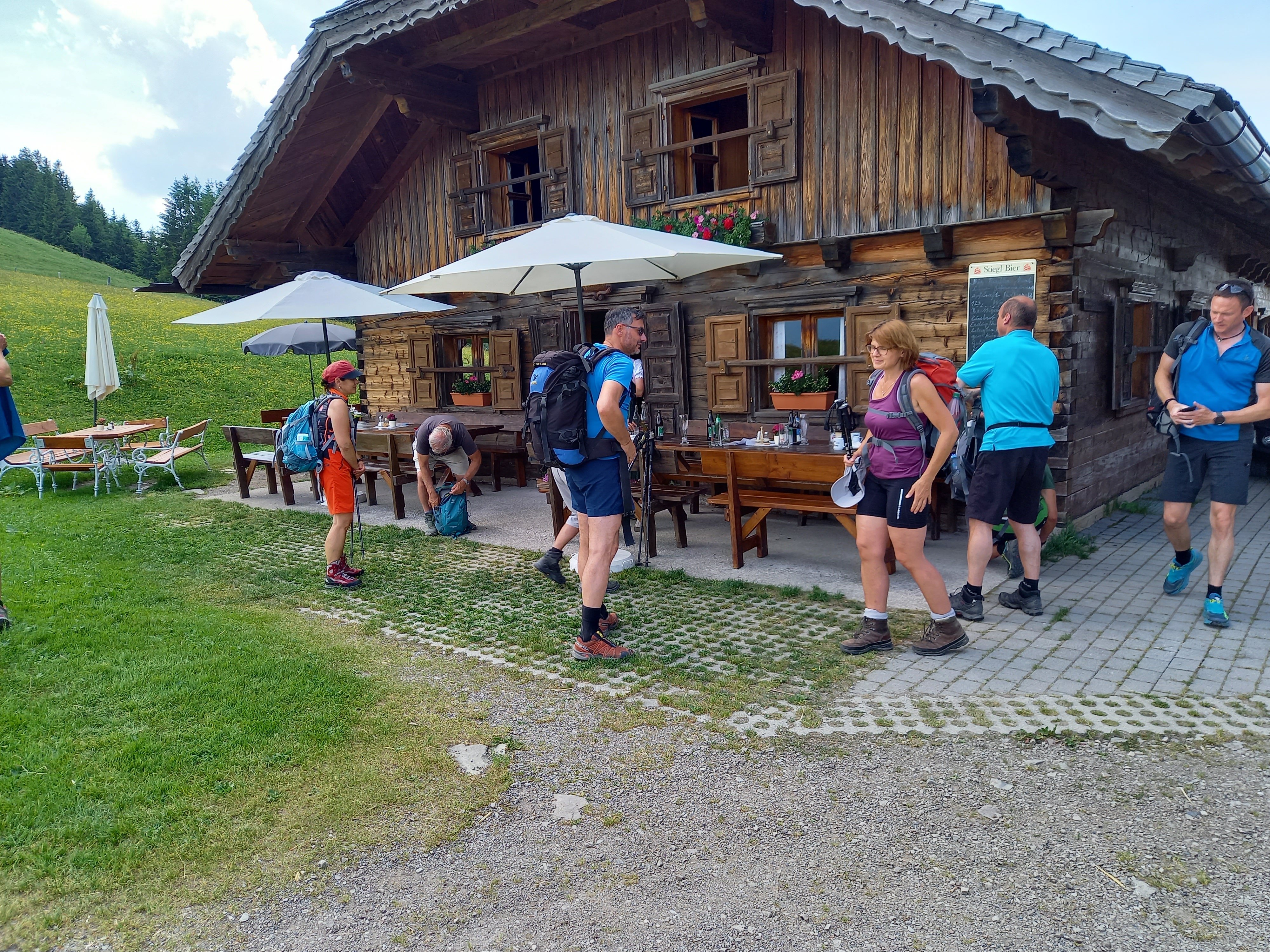 Danach ging es zuerst zurück auf den Sattel, wo zwar zwei Almen schon auf die Bergwanderer warteten, jedoch ließ man es sich nicht nehmen noch den kurzen Anstieg zur Loibersbacher Höhe zu bezwingen. Auch hier wurde man mit einen phantastischen Rundumblick auf die weiter entfernten und höheren Berge belohnt, ein installiertes Panoramabild erleichterte die Bestimmung der jeweiligen Gipfel. So konnte man sogar den Hausberg der Laufener Hütte, den Fritzerkogel im Tennengebirge, identifizieren und im Nordwesten die Laufener Heimat erahnen. Anschließend folgte die ersehnte Einkehr auf der Döllerer Hütte, wo man äußerst freundlich und zuvorkommend von den beiden feschen Damen im Dirndlgwand sehr fein verköstigt wurde.