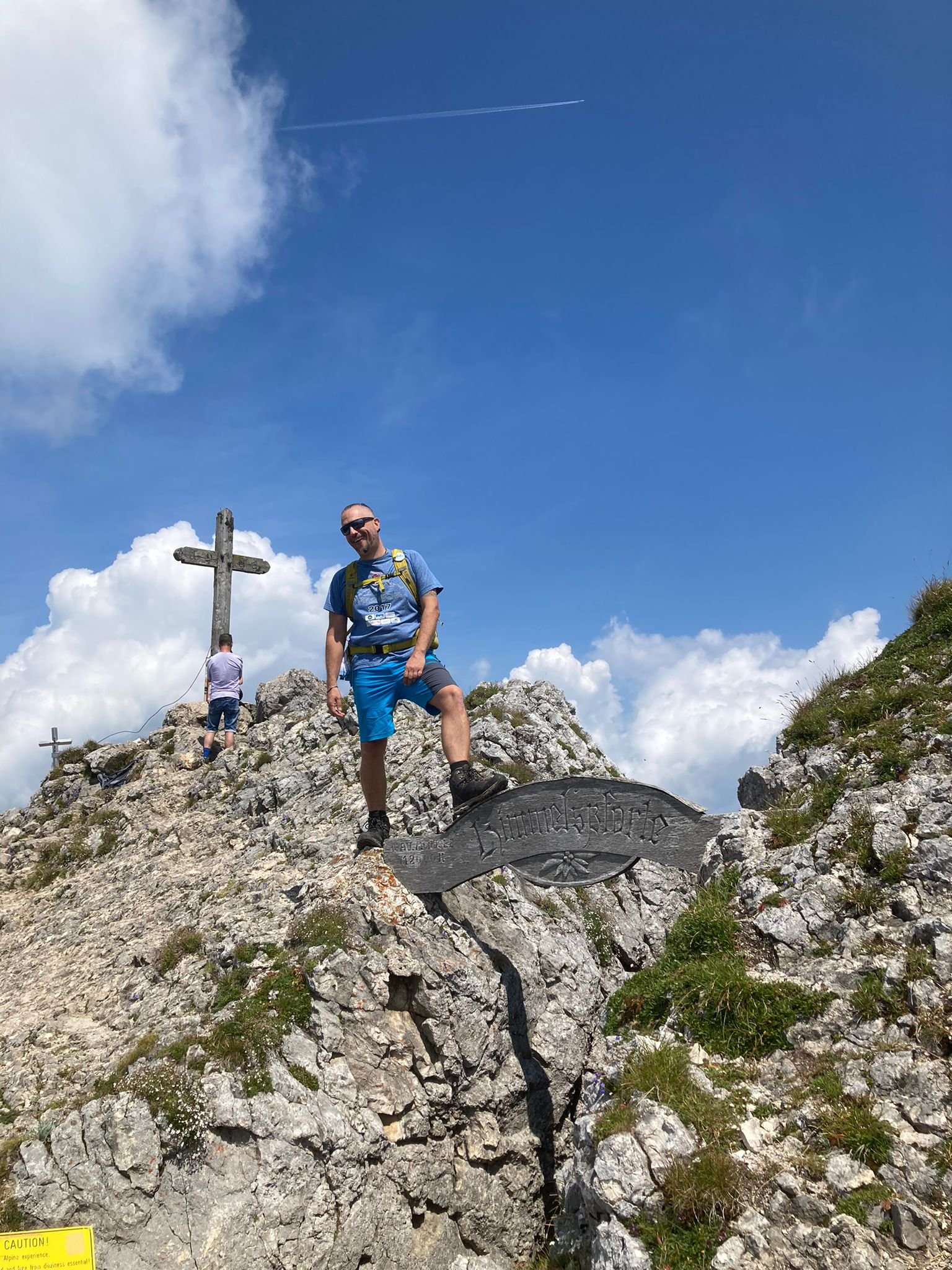 Kurz vor Unterach am Attersee startete eine dreiköpfige Wandergruppe des Alpenvereines Pfarrkirchen an einem herrlich-heißen Sommertag den langen und anstrengenden Aufstieg auf den 1.782m hohen Schafberg, um dann einmal das Gipfelmassiv zu umrunden.. Tourenleiter Marcus Urban wählte den nordseitigen Anstieg aus um den Touristenscharen zu entgehen die vom Wolfgangsee bevorzugt mit der Zahnradbahn den Berggipfel besuchen. In einer ersten steilen Passage erklomm man zu erst das Hochplateau der Eisenauer Almen. Hier erblickten die Wanderer zum ersten mal die schroffen und imposanten Felswände des Tageszieles. Über Almenwiesen und einen Steig durch den Wald erreichte man bal die Scharte oberhalb des Suissensees, hier zweigte die Gipfelrunde rechts ab und man erklomm über einen, zum Teil drahtseilversicherten Steig, die Himmelspforte. Ein Felsdurchschlupf kurz vorm Gipfel ist hier mit einem Bogen überspannt und als Himmelspforte benannt. Ein wirklich schöner Tiefblick durch diese bestätigt die Namensgebung. Das Gipfelkreuz des Schafberges steht auf 1740 m, der Gipfel ist tatsächlich 1782m hoch, aber durch das Schafberghotel "verbaut". Diesen touristischen Treffpunkt verließ die Gruppe schnellstmöglich und begab sich auf der Rundtour um den Schafberg auf den Purtscheller Steig. Hier war man fast alleine unterwegs, stieg dabei unter anderem über seilgesicherte Stufen und mit herrlichem Ausblick zum Mönichsee ab und querte hier wieder Richtung Norden, zuerst zum Mittersee. Dabei handelt es sich um einen wundervollen kleinen Bergsee mit herrlich frischem und klaren Wasser. Diesen See nutzen die Wanderer um bei einem erfrischenden Bad ihre Kräfte wieder zu stärken. Gut erholt ging es dann zurück zum Suissensee, wo man auf den Aufstiegsweg traf und direkt zur Buchberghütte auf der Eisenaueralm abstieg. Bei einer Brotzzeitpause auf der Sonnenterasse genoß man lokale Spezialitäten und eine herrliches Panorama. Wehmütig erfolgte der letzte Teil des Abstieges, so dass man letztlich ca. 1.500 Höhemmeter und knappe 20 Kilometer strecke überwunden hatte.