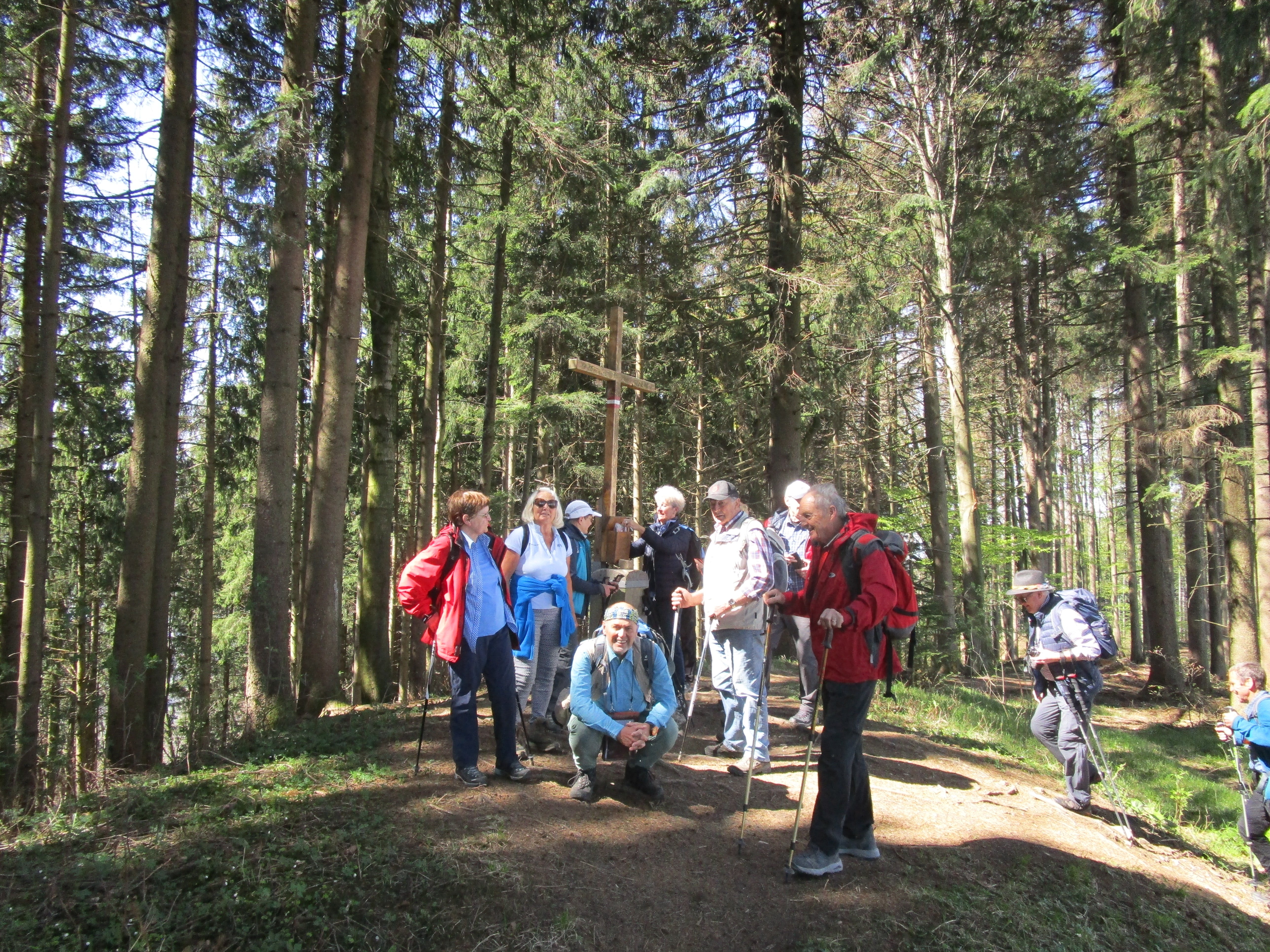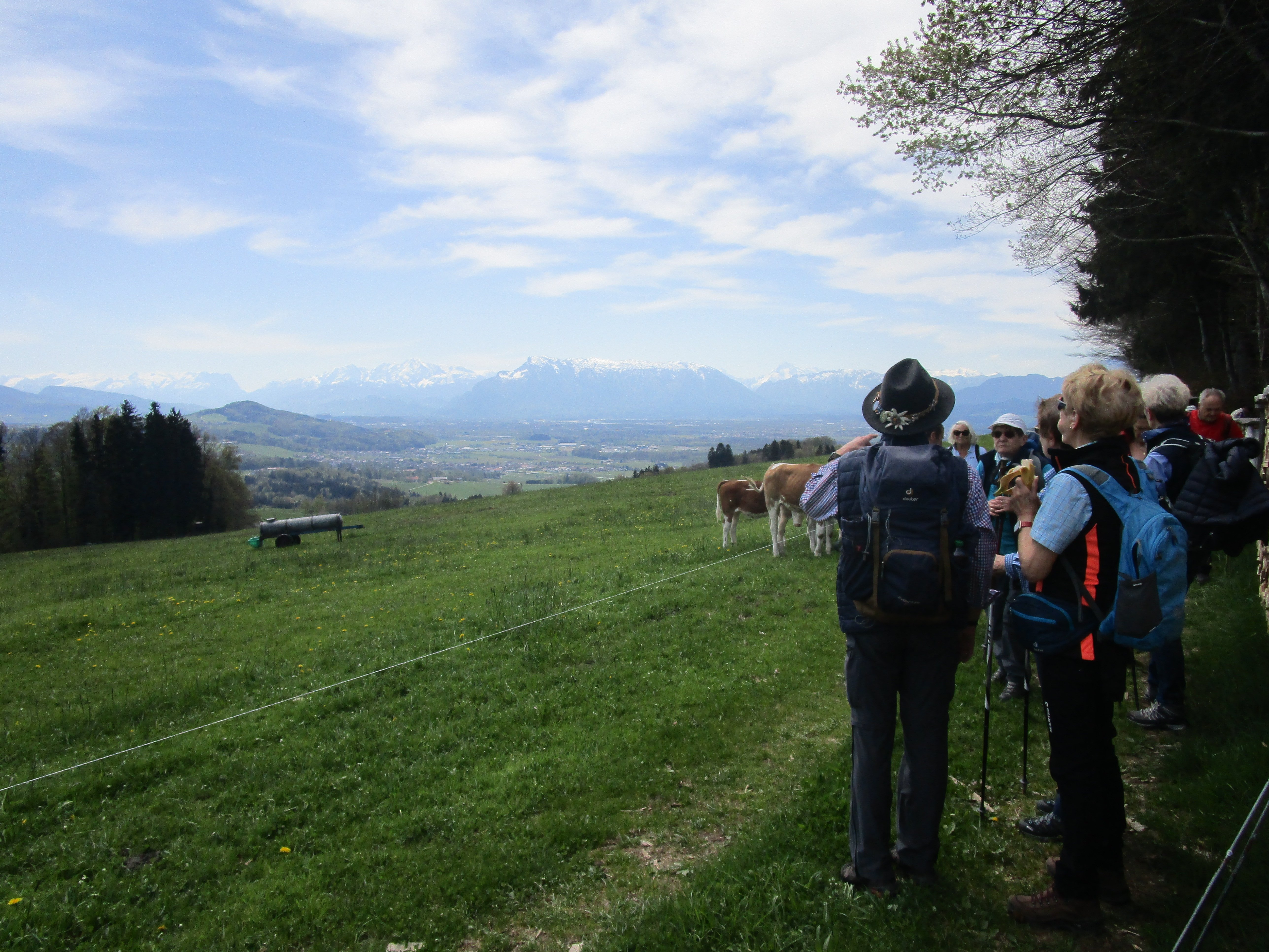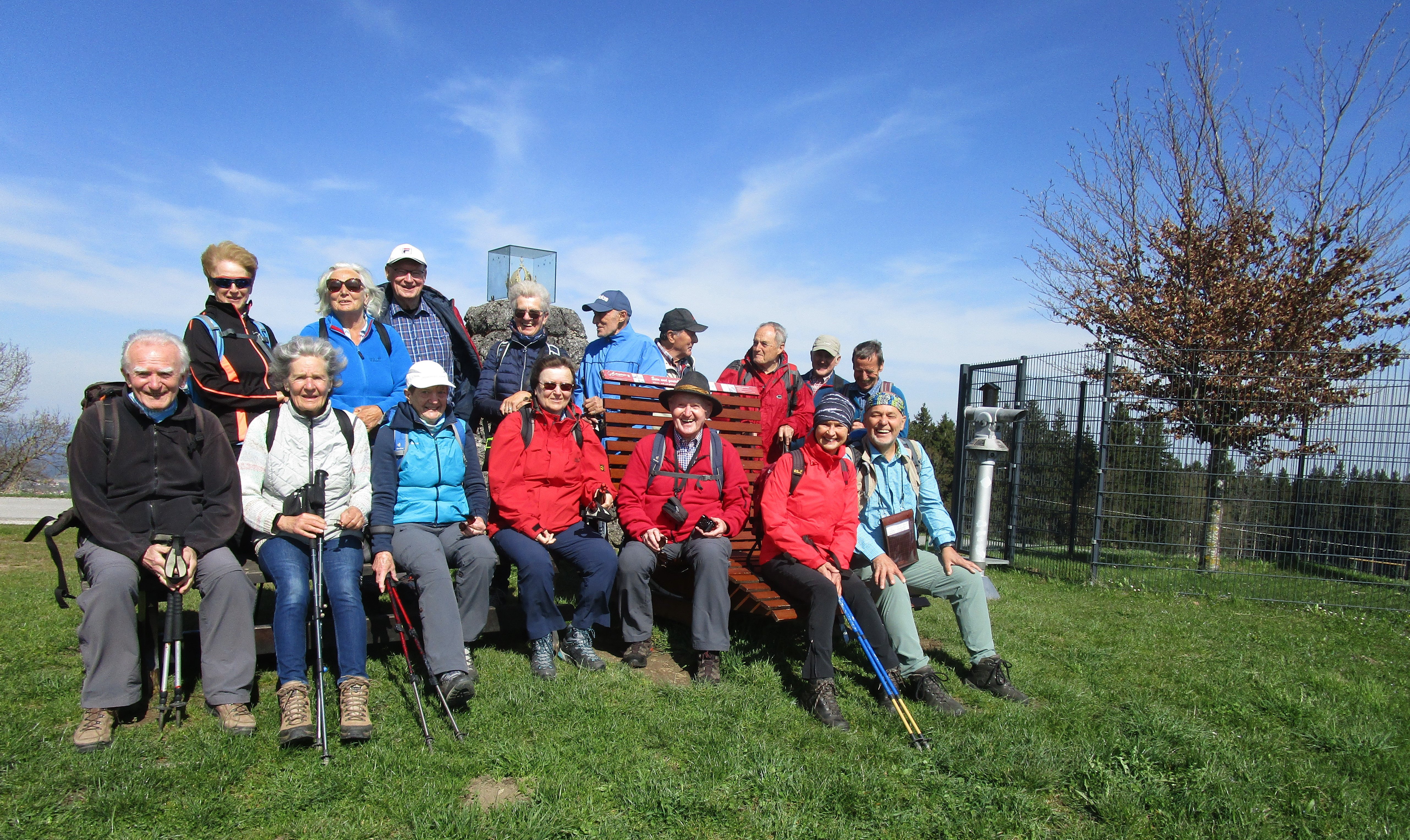 Nach Besichtigung und Erläuterung der Besonderheiten des Berges mit der Kaiserbuche, der Steinpyramide mit der goldenen Kaiserkrone und der Kaiser-Franz-Joseph-Gedächtnis-Kapelle durch den Tourenleiter erfolgte die Rundwanderung auf dem Panorama-Weg, anschließend hinauf zum Gipfel und wieder hinab zur Gabrielen-Aussicht. Sowohl nach Norden als auch nach Süden bot der 12 km lange Insel-Berg herrliche Fernblicke. Auch die Aussicht auf den Flachgau und Salzburg waren famos. Die Alpenkette war noch überwiegend schneebedeckt. Nach 3 Stunden war der Ausgangspunkt wieder erreicht. Auf der Weiterfahrt stand ein Besuch der Benediktiner-Abtei Michaelbeuren auf dem Programm. Auch hier informierte der Tourenleiter über die Geschichte des Klosters und seine derzeitigen Aufgaben für die 14 Mönche u.a. in einer Mittelschule sowie über die Bildungsangebote sowie Angebote für Exerzitien, Besinnungstage und Auszeiten. Zum Abschluss der Ü-75-Tour erfolgte die Einkehr in Mattighofen in der Pizzeria Paradiso.