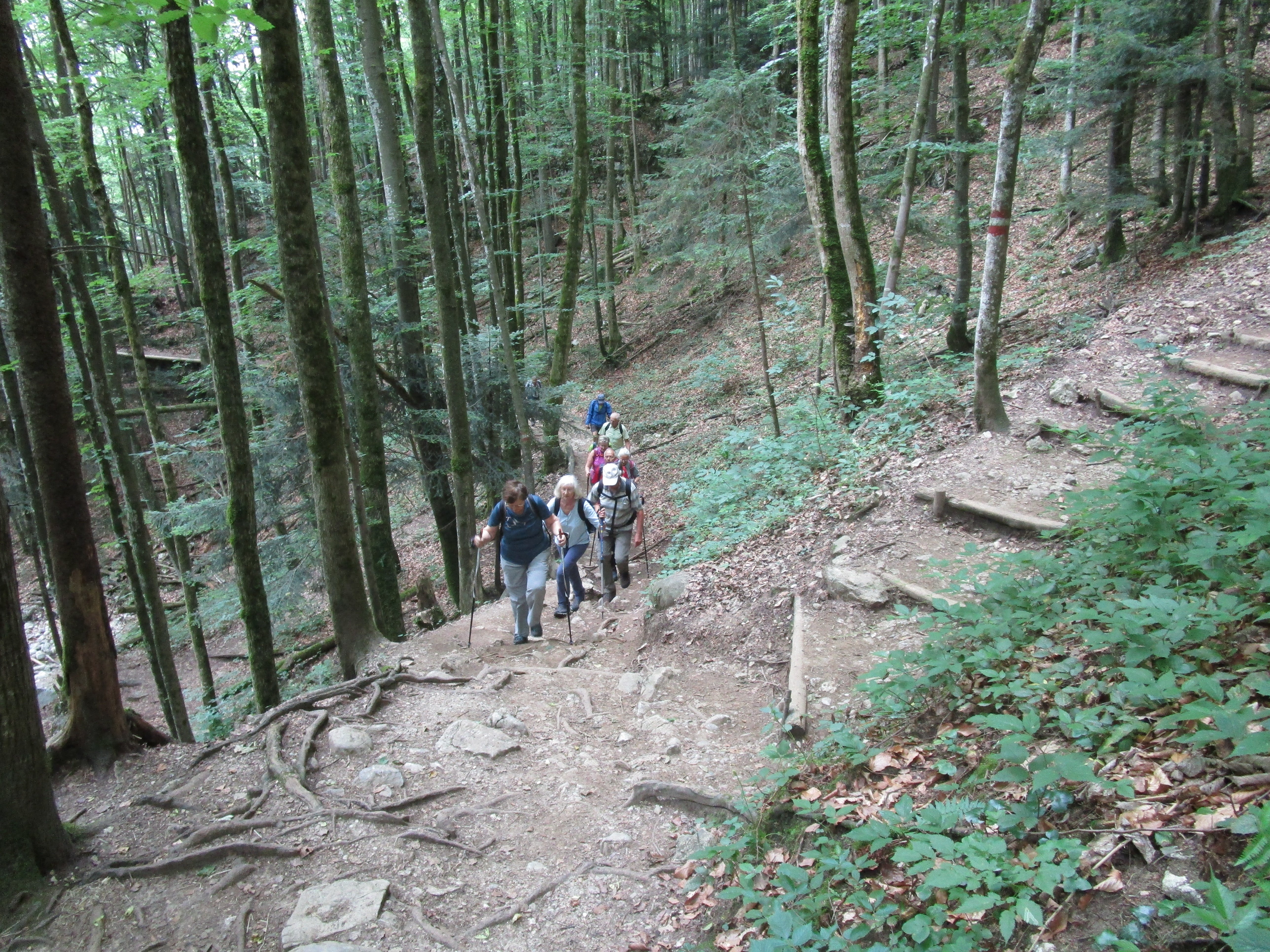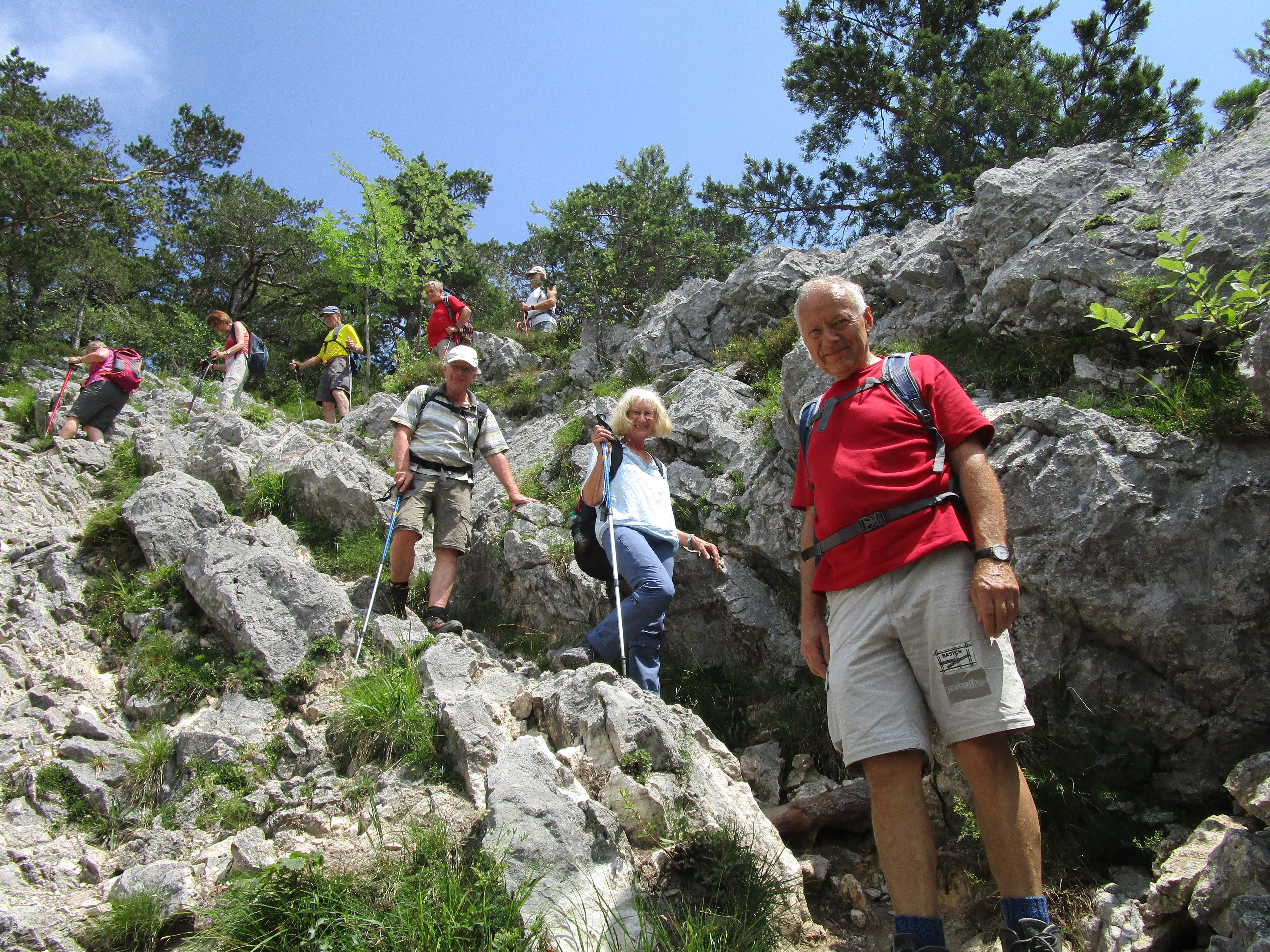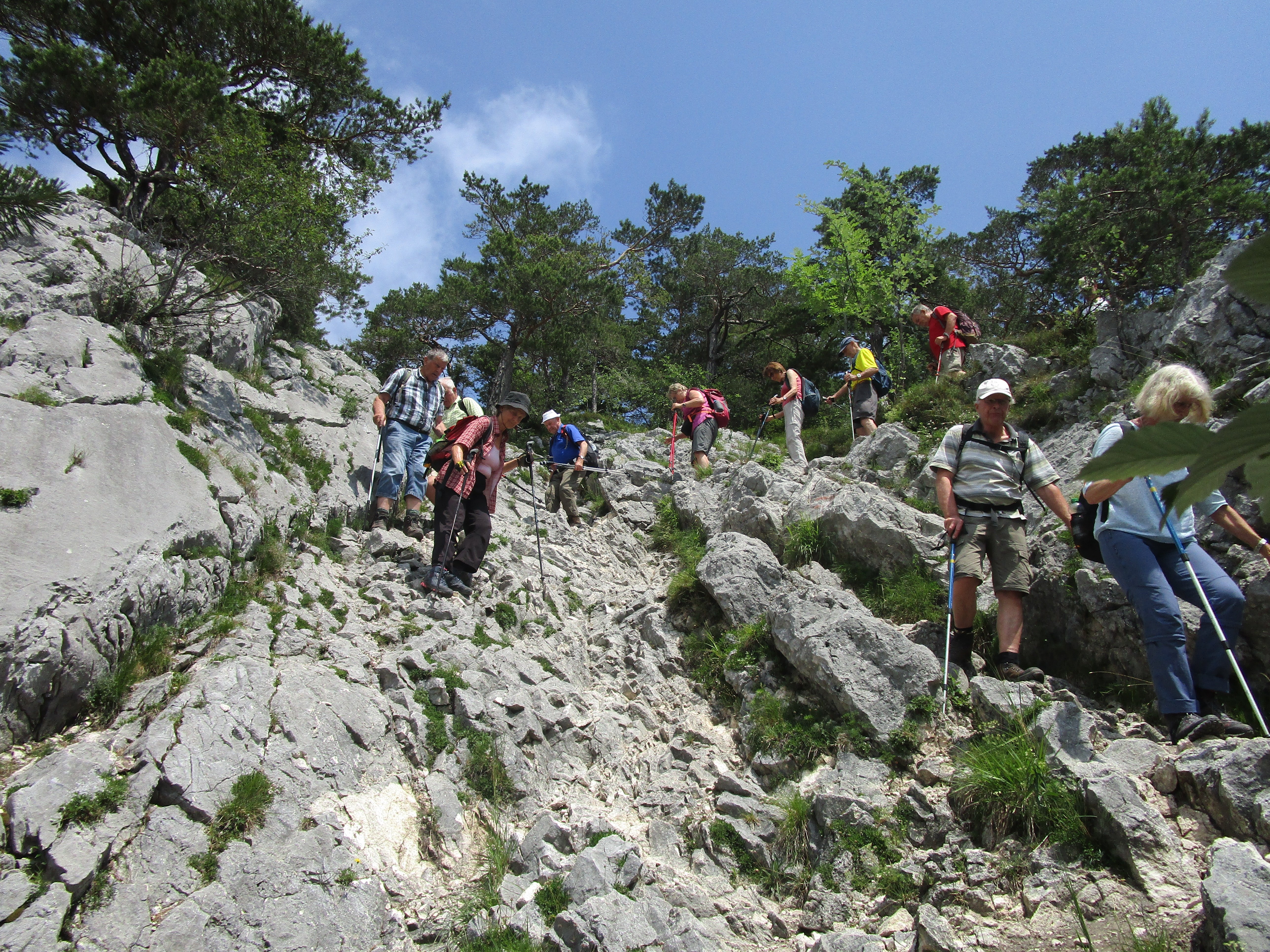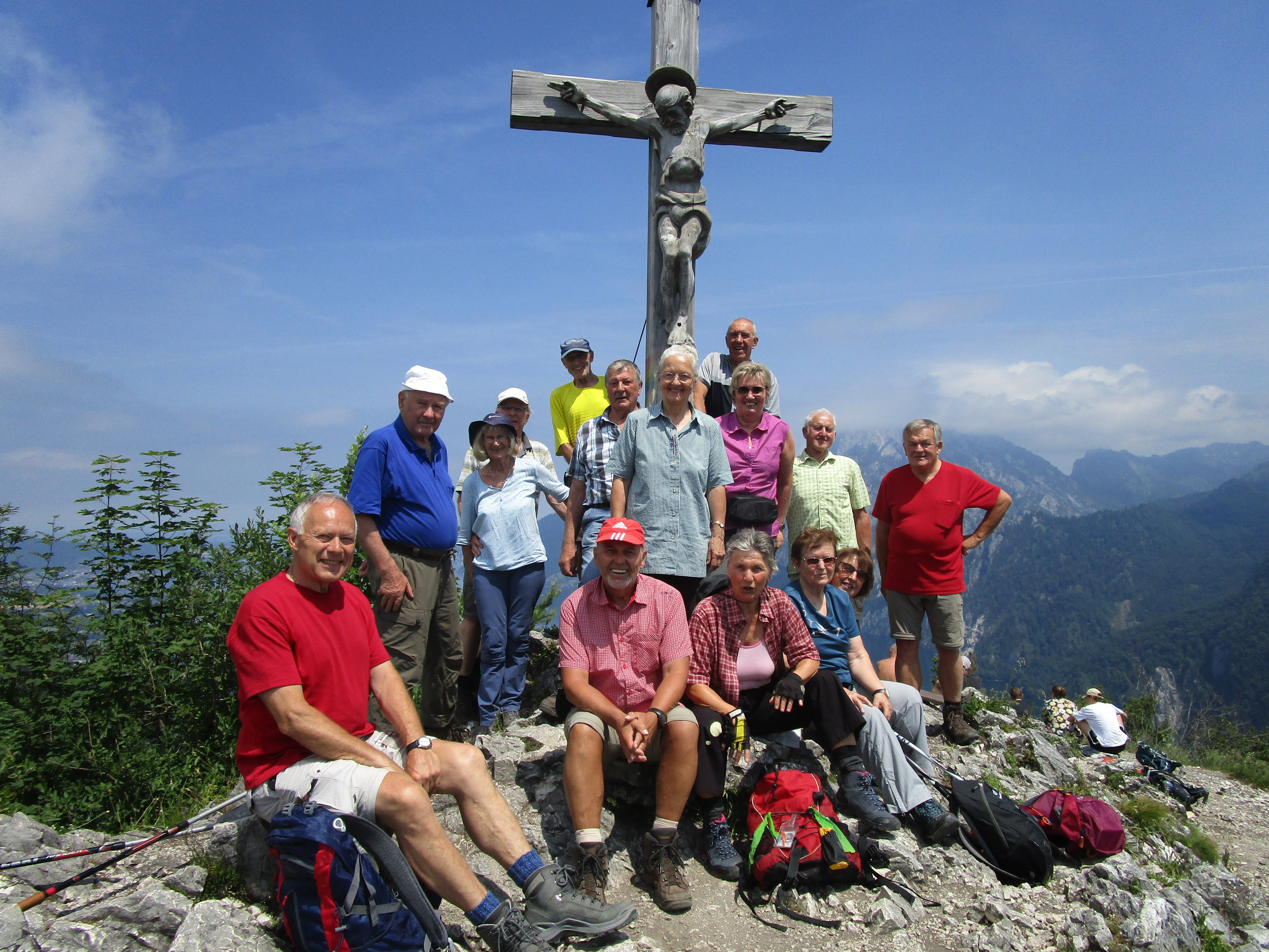 Bei der Wiederholungstour zum Kl. Sonnstein waren am Morgen noch hohe Wolken über den Berggipfeln. Im Laufe des Vormittags wurde das Wetter besser, zum Glück nicht so heiß wie in den letzten Tagen. Es hatte nachts nicht mehr geregnet, so dass die Wege im Wald trocken waren. Am Gipfel hatten wir dann Sonnenschein. Anfangs war der Gipfel des Traunstein gegenüber noch in Wolken. Er wurde dann aber auch frei und man konnte das Traunsteinhaus erkennen. Den Teilnehmern hat das Gipfelkreuz, die Sicht auf den See und die umliegenden Berge gut gefallen. Da der Kl. Sonnstein auf einer Halbinsel in den Traunsee hineinragt, hat man eine schöne Sicht nach Norden bis Gmunden und Süden bis Ebensee und gegenüber nach Osten sowieso. Im Südwesten war das Gipfelkreuz des Gr. Sonnstein zu erkennen. Alle Teilnehmer haben den Anstieg im Wald und auf dem felsigen Steig zum Gipfel und auch den Abstieg prima gemeistert. Wir haben aber auch reichlich Pausen gemacht, so dass niemand die Luft ausging. So war es eine angenehme Tour für alle. Beim Aufstieg wurden von einigen Damen Wanderlieder angestimmt. Dass es am Nachmittag dann richtig warm wurde, haben wir im Wald nicht so gespürt, erst unten am Parkplatz.