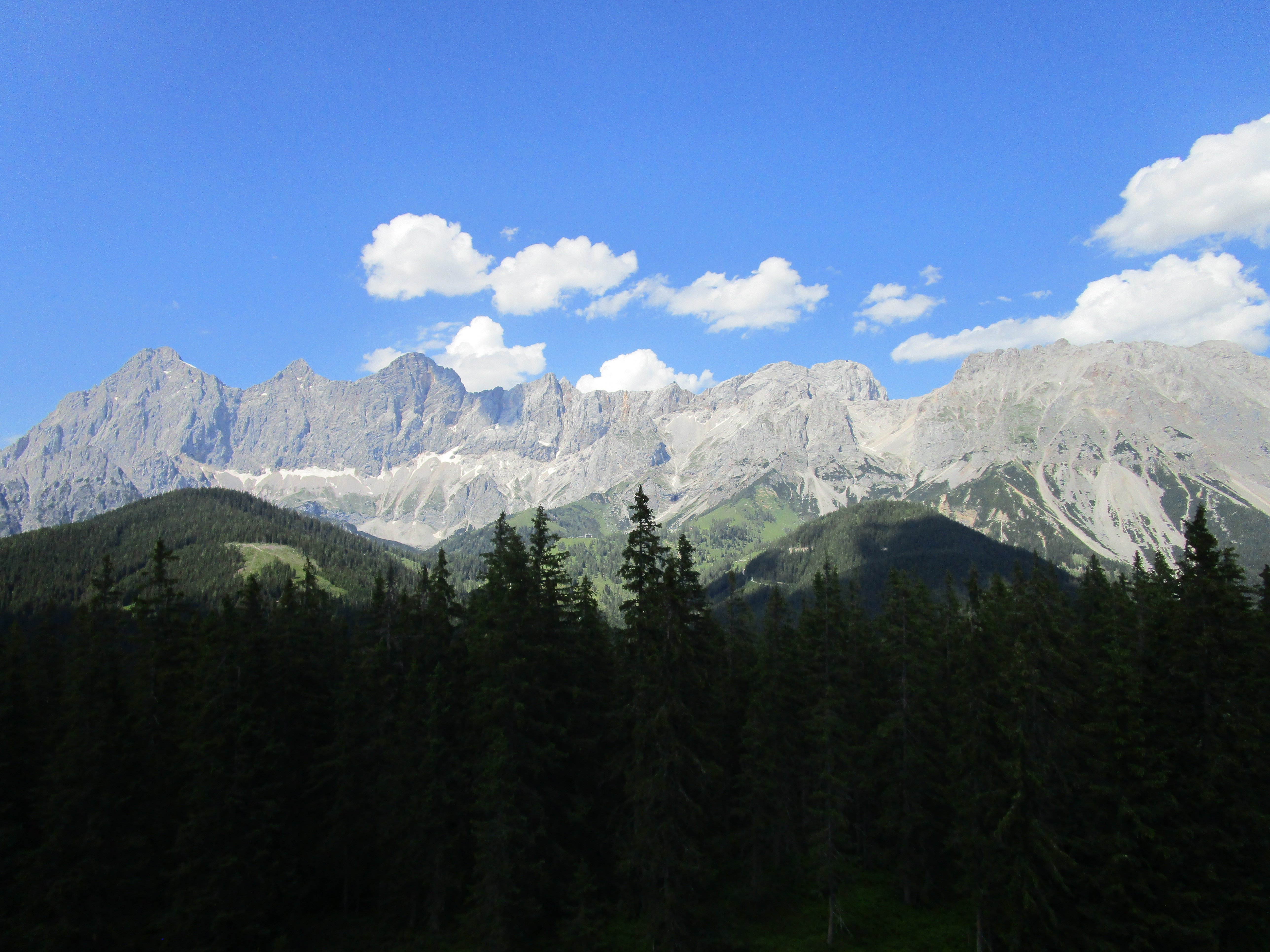 Auf dem Parkplatz in Hachau kurz nach Filzmoos machten wir Mittagsrast und konnten bei herrlichem Sonnenschein und warmer Temperatur die gesamte Bergkette des Dachsteingebirges bestaunen.