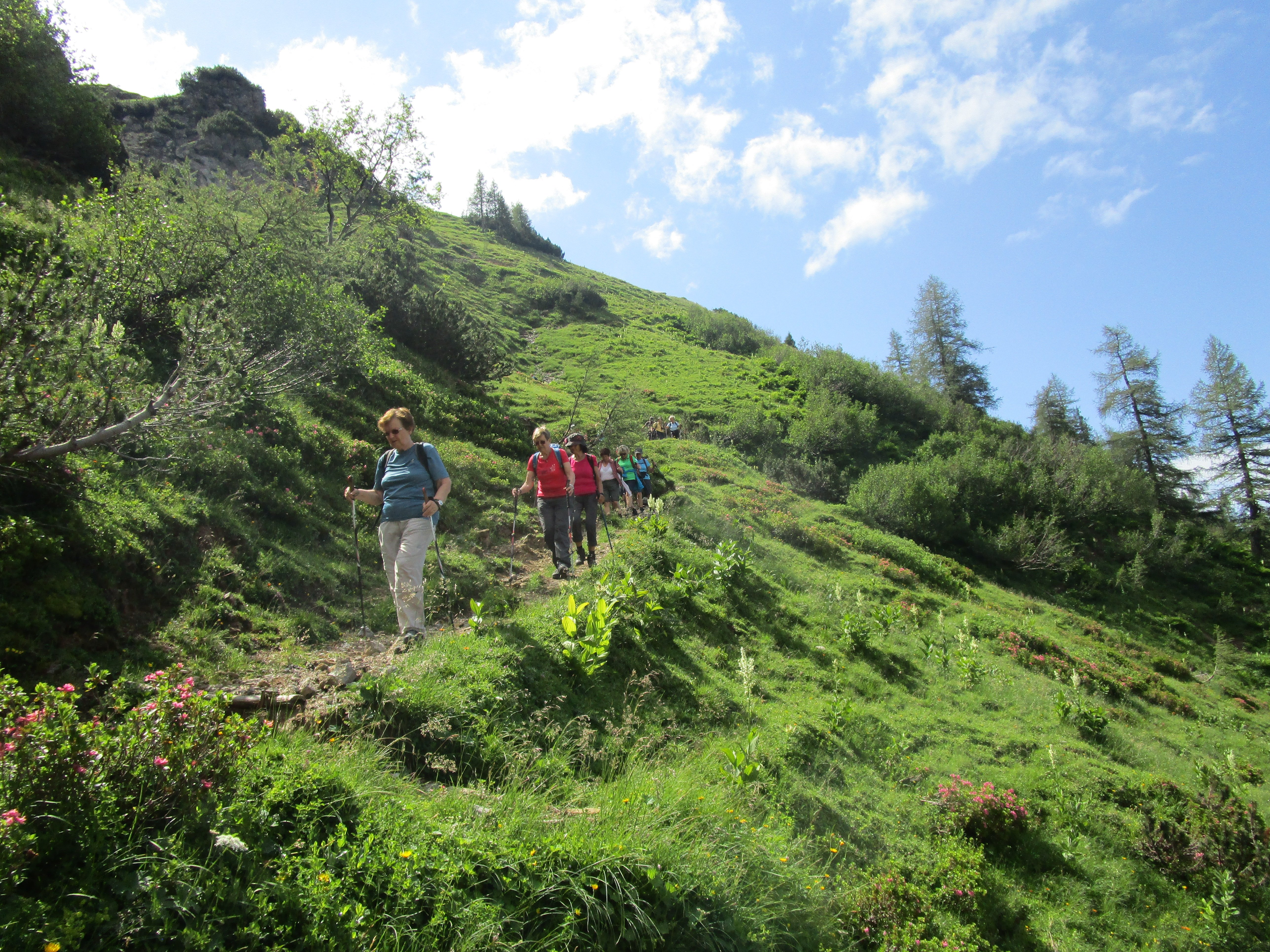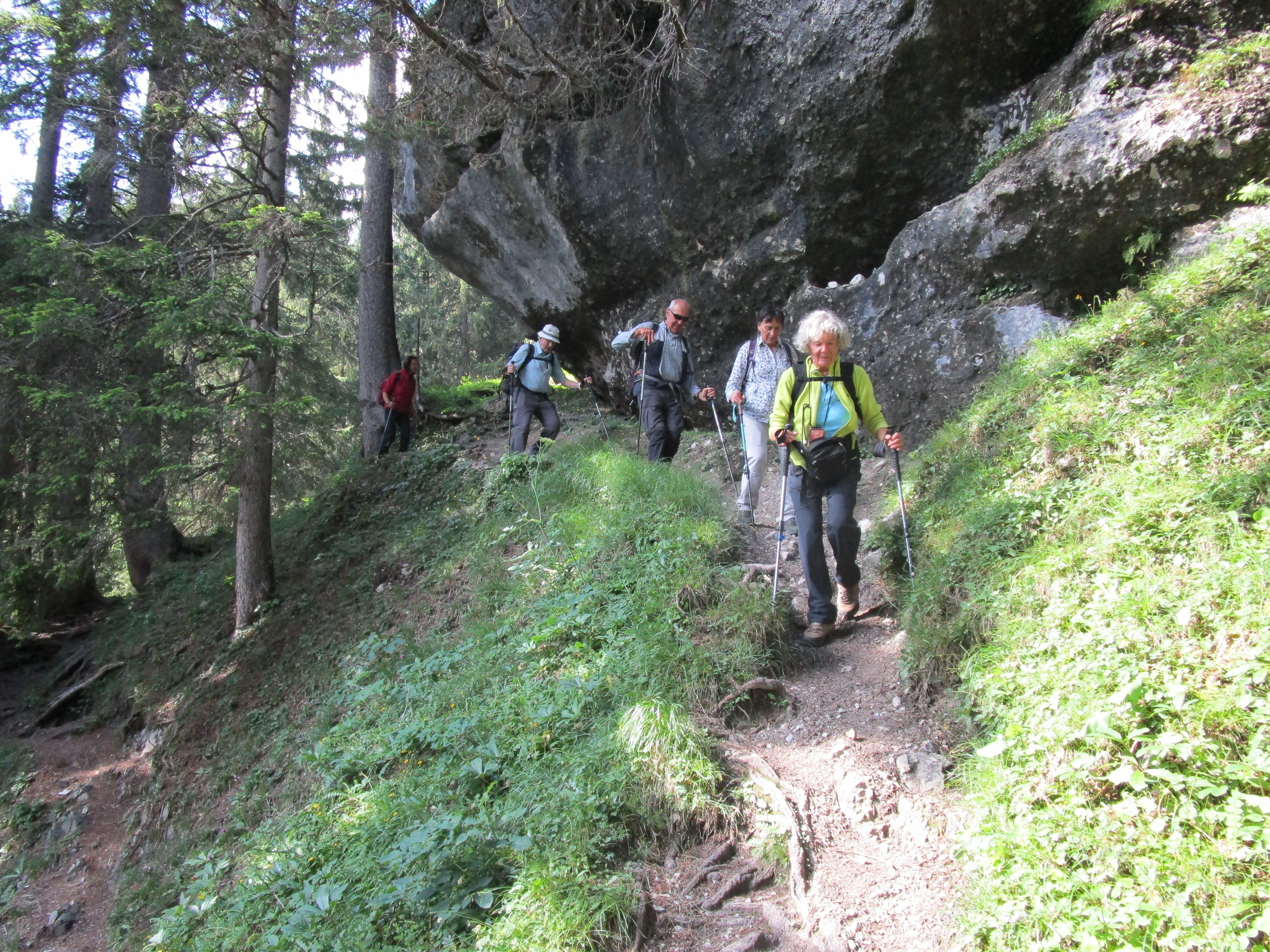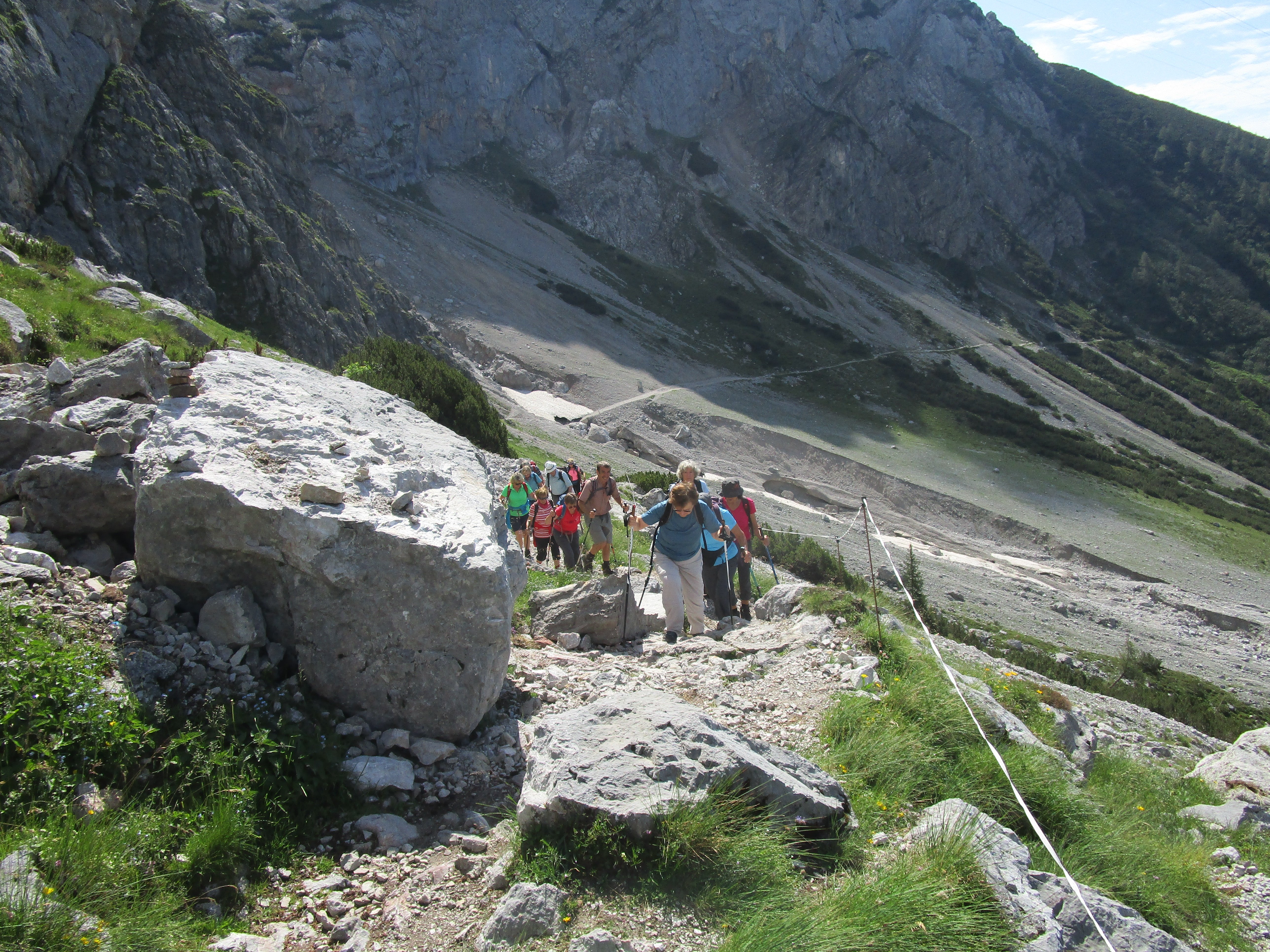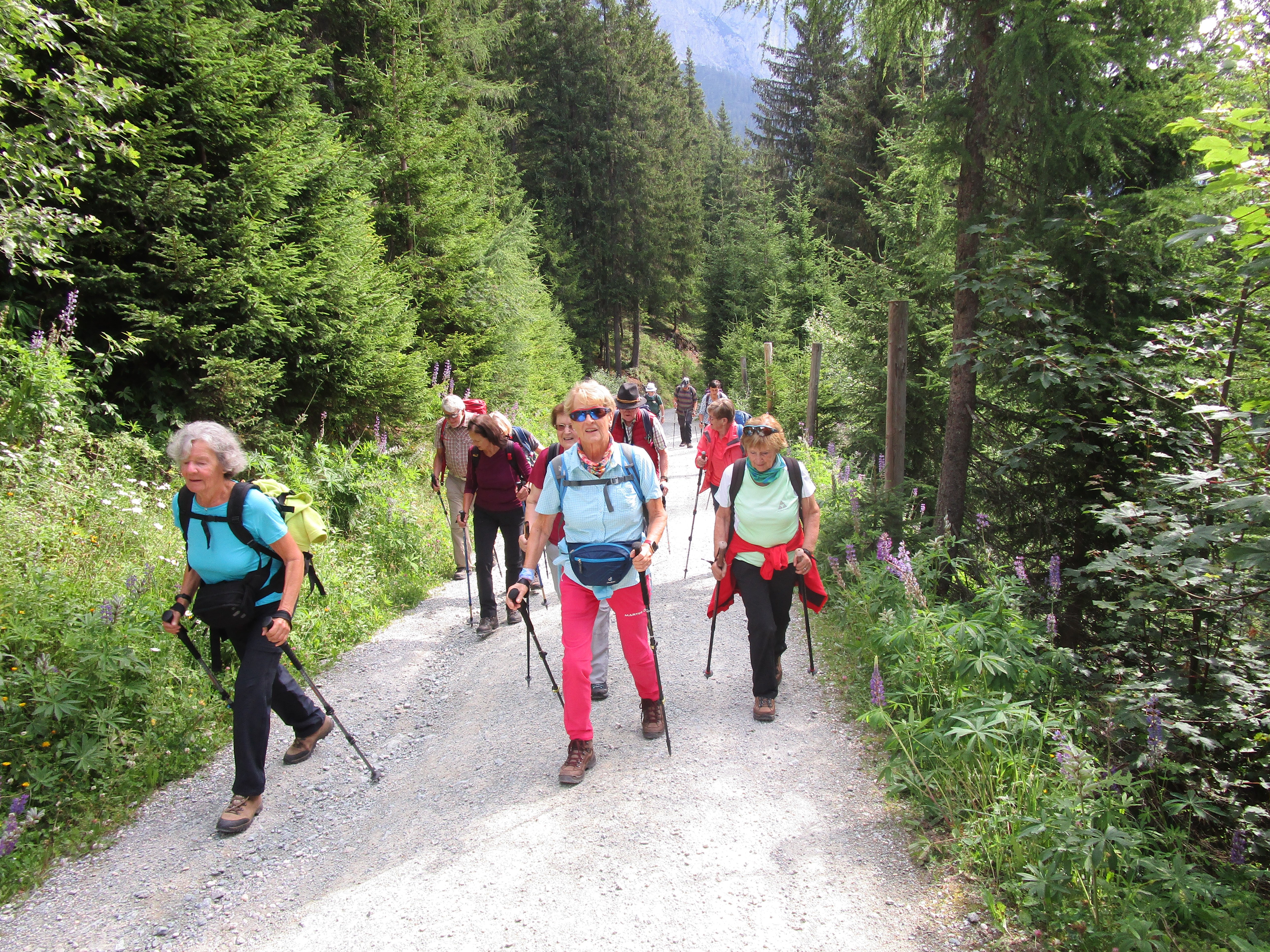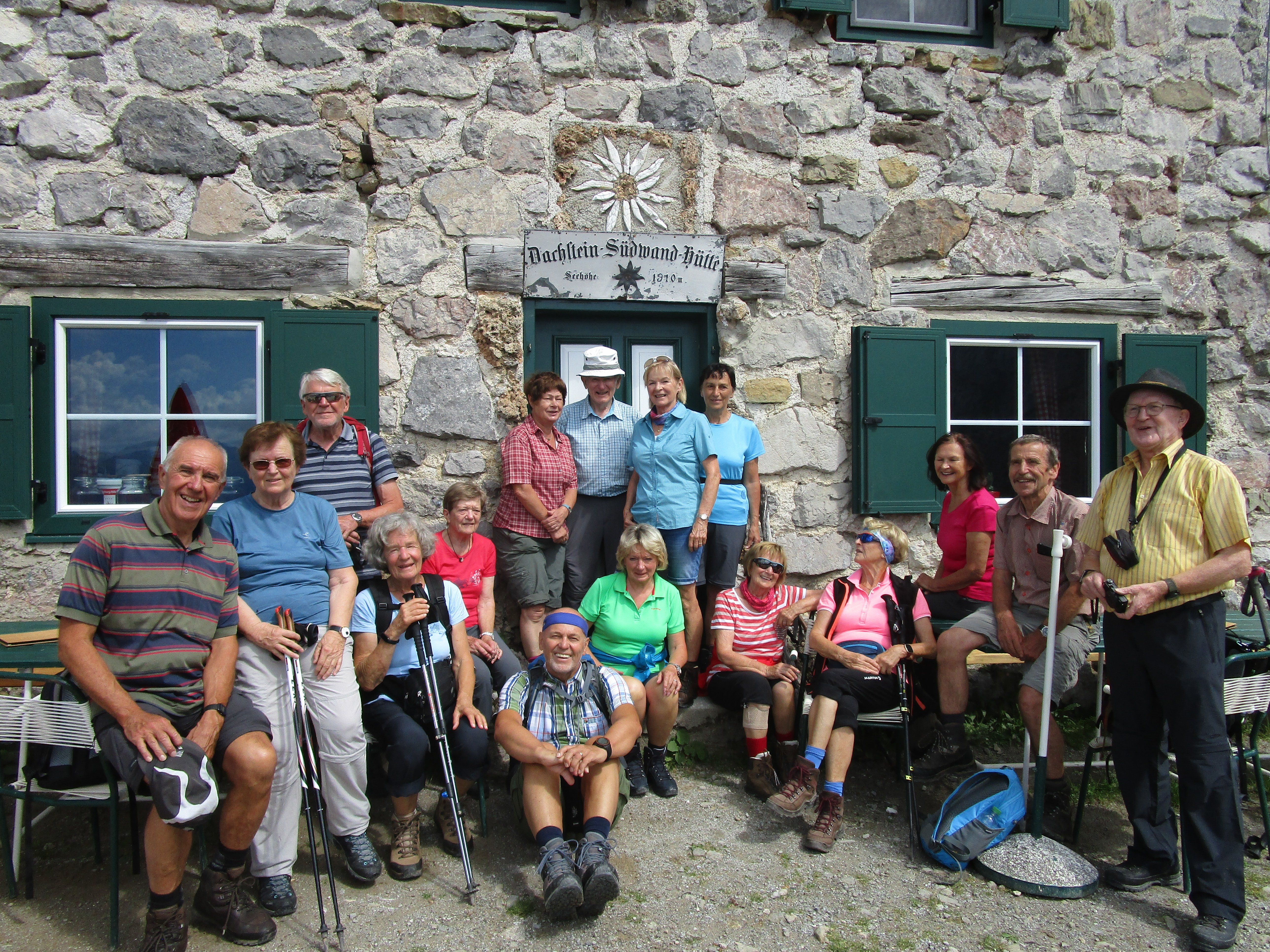 Wegen für den Nachmittag angekündigten Schlechtwettereinbruch wurde die Tour, die ursprünglich auch zur Bachlalm hätte führen sollen, verkürzt. Mit dem Bus ging es zunächst vom Hotel die Dachsteinstraße hinauf. Von dem Hotel Türlwand und der Talstation der Dachsteinbahn (1680 m) führte ein Steig dann zunächst steil bergauf, später nur in leichter Steigung in einem weiten Bogen durch ein Kar zur Dachsteinsüdwandhütte, (1910 m, 179 Hm). Sie wurde in 50 Min. erreicht. Von dort erfolgte der Abstieg, anfangs über einen steilen Grashang, dann durch lichten Lärchenwald 417 Hm abwärts bis hinab zum Marboden. An der Abzweigung zur Bachlalm wählten wir den kürzeren Weg über die Neustadt-Alm (aufwärts 136 Hm) und kehrten dann auf der Glösalm (83 Hm abwärts) ein. Mit dem Bus ging es dann wieder zurück zum Hotel. Einige Mutige gingen zu Fuß und kamen vor dem großen Gewitter-Regen am Hotel an. Gesamtgehzeit ohne Pausen: 2 Std. 10 Min. – mit Pausen 3 Std. 15 Min. Die Tour war für alle Teilnehmer sehr beeindruckend, ging es doch unterhalb der Dachstein-Südwand-Abstürze entlang mit Blick auf den steilen Pernerweg durch das Tor am Torstein vorbei.