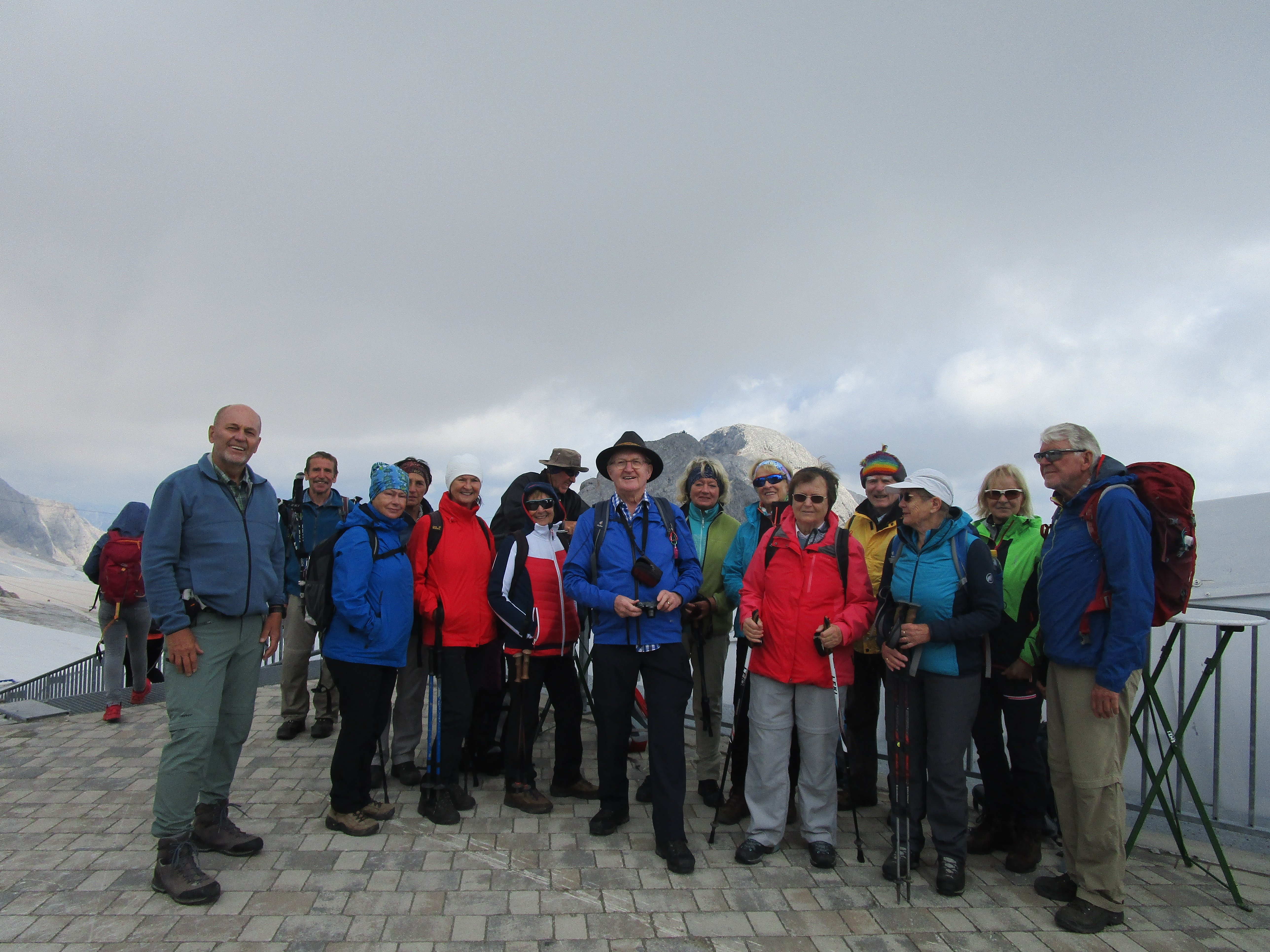 Zunächst waren 11 Sonnenstunden prognostiziert, es wurde aber eher ein durchwachsener Tag mit vielen Wolken und starkem Wind bei Temperaturen um die 10° C auf dem Gletscher. Es wurde in drei Gruppen gewandert. Karl Mayer stieg mit den meisten Teilnehmern über den Schladminger und Hallstätter Gletscher zur Seethalerhütte auf tiefem Geläuf hinauf. Michael Leineweber kletterte mit 6 Wanderern auf den Hohen Gjaidstein (2.794 m), Der Rest ging mit mir zum (leichteren) Kleinen Gjaidstein (2.734 m). Letztere Gipfel waren reine Felstouren vom Gjaidsteinsattel aus. Bis dahin ging es auf dem Schladminger Gletscher leicht bergab. Die Gletscherwanderer benötigten für ihre Tour 2 Std. 50 Min., mit meiner Gruppe war ich knapp 2 Stunden unterwegs, Michael brauchte mit seinen Teilnehmern eine Stunde länger.