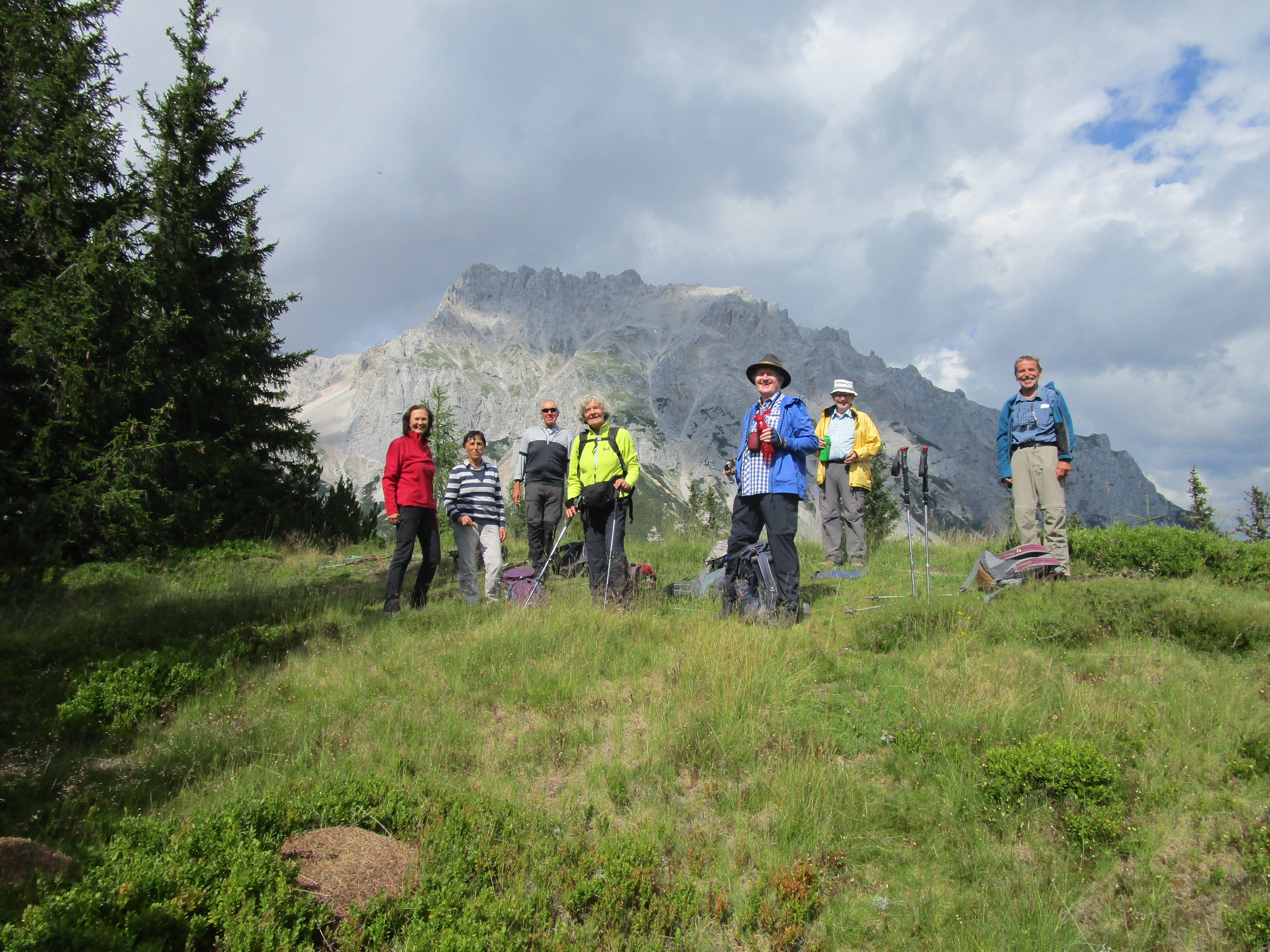 Nachdem ganztägig unbeständiges Wetter angesagt war, entfiel die Tour zur Reiteralm. Stattdessen wanderten wir bei anfangs leichtem Regen, später bei Sonnenschein, auf einem schönen Wanderweg oberhalb der Teerstraße nach Ramsau. Dort besichtigten wir die evangelische Kirche, die einzige Kirche in diesem evangelisch geprägten Ort. Nach einem Einkauf im Spar-Markt wurde Brotzeit gemacht und die Wanderung südlich der Hauptstraße (Tannenweg) fortgesetzt, vorbei an der großen Sprungschanze. Über den Kurt-Waldheim-Weg erreichten wir dann das Waldcafé und die Talstation der Rittisbergbahn. Gesamtgehzeit mit Pausen: 3 Std. 15 Min.