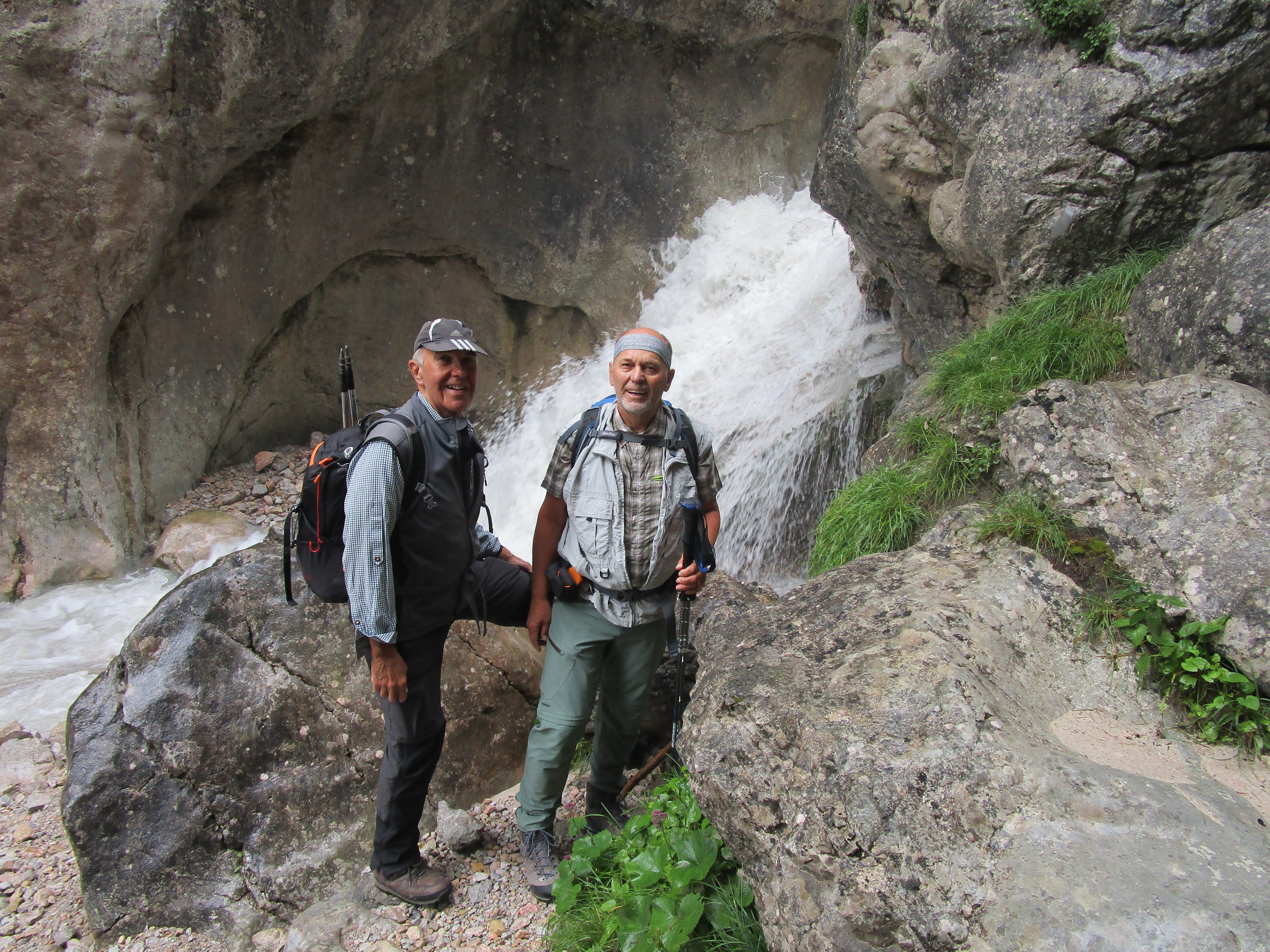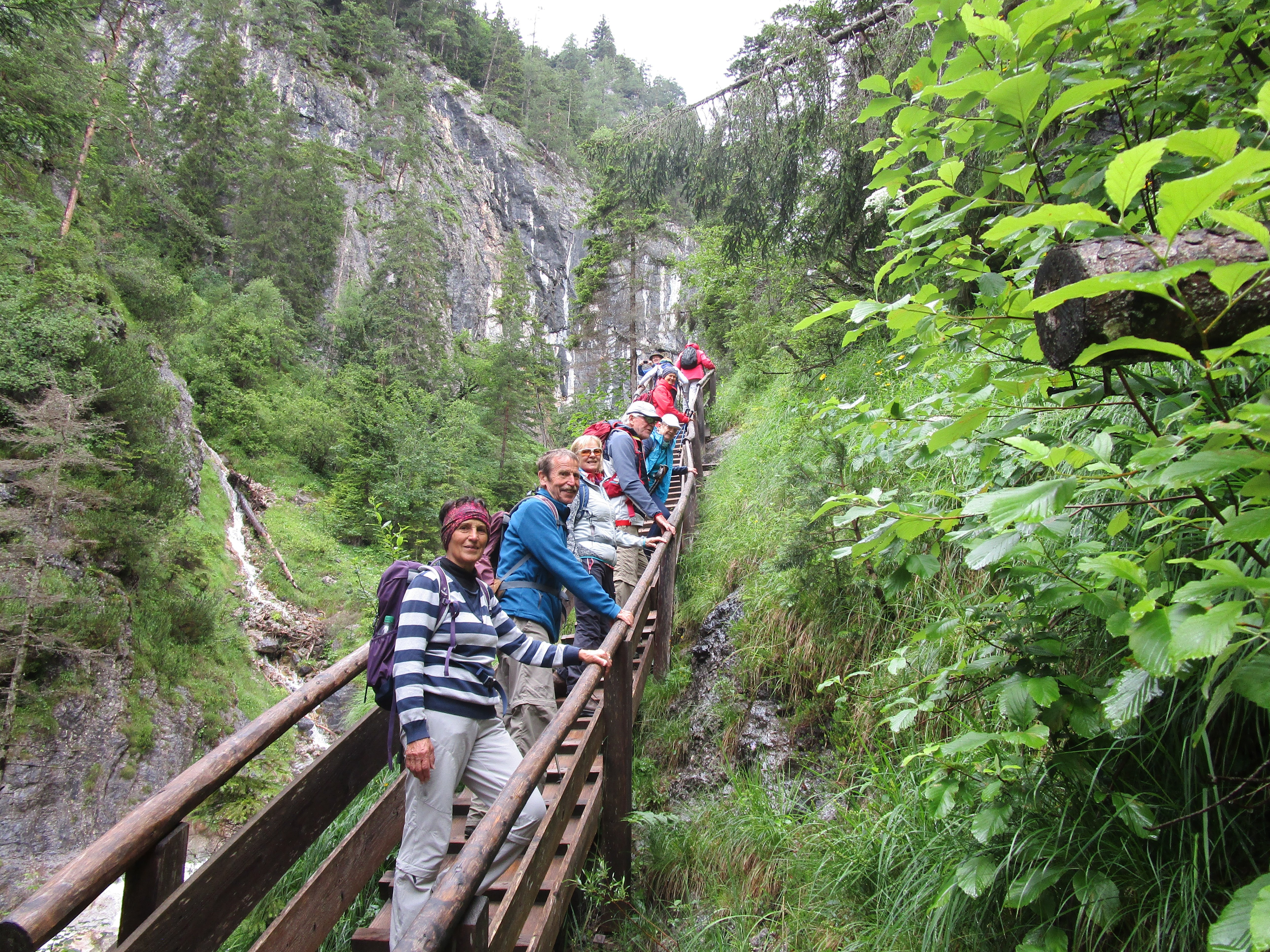 Am Vorabend und in der Nacht hatte es lange geschüttet (20 l pro Qm). Auch am Morgen regnete es noch bis 9 Uhr. Um 10 Uhr warteten wir bei starkem Wind auf den Bus nach Rössing zur Silberkarklamm (1001 m). Impopsante Wasserfälle und senkrechte Felswände machten die Wanderung durch die Klamm zu einem einzigartigen Erlebnis. Die Wassermengen in der Klamm waren von Menge und Geschwindigkeit brutal. Die Klammwege waren gut in Schuss. Sehr beeindruckend waren die Kletterer auf den drei Klettersteigen, die von der Klamm ausgingen und über einige Seilbrücken und steile, lange Leitern führten. Oberhalb der Klamm ging es dann in einem normalerweise neben dem Bachbett führenden felsigem Steig zur Hütte hinauf. Dieser Weg war kaum zu finden, hatten doch die Unwetter ihn weitgehend weggeschwemmt und unpassierbar gemacht. Wir haben dennoch, allerdings etwas mühsam, hinaufgefunden. Für die 250 Hm haben wir 1 Std. 20 Min. gebraucht. Der Hüttenwirt auf der Silberkarhütte bestätigte uns ebenso wie der Chef unseres Hotels Jagdhof, dass der ursprünglich geplante Höhenweg zurück zum Parkplatz nicht empfehlenswert durch die Nässe sei, weil steil und ausgesetzt, worauf wir wieder durch die Klamm hinabstiegen, allerdings auf dem Pilzweg mit schönen Waldsteigen (1 Std.). Bei der Jausenstation Fliegenpilz erfolgte nochmals eine Einkehr. Nachdem bis zur Abfahrt des Busses noch eine Stunde Zeit war, stiegen wir bei sonnigem Wetter ab zum Lodenwalker um diese 600 Jahre alte Werkstatt zu besichtigen. Dort werden aus bestimmten Schafwollen (meist Merinowolle aus Australien) Lodenstoffe gewonnen. Die Verfahrensweisen vom Faden bis zum Weben sind dort an den Maschinen zu sehen. Auch im Verkaufsraum gab es Interessantes zu bestaunen.