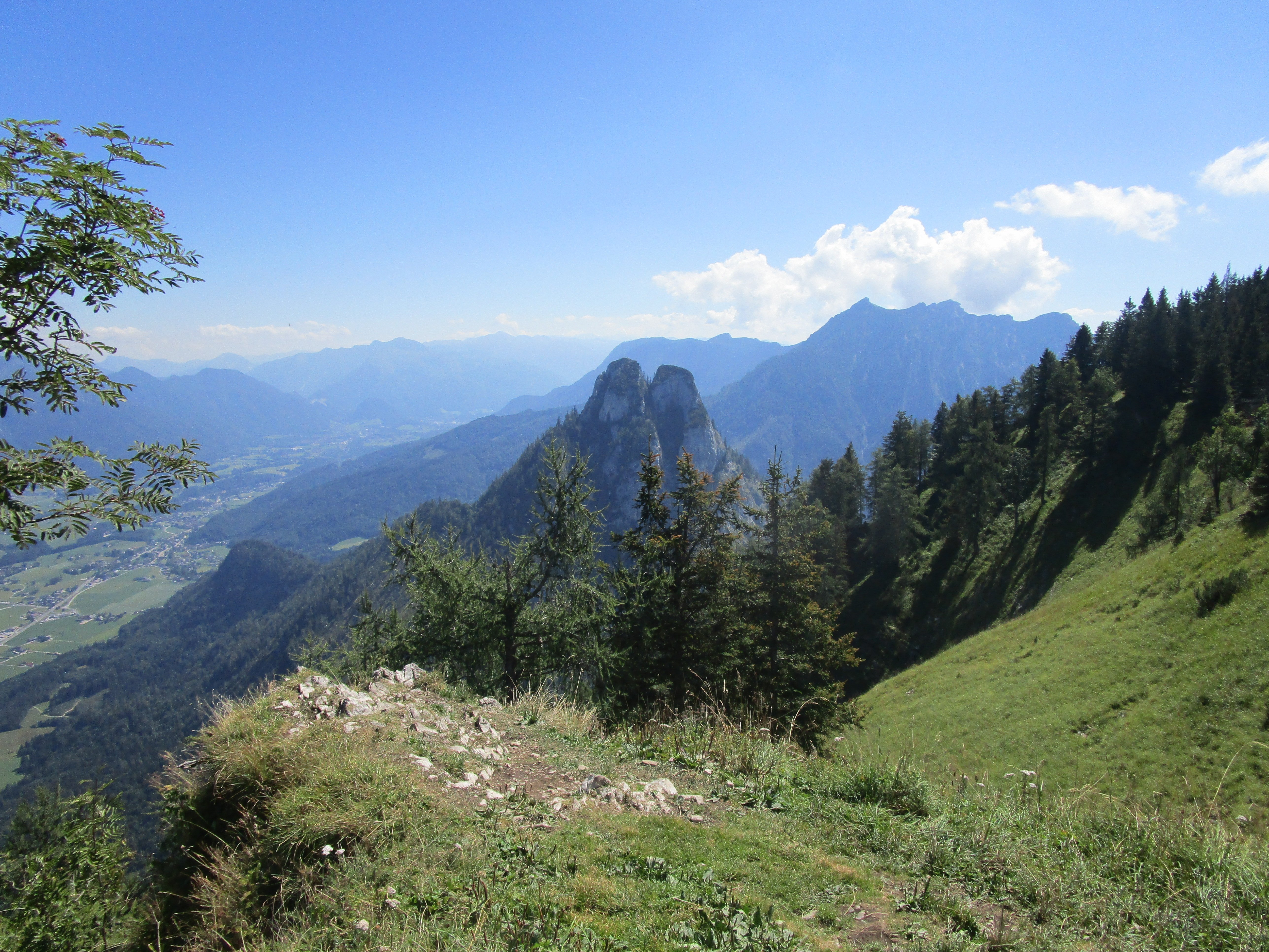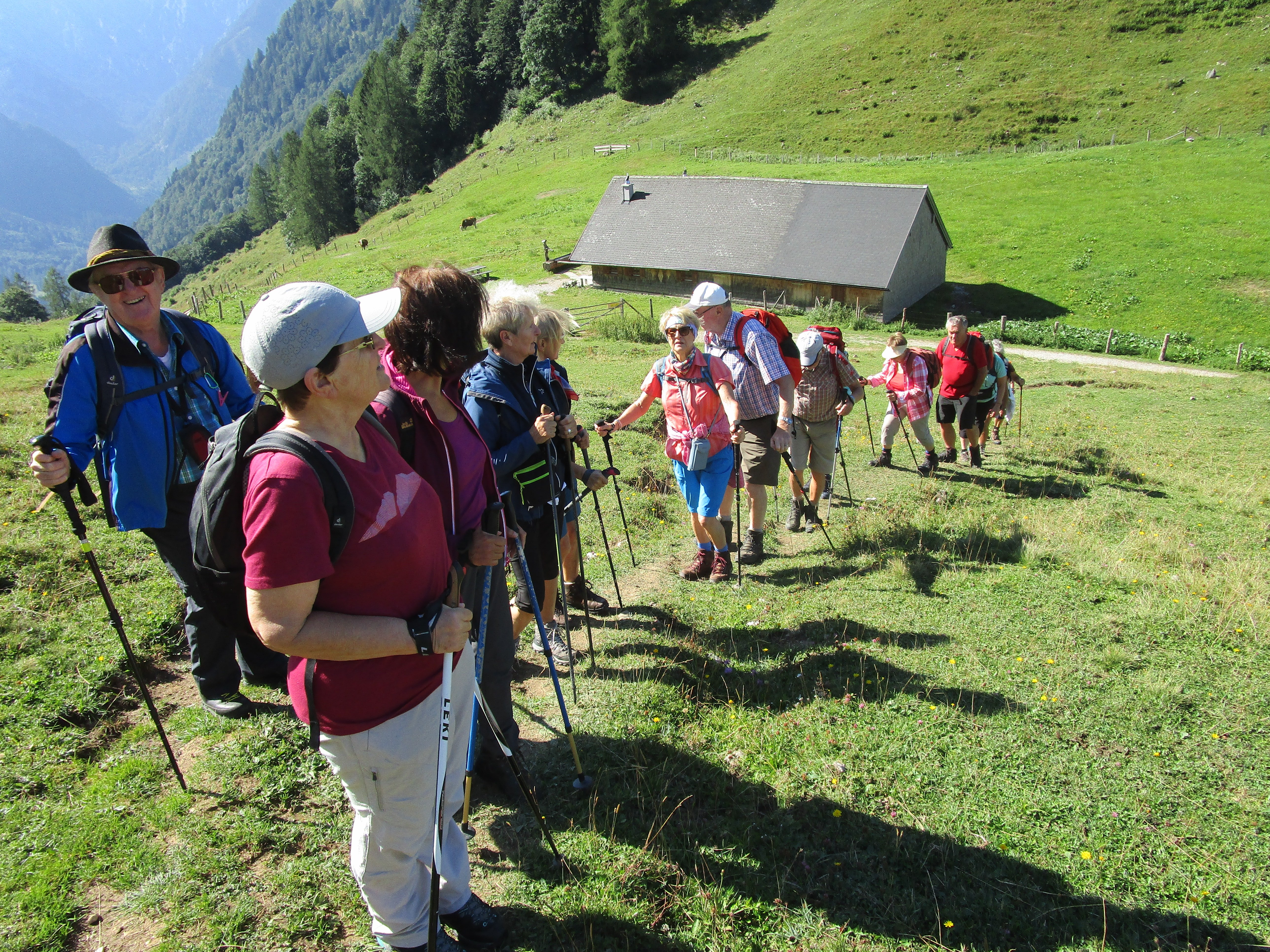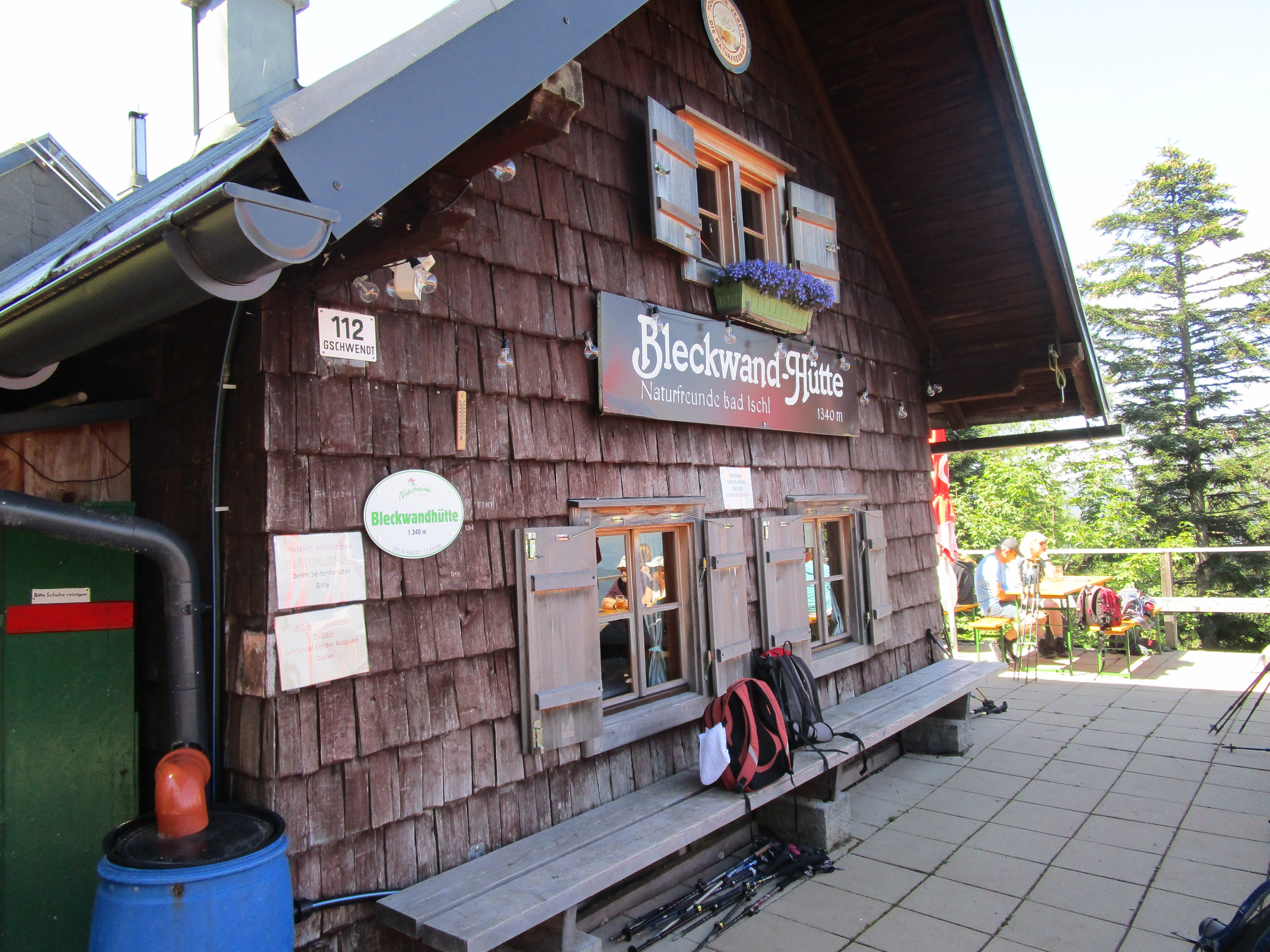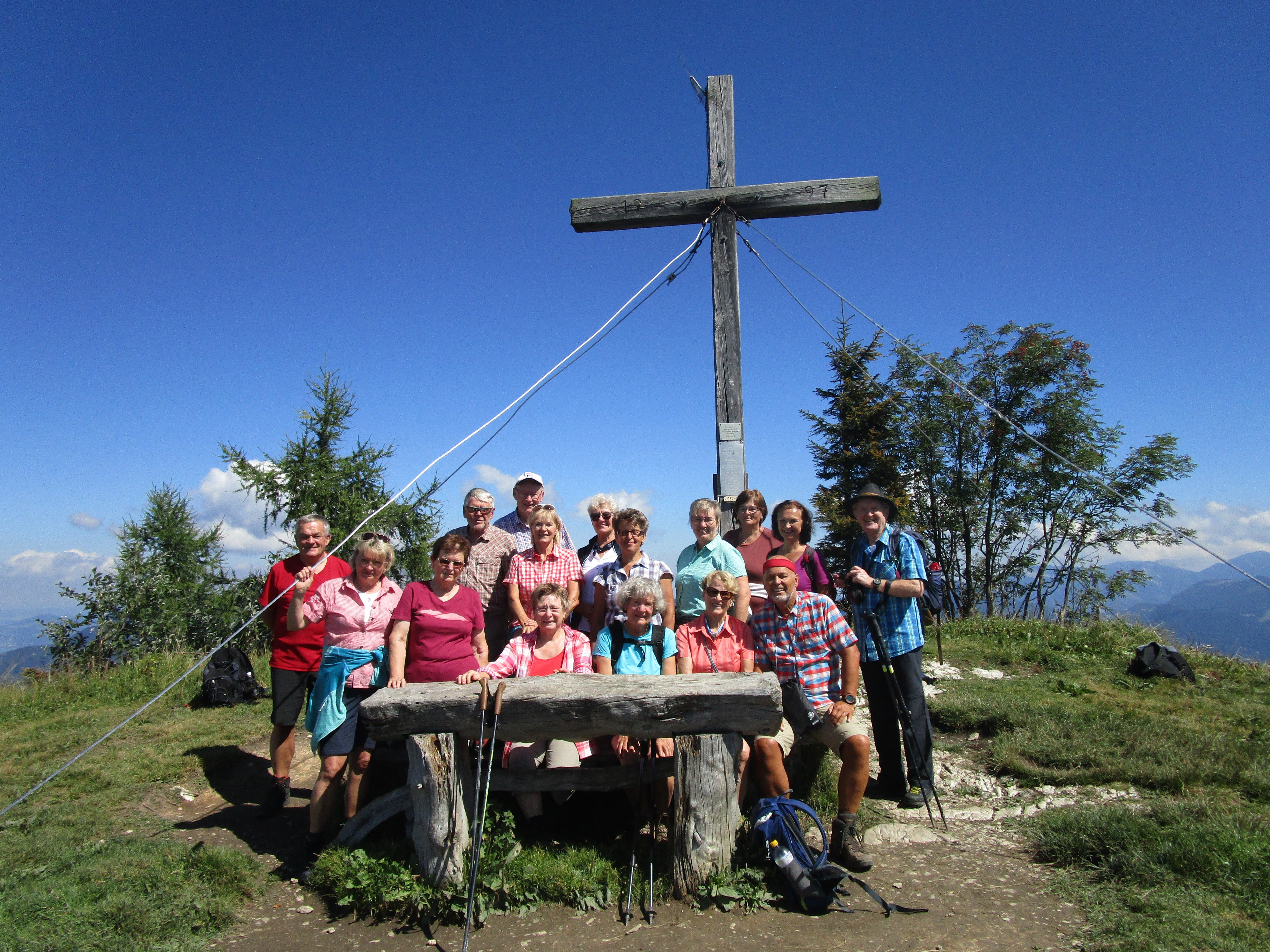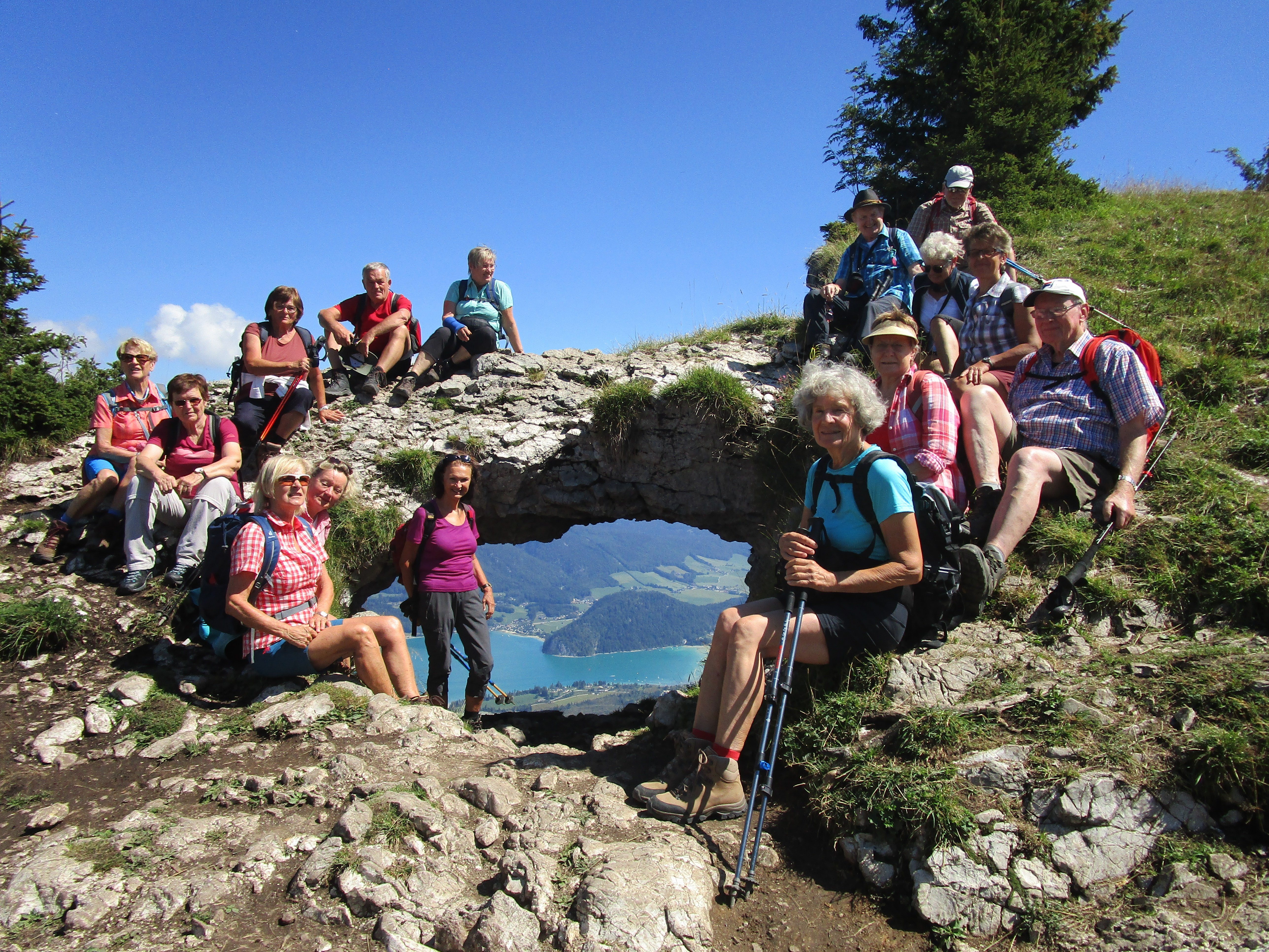 Moderate Temperaturen und ein blauer Himmel verhießen schon am Morgen ideales Bergwetter. Die Anfahrt erfolgte über Mattigkofen, Straßwalchen, Mondsee, Wolfgangsee bis Gschwendt. Von dort auf der mautpflichtigen, engen Bleckwandstraße (8 Euro) ca. 10 km in zahlreichen Spitzkehren hinauf zum Bleckwandhausparkplatz. Da dieser schon voll war, mussten wir weiter hinauf zum eingezäunten Parkplatz 3 bei der Wetzlerhütte (12228 m) fahren. Dort waren noch einige wenige Parkplätze frei. Der Aufstieg erfolgte auf Weg 31 vom Parkplatz direkt auf einem grasigen, steilen Hang, später durch dichten Wald bis hinauf zum Sattel zwischen den beiden Gipfeln der Bleckwand. Von dort weiter zum Südwestgipfel ( 1516 m, 288 Hm, 1 Std.und10 Min.). Nach ausgiebiger Gipfelrast, bei der die Sicht auf den Wolfgangsee und die umliegenden Berggipfel bei herrlich blauem Himmel genossen werden konnte, erfreute sich die Teilnehmer wenig später am Ofenloch, einem großen Felsenloch, durch das man zum Wolfgangsee hinunterblicken konnte. Zahlreiche Bergwanderer bevölkerten den Gipfelrücken. Auf der Bleckwandhütte wurde zu Mittag eingekehrt. Es war fast kein Platz mehr auf der Hüttenterrasse. Die Selbstbedienung und der allein werkelnde Wirt erforderten etwas Geduld, bis jeder seine Mahlzeit und etwas zu trinken bekam. In 25 Minuten ging es dann auf schattigem Waldweg hinunter zum Bleckwandhüttenparkplatz (336 Hm), von dem aus in weiteren 10 Minuten der 50 Hm höher gelegene Parkplatz 3 erreicht war. Auf der Rückfahrt leisteten sich die Teilnehmer am Marktplatz in Mondsee noch das eine oder andere Eis.