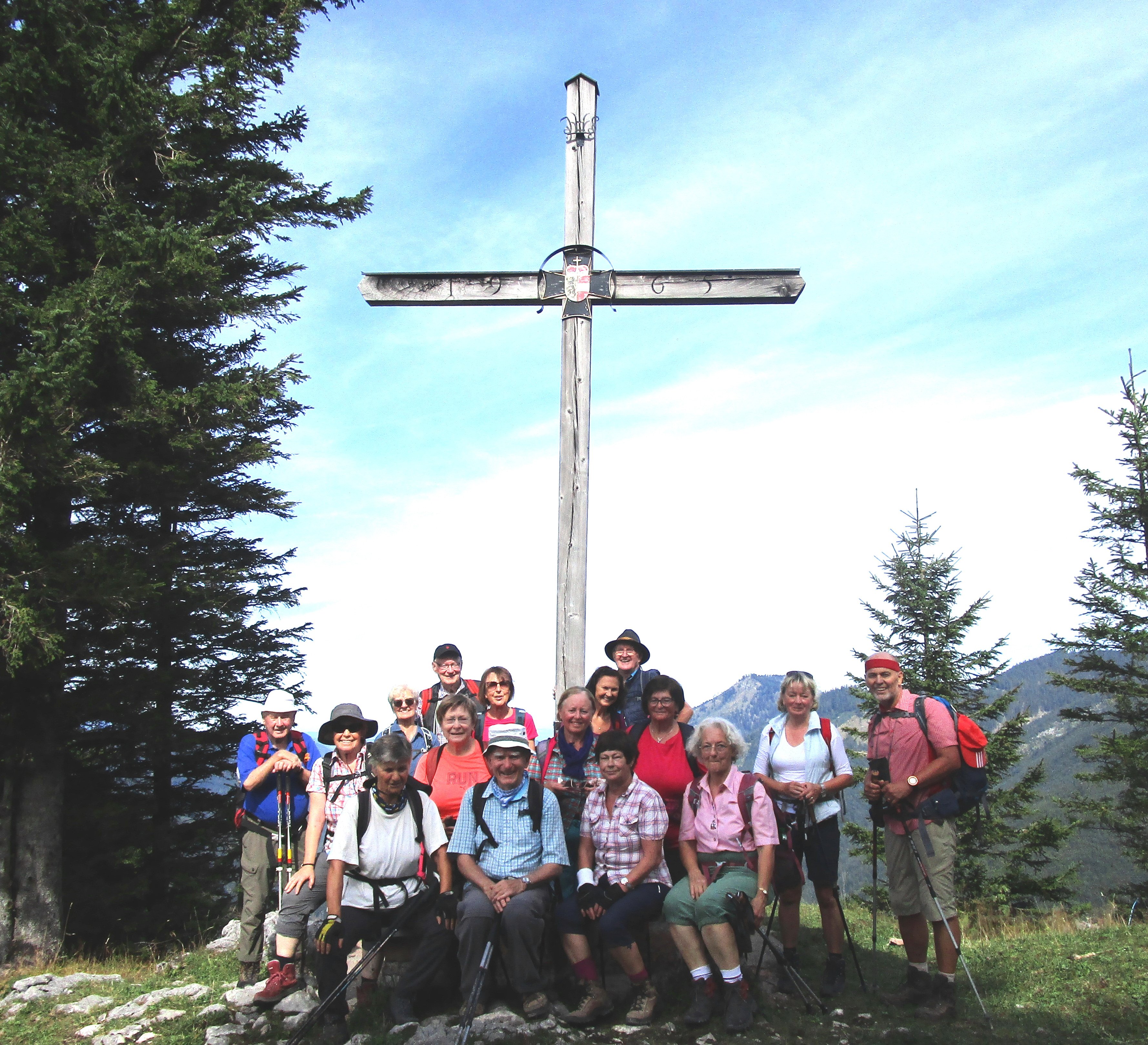 Start war bei idealem Wanderwetter der Parkplatz am Satzstein, kurz nach der Ortschaft Hintersee (770 m). Zuerst wurde die 5 Minuten oberhalb des Parkplatzes gelegene Hubertuskapelle besucht und dort durch einige Teilnehmerinnen spontan ein Marienlied angestimmt, das sehr schön klang. Danach ging es wieder hinab zum Tiefenbach und an diesem entlang im Wald mit vielen Stufen auf dem Wald-Wasser-Zauberweg aufwärts. Die zahlreichen Felsstufen, über die das Wasser in unzähligen Wasserfällen rauschte, haben die Teilnehmer beeindruckt. Nach einer Aussichtsplattform ging es über die Tiefenbachbrücke und dann aus dem Wald heraus zur Unteren Tiefenbachalm. Danach auf einem sehr steilen Almweg ca. eine Std. lang wieder durch Wald hinauf zu einem nahezu waldfreien Höhenrücken, der sich von der Regenspitz zum Feichtensteingipfel hinzieht. Nun führte der Weg leicht bergab bis zu einer Abzweigung, die gerade zur Gruberalm und nach Lämmerbach führt. Wir bogen links ab und stiegen über die Wiese leicht bergauf zum Gipfel des Feichtensteines, der nach Norden schroff abfällt und einen herrlichen Blick auf das Tal, den Hintersee bis hinaus in den Flachgau bietet. Nach Süden gewährte der Gipfel eine schöne Rundsicht auf die Osterhornberge wie Gruberhorn und Gennerhorn. Bei 2 Std. 05 Min. mit Pausen lag die Aufstiegszeit. Der Gipfelabstieg begann mit zwei Übungen zur „Ersten Hilfe am Berg“. Die fiktiv am Sprunggelenk verletzte Person war nach einem Umknicken nicht mehr in der Lage auf einem Bein aufzutreten. Um das lange Warten für die übrigen Teilnehmer bei einem Bergwachteinsatz zu vermeiden, wurde versucht, die verletzte Person zu tragen. Zunächst Huckepack auf einem fiktiv steilen Steig, dann in der zweiten Übung auf einem fiktiven Forstweg durch zwei Träger sitzend auf zwei gehaltenen Wanderstöcken. Damit sollte demonstriert werden, dass im Falle eines Problems am Berg die Gruppe zusammenbleichen muss, da ggfs. mehrere Helfer benötigt werden (Rucksackübernahme, zusätzliche Wanderstecken tragen, bei fehlendem Netz durch eine Person die Bergrettung benachrichtigen, ggfs. Bus-Schlüsselübergabe an einen vom Tourenleiter bestimmten Helfer, der die Gruppe ins Tal führt; mindestens zwei Personen bleiben mit dem Tourenleiter ggfs. bei der verletzten Person, falls diese nicht mehr ins Tal gehen kann oder auch nicht getragen werden kann.