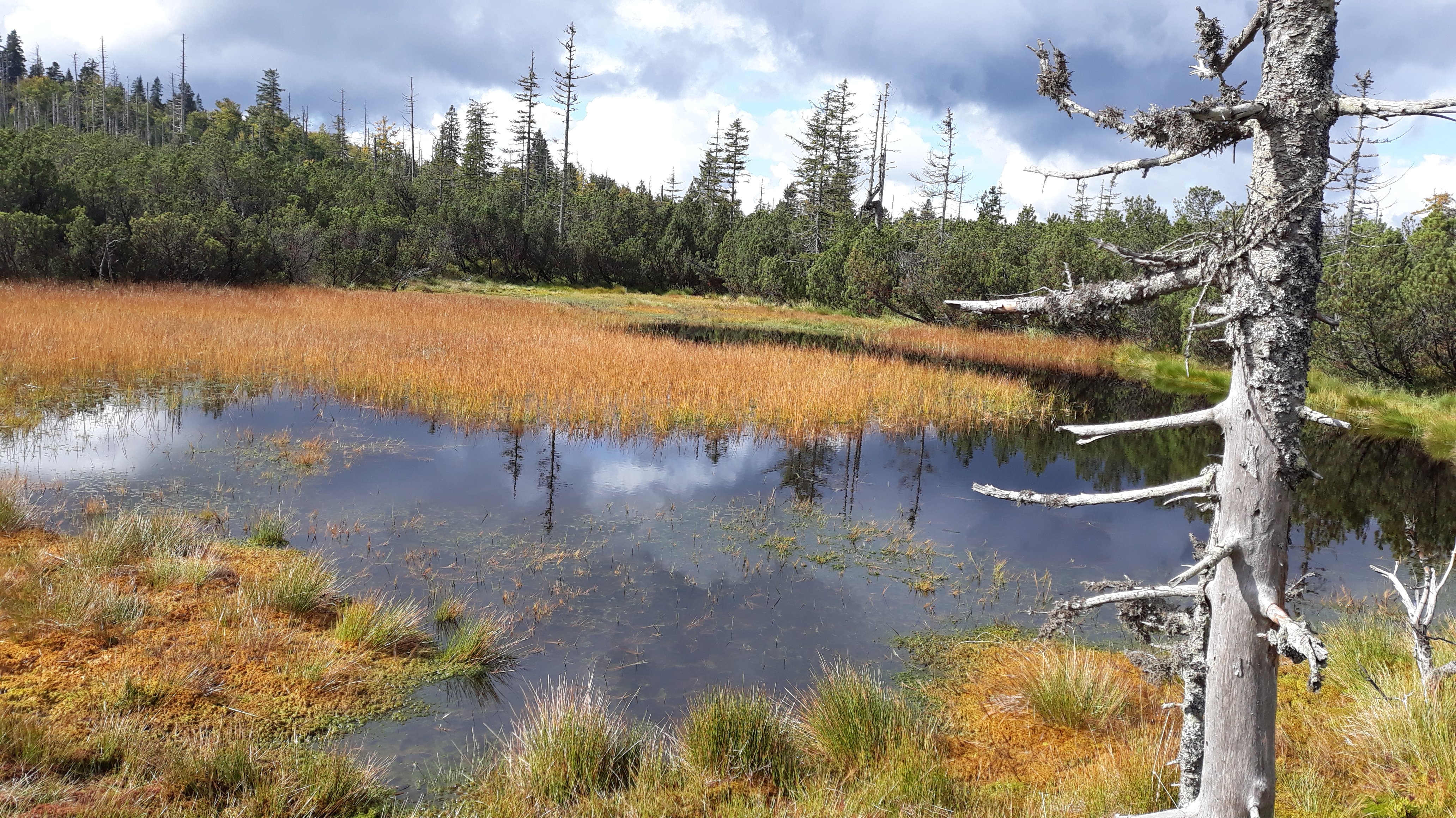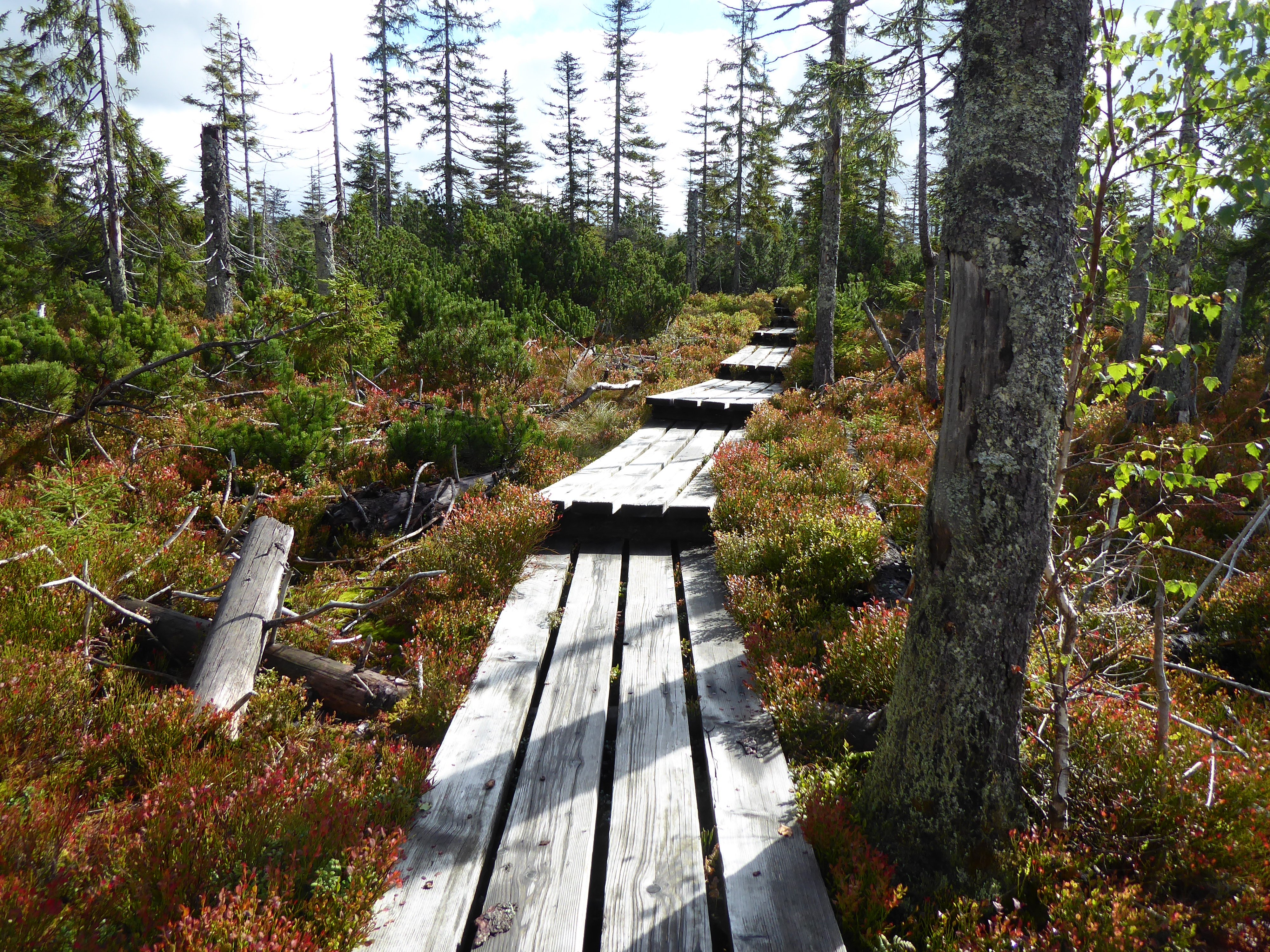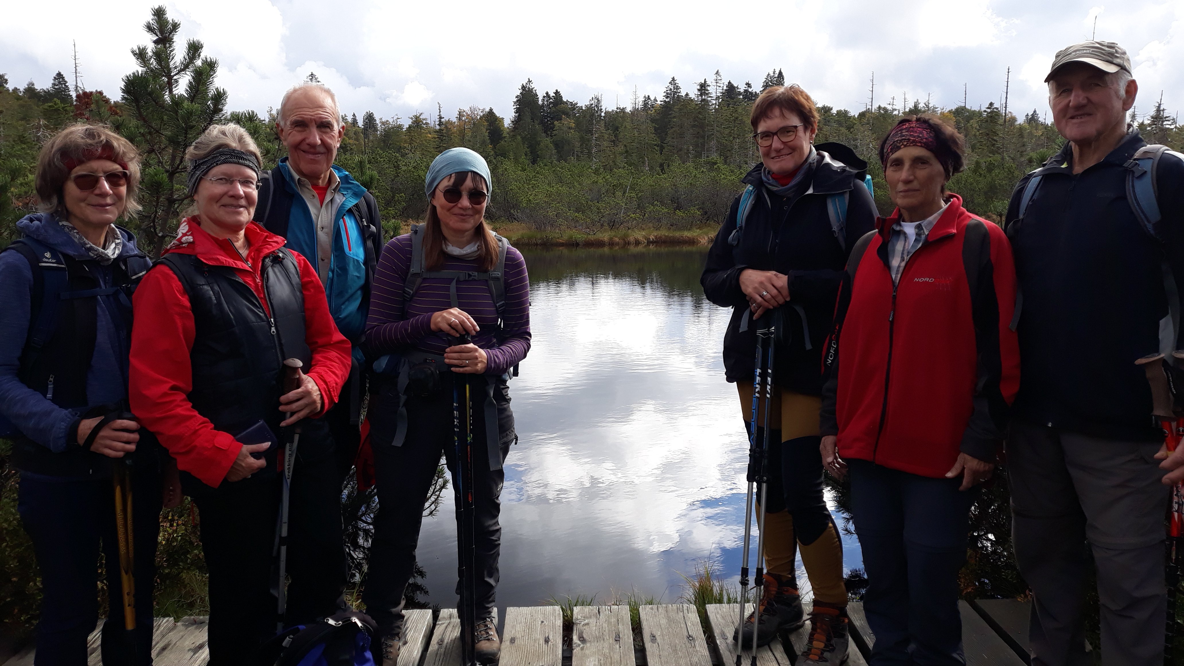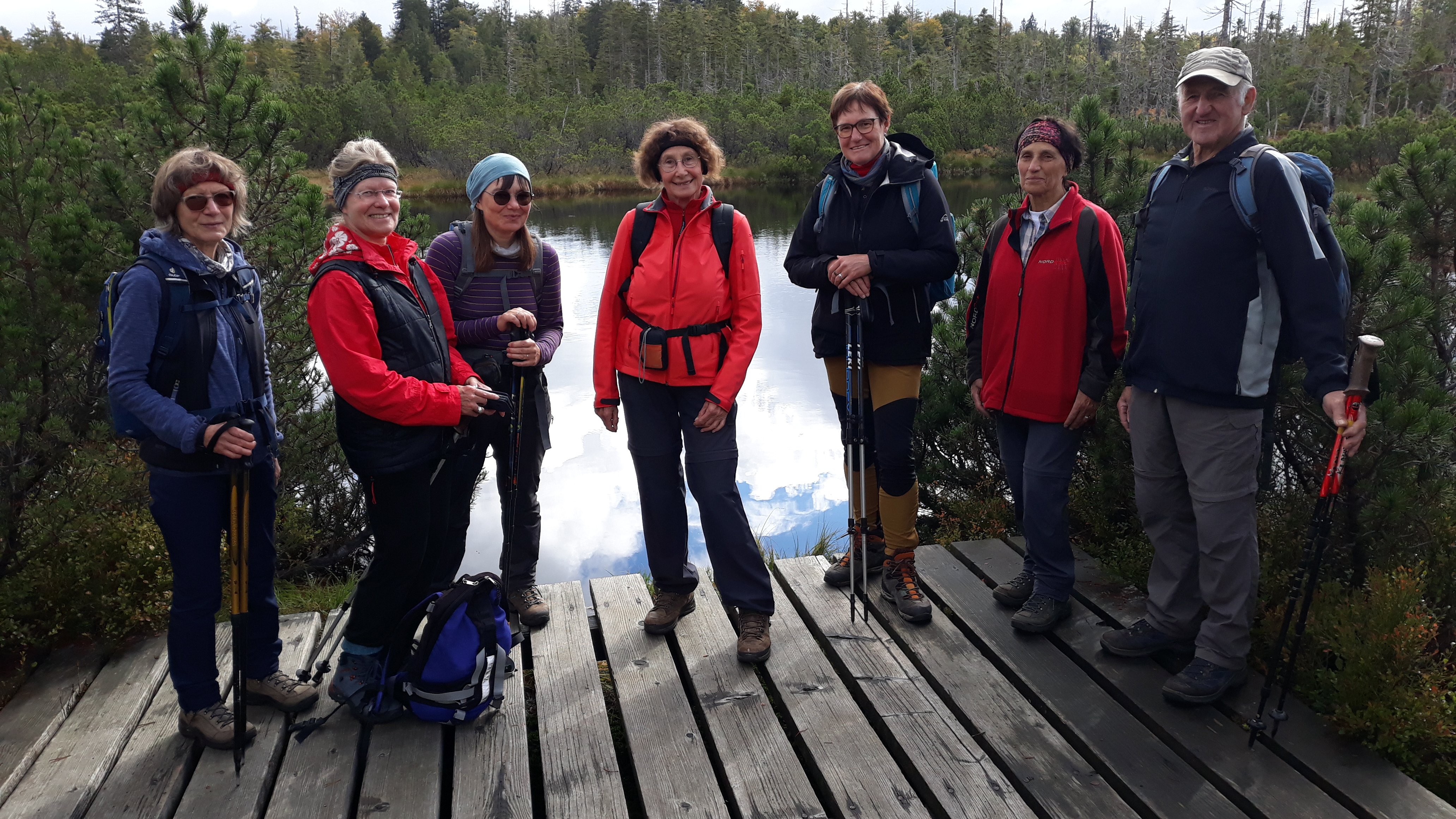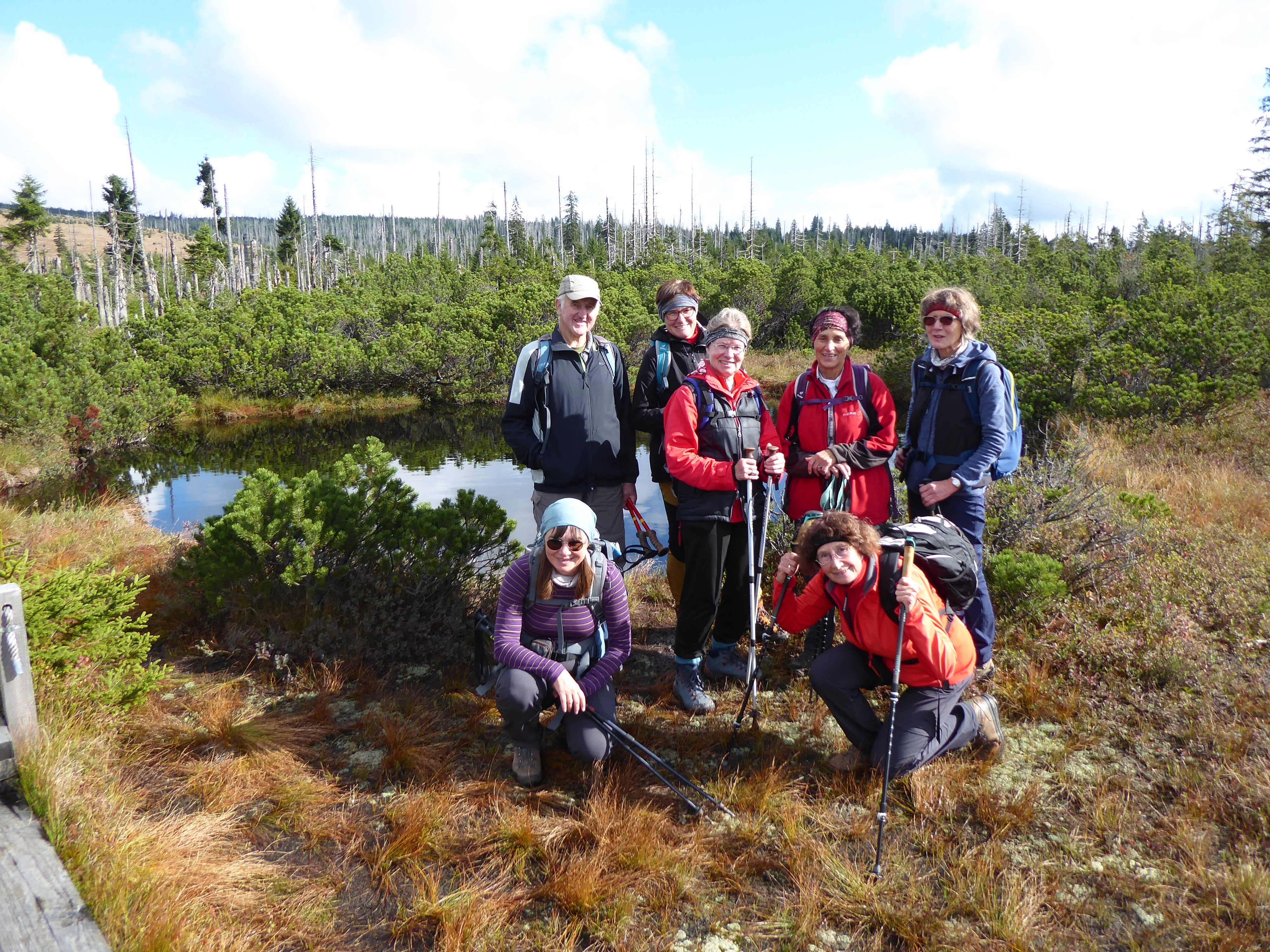 Eine sehr abwechslungsreiche Tour unternahmen 8 Alpenvereinsmitglieder mit Elfriede Niedermeier. Ausgehend von Buchenau wurde die 21 km lange große Schachtentour in Angriff genommen. Anfangs führte der Weg, im Aufstieg, zum Lindbergschachten, mit seinen sehr hohen Heidelbeersträuchern.Abwärts ging es, teils auf nassem Steig, zur Hirschbachschwelle. Durch das Zwieseler Filz führte der Weiterweg durch ein Hochmoor, das auf einem Holzbohlenweg, durch Latschen und Moortümpel durchschritten wurde. Ein Abstecher führte noch zum Latschensee. Die weiteren "Schachten" ehemalige Hochweiden, (bis ca. 1963) waren Kohl- und Hochschachten auf einer Höhe von 1150 m.Hier waren sogar noch Rinder auf einer Weide. Der Weiterweg führte noch zum Alm- und Verlorenen Schachten. Auf diesen ehemaligen Weiden befinden sich heute noch sehr alte, riesige Buchen, die der Witterung stand gehalten haben und den Tieren als Unterstand dienten. Durch den Wald, auf teils sehr steinigen Pfaden wurde die südliche Dammkrone des Frauenauer Trinkwasserspeichers erreicht. Über den Damm wurde dann noch nach Buchenau mit seinem Schloß zurückgekehrt. Nach der gut 7-stündigen, abwechslungsreichen, 21 km langen Wanderung, wurde noch bei der Dampfsäge Weber eingekehrt.