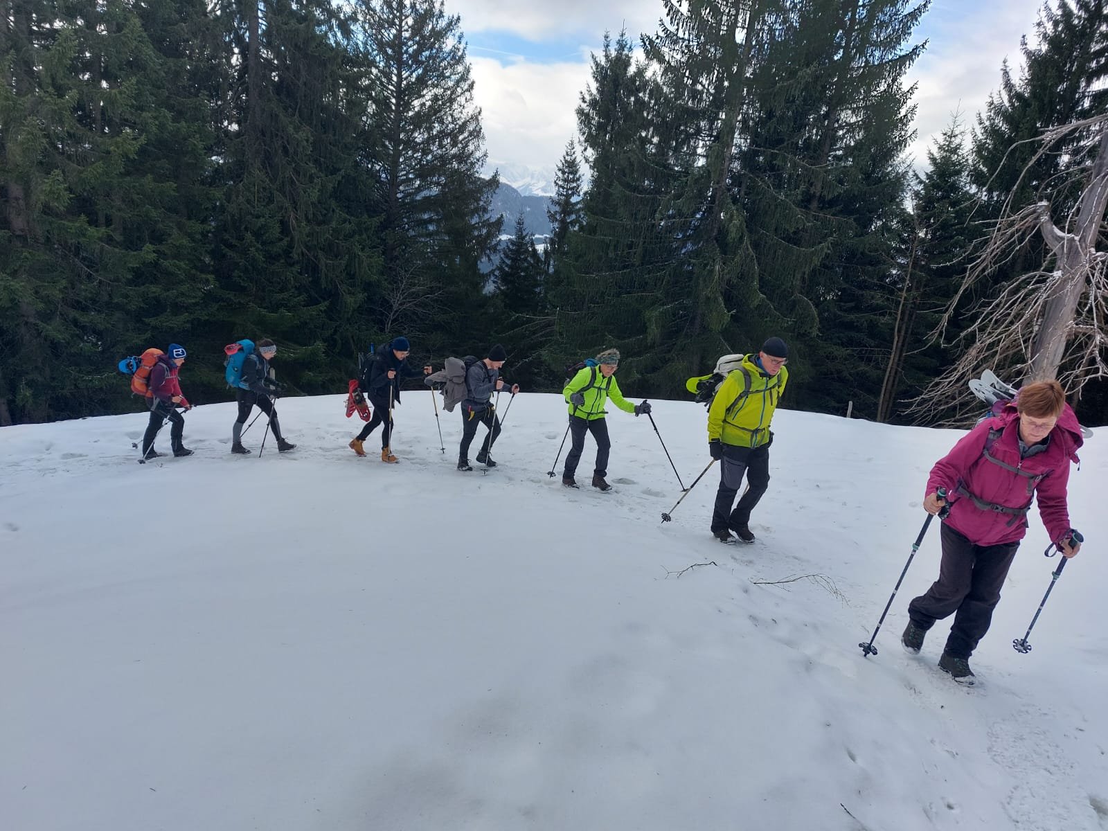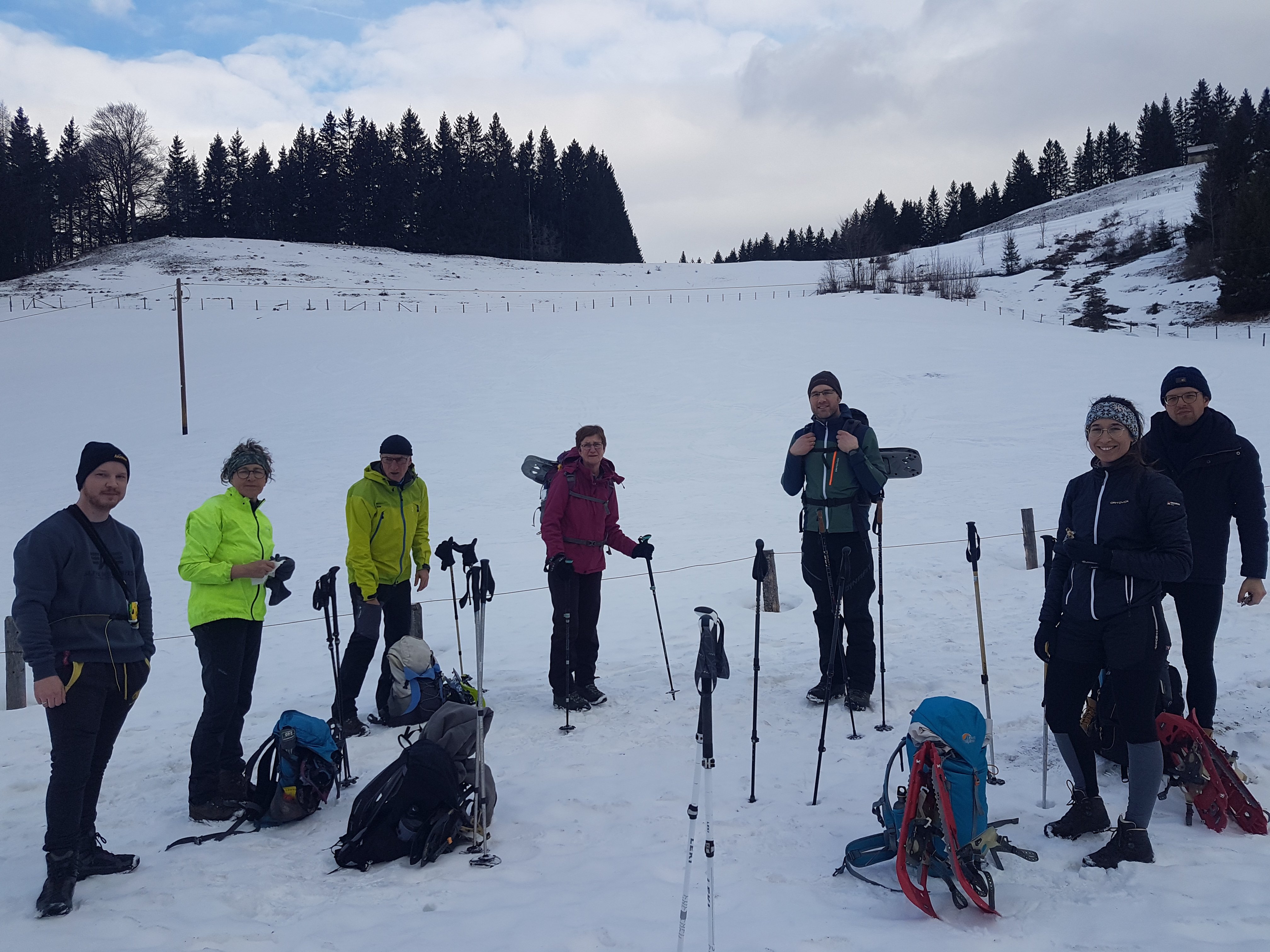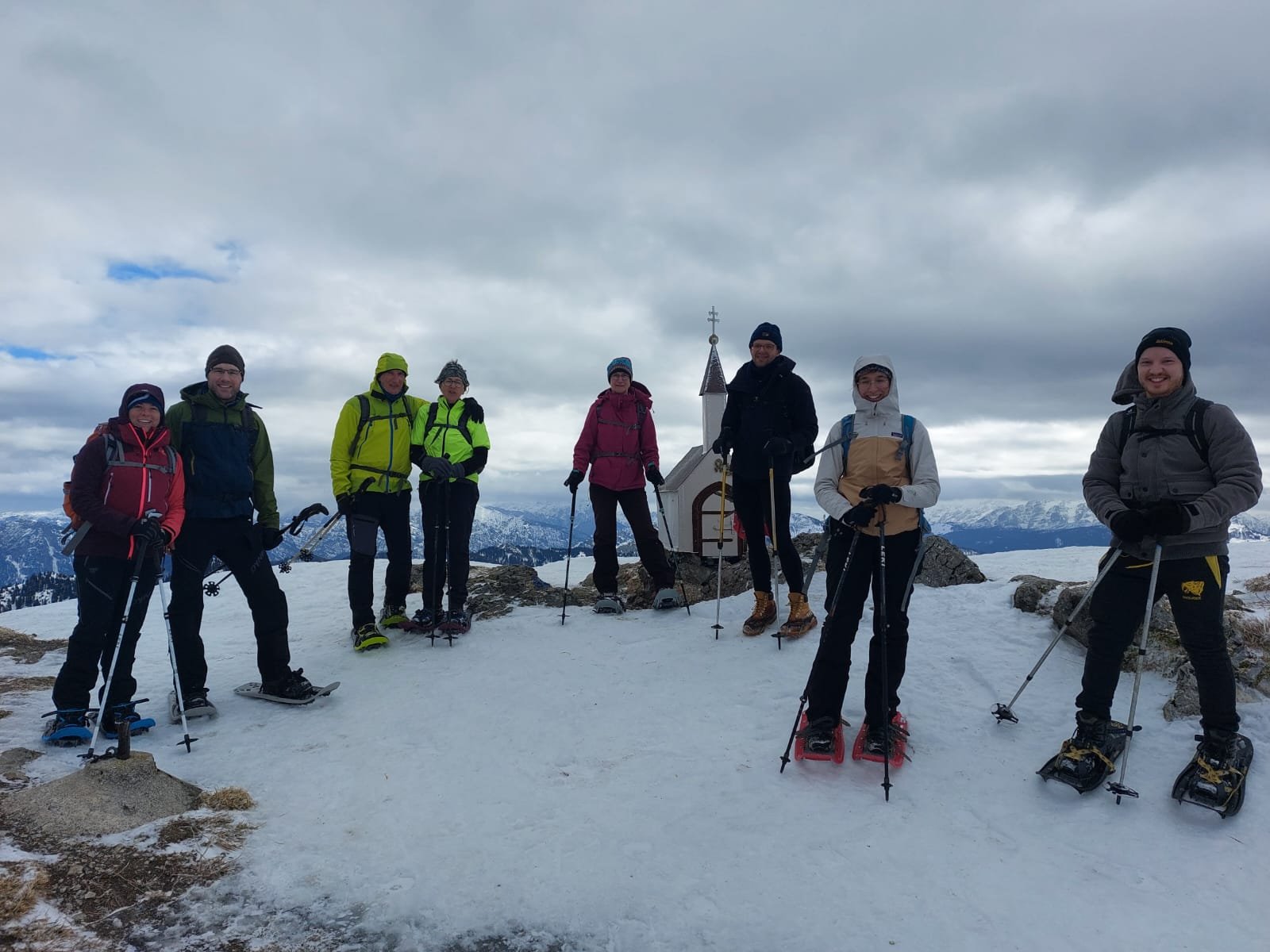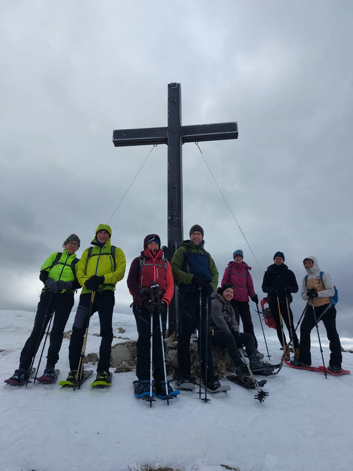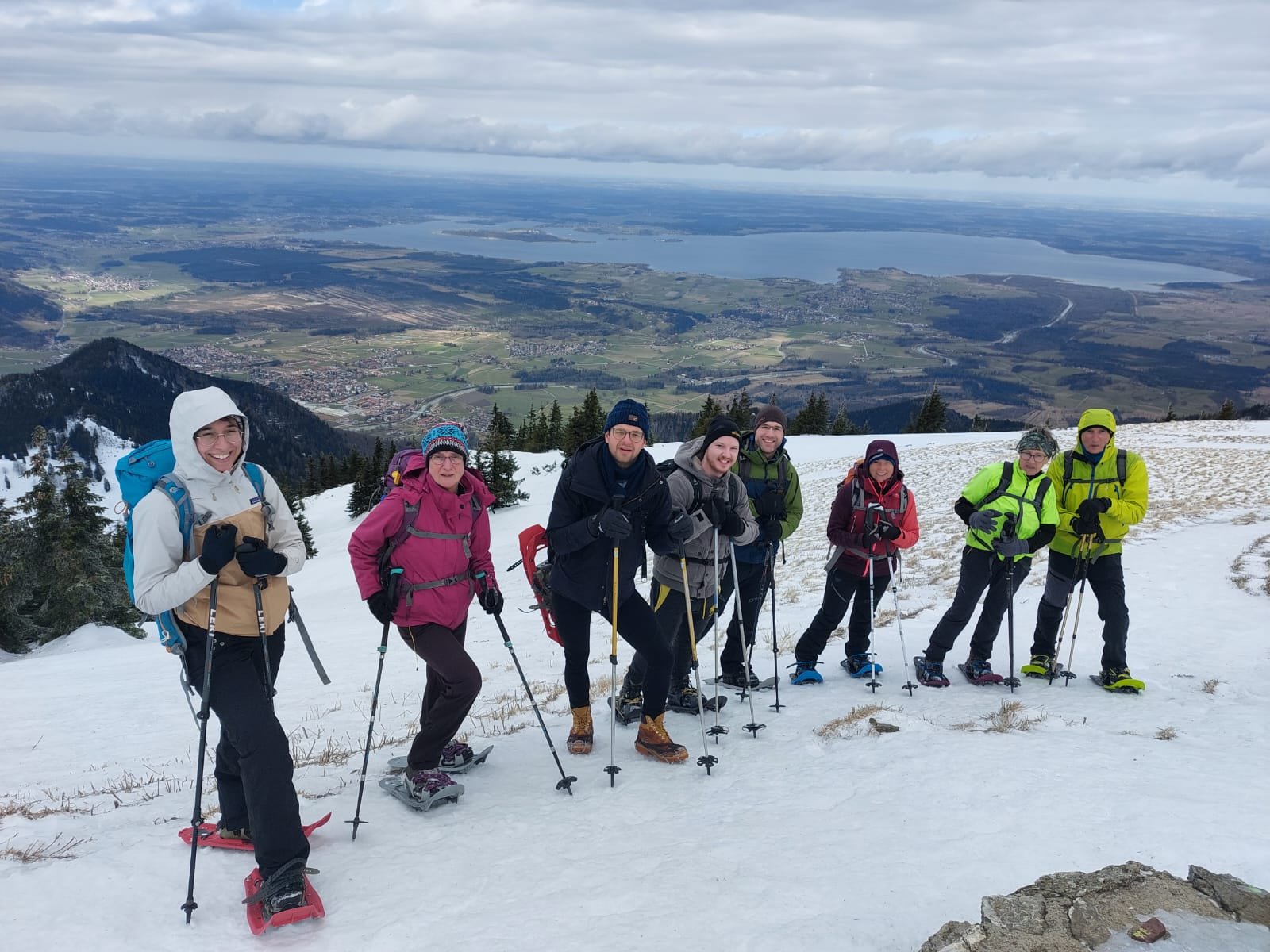 8 Schneeschuhbegeisterte der DAV Sektion Pfarrkirchen (inkl. einer Teilnehmerin der DAV Sektion München) haben unter Leitung von Jenny und Martin Huber eine Schneeschuhtour auf den Hochgern (1.748 Meter) unternommen. Trotz stürmischen Vorhersagen machten sich die Bergbegeisterten auf dem Weg ins schöne Chiemgau. Vom Parkplatz an der Burg in Marquartstein stieg die Gruppe über die Agergschwendalm zum Hochgernhaus (1.461 Meter) auf. Der Weg bis zum Hochgernhaus war teils stark vereist, aber noch nicht mit Schneeschuhen begehbar. Ab dem Hochgernhaus entschied sich die Gruppe die Schneeschuhe anzulegen. Aufgrund der Vereisung bis hoch zum Gipfel erwies sich dies als eine gute Idee. Am Gipfel bot sich der Gruppe ein herrlicher Blick von den Berchtesgadener Gipfeln über den Wilden Kaiser bis hin zu Kampenwand und Wendelstein. Es war zwar windig am Gipfel, aber im Vergleich zu den letzten Tagen hatte die Gruppe Glück und es war außer am Gipfel auf der gesamten Tour windstill. Nach einer kurzen Fotopause am Hochgern, kehrte die Gruppe noch im Hochgernhaus ein. Von dort ging es im Abstieg bis zur Bergwachthütte, wo die Teilnehmenden eine kleine LVS-Schulungseinheit zur Auffrischung einlegten. Nach der absolvierten Einheit ging es zurück zum Ausgangspunkt.