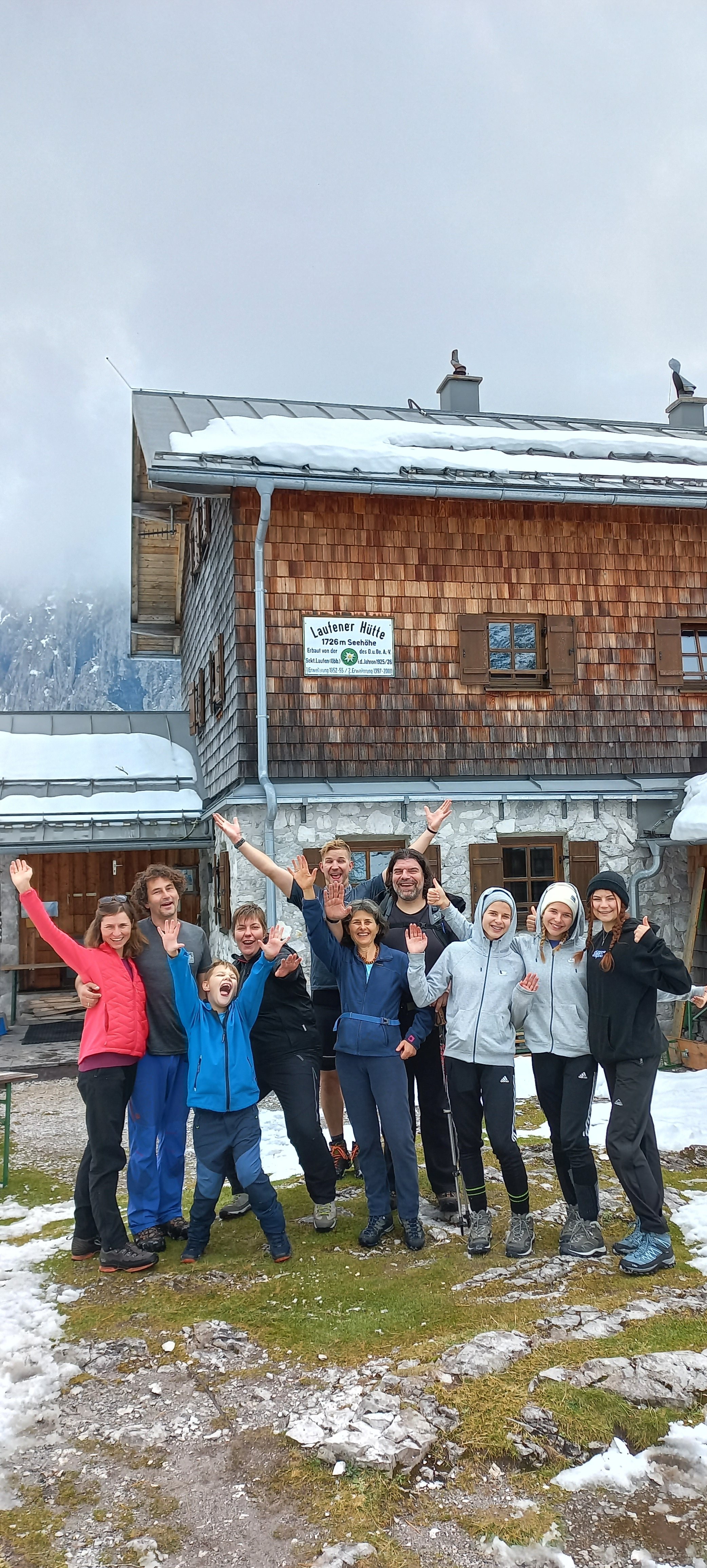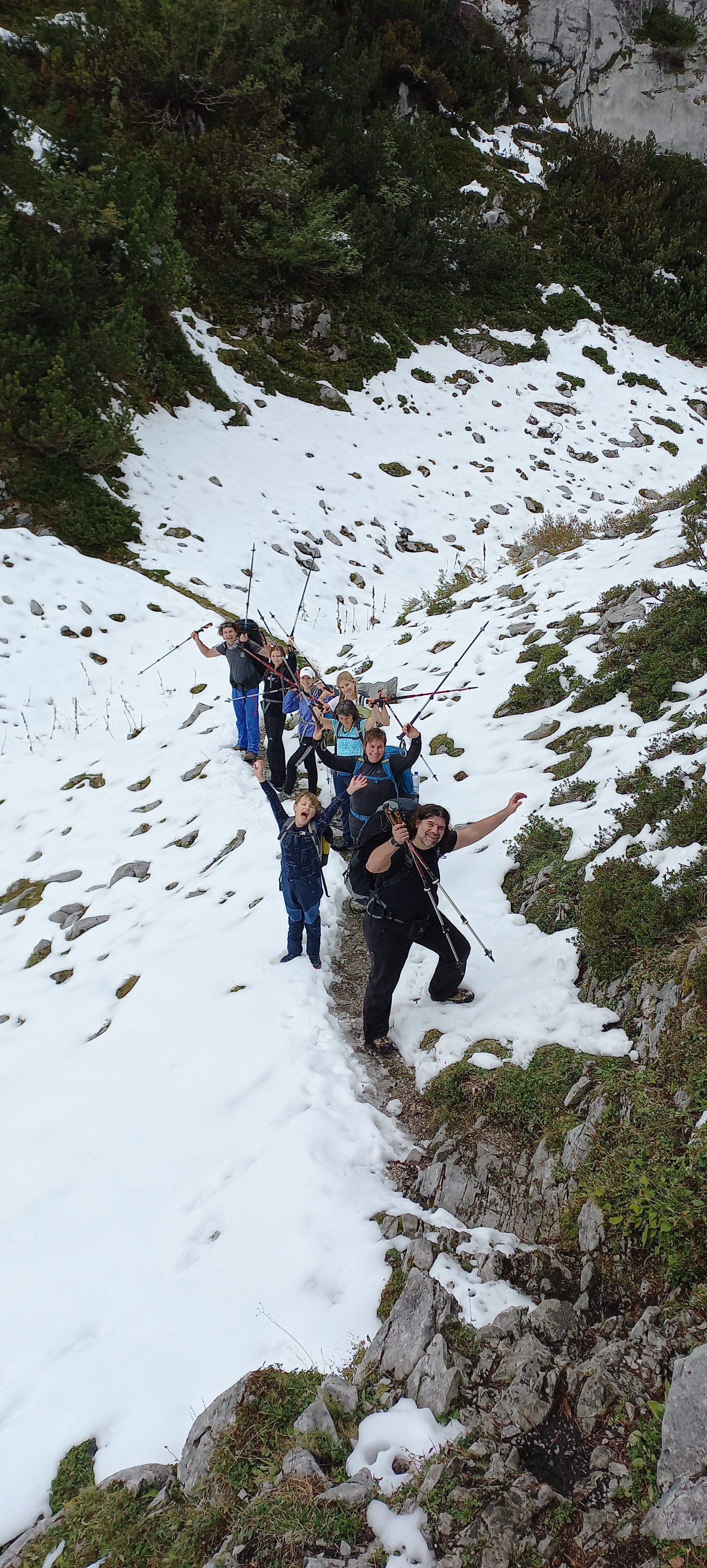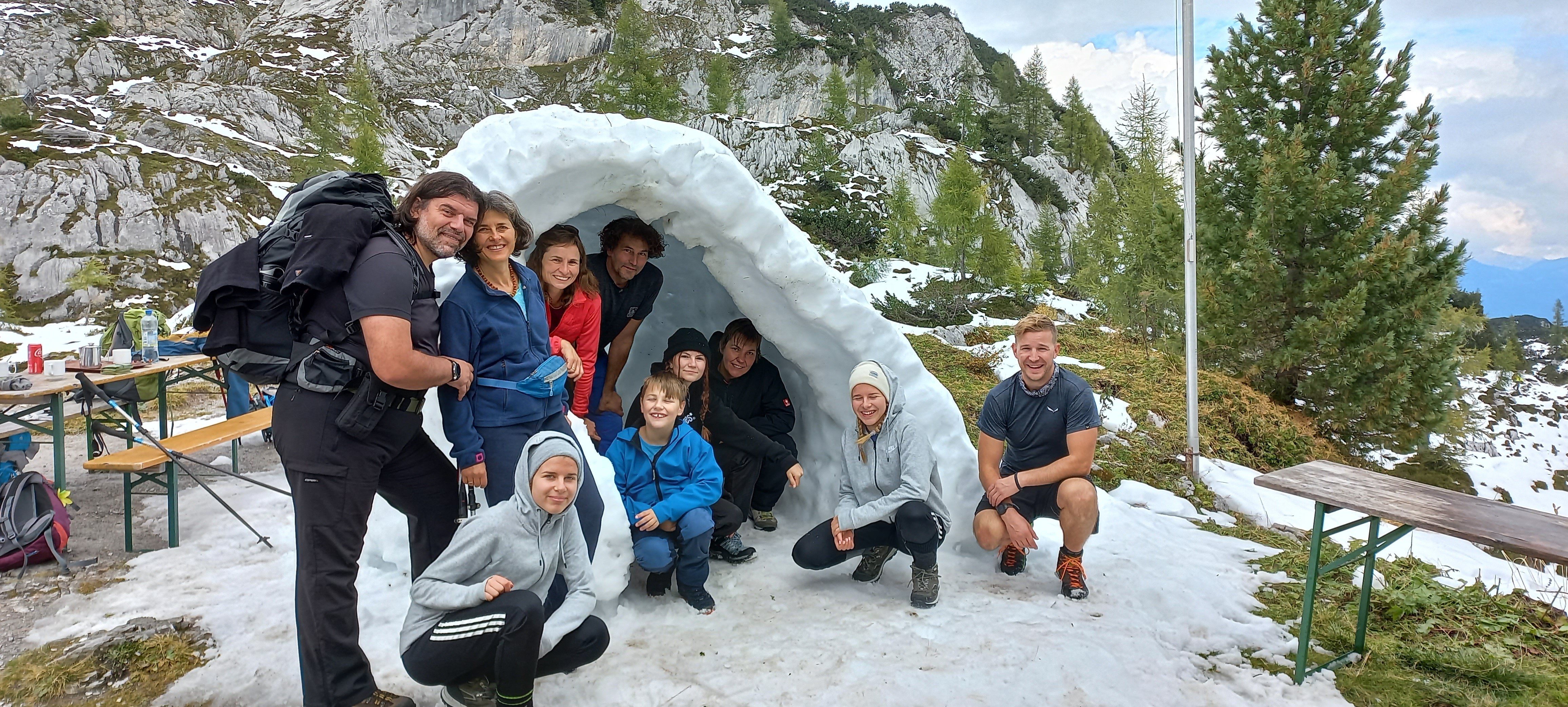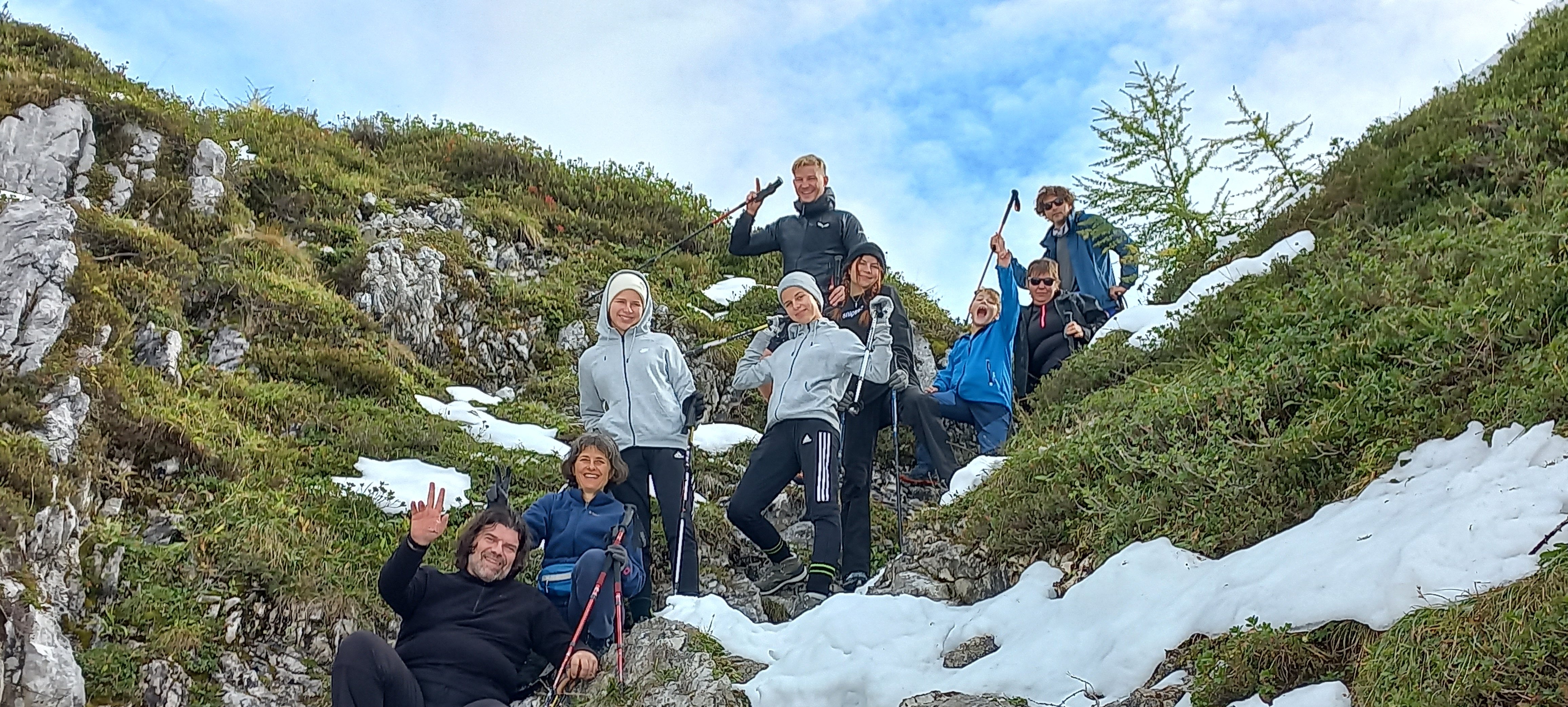 Fast hätte diese Tour wegen starkem Schneefall in der vorausgegangenen Woche abgesagt werden müssen, doch dank Tauwetter waren die Wege dann doch begehbar. Und so wanderten insgesamt 10 Teilnehmer der Familiengruppe unter Leitung von Karin und Axel Neuß von Abtenau aus am 24.09. zunächst noch durch den Herbstwald bergauf. Am Holzlager mitten im Wald wurde Brotzeit gemacht und der frei gewordene Platz in den Rucksäcken durch Holzscheite wieder aufgefüllt, die zum Heizen zur Laufener Hütte mitgenommen wurden. Auf 2/3 des Weges begannen dann die ersten Schneefelder, was die Kids natürlich gleich für die ersten Schneebälle der Saison nutzten. An der Hütte angekommen blieb noch Zeit zum Faulenzen und für gemeinsame Spiele, bevor dann abends Spaghetti und die gefundenen Pilze zu einem leckeren Abendessen zubereitet wurden. Nach dem Essen wurde wieder gespielt und der Hüttenwirt spielte auf der Quetsche. Es war ein sehr gemütlicher und lustiger Abend und es wurde viel gelacht.
