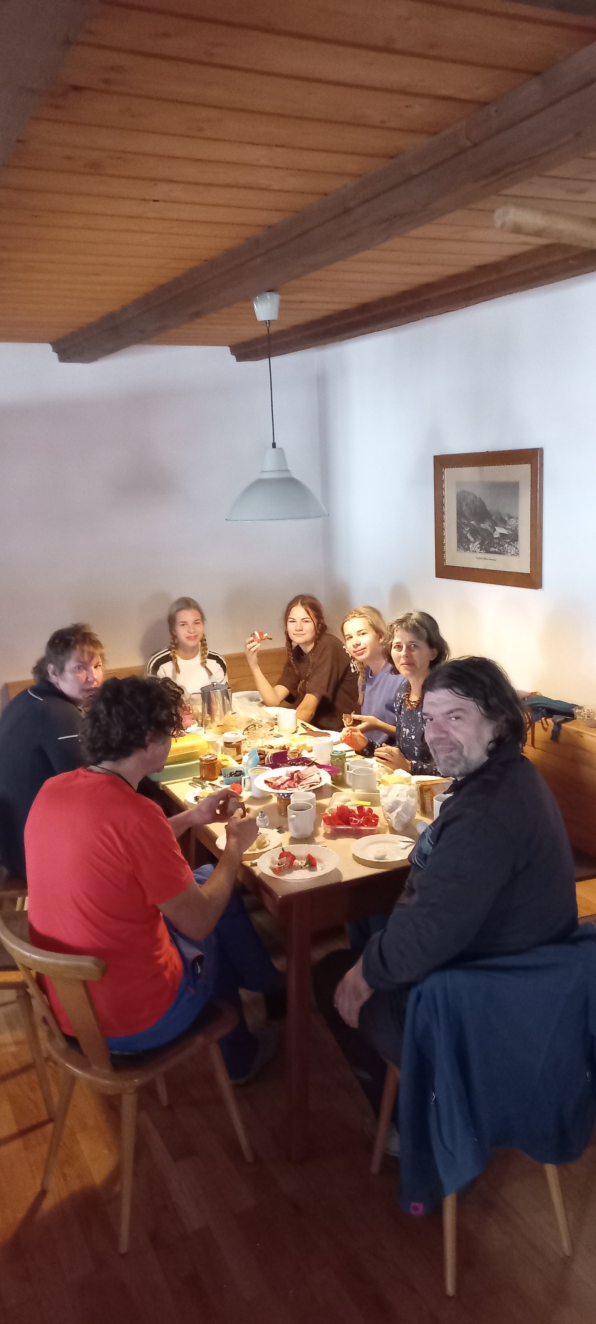 Am nächsten Morgen gab es ein Frühstücksbuffet, zu dem alle Teilnehmer etwas beitrugen. So gestärkt unternahm die Gruppe eine kleine Wanderung rund um die Hütte und entdeckte dabei sogar noch einige Murmeltiere, die zwischen den Schneefeldern versuchten, sich letzten Winterspeck anzufuttern. Bei einer gemeinsamen Übung versuchten sich die Familien so viele Details wie möglich von der beeindruckenden Berglandschaft einzuprägen um schöne Erinnerungen mit ins Tal zu nehmen.