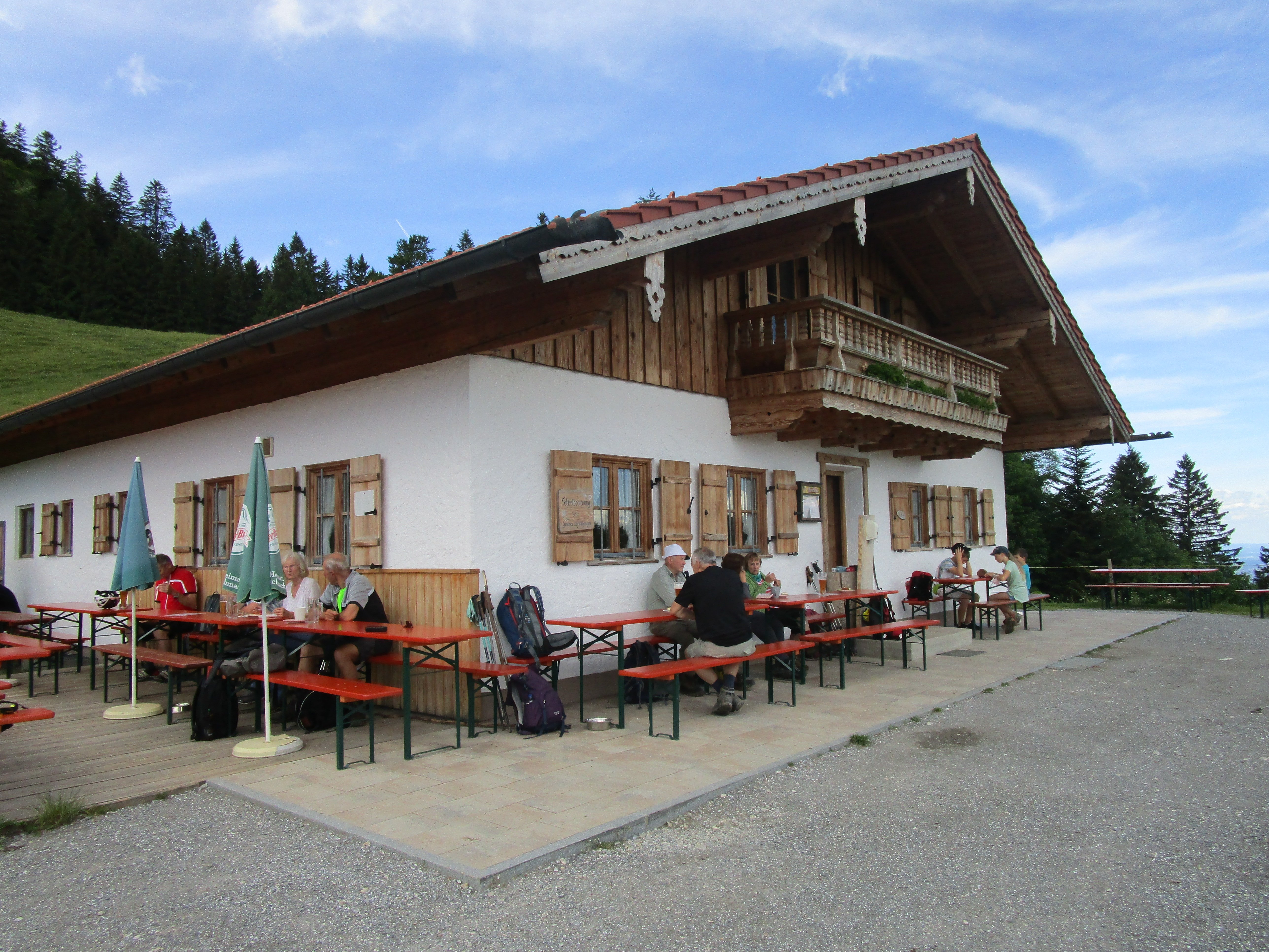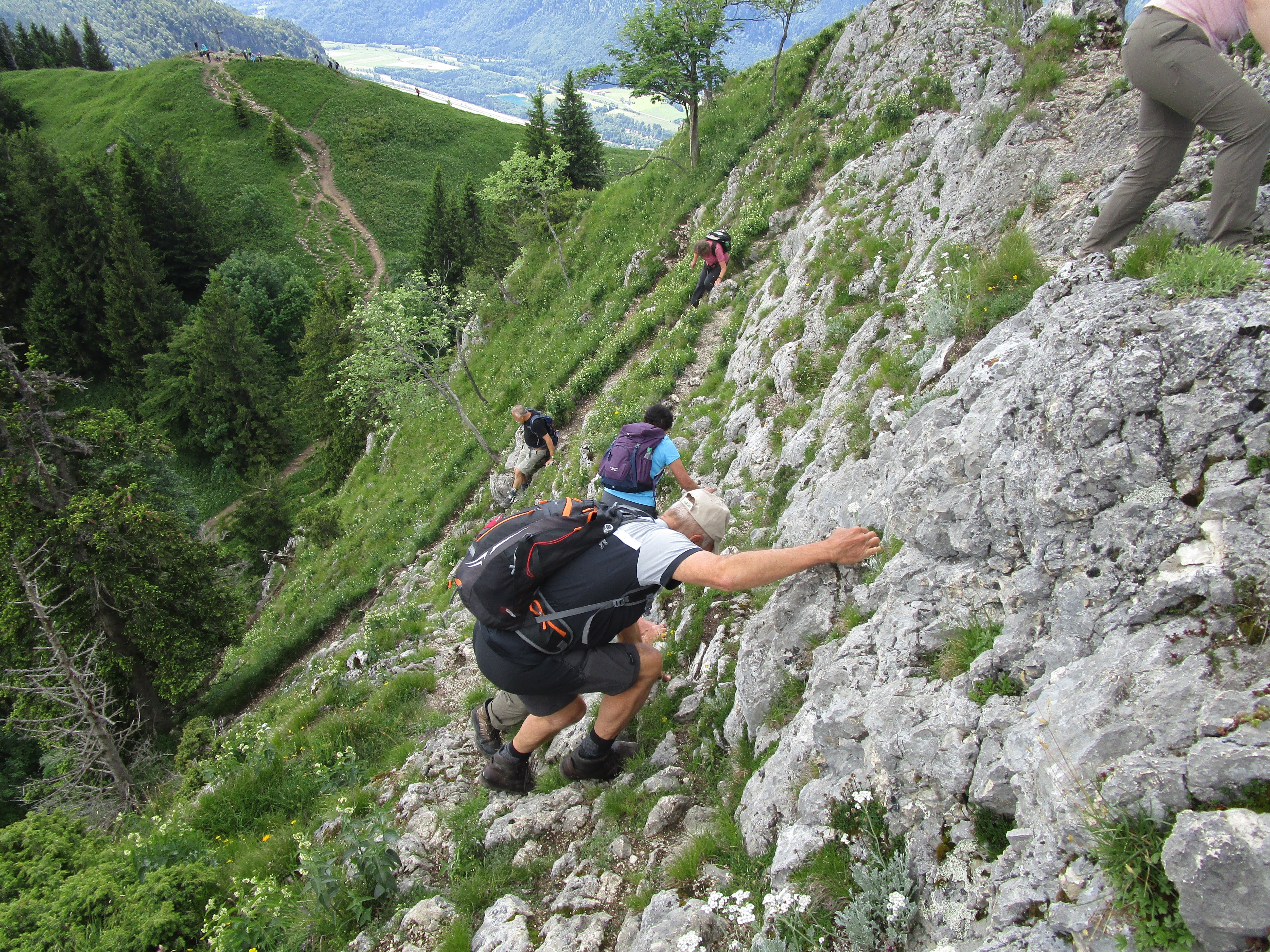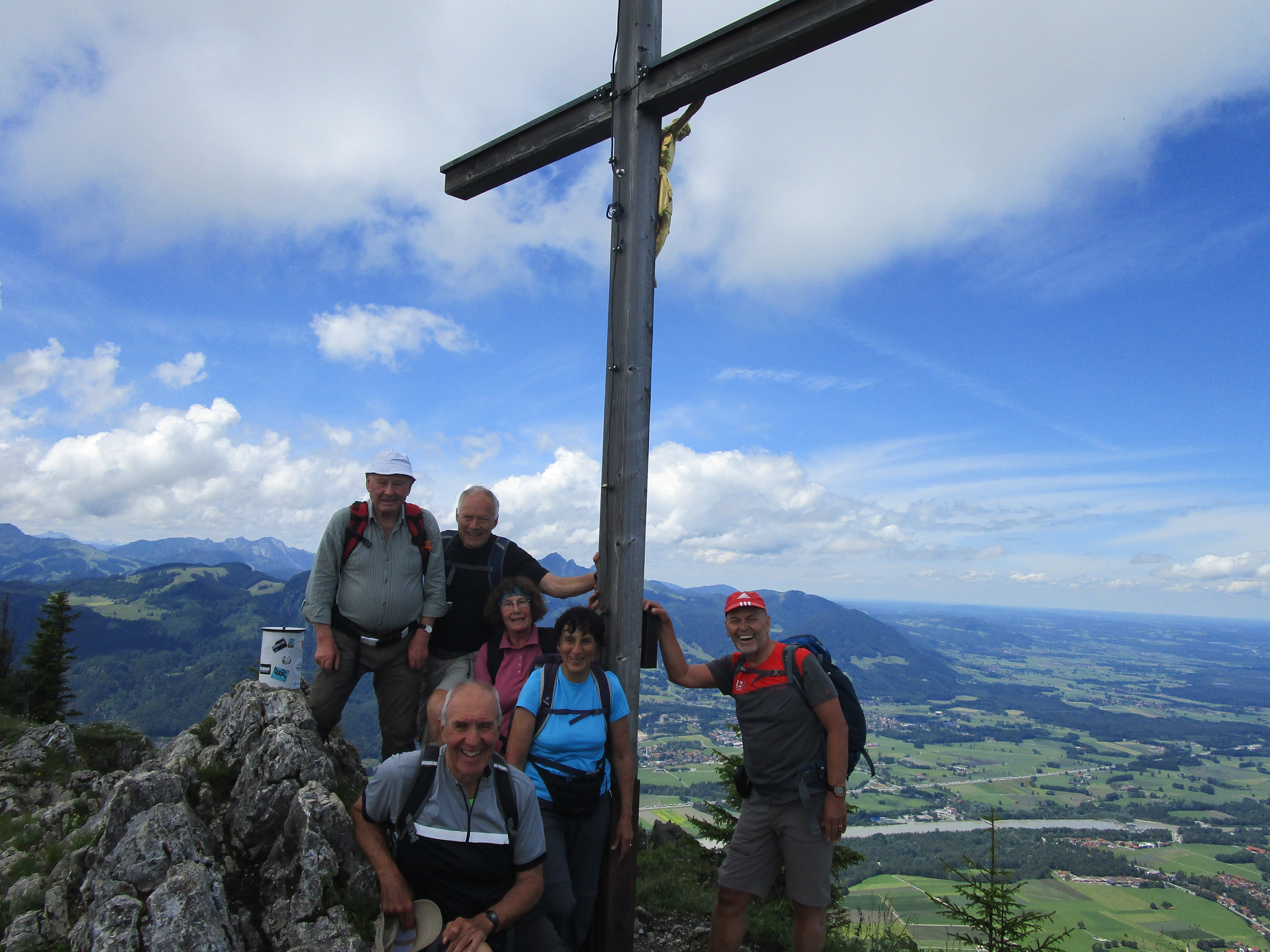Nach Regen am Vortag und in der Nacht zeigte der Himmel Erbarmen und es wurde ein schöner, nicht zu warmer Tag, ideal zum Bergwandern. Über Mailach und die traumhaft erblühten Wiesen des Wassertals erfolgte der Aufstieg steiler werdend bis zum Sattel, der rechts zur Kindlwand und links in südlicher Richtung um die Wasserwand herum zum Gipfel des Heubergs führte. Die Teilnehmer habe die erschwerten Bedingungen auf dem nassen Wurzelweg bravourös gemeistert. 6 der 13 Teilnehmer kraxelten noch auf dem seilgesicherten Klettersteig zur Wasserwand, der Rest wartete auf dem Heuberggipfel und genoss in der Sonne die herrliche Aussicht nach Westen auf die Berge des Mangfallgebirges und nach Osten auf die Gipfelreihe Hochries, Karkopf und Feichteck. Auch der Spitzstein grüßte herüber. Der Abstieg auf dem immer nassen Steig durch den Wald zur Daffnerwaldalm wurde ohne Ausrutscher geschafft. Auf der schönen Deindlhütte der Daffneralm erfolgte eine Einkehr, bevor es auf einer zunächst betonierten Straße bergab zu der Kreuzung Mailach ging. Von dort auf gleichem Wege durch den Wald wie beim Aufstieg zurück zum Parkplatz.