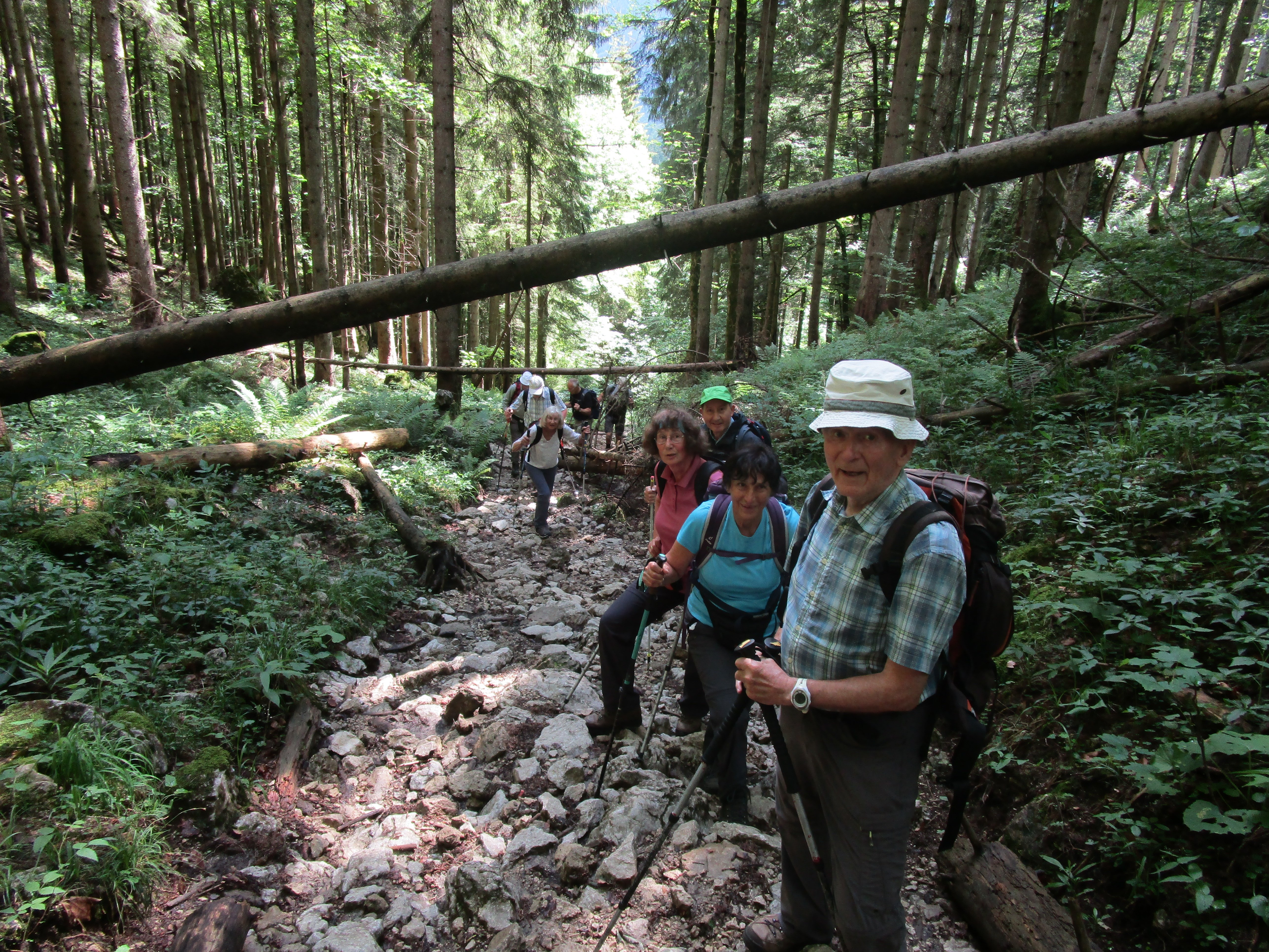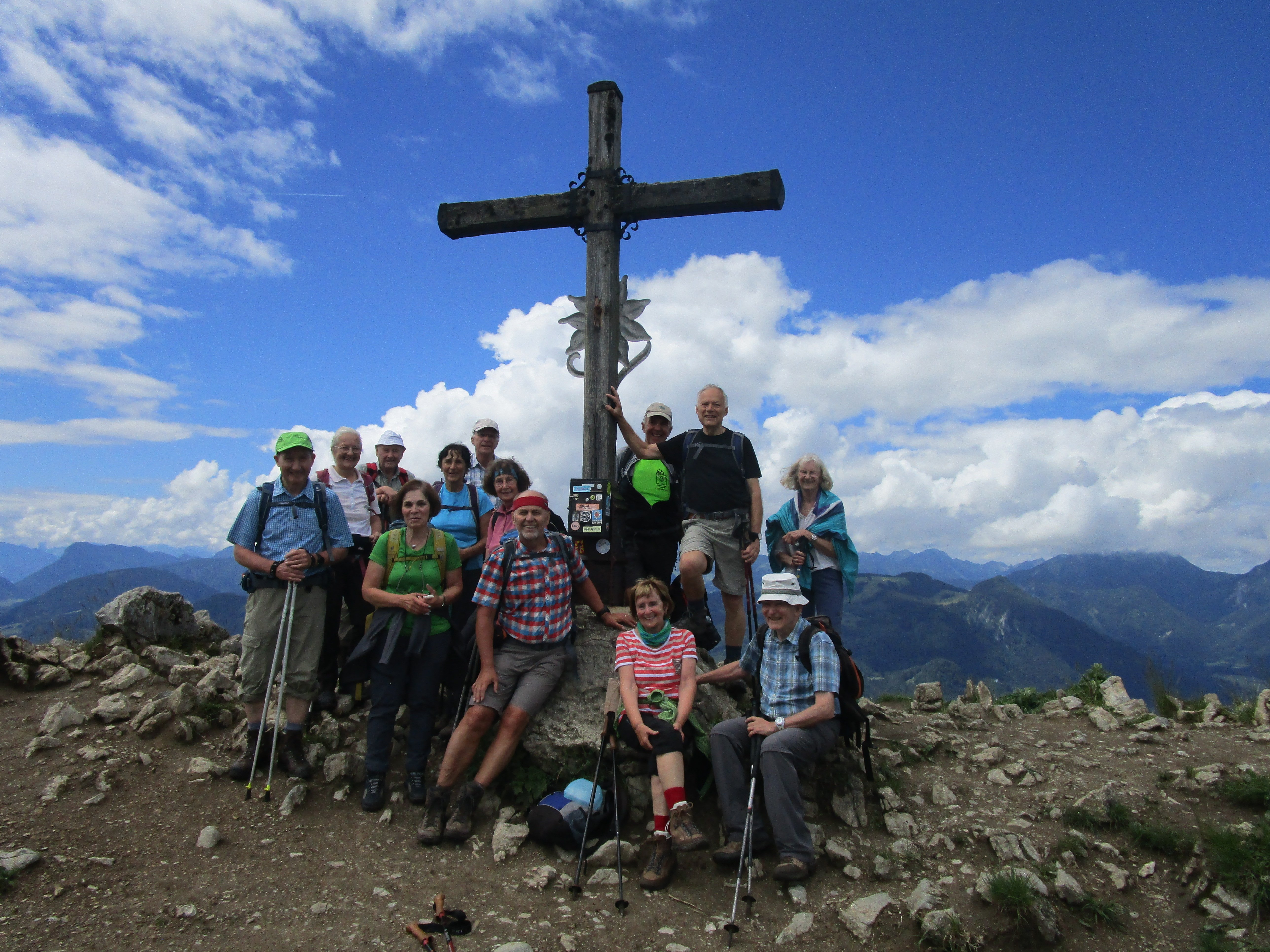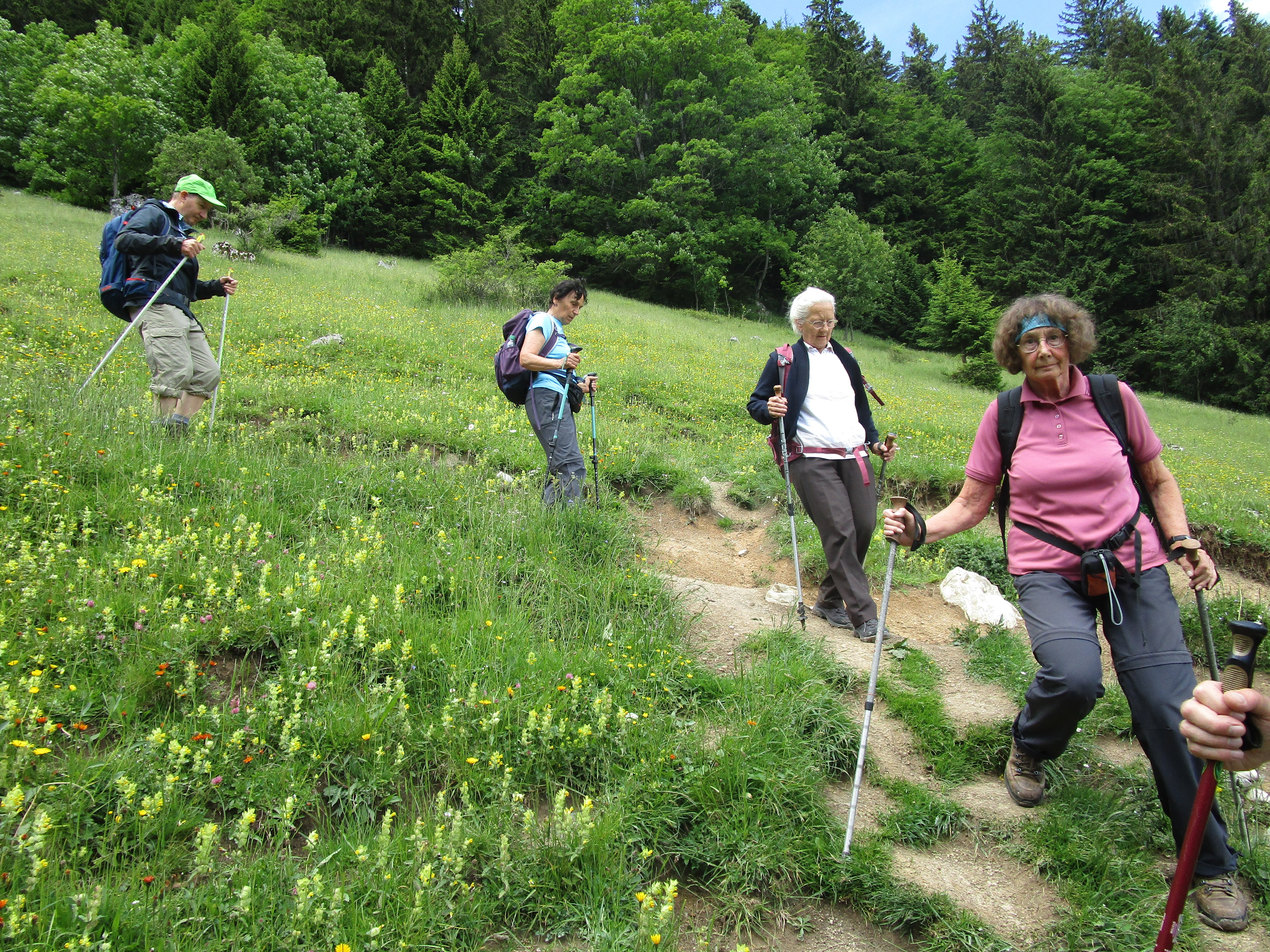 Nach Regen am Vortag und in der Nacht zeigte der Himmel Erbarmen und es wurde ein schöner, nicht zu warmer Tag, ideal zum Bergwandern. Über Mailach und die traumhaft erblühten Wiesen des Wassertals erfolgte der Aufstieg steiler werdend bis zum Sattel, der rechts zur Kindlwand und links in südlicher Richtung um die Wasserwand herum zum Gipfel des Heubergs führte. Die Teilnehmer habe die erschwerten Bedingungen auf dem nassen Wurzelweg bravourös gemeistert. 6 der 13 Teilnehmer kraxelten noch auf dem seilgesicherten Klettersteig zur Wasserwand, der Rest wartete auf dem Heuberggipfel und genoss in der Sonne die herrliche Aussicht nach Westen auf die Berge des Mangfallgebirges und nach Osten auf die Gipfelreihe Hochries, Karkopf und Feichteck. Auch der Spitzstein grüßte herüber. Der Abstieg auf dem immer nassen Steig durch den Wald zur Daffnerwaldalm wurde ohne Ausrutscher geschafft. Auf der schönen Deindlhütte der Daffneralm erfolgte eine Einkehr, bevor es auf einer zunächst betonierten Straße bergab zu der Kreuzung Mailach ging. Von dort auf gleichem Wege durch den Wald wie beim Aufstieg zurück zum Parkplatz.