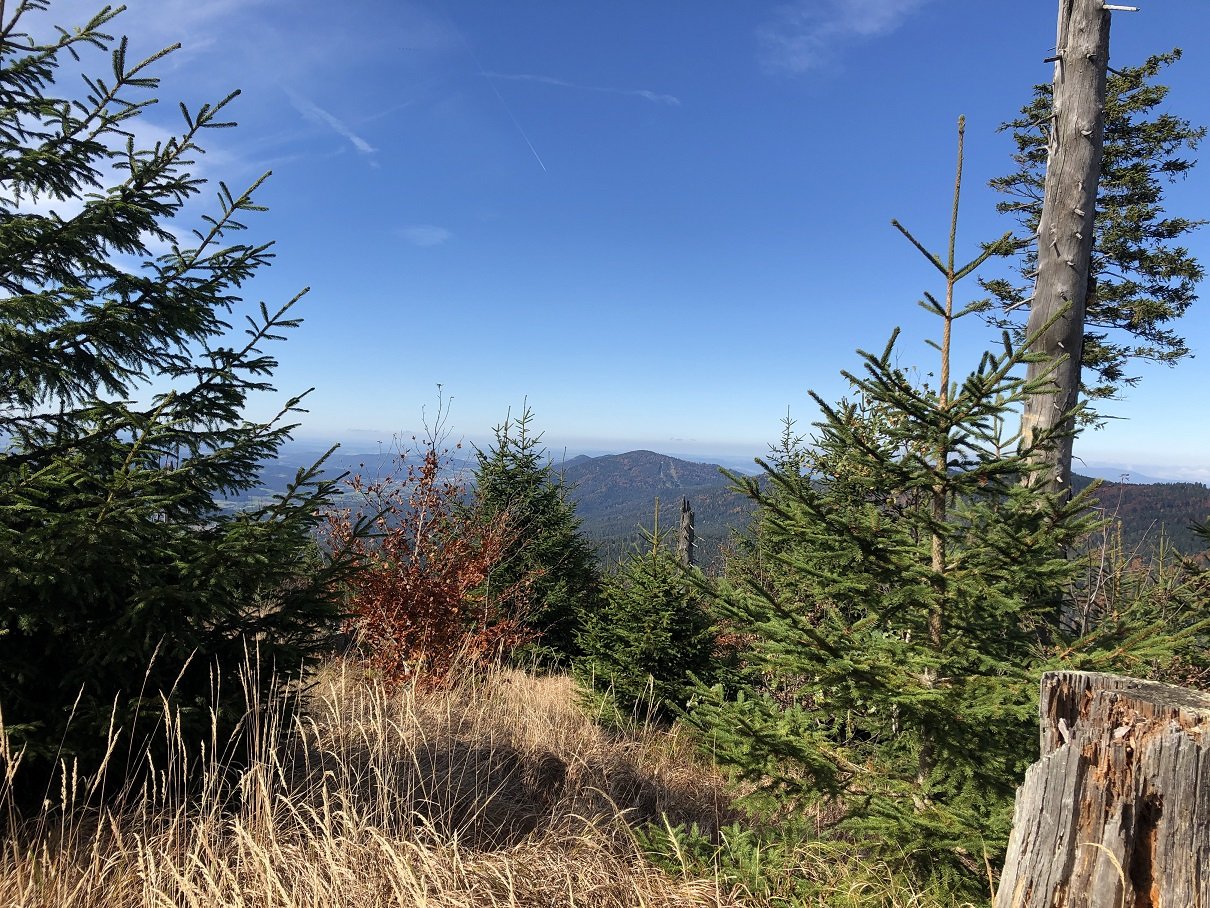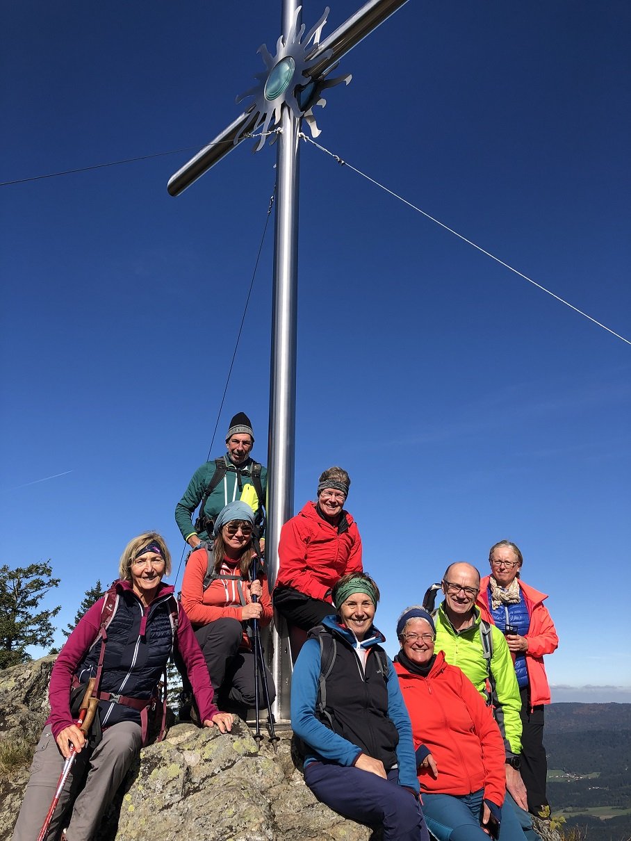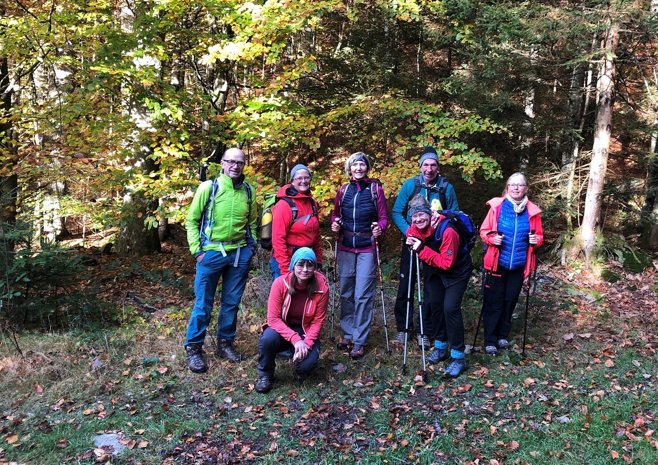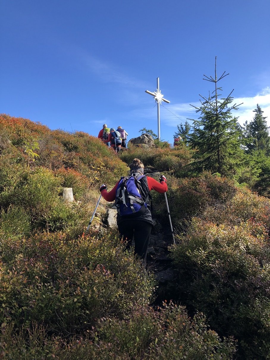 Startpunkt war bei der Poschinger Hütte nahe Arnbruck. Zunächst führte ein einsamer Urwaldweg durch ein wildromantisches Waldgebiet am Schussbach entlang, mit kleinen Wasserfällen und faszinierenden Gesteinsformationen. Am Waldwiesmarterl mündete der Weg in den Goldsteig, der die Gruppe über fast alpine Wege auf den ersten Gipfel, das Schwarzeck (1235m), brachte. Den weiteren Weg begleiteten bunt gefärbte Herbstwälder und Blicke auf die umliegenden Gipfel bis weit hinaus ins Donautal. Der höchste Punkt wurde am nepalesisch anmutenden Gipfel des Heugstatt (1262m) erreicht. Der Rückweg führte an der stark frequentierten Berghütte Schareben vorbei, wo sich die Wanderer und Wanderinnen noch stärkten und die Sonne genossen. Nach 16 km und fast 700 Höhenmetern ging ein schöner Wandertag zu Ende.