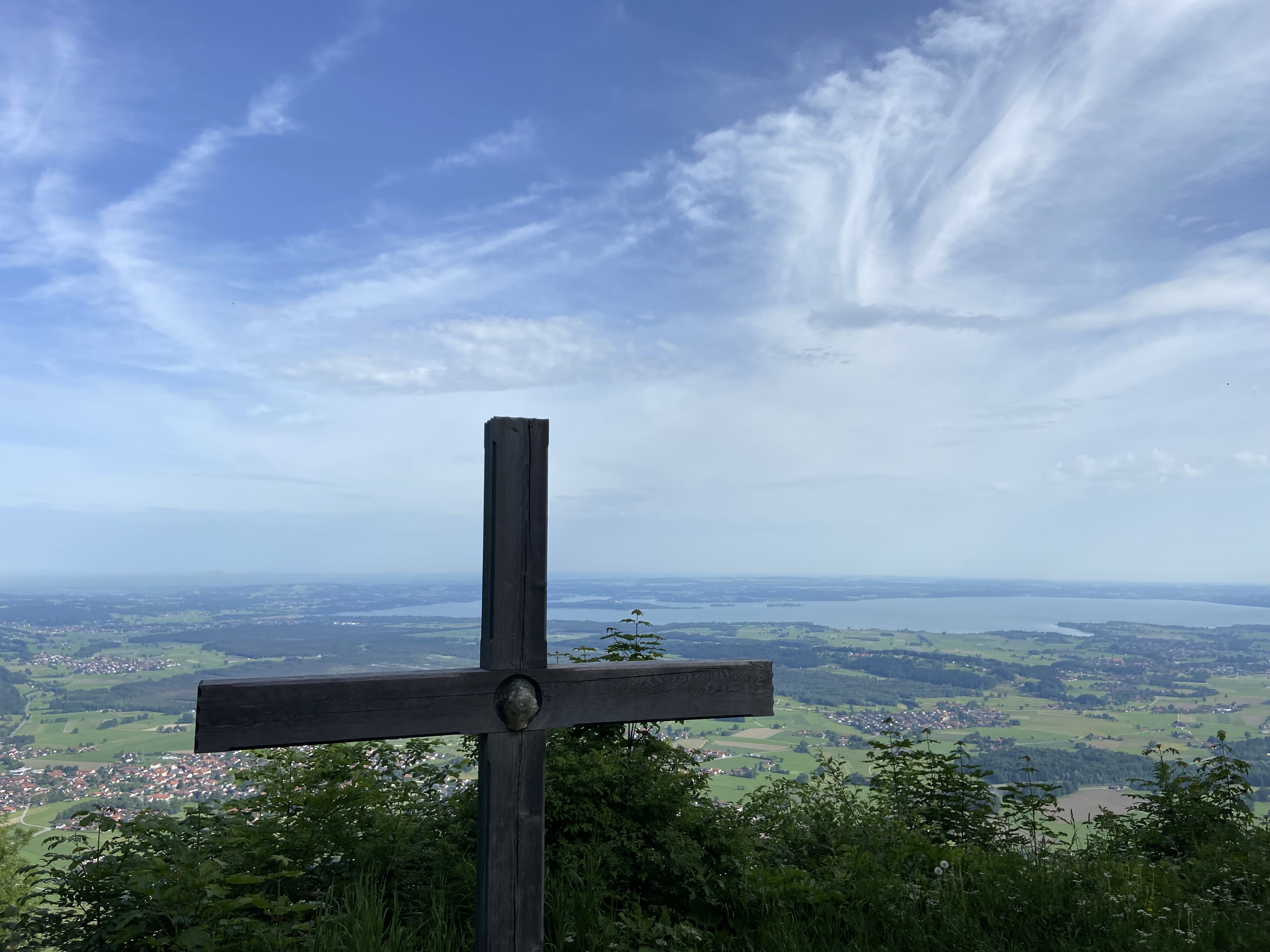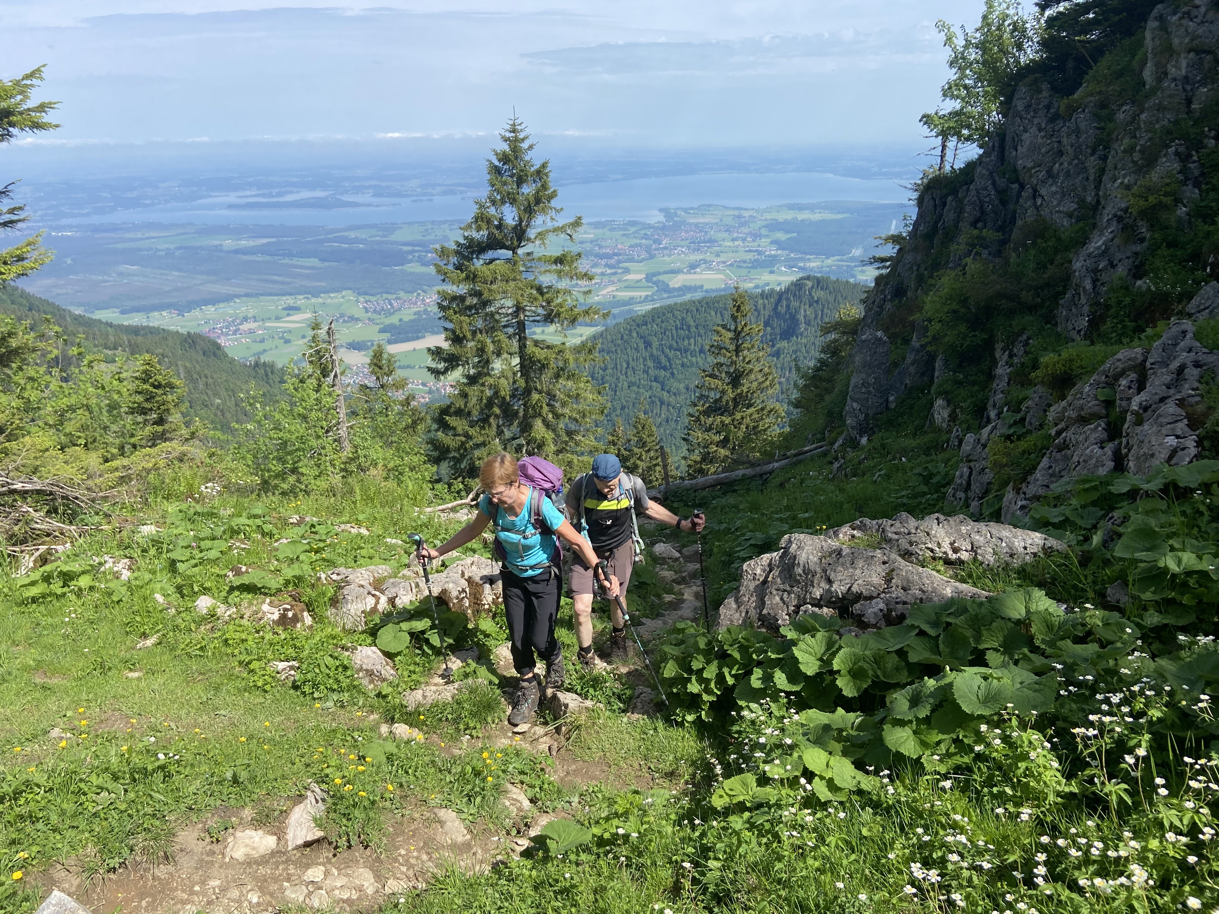 Am Gipfel war es etwas neblig und windig, weshalb wir nach einer kurzen Pause in Richtung des Hochgernhauses absteigen. Oberhalb der Enzian-Hütte führte uns ein wenig begangener und herausfordernder Steig, unter dem Hochlerch vorbei, zurück zu einer Einkehr an der Staudacher Alm.