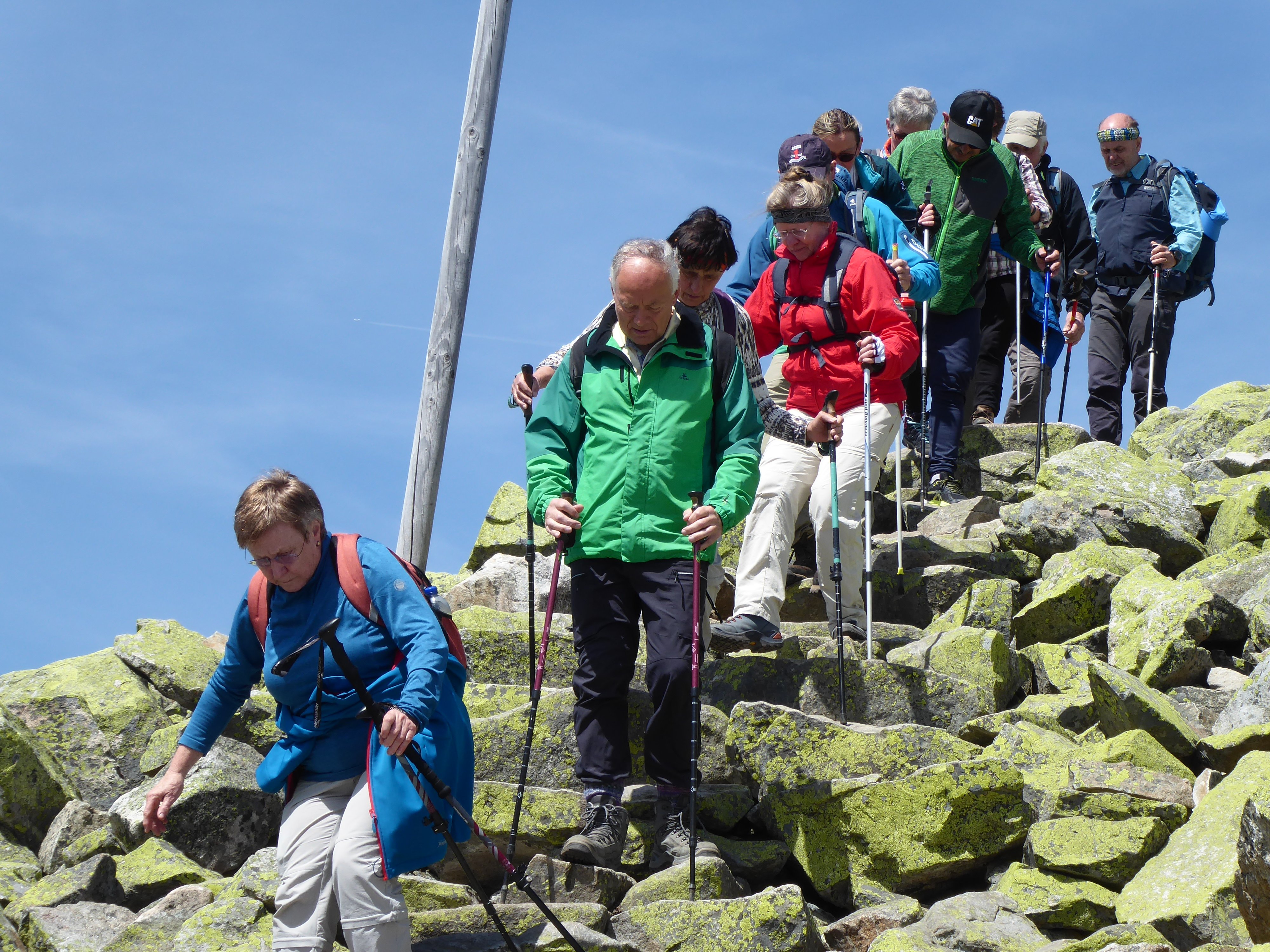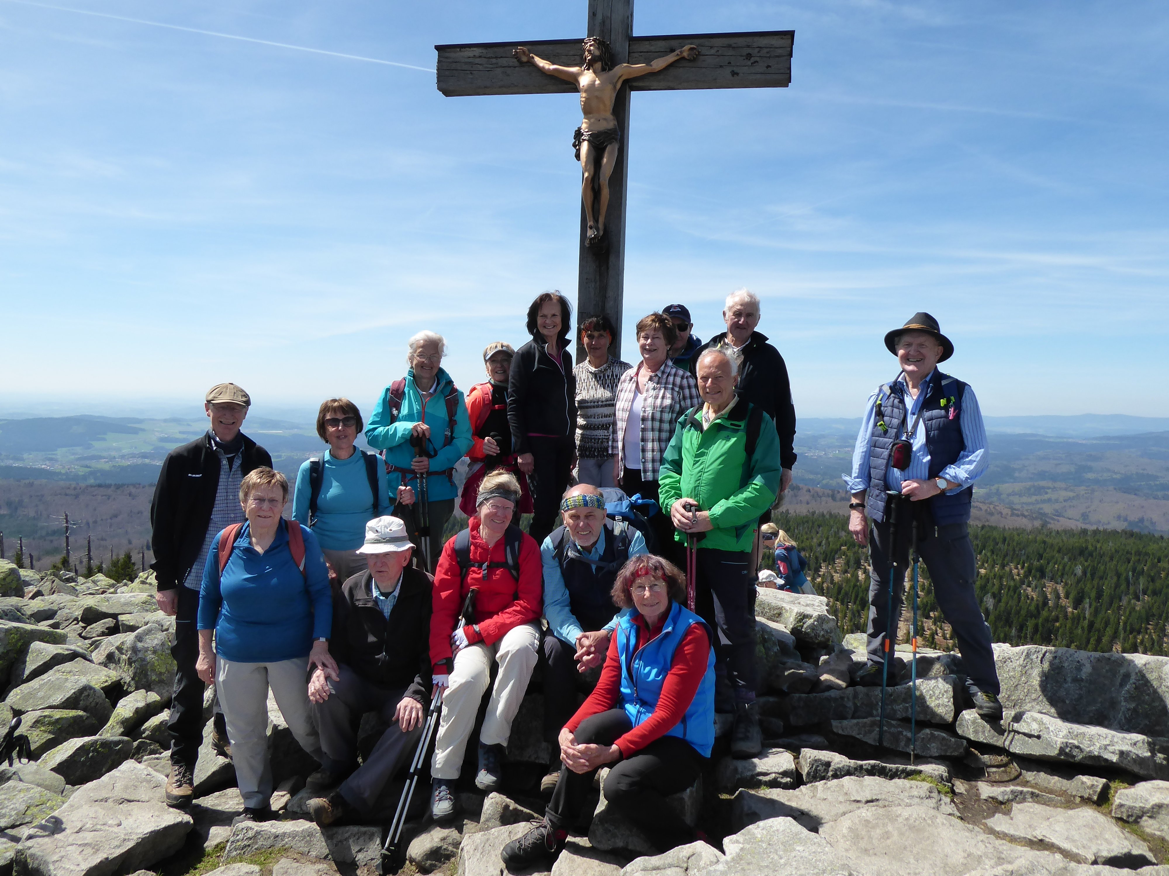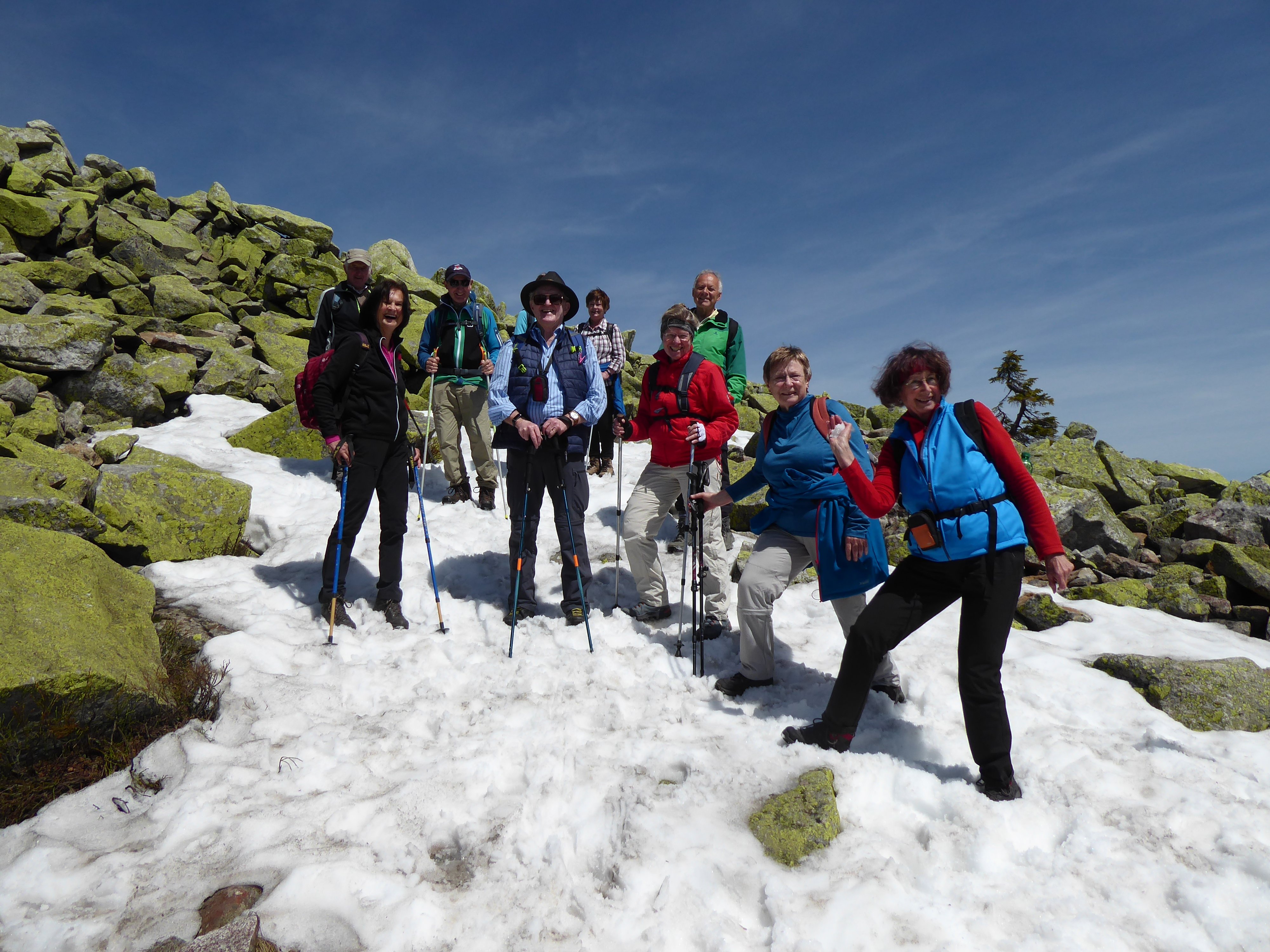 Einen schönen Wandertag erlebten 16 Teilnehmer , der Alpenvereinssenioren, zum Lusen 1373 m, zum Lusen im Bay. Wald. Mit Tourenleiterin Elfriede Niedermeier starteten die Teilnehmer an der "Fredenbrücke" bei Waldhäuser zu der abwechslungsreichen Tour. Entlang der kleinen Ohe war das erste Ziel die Martinsklause, mit seinem Stausee. Weiter ging es zum "Teufelsloch" , und auf einem Bohlenweg wurde die "gläserne Arche" erreicht. Auf dem Weg zum Lusengipfel mußte die "Himmelsleiter" auf rund 500 Granitblöcken überwunden werden. Bei der Gipfelrast konnte die schöne Aussicht genossen werden. Der Abstieg zum Lusenschutzhaus führte durch das "Blockmeer", wobei noch ein größeres Schneefeld zu finden war. Im Abstieg wanderte die Gruppe zuerst auf dem Winterweg zur Waldhausreibe, dann durch den Wald zurück zur Martinsklause. Die Rundtour führte entlang der kleinen Ohe zurück zum Ausgangspunkt.