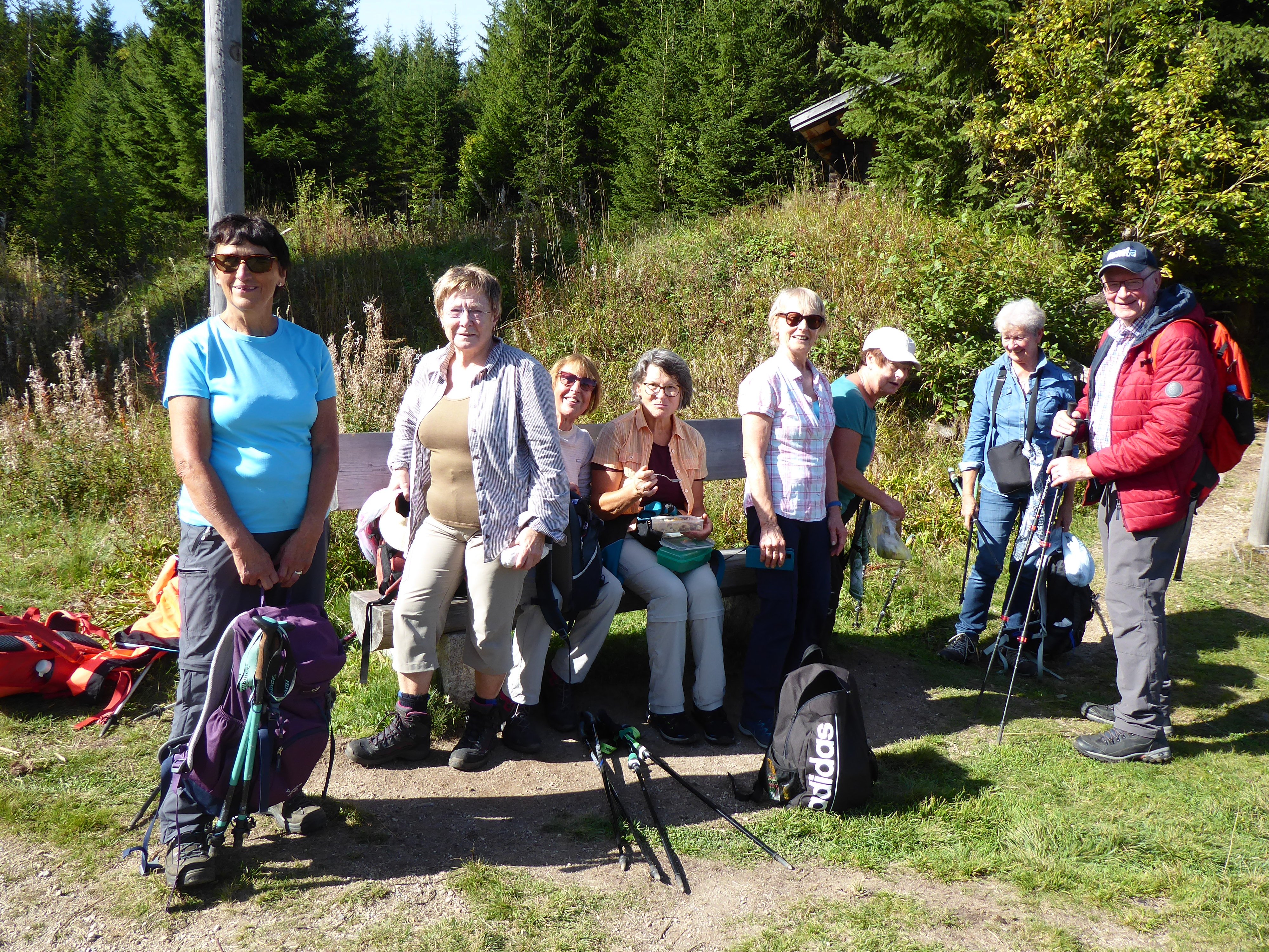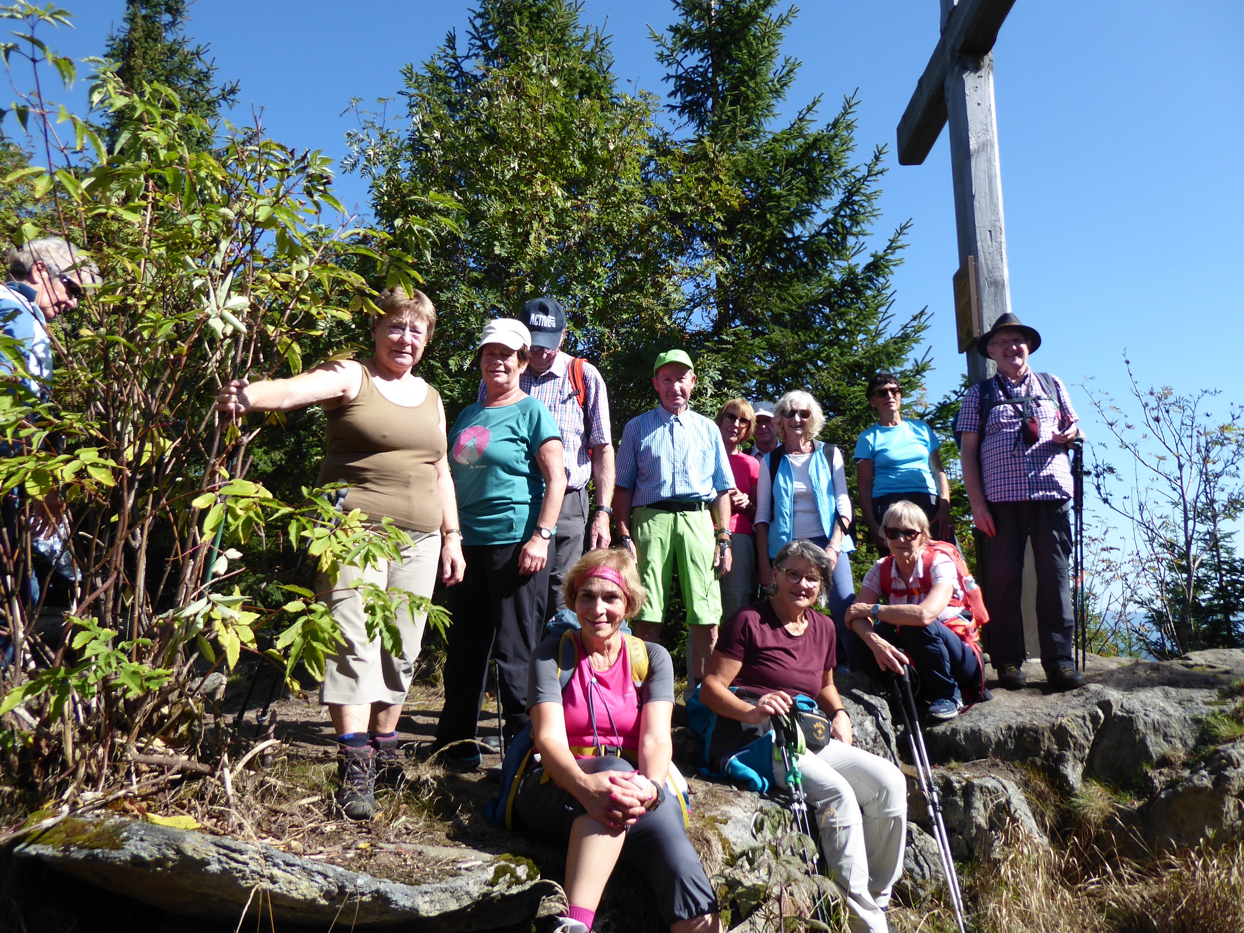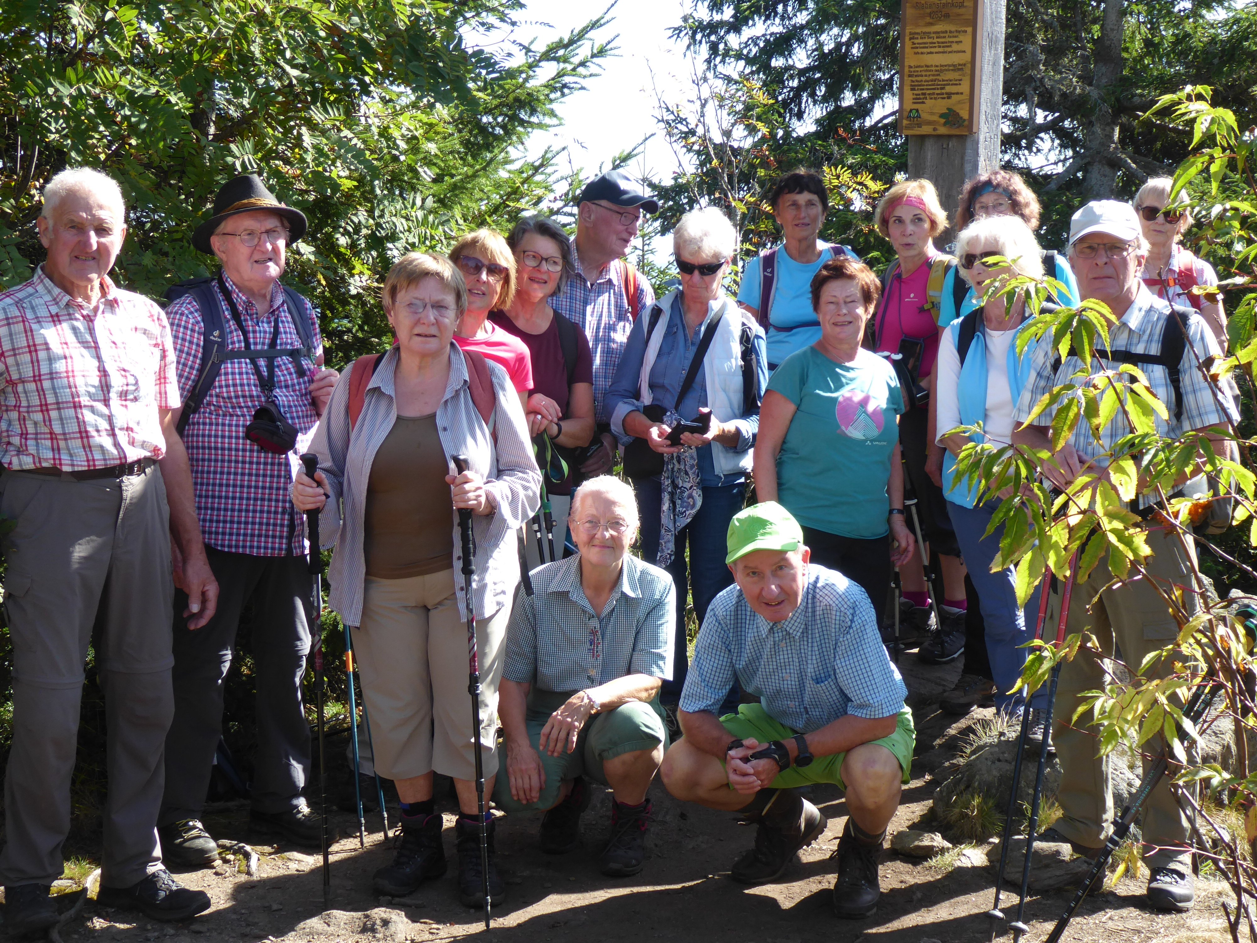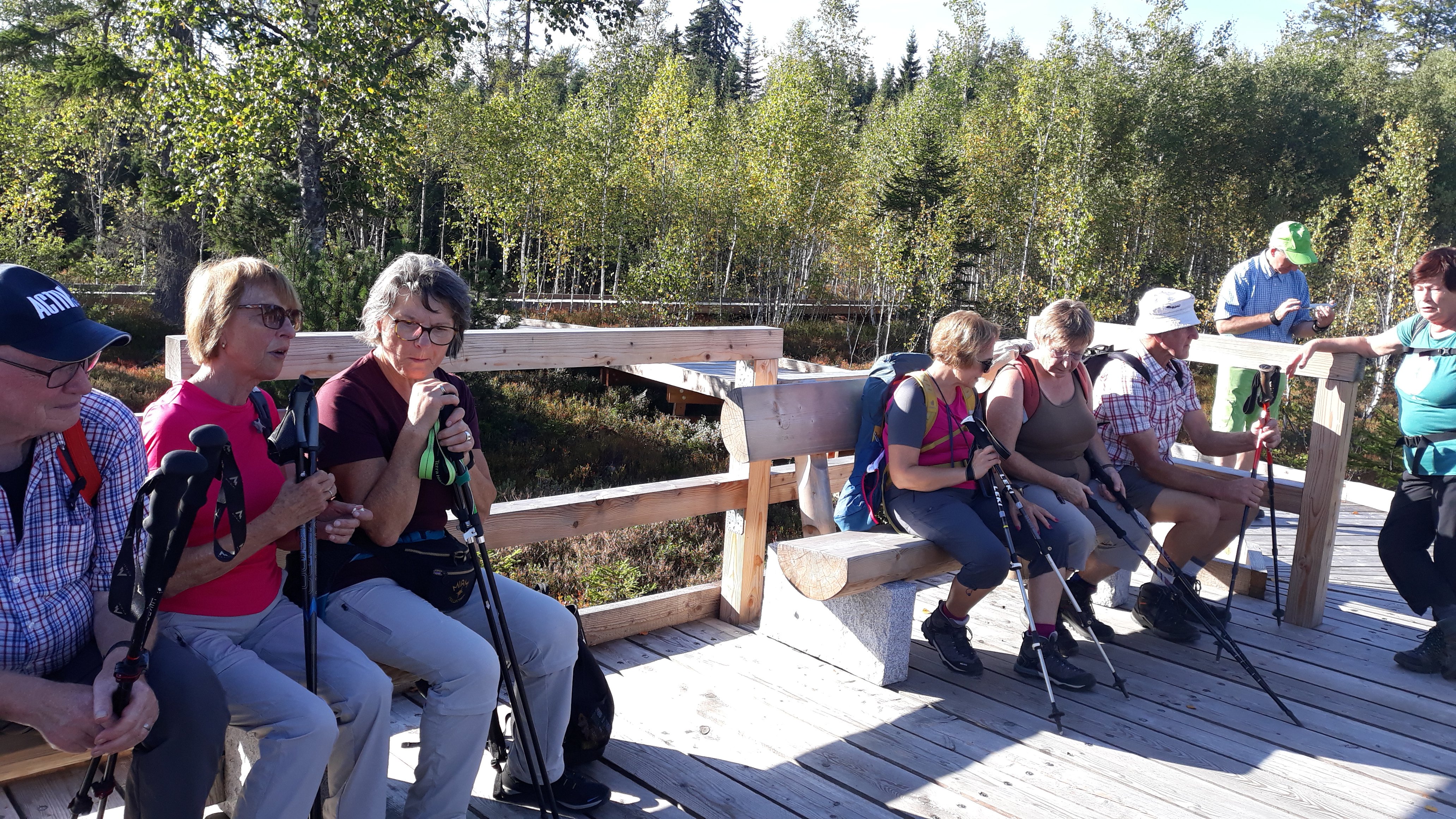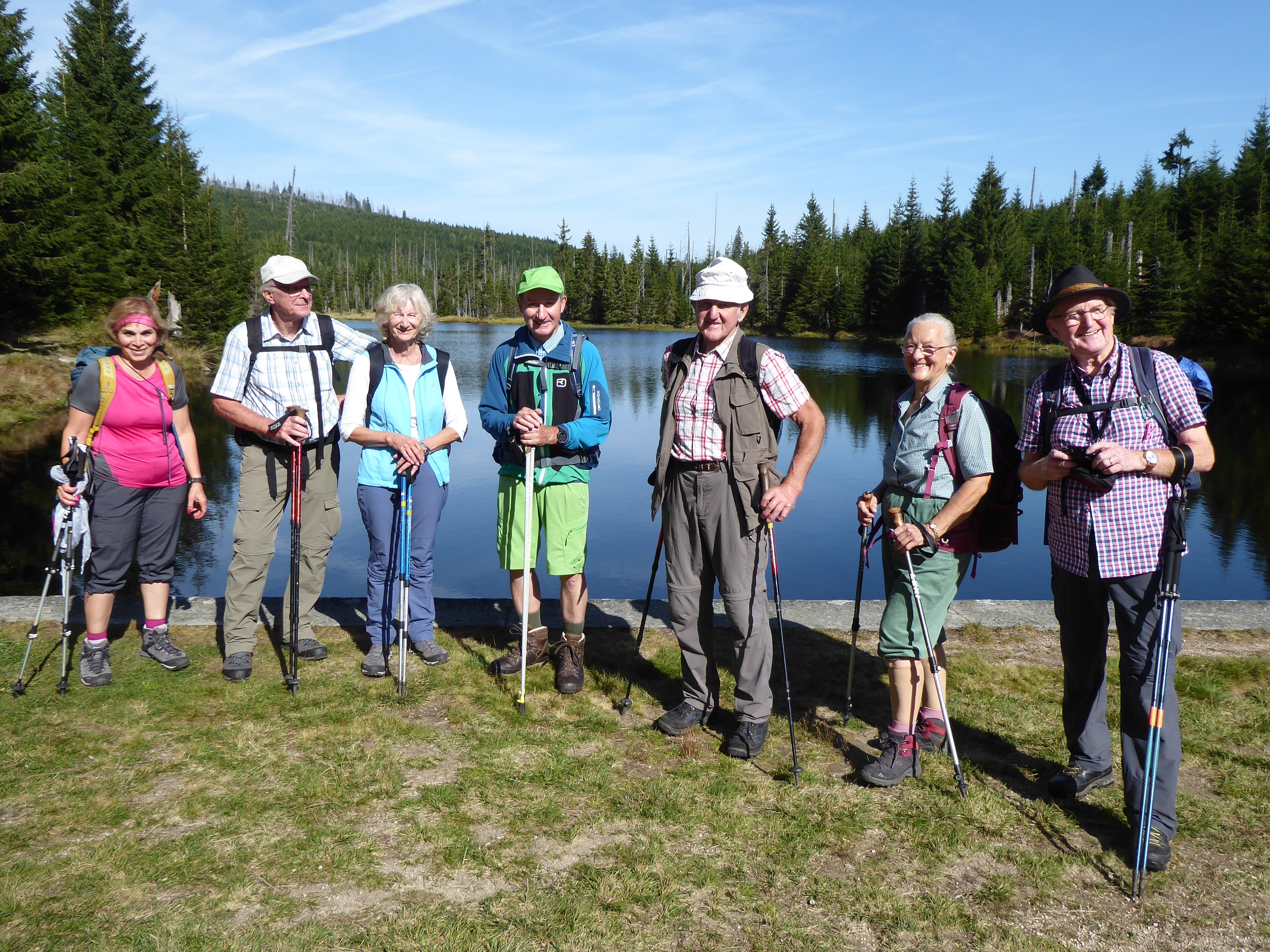 Im Grenzgebiet Bayern-Tschechien wanderten 16 Alpenvereinssenioren. Mit Elfriede Niedermeier startete die Gruppe in Finsterau. Zuerst ging es ins Reschbachtal und am Bachlauf entlang zur Alten Klause und zur Reschbachklause, einem aufgestauten See. Entlang der ehemaligen Grenze wurde nach kurzem Aufstieg der Gipfel des Siebensteinfelsen 1263 m erreicht. Auf dem Weiterweg wurde zusätzlich noch die Quelle der "Warmen Moldau" besucht. Auf einem breiten Schotterweg ging es aufwärts, bis nach Bucina abgezweigt wurde. Im früheren Buchwald sind noch Relikte des "Eisernen Vorhangs" zu sehen. Im nahen Alpenhotel wurde eine Rast eingelegt. Über die Teufelsklause und entlang des Schwellgrabens ging es noch durch`s "Finsterauer Filz". Auf einem neu angelegten Bohlenweg wurde ein Moorgebiet durchquert, bevor es nach Finsterau zurückging.