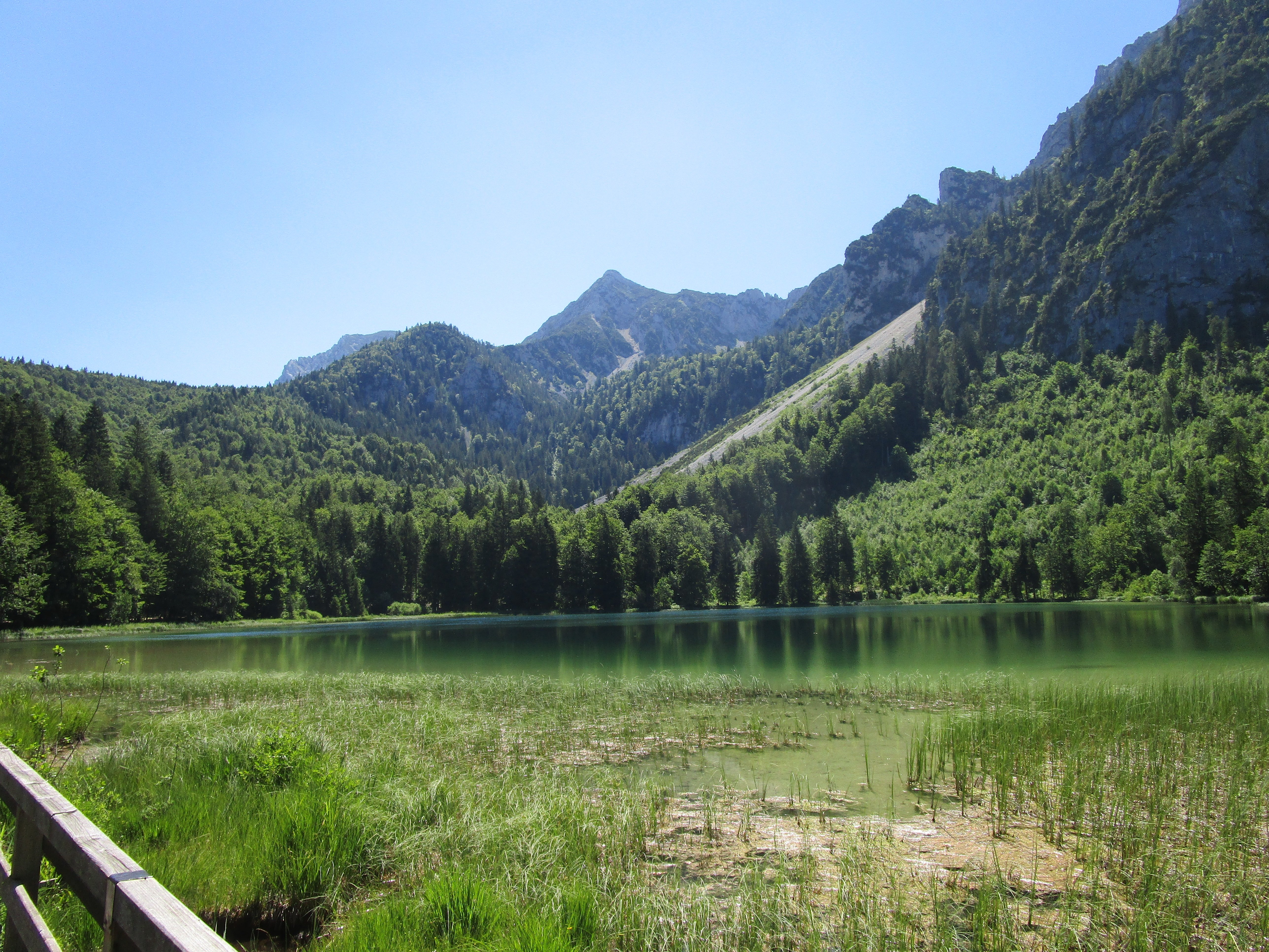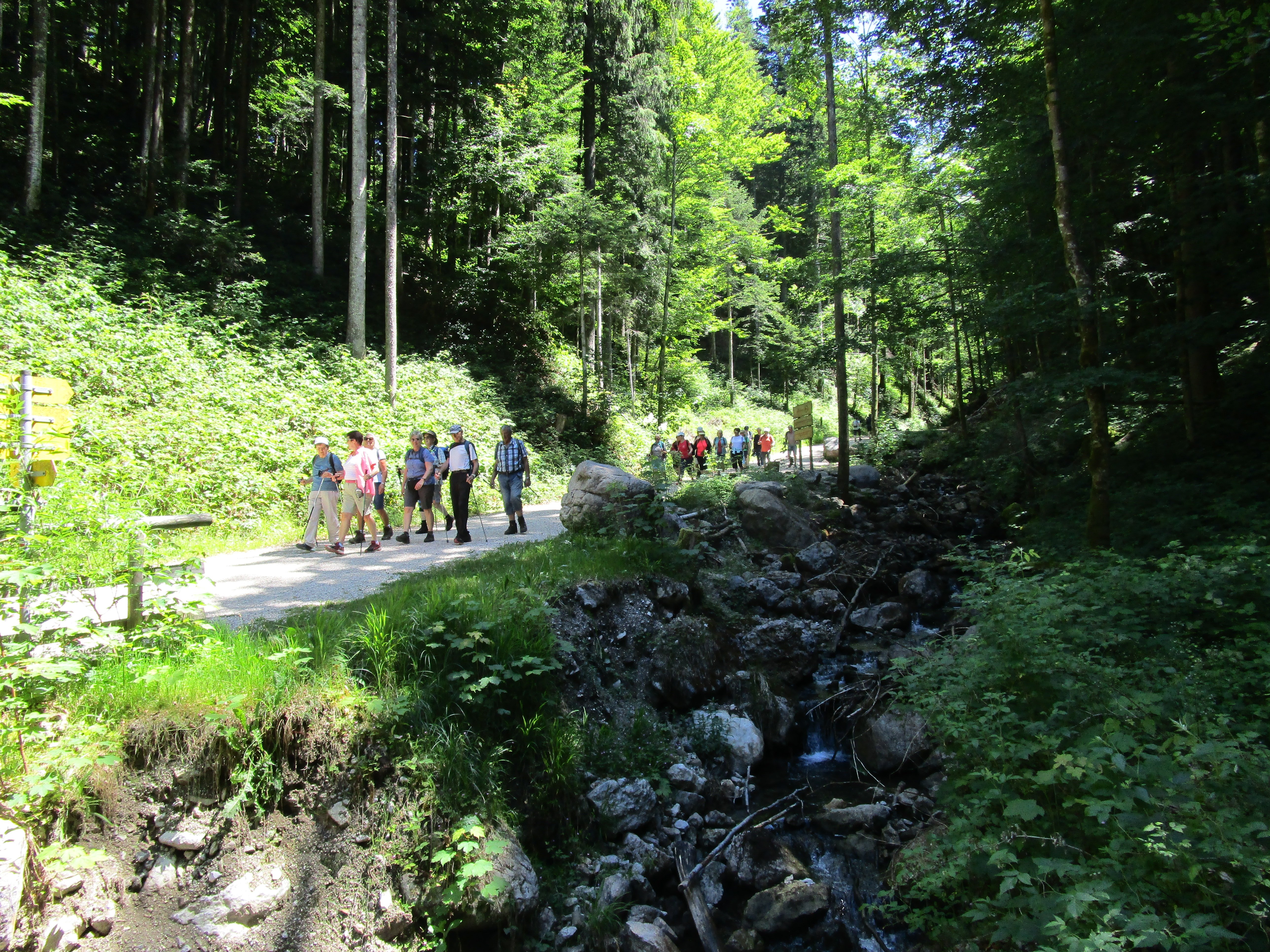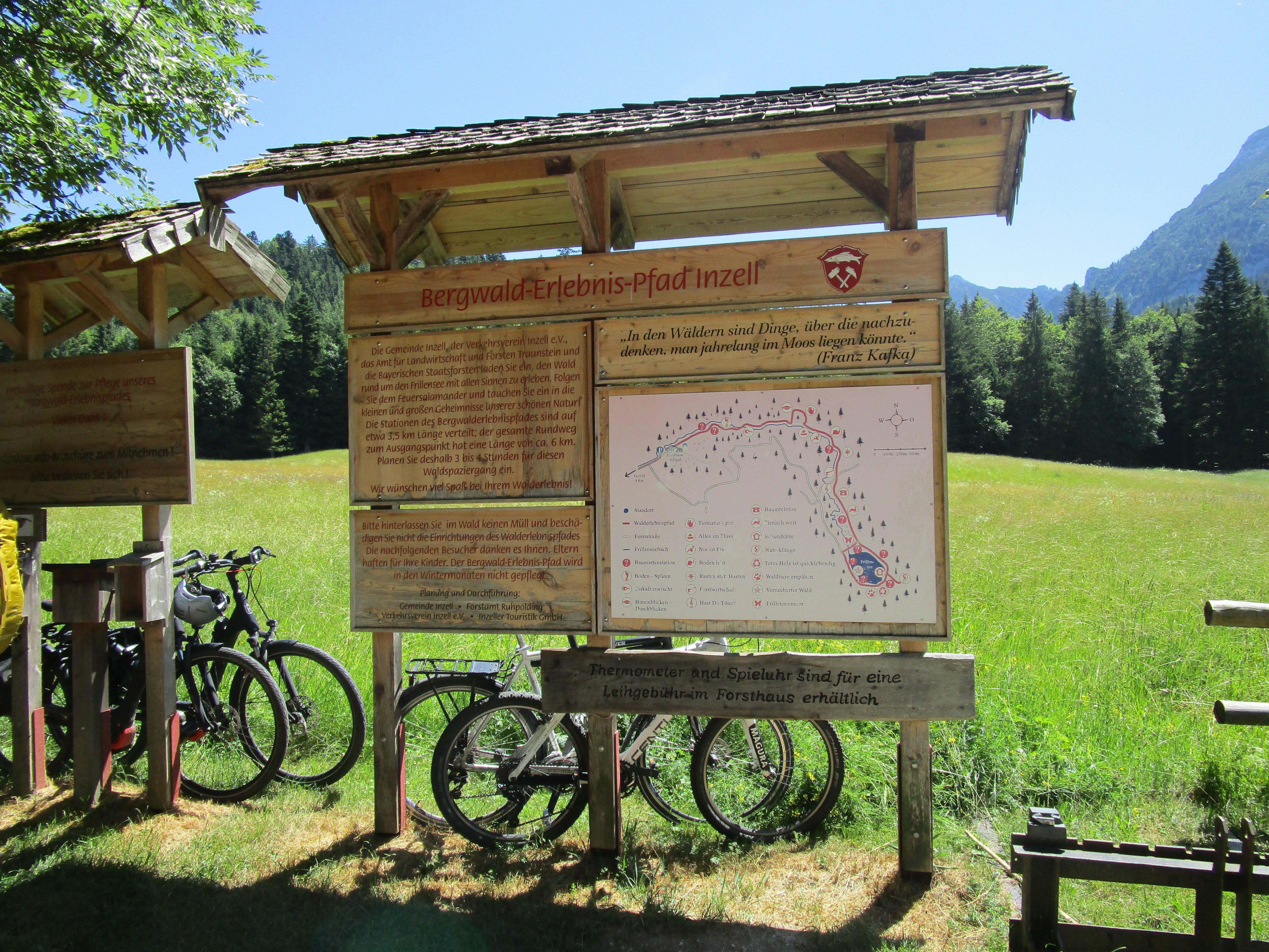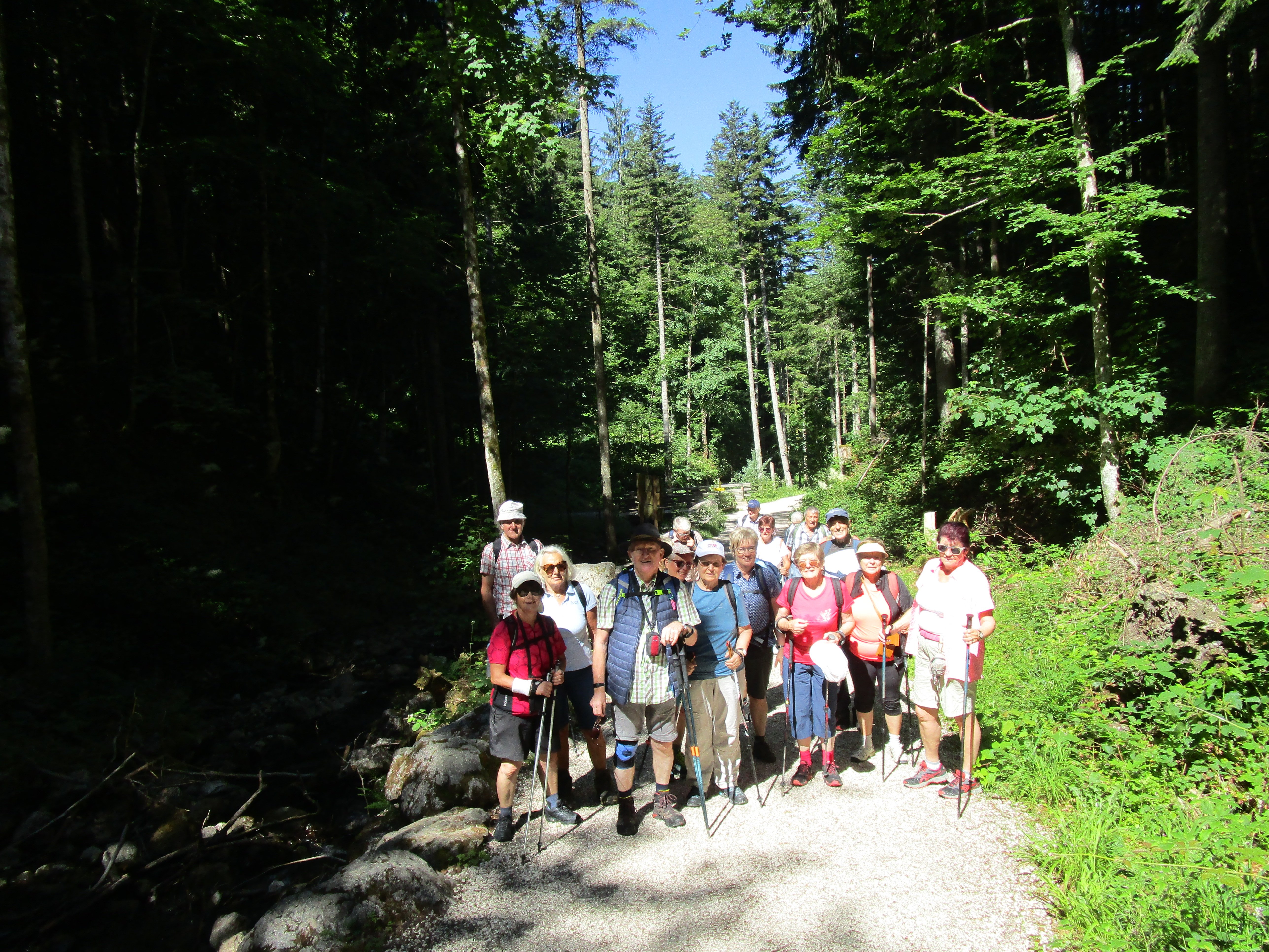 Wir haben die Tour zum und rund um den Frillensee für die etwas leistungsschwächeren Seniorinnen und Senioren konzipiert (3,5 km), die auch bei der Anmeldung Vorrang hatten. Lediglich der Rest wurde an jüngere, leistungsfähigere Mitglieder der Seniorengruppe vergeben. Wir hatten enormes Wetterglück. Während an dem eigentlich festgesetzten Termin am 22.06.23 große Hitze mit 34 ° C herrschte, war es heute bei 26° C im Wald beim Aufstieg neben dem Frillenseebach recht angenehm kühl und die Luft sauerstoffreich. Bei den elf interaktiven Erlebnisstationen konnte man Näheres über unseren Bergwald erfahren, unter anderem an einer Holzorgel lauschen. Diverse Spruchtafeln mit weisen Sprüchen und Holzerläuterungen mit drehbaren Würfeln, mit deren Hilfe man den Namen der Bäume erraten sollte, machten die Wanderung interessant. Die Seeumrundung auf Holzstegen war recht eindrucksvoll mit Blick auf den Zwiesel mit seinen steil abfallenden Wänden, den Mitterstaufen und den Hochstaufen, von dem nur ein kurzer Teil vom Grat zum Gipfel zu sehen war, aber auch das Gipfelkreuz. Im See spiegelte sich die Sonne zu kleinen Sternen. Die 120 HM machten keinem der Teilnehmer Schwierigkeiten. Die Einkehr im Garten des Forsthauses Adlgaß nach 2 ½ Std. Wanderung war ein weiteres Highlight. Zur Abrundung des Tages fuhren wir noch nach Raitenhaslach, um die dortige Klosterkirche zu besichtigen.
