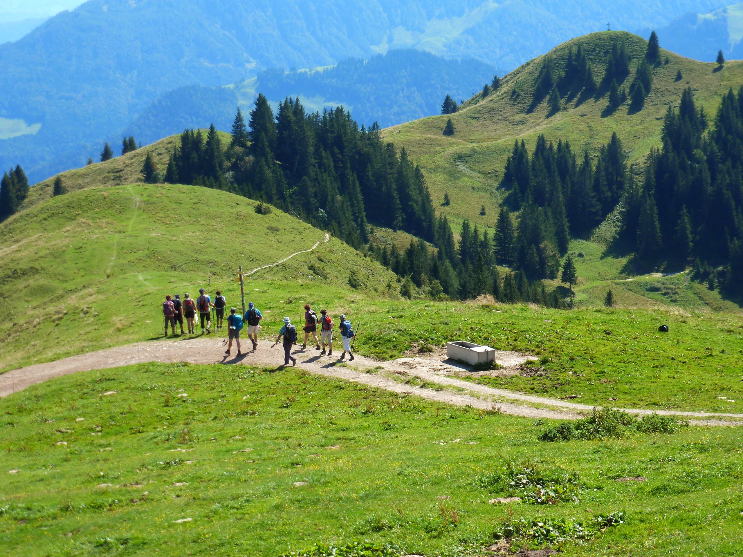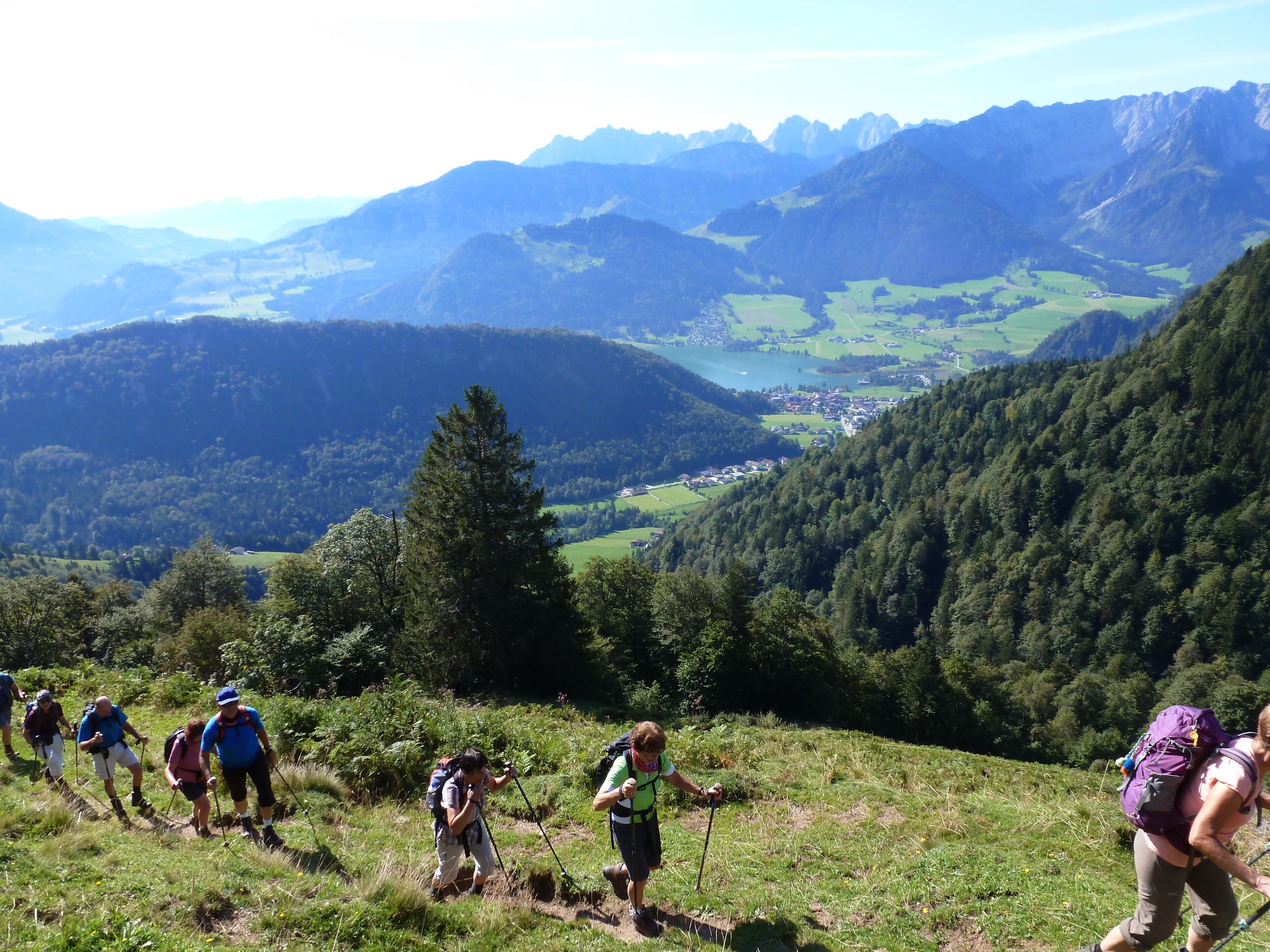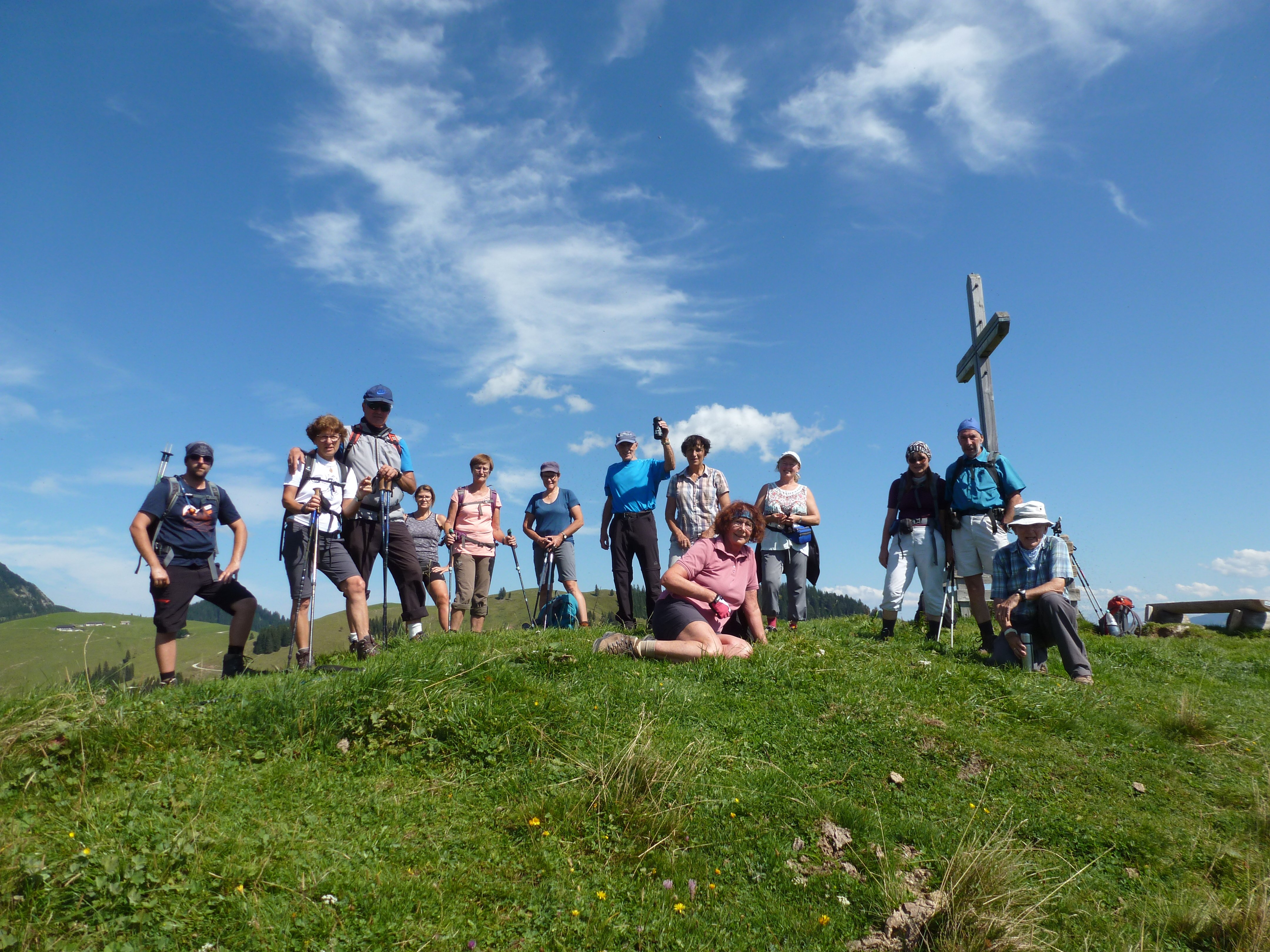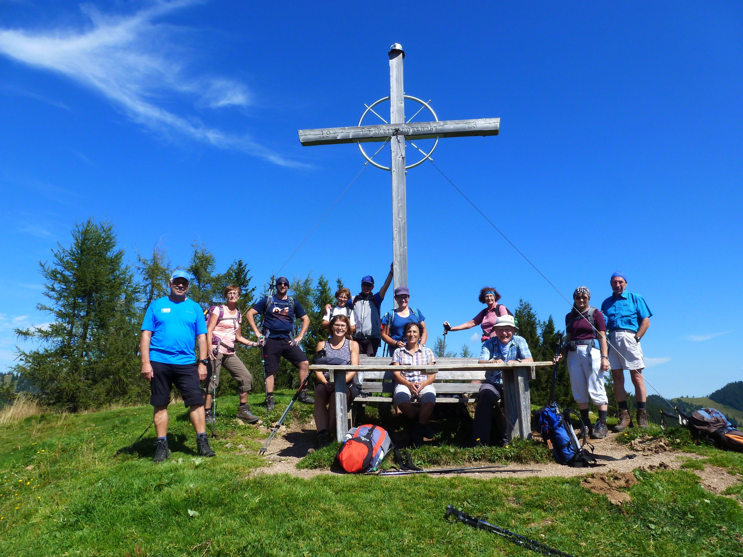 Ab dem Parkplatz an der Sportanlage Walchsee/Winkel führt der Weg zunächst durch den kleinen Ort, bis ein schmaler Steig nach oben bis zu den Hochalmen führt. Bald wurde eine tolle Aussicht zum Walchsee und gegenüber zum Zahmen und Wilden Kaiser frei.Diese Aussicht begleitet die Wanderer die gesamte Tour.Als erster Gipfel wurde über einen steilen Wiesensteig das Lochnerhorn 1448m erreicht.Nach einer kurzen Gipfelrast wanderte die Gruppe auf die andere Seite der Almen bis zur Burgeralm mit Käserei-, wo man zur Mittagspause einkehrte ,ehe der zweite Gipfel der Wandberg1454m wiederum durch einen steilen Anstieg bewältigt wurde.Ein toller rundum Blick sorgte für Begeisterung der Gruppe. Nach kurzem Gipfelaufenthalt führt der Weg ein Stück zurück ,ehe der Übergang zum dritten Gipfel dem Brennkopf 1353m, der sich auf einem Hochrücken dahinzieht erreicht wird. Ein Schwarm von fliegenden Ameisen sorgte für einen kurzen Gipfelaufenthalt bevor die Gruppe zu den Brennalmen und weiter auf einem Steig der den Bergwanderern etwas Konzentration abfordert. Als kleine Sehenswürdigkeit beim Abstieg ist ein Wasserfall, der sich in eine Gumpe stürzt,der wird durch eine Holzbrücke überquert ehe der weitere Abstieg ins Tal führt