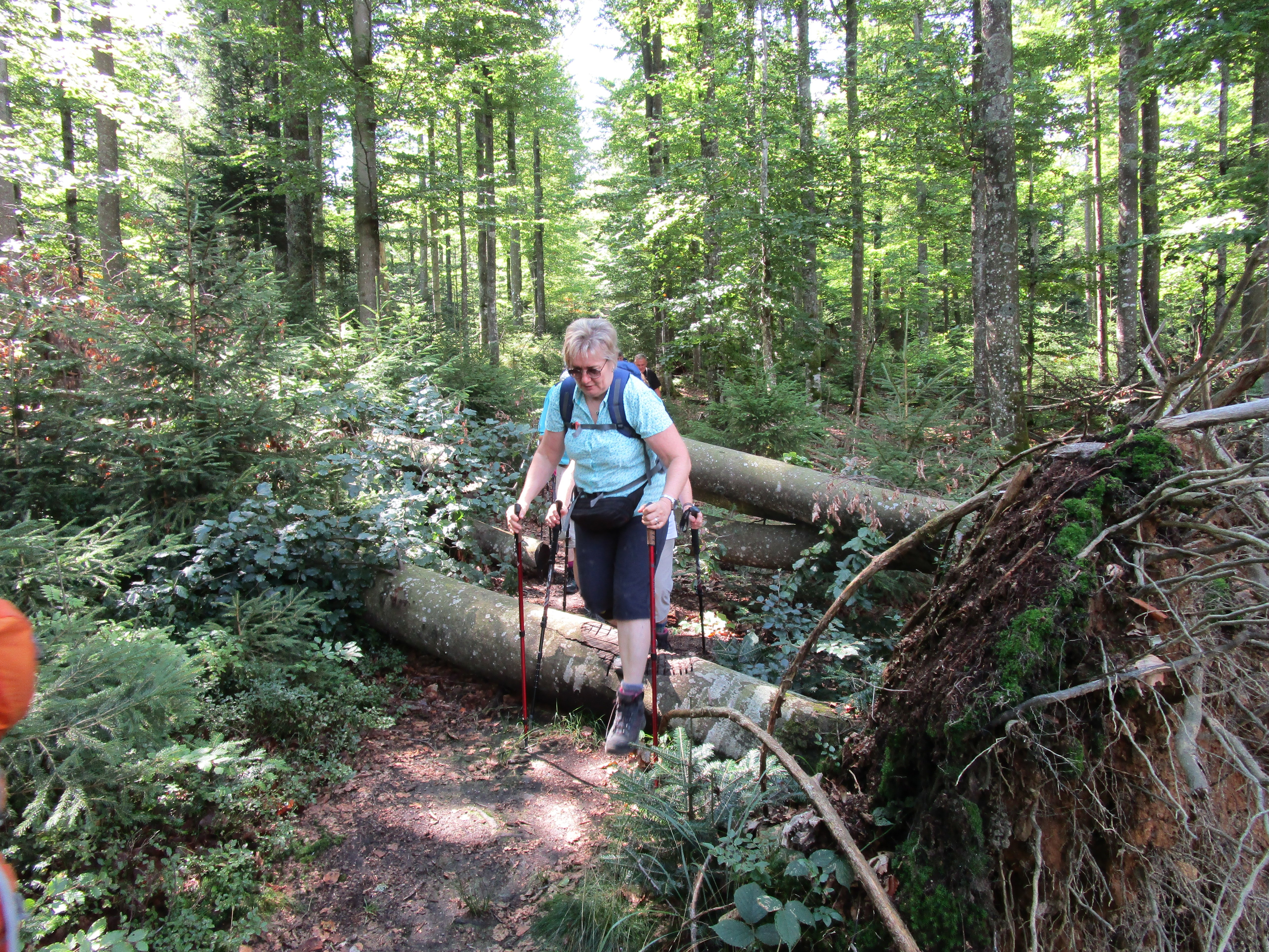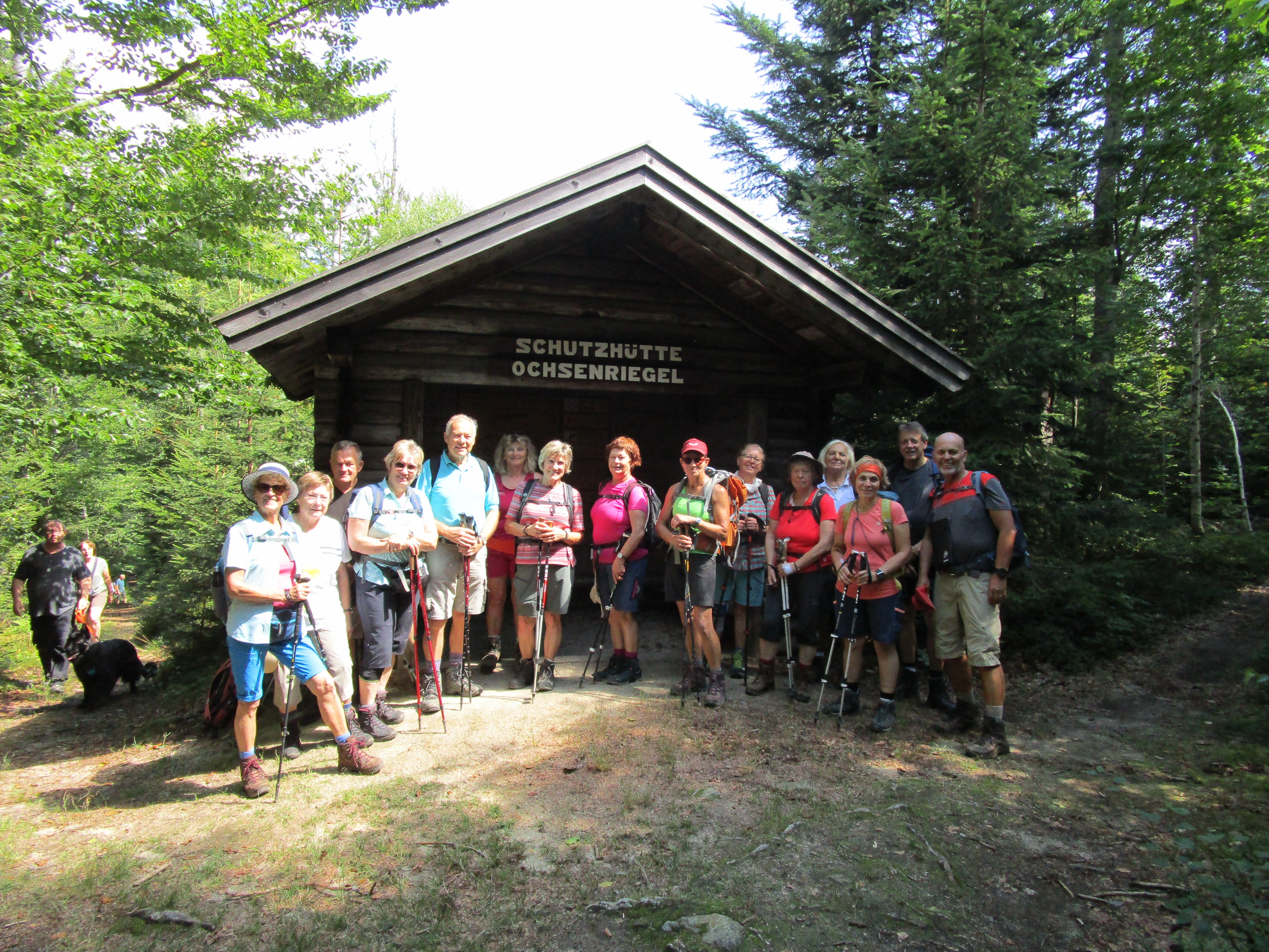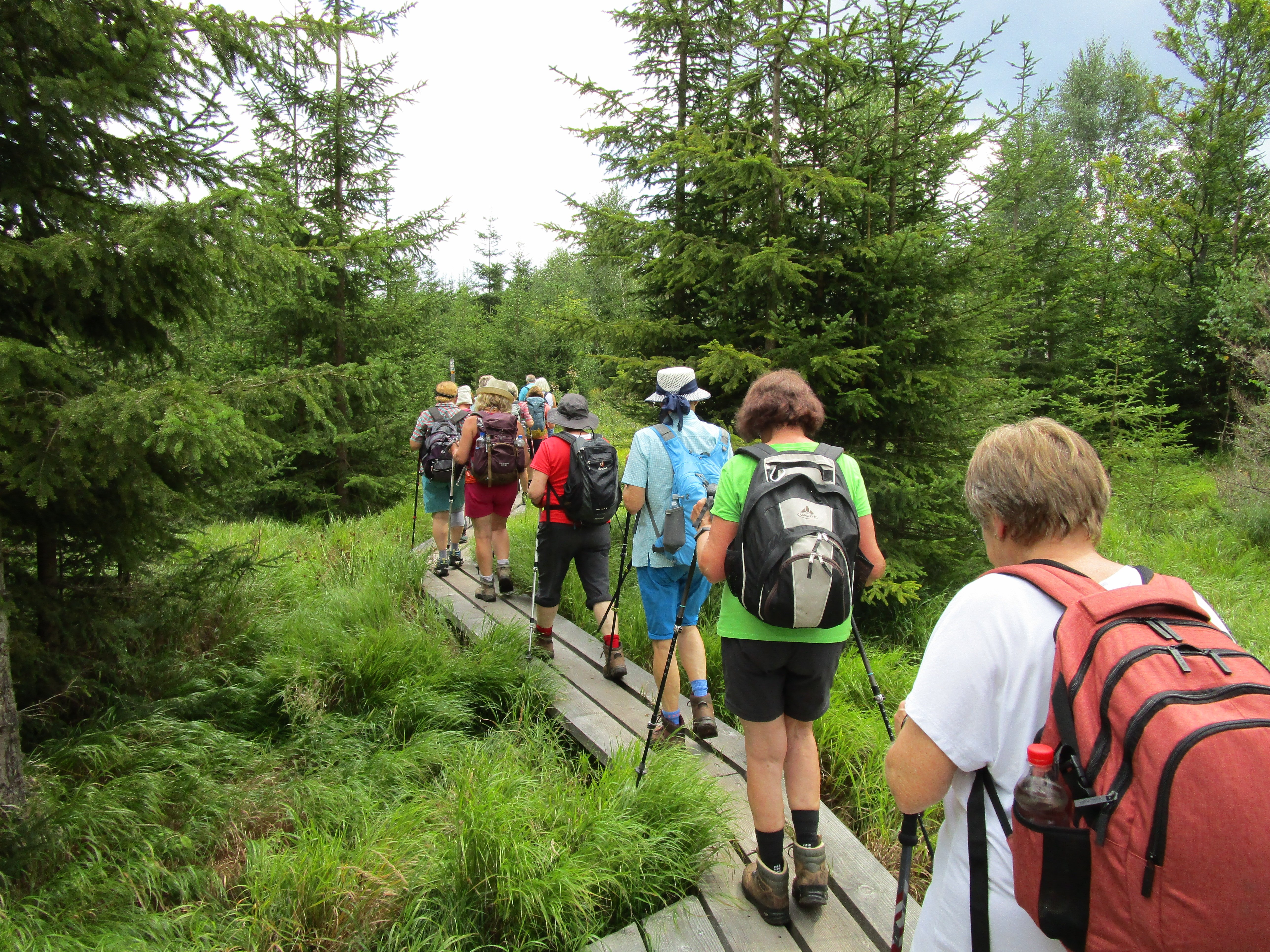 Start am Parkplatz Jägerstraßl in Mauth (799 m) um 9:00 Uhr bei schönem Wetter. Auf dem Rundweg „Eisvogel“ zunächst bergauf zum Leckerriegel (908 m). Dann bergab auf der „Steinernen Stiege“ zur Abzweigung am Spatberg (871 m). Weiter auf schönen Waldwegen zum Fuß der Gr. Kanzel (1001m). Über Steinstufen hinauf zum Gipfel, der aus mehreren großen Felsbrocken besteht und ein schönes, großes Gipfelkreuz hat. Schöne Sicht nach Süden und zum Lusen nach Nordwesten. Weiter auf dem Weg „Haselhuhn“ durch das Felswandergebiet mit seinen turmhohen Felsenformationen. Danach führte ein Weg durch lichten Mischwald hinab zum Hirschberg (864 m) und weiter zum Unterstand Ochsenriegel (834 m). Nach einer ausgiebigen Mittagspause ging es auf dem Flusskrebs-Rundweg weiter Richtung Norden bis zum Weg „Tanne“, der von der Sagwassersäge hinaufführt. Auf diesem dann zum Seefilz (933 m), einem renaturierten Hochmoorgebiet. Nach einiger Zeit kam der Eisvogelweg von der Gr. Kanzel her von rechts auf ihm wanderten wir weiter zur Steibachklause (846 m). Dort hielt uns eine Rangerin des Nationalparks einen interessanten Kurzvortrag über Vegetation und Tierbestand des Nationalparks. Die Biber haben dort einen künstlichen Stausee geschaffen. Am Ufer des Steinbaches leicht abwärts und über Bohlensteige in nachwachsendem Jungwald ging es dann zurück zum Parkplatz. Insgesamte Gehzeit mit Pausen: 5 Std. 45 Min. inclusive Schwammerl suchen. Höhenunterschied ca. 380 HM. Einkehr in Freyung im Gasthaus Veicht.