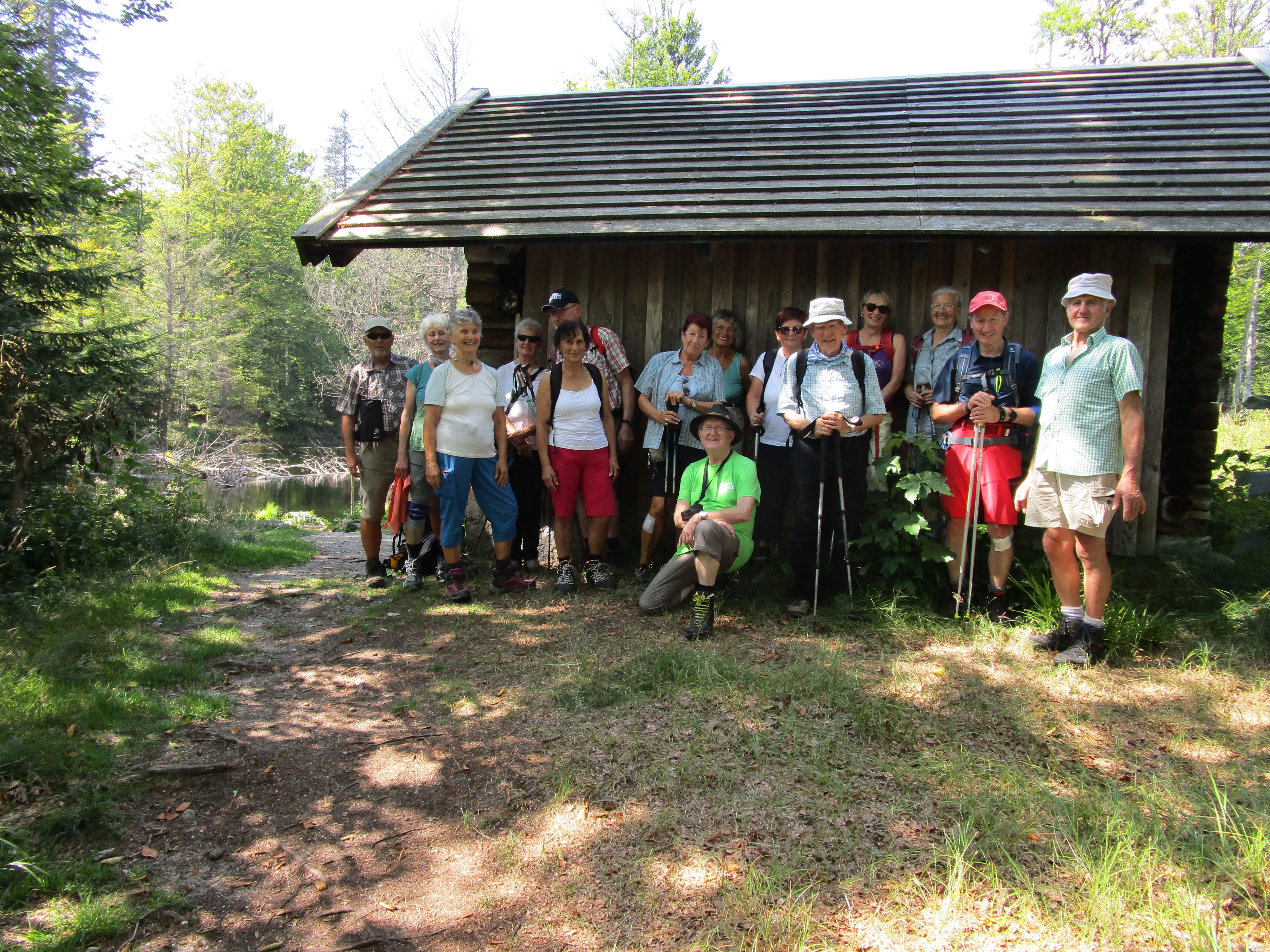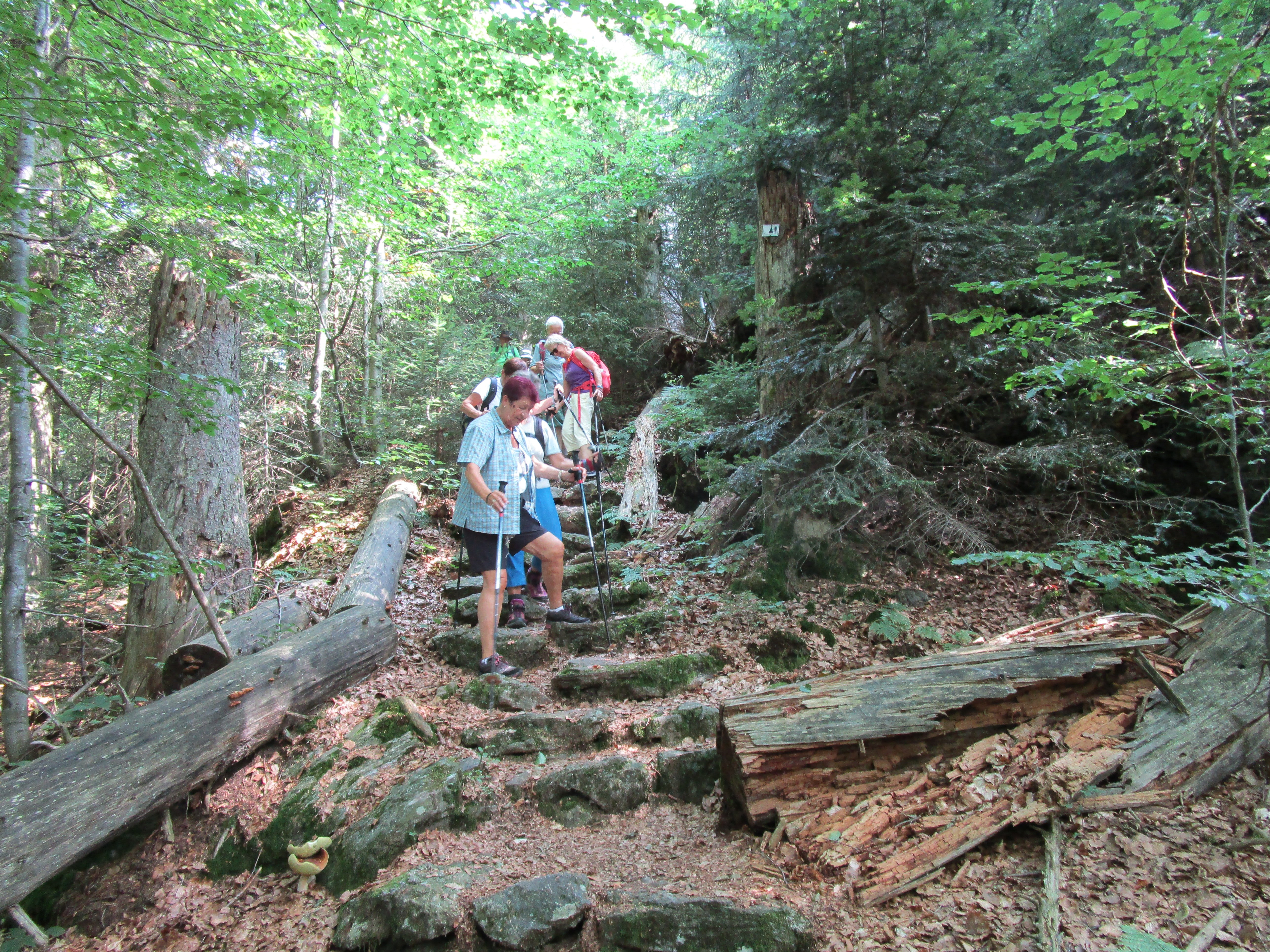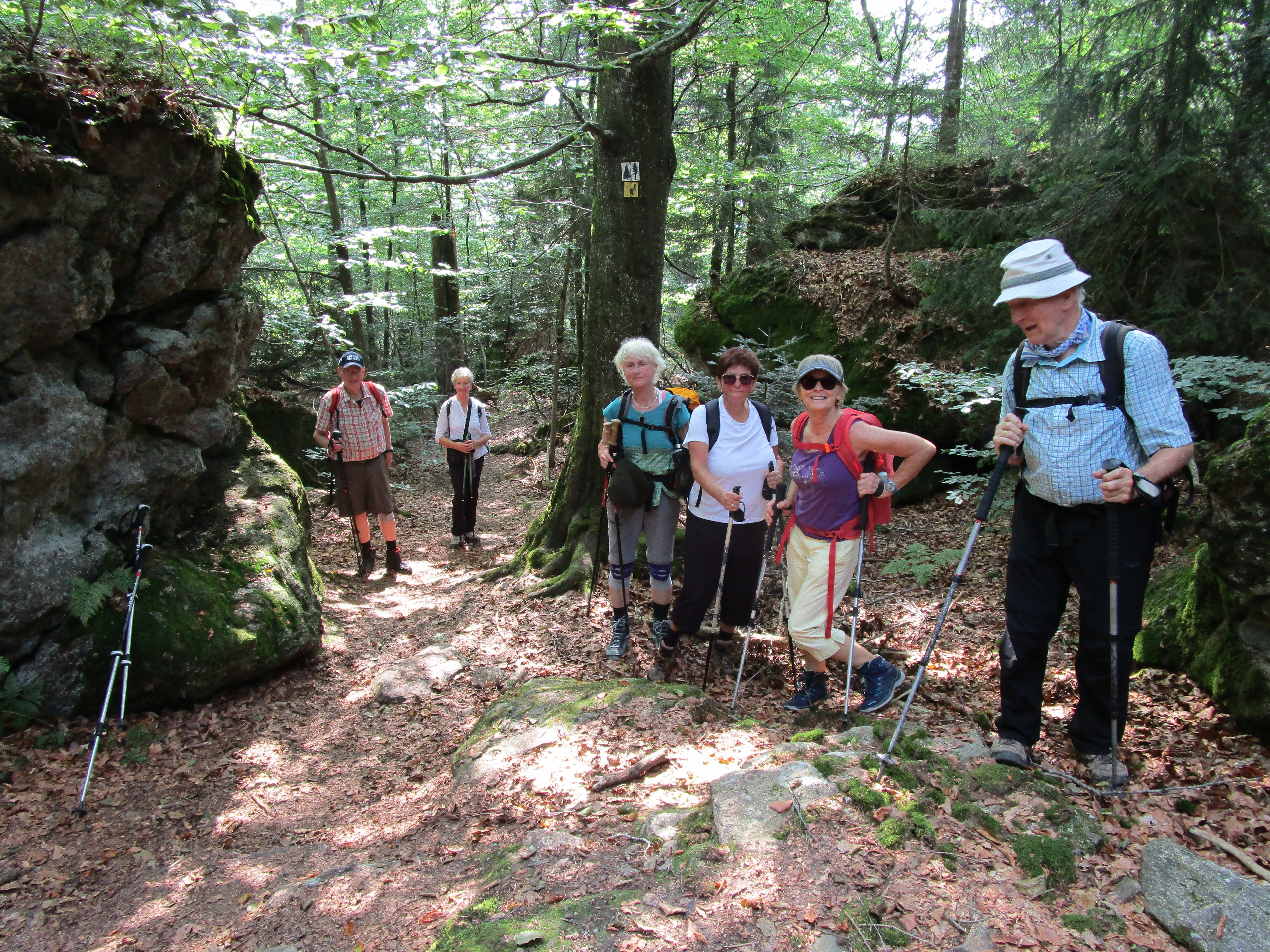 Der Abstieg erfolgte dann auf dem Weg „Eberesche“ bis hin zum Felswandergebiet. Hier säumten hohe Felstürme beeindruckend den Weg. Im lichten Laubwald ging es anschließend hinab zum Hirschberg und weiter zum Unterstand Ochsenriegel, wo die Mittagspause eingelegt wurde. Über den Seefilz, einem renaturierten Hochmoor, führte der Steig erneut auf dem Eisvogelweg weiter zur Steinbachklause. Dort haben die Biber ganze Arbeit geleistet und einen künstlichen Stausee erzeugt. Am Steinbach entlang ging es dann leicht abwärts bis zu einem Waldgebiet, wo vor 25 Jahren der Borkenkäfer den gesamten Fichtenbestand vernichtet hatte. Inzwischen sind dort die Bäume schon kräftig am Nachwachsen. Auf Bohlensteigen wurde diese feuchte Passage überwunden und kurz darauf der Parkplatz erreicht. Insgesamt waren es eine abwechslungsreiche Tour durch die naturbelassenen Wälder des Nationalparks. Die Einkehr nach der Tour erfolgte wieder in Freyung, bevor nach der langen Wanderung die Heimreise angetreten wurde.