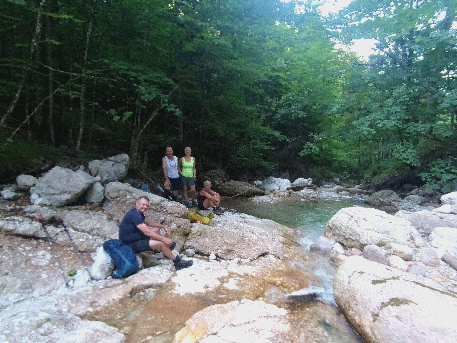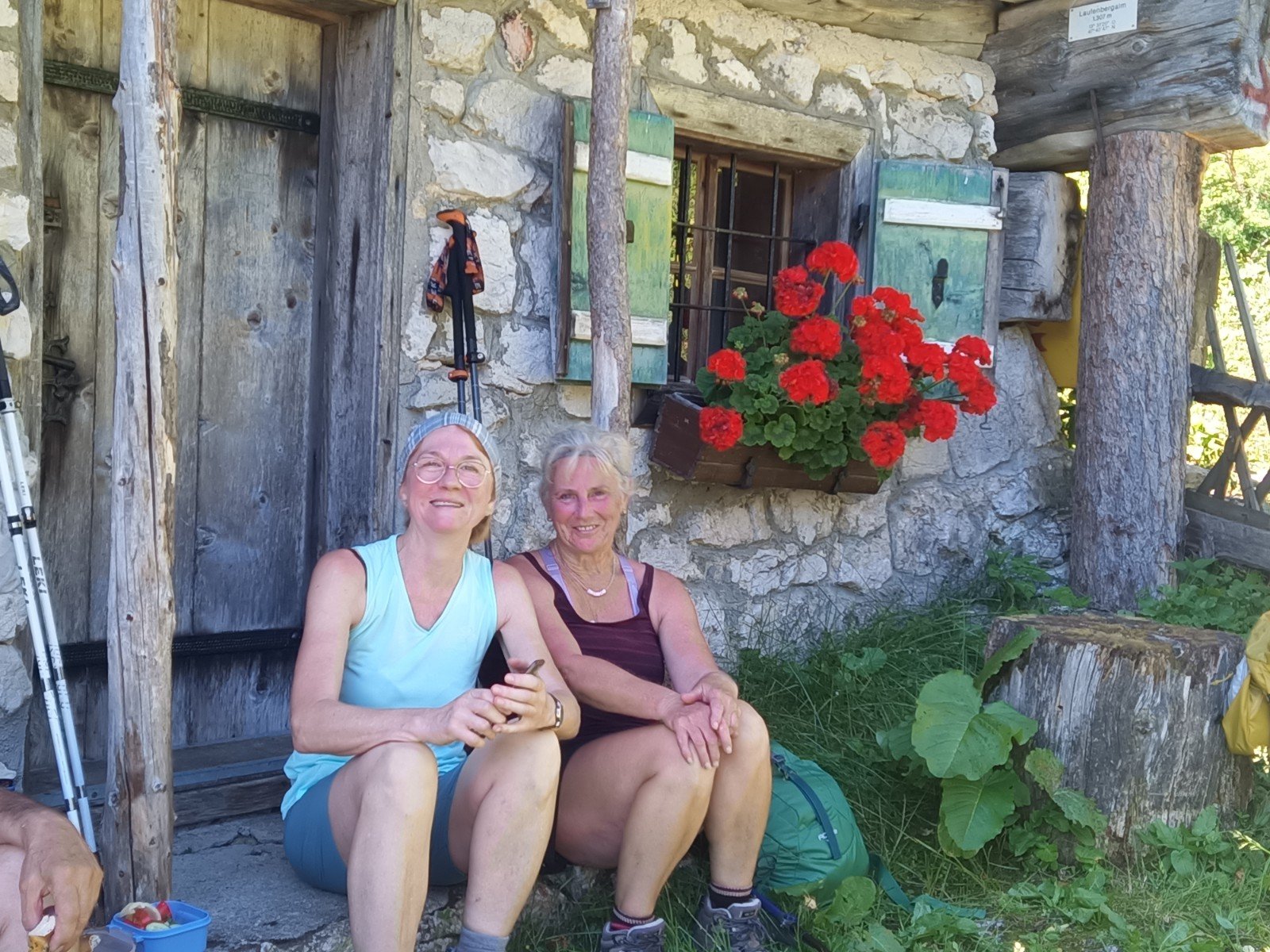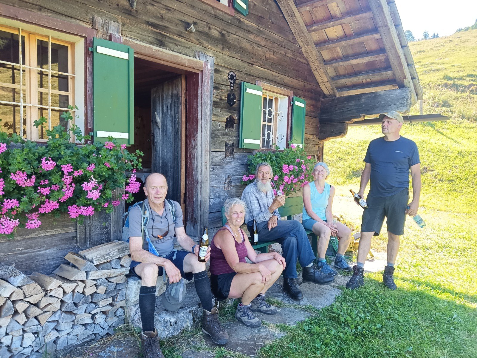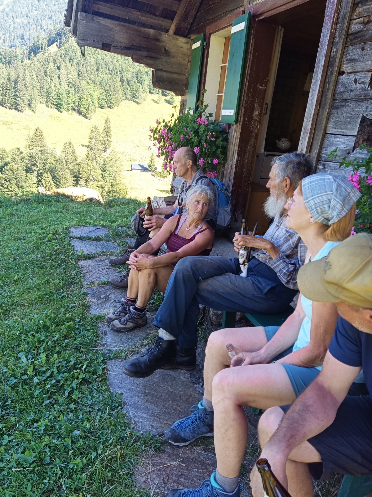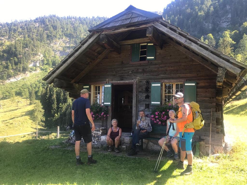 Die Gipfelpause bei den heißen Temperaturen wurde durch Brotzeit, tollen Ausblick und ein leichte Lüftchen angenehm verbracht. Highight war sicherlich, das beide Gipfel absolut menschenleer angetroffen wurden,bis hierher hatte man tatsächlich nur zwei Wanderer getroffen. Nun galt es die den Abstieg von ca. 1.300 Höhenmetern in Angriff zu nehmen, seilversicherrt und durch lange Leitern gesichert ging es zum Teil ausgesetzt zur Sonntagkaralm. Hier wurde man von einem alten Almbauern sehr freundlich empfangen und bei der Bitte die Wasserflaschen am Grad aufzufüllen, ergab sich ein nettes Gespräch und zur Abkühlung erhielten die Wanderer sogar noch ein kühles Helles. Zurück bei der Schöffaualm wanderte man am Schöffaubach entlang, bis zu einer größeren Gumpe in der das kühle und einladenden Bachwasser die Strapazen des Tages abwusch. Da das Gasthaus am Ausgangspunkt aufgrund Personalmangels leider nicht offen war, besuchte man den nahegelegen Dorfwirt und genoß dort im Biergarten dessen Schmankerl und den Blick auf den Rettenkogel. So konnte die Wandergruppe den heißen Temperaturen trotzen und man war sich einig, dass es ein herrlicher Bergtag war.