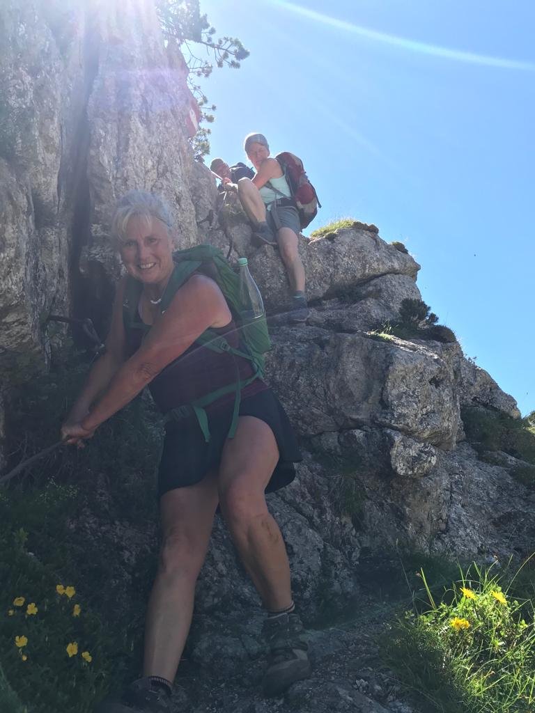 Nun folgte der Höhepunkt der Tour, der Grat zwischen den beiden Gipfeln. Ein luftige, ausgesetzte und immer wieder mit Stahlseilen abgesicherte Gratwanderung war nun an der Reihe, welche zum Schluß mit dem 30 Meter hohen Gipfelblock des Rettenkogels aufwartete, welcher über eine 10 Meter hohe Schlüsselstelle erklommen werden musste. Hier waren Kletterkünste am Stahlseil nötig, welche etwa im Schwierigkeitslevel „C“ lagen.
