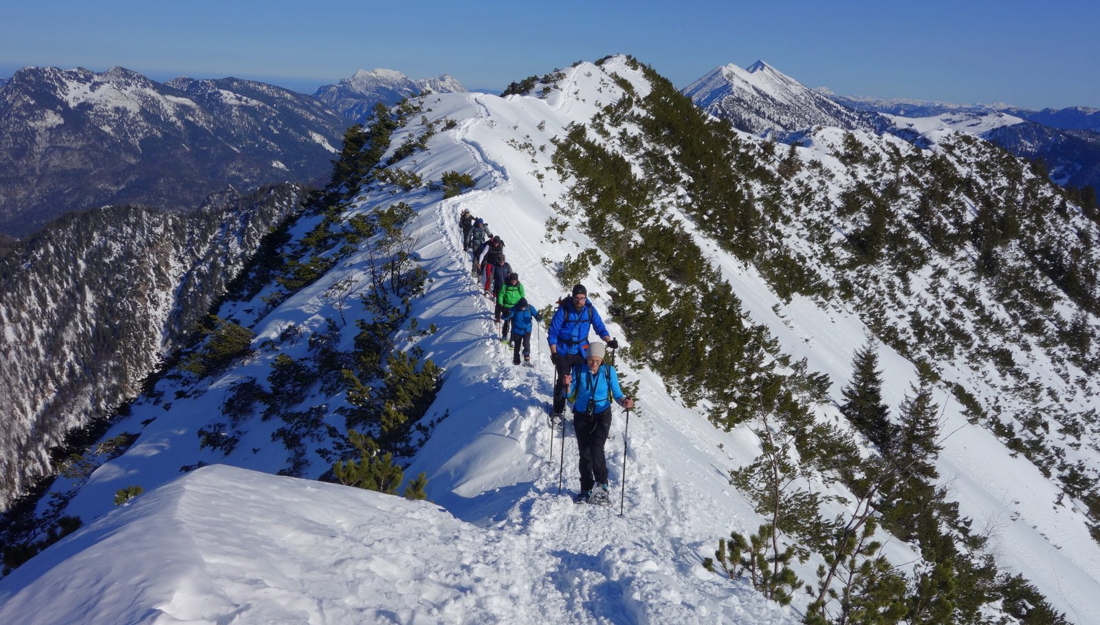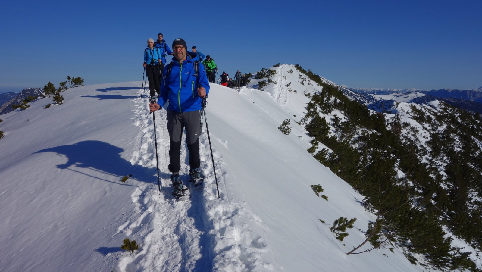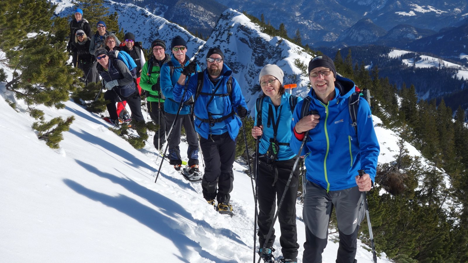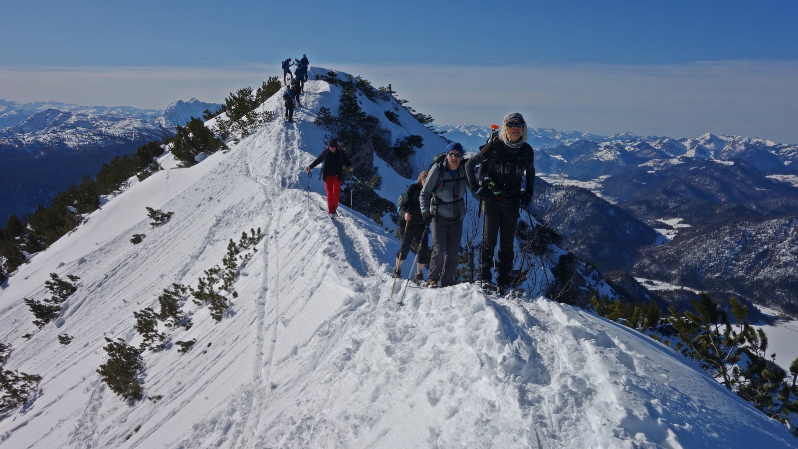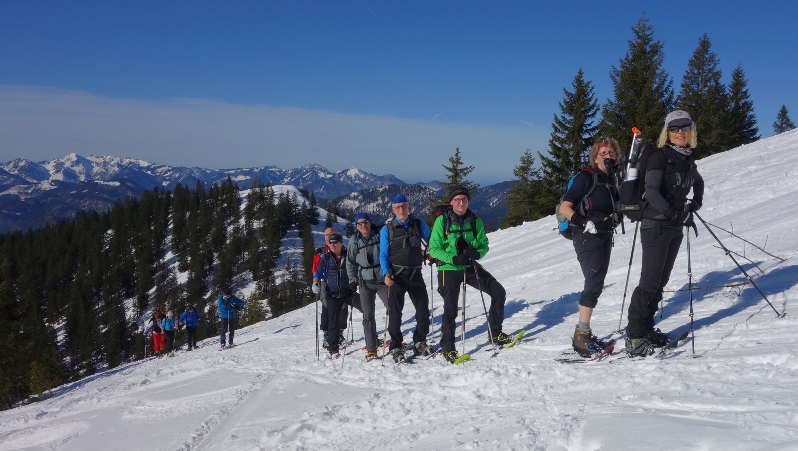 14 Teilnehmer des Pfarrkirchner Alpenvereins stiegen unter der Leitung von Karl-Heinz Hager auf das Dürrnbachhorn 1767m. Vom Parkplatz Seegatterl stieg die Gruppe in östlicher Richtung anfänglich auf einer gewalzten Langlaufloipe, sowie einem gespurten unschwierigen Waldsteig zur Dürrnbachalm. Der weitere Weg in Richtung Bergstation der Sesselbahn führt über eine steile Hangquerung, dann weiter zunehmend steiler auf den Grat zum Gipfelkreuz 1767m. Von hier ging es ca. 300m weiter auf einem schmalen Grat zum höchsten Punkt des Dürrnbachhorns 1776m, der kein Gipfelkreuz trägt. Zur Gipfelpause ging es wieder zurück auf den schmalen Grat zum Gipfelkreuz, wo sich eine herrliche Aussicht auf unzählige Gipfel im Umkreis des Dürrnbachhorns bot. Nach einer Gehzeit von knapp 5 Std. und ca. 14 km Wegstrecke erreichten die Schneeschuhwanderer über den Aufstiegsweg den Parkplatz Seegatterl.