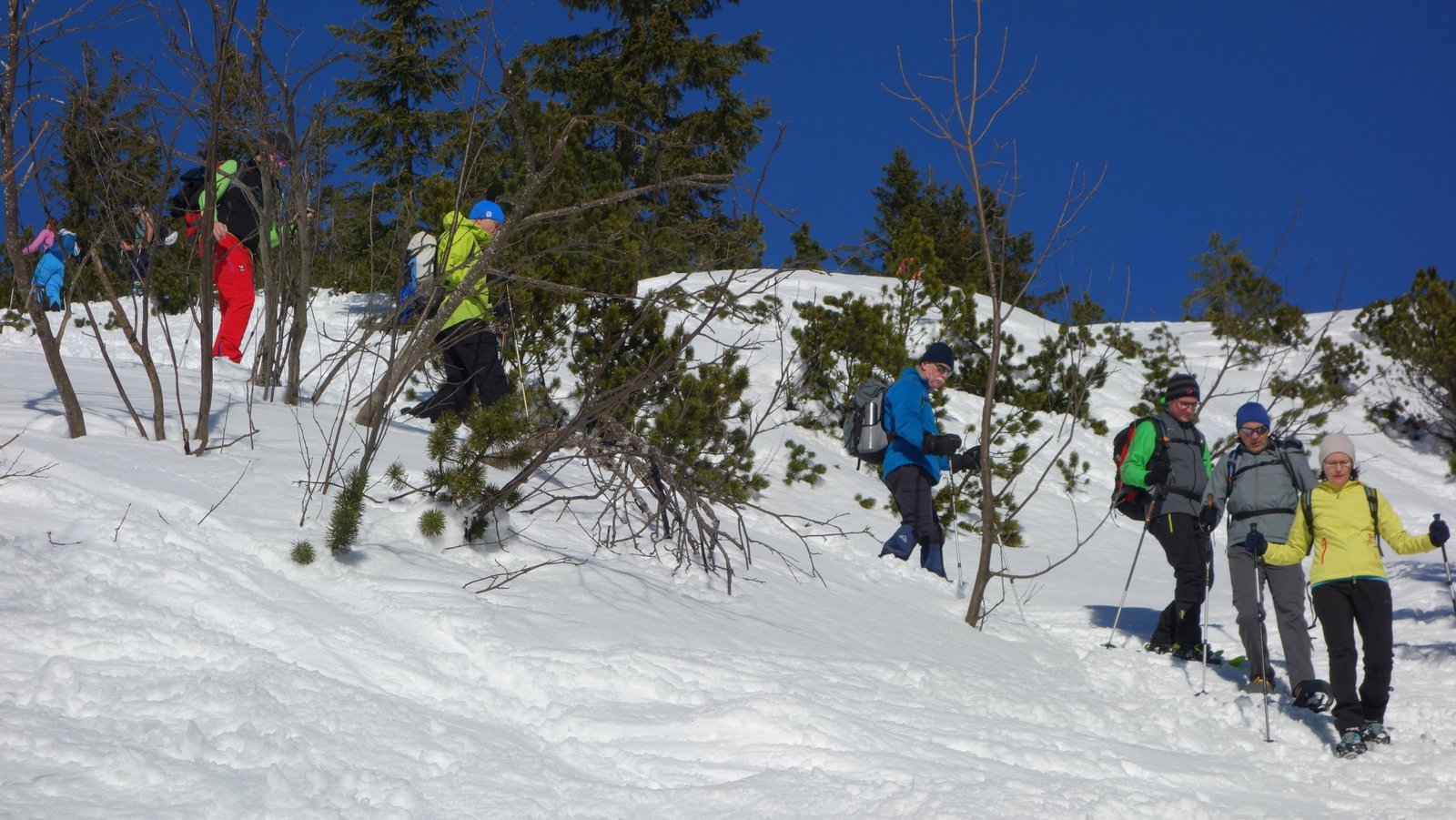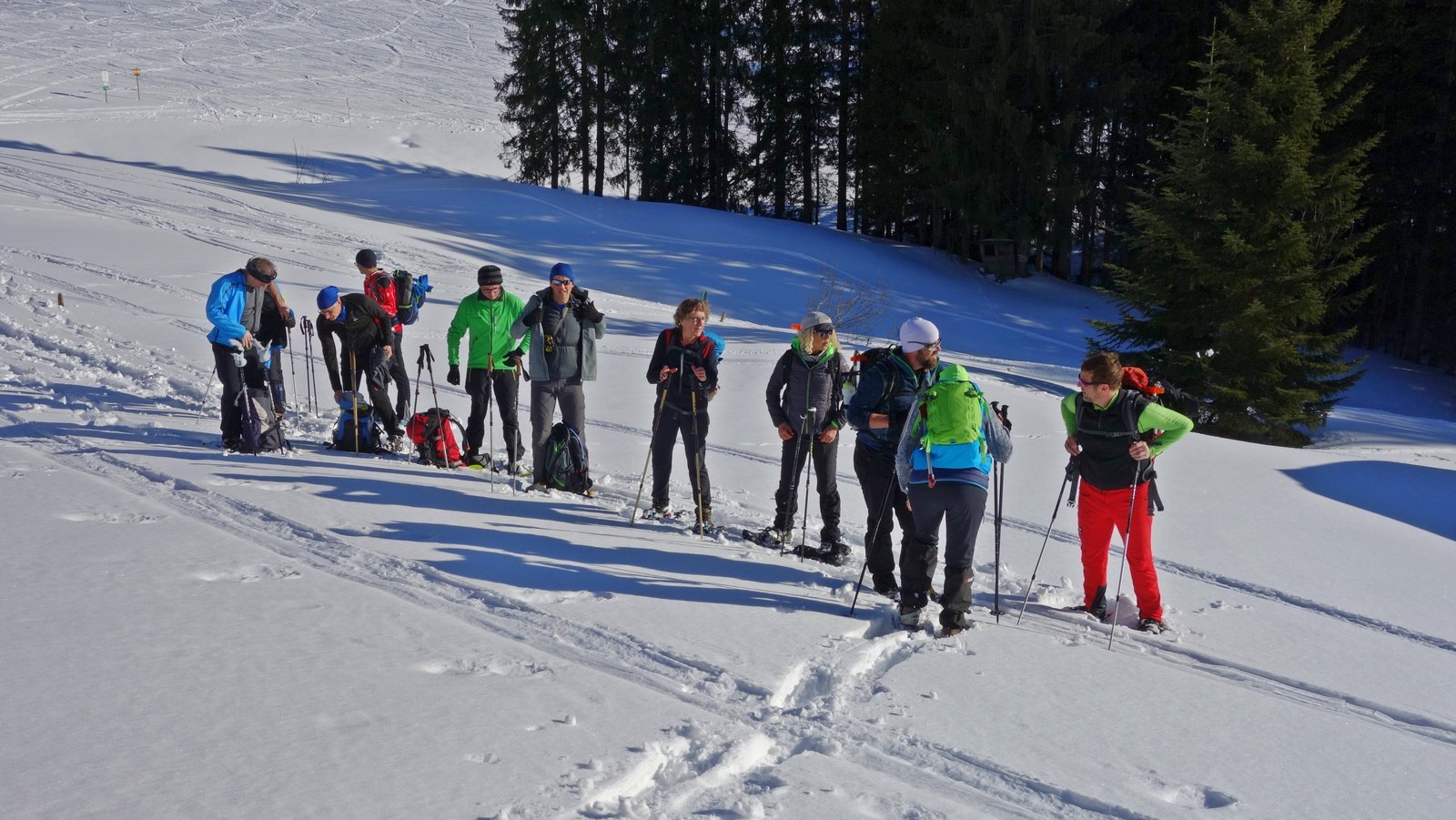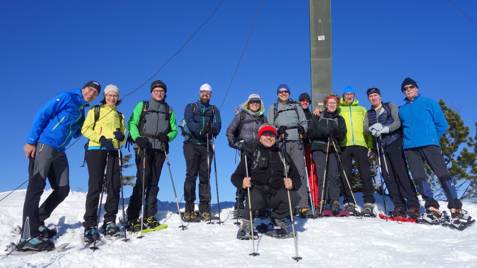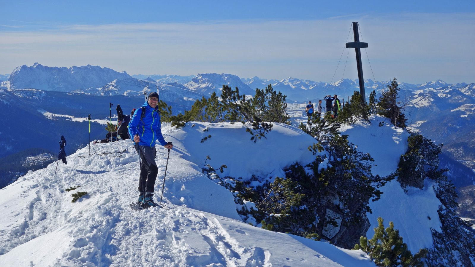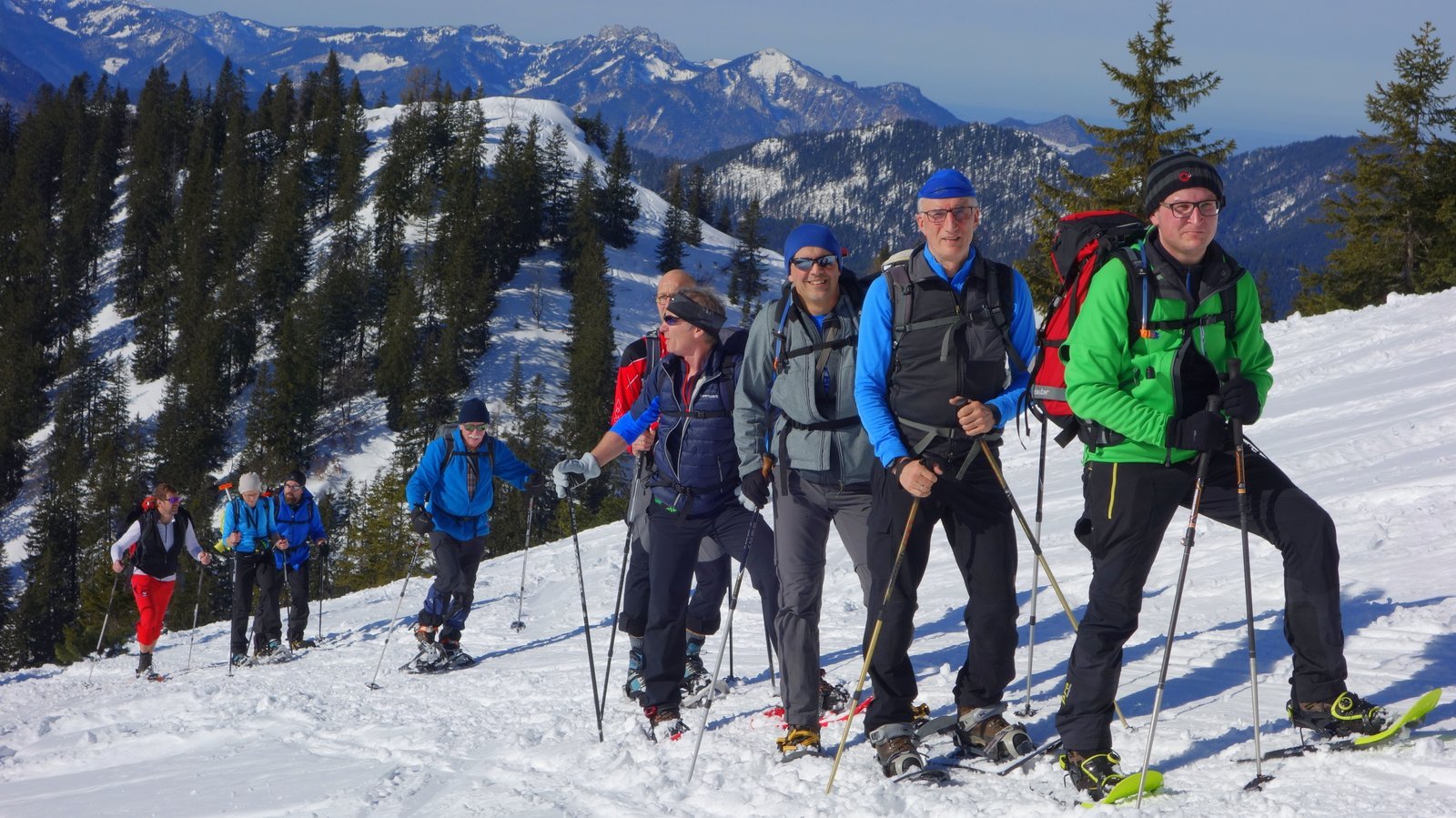 14 Teilnehmer des Pfarrkirchner Alpenvereins stiegen unter der Leitung von Karl-Heinz Hager auf das Dürrnbachhorn 1767m. Vom Parkplatz Seegatterl stieg die Gruppe in östlicher Richtung anfänglich auf einer gewalzten Langlaufloipe, sowie einem gespurten unschwierigen Waldsteig zur Dürrnbachalm. Der weitere Weg in Richtung Bergstation der Sesselbahn führt über eine steile Hangquerung, dann weiter zunehmend steiler auf den Grat zum Gipfelkreuz 1767m. Von hier ging es ca. 300m weiter auf einem schmalen Grat zum höchsten Punkt des Dürrnbachhorns 1776m, der kein Gipfelkreuz trägt. Zur Gipfelpause ging es wieder zurück auf den schmalen Grat zum Gipfelkreuz, wo sich eine herrliche Aussicht auf unzählige Gipfel im Umkreis des Dürrnbachhorns bot. Nach einer Gehzeit von knapp 5 Std. und ca. 14 km Wegstrecke erreichten die Schneeschuhwanderer über den Aufstiegsweg den Parkplatz Seegatterl.