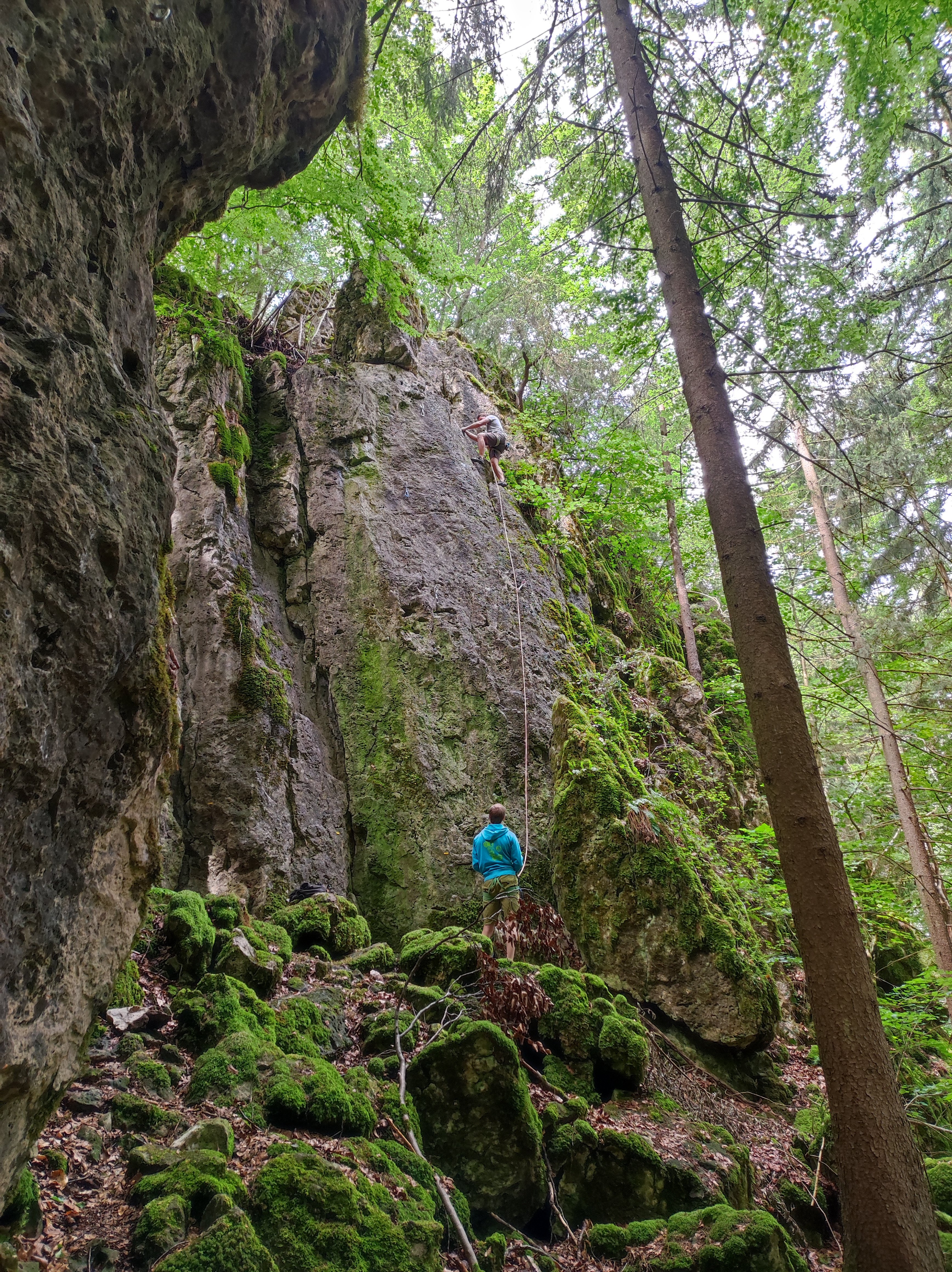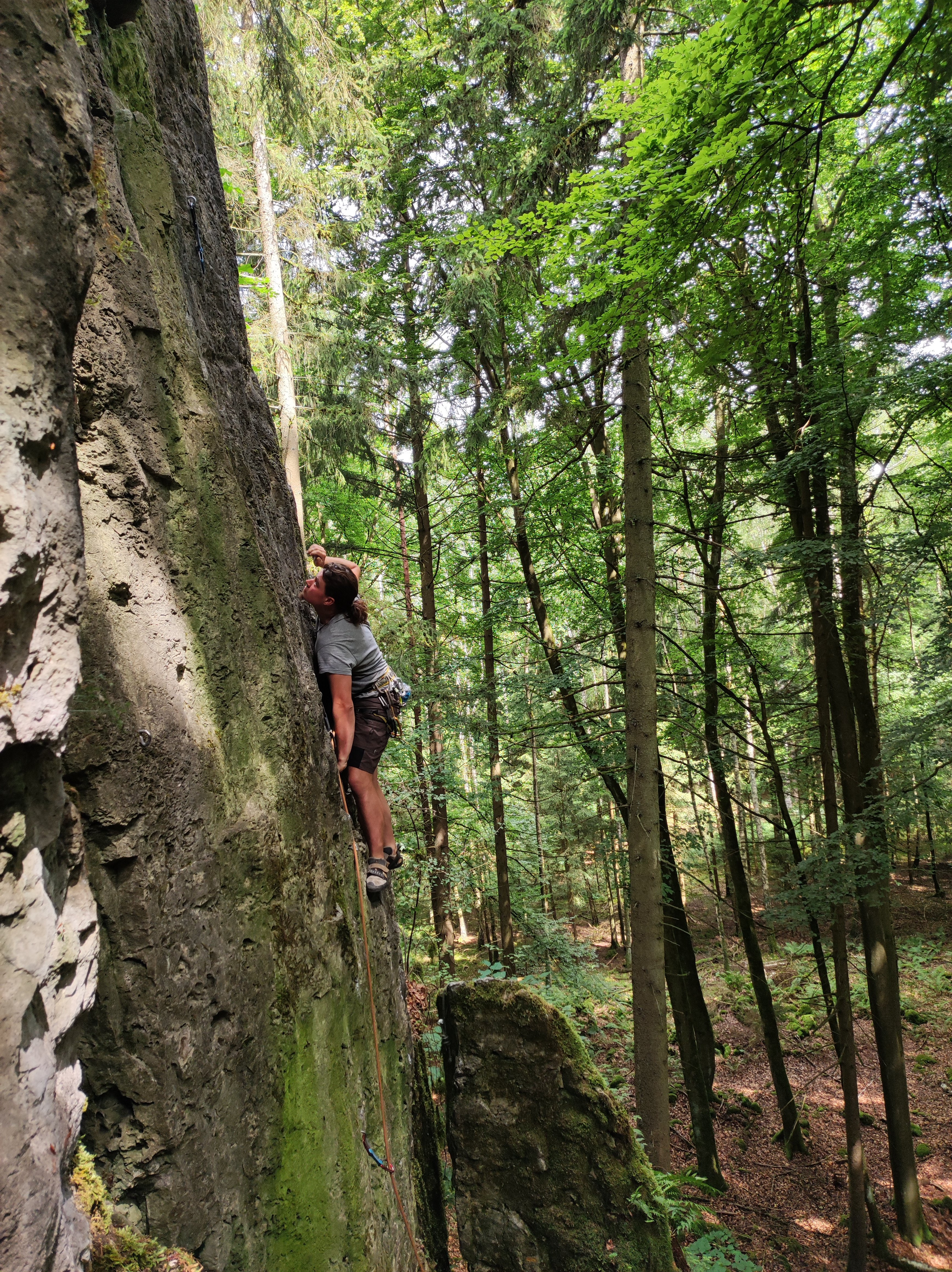 Am zweiten Tag hatte die Gruppe nach dem Frühstück einen weiteren Felsen im Visier mit typisch fränkischer „Kletterkost“. Alle Routen am Felsen vom Schwierigkeitsgrad 4+ bis 8+ wurden geklettert. Mit müden Armen und strapazierten Fingern belohnte sich die Gruppe mit Grillen.