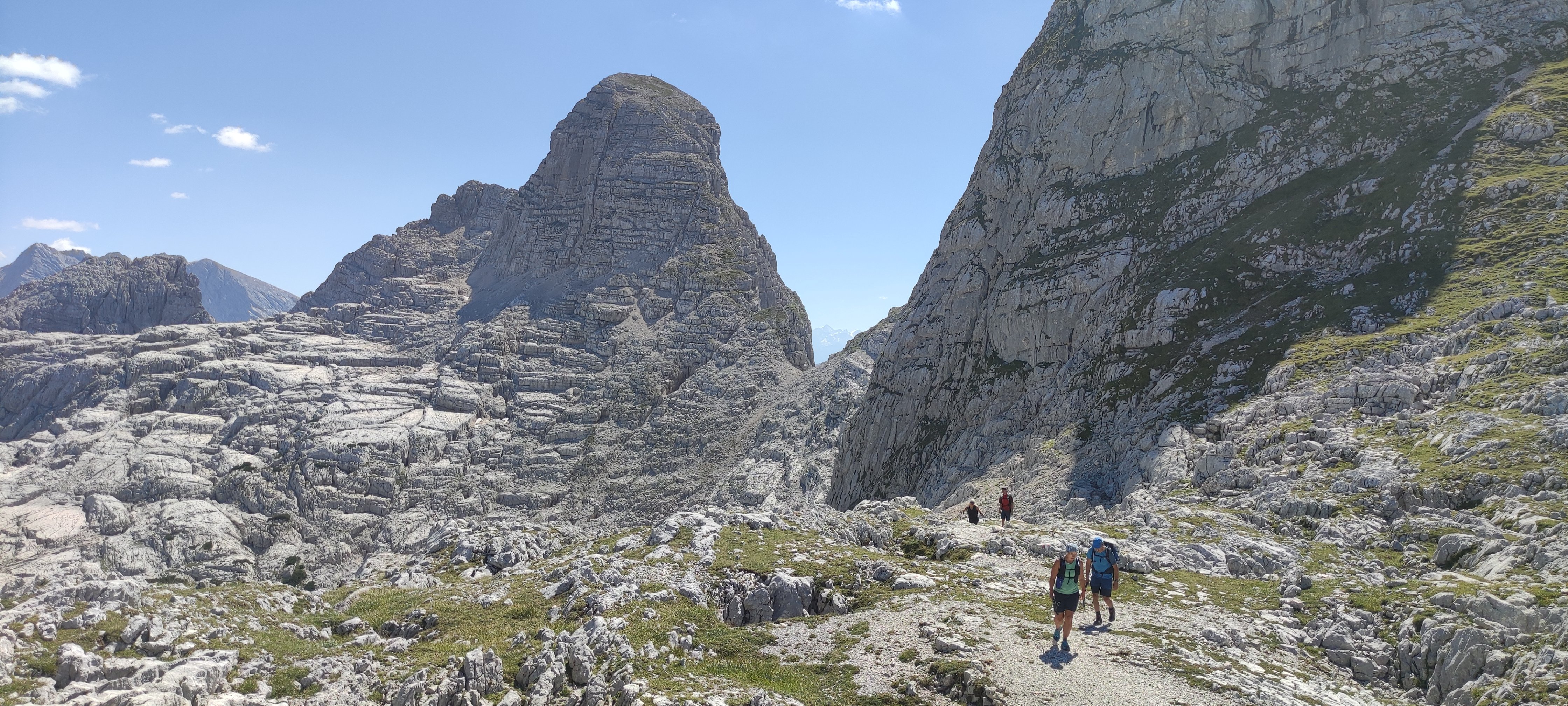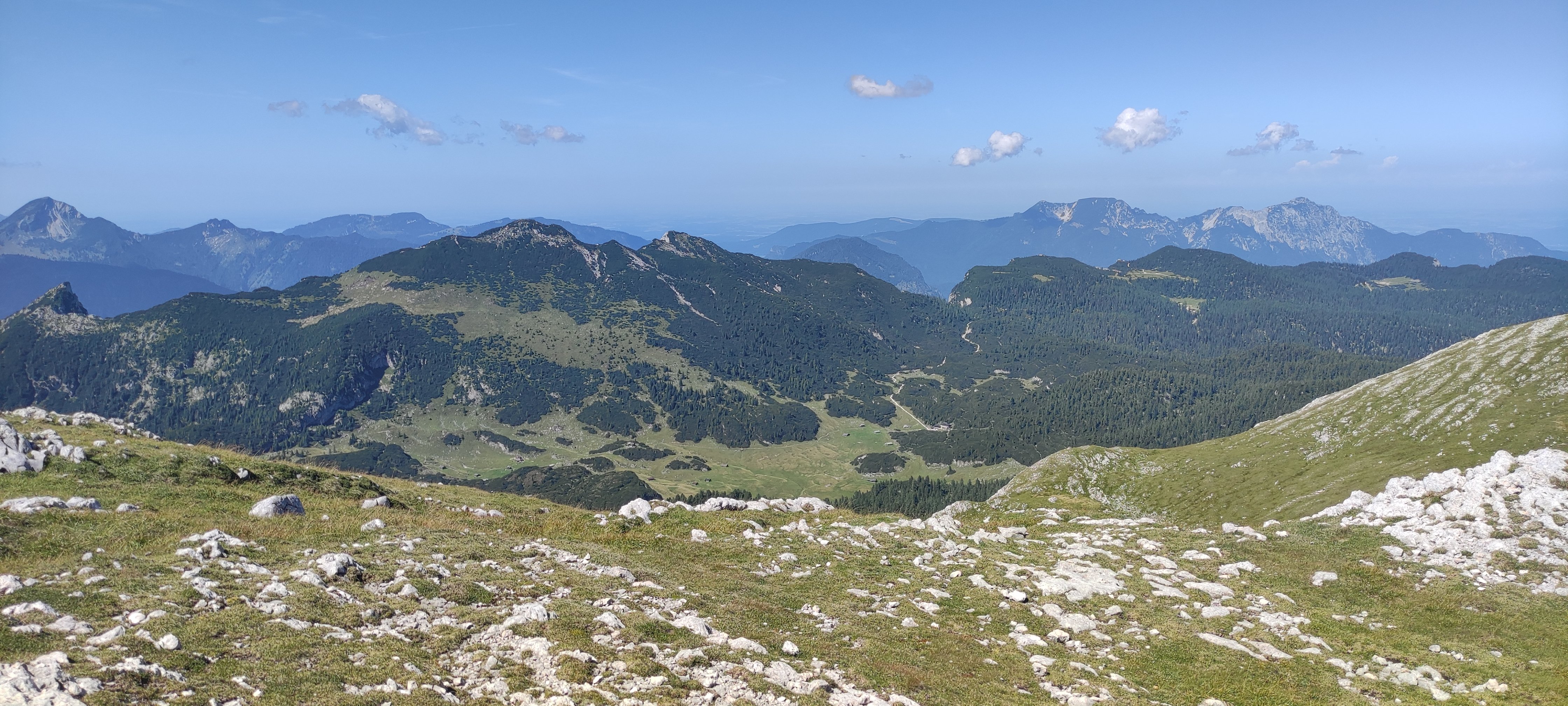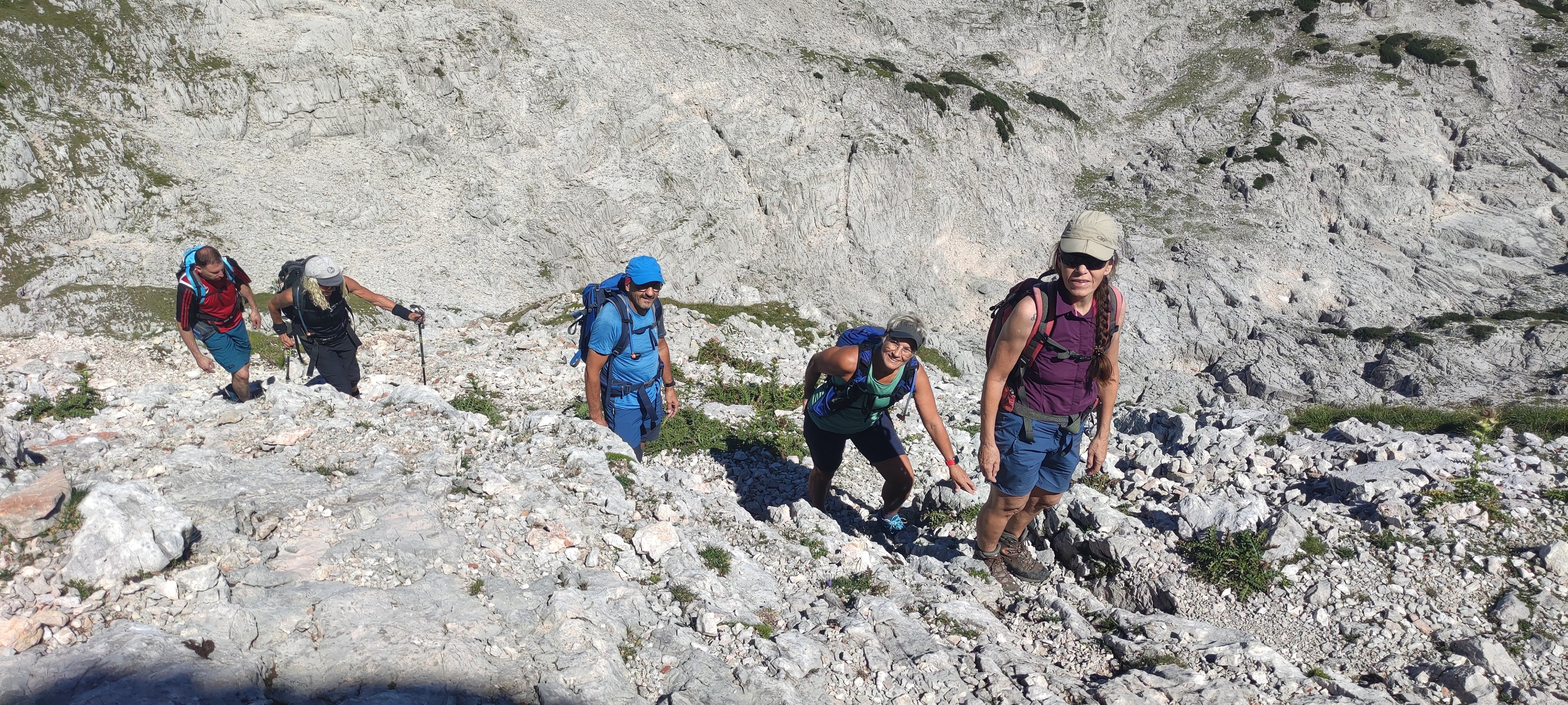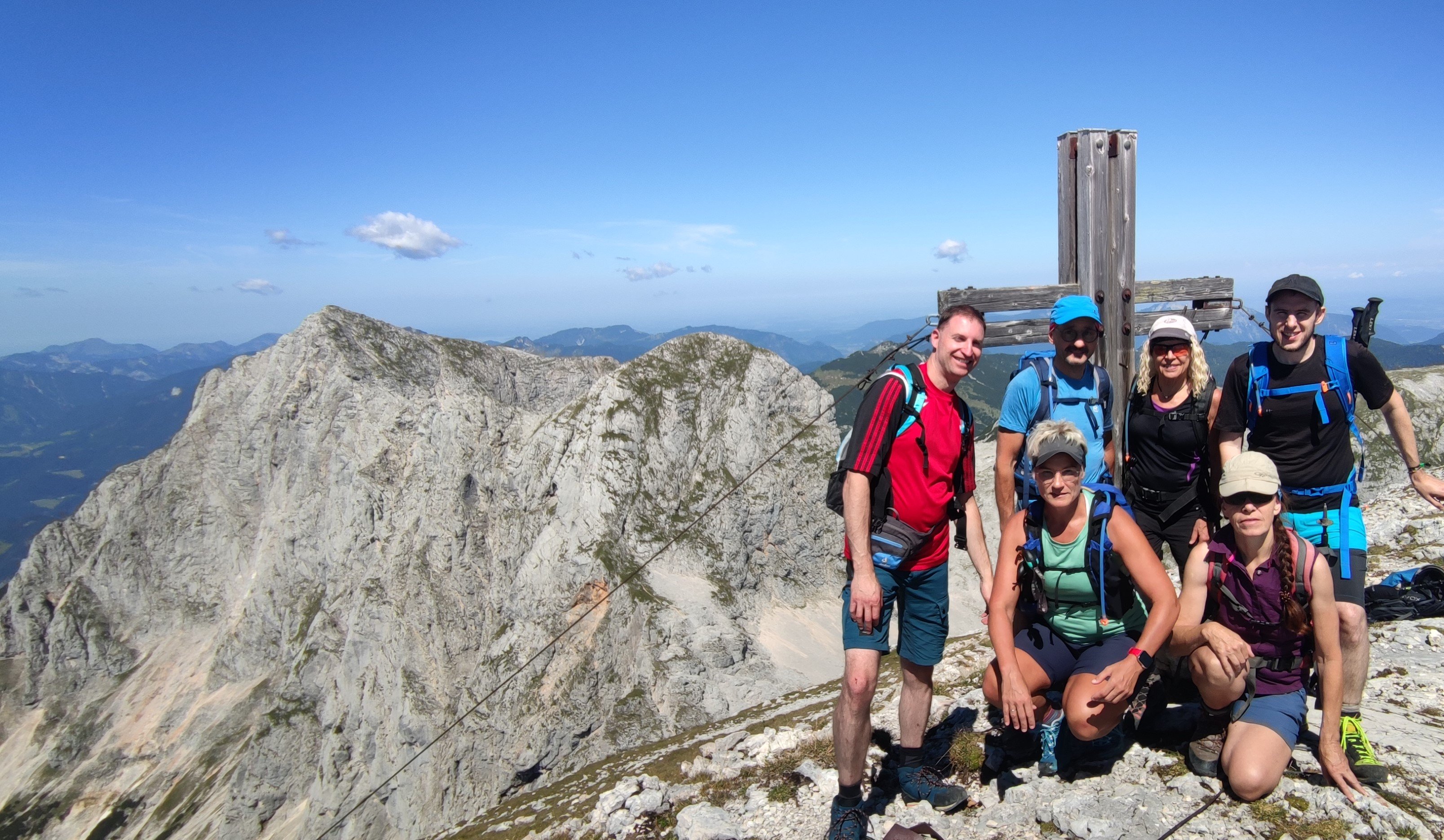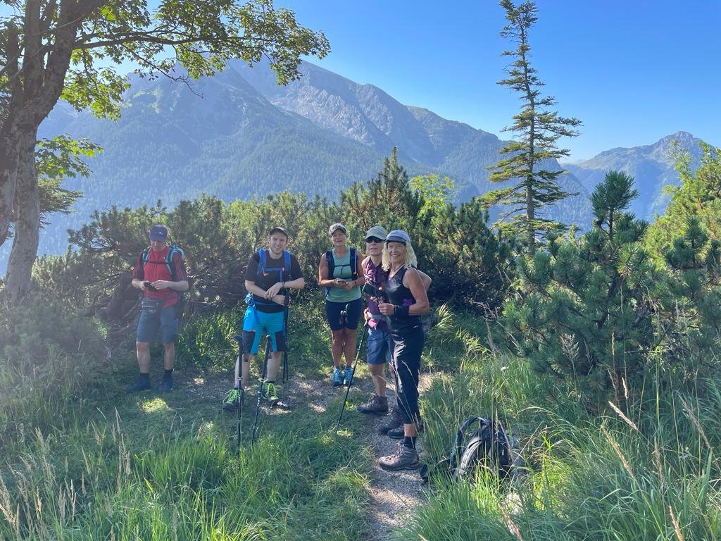 Eine 6-köpfige Wandergruppe der DAV Sektion Pfarrkirchen unternahm unter der Leitung von Markus Jagdhuber eine Tour auf das Stadelhorn. Vom Parkplatz Hintersee fuhr man zuerst mit dem Almerlebnisbus einige Stationen bis zur Engert-Holzstube. Dort zweigt der Schaflsteig ab mit dem man erst durch den Wald und anschließend durch Latschen, aber immer sehr steil hinauf, bis zum Sockel der Stadelmauer gelangt. Nach einer kurzen Querung führt der Weg mit klettersteigähnlichen Versicherungen steil hinauf zur Maybergscharte. Dort bog man rechts ab, die letzten Meter hinauf zum Gipfel. Dieser Teil mit seinen teils auch ausgesetzten Kletterstellen verlangte von den Teilnehmern nochmals die volle Konzentration. Oben angekommen wurden die Wanderer aber mit einen 360 Grad Panorama mit Fernsicht bis hin zum Großglockner entschädigt. Nach einer ausgiebigen Gipfelrast ging man auf den gleichen Weg zurück zur Maybergscharte. Der Weiterweg führte erst auf den Sattel zwischen Wagendrischelhorn und Plattelkopf und dann in gemütlichen auf und ab über dessen wenig ausgeprägten Erhebungen bis zum Reiter Steinberg, welcher einen guten Ausblick über die gesamte Reiteralpe bot. Hier bog man in der Böselsteig ein, der, auch mit einigen Seilversicherungen, die Bergsteiger wieder zurück zum Parkplatz führte.