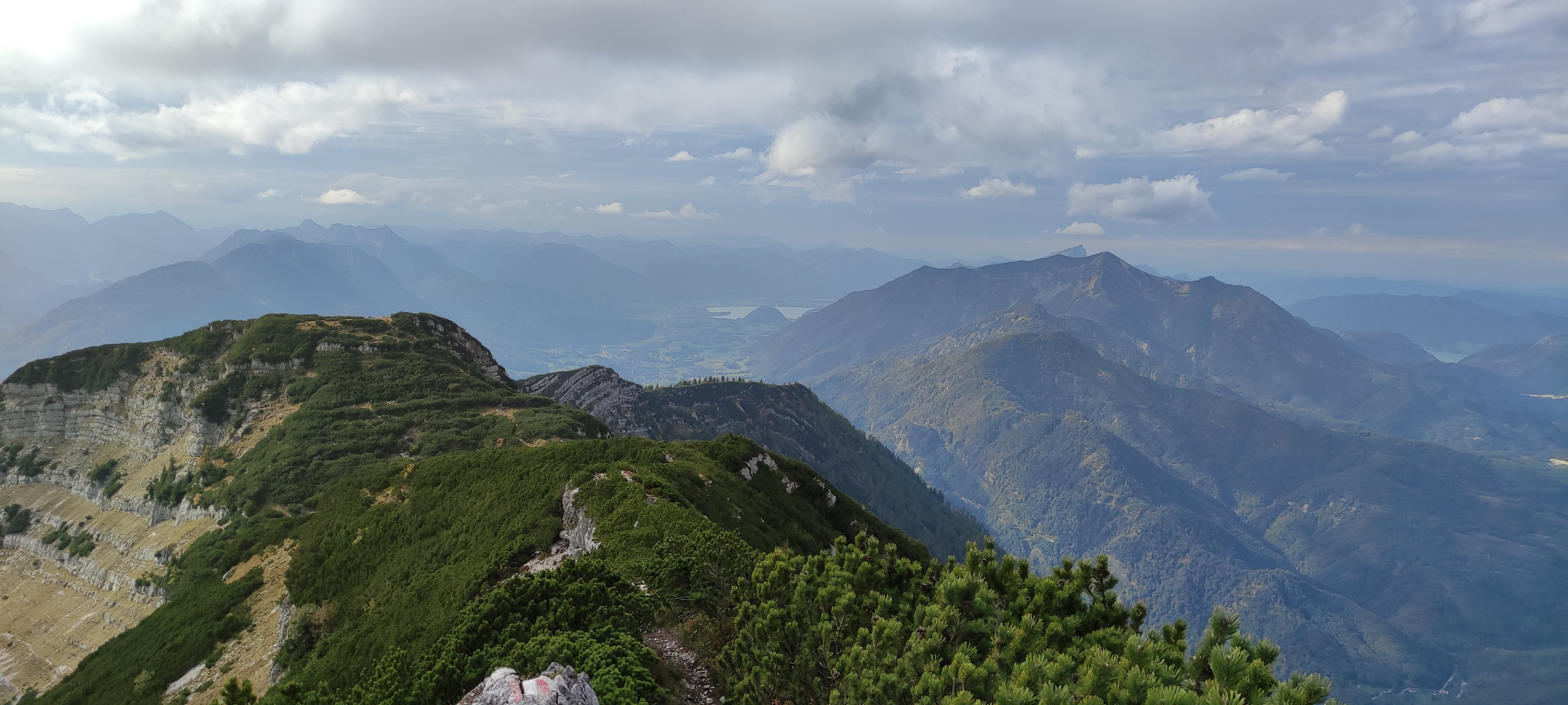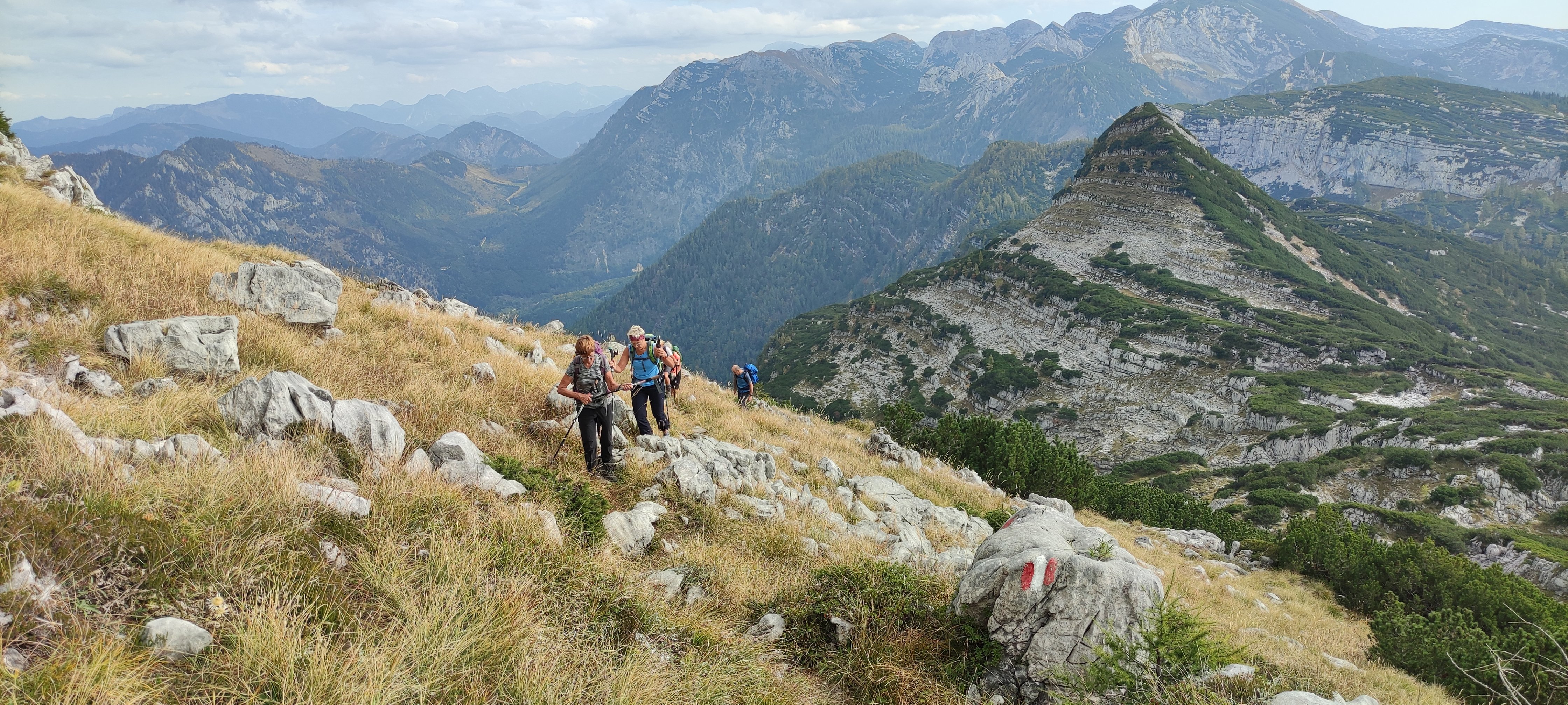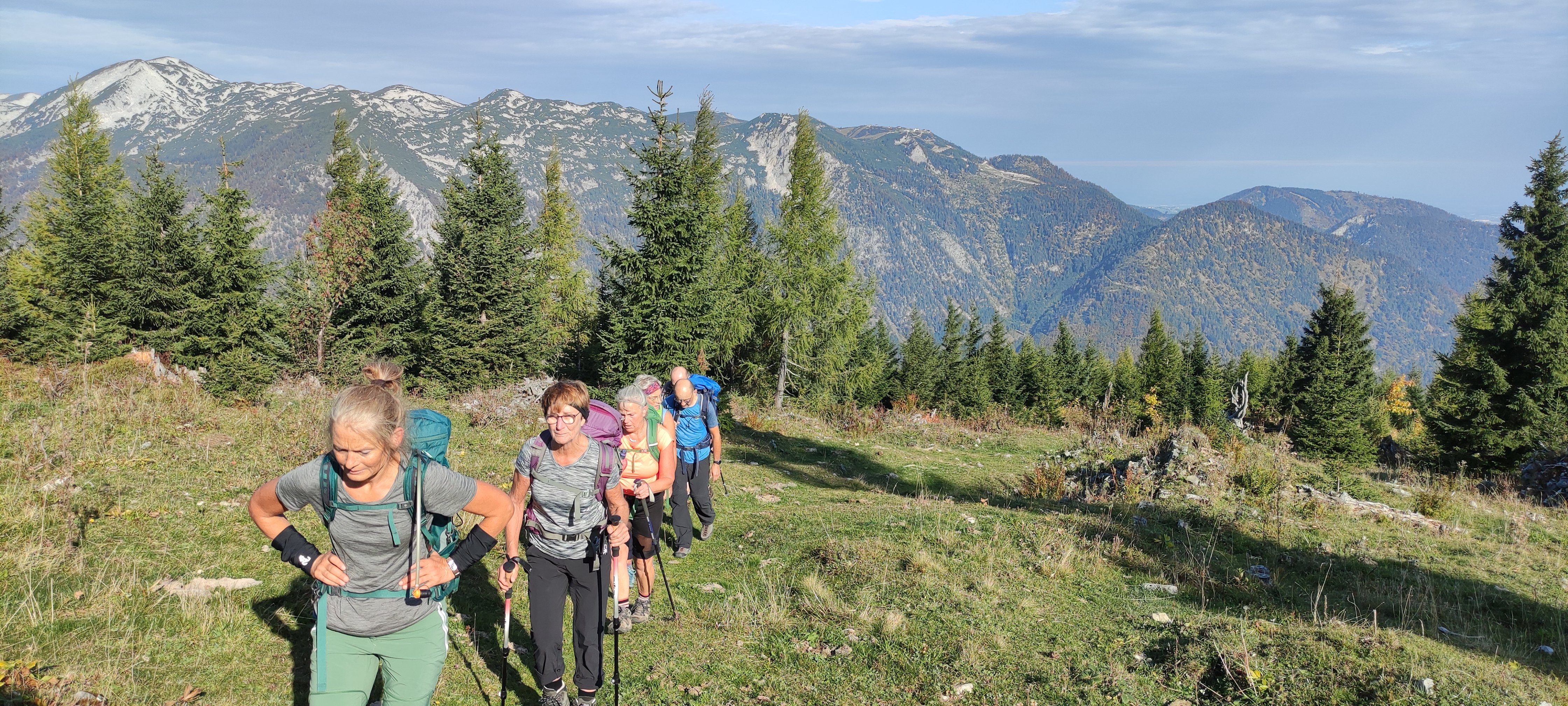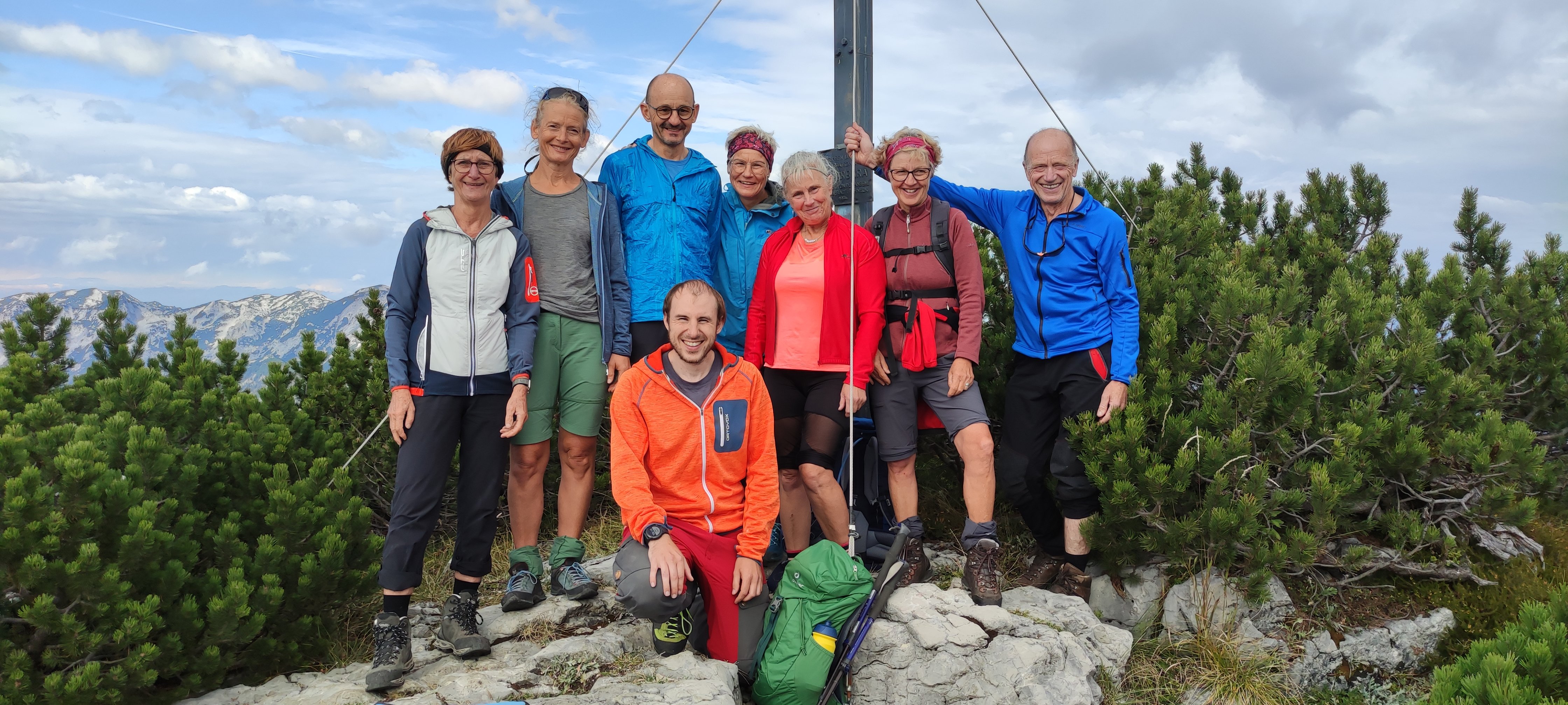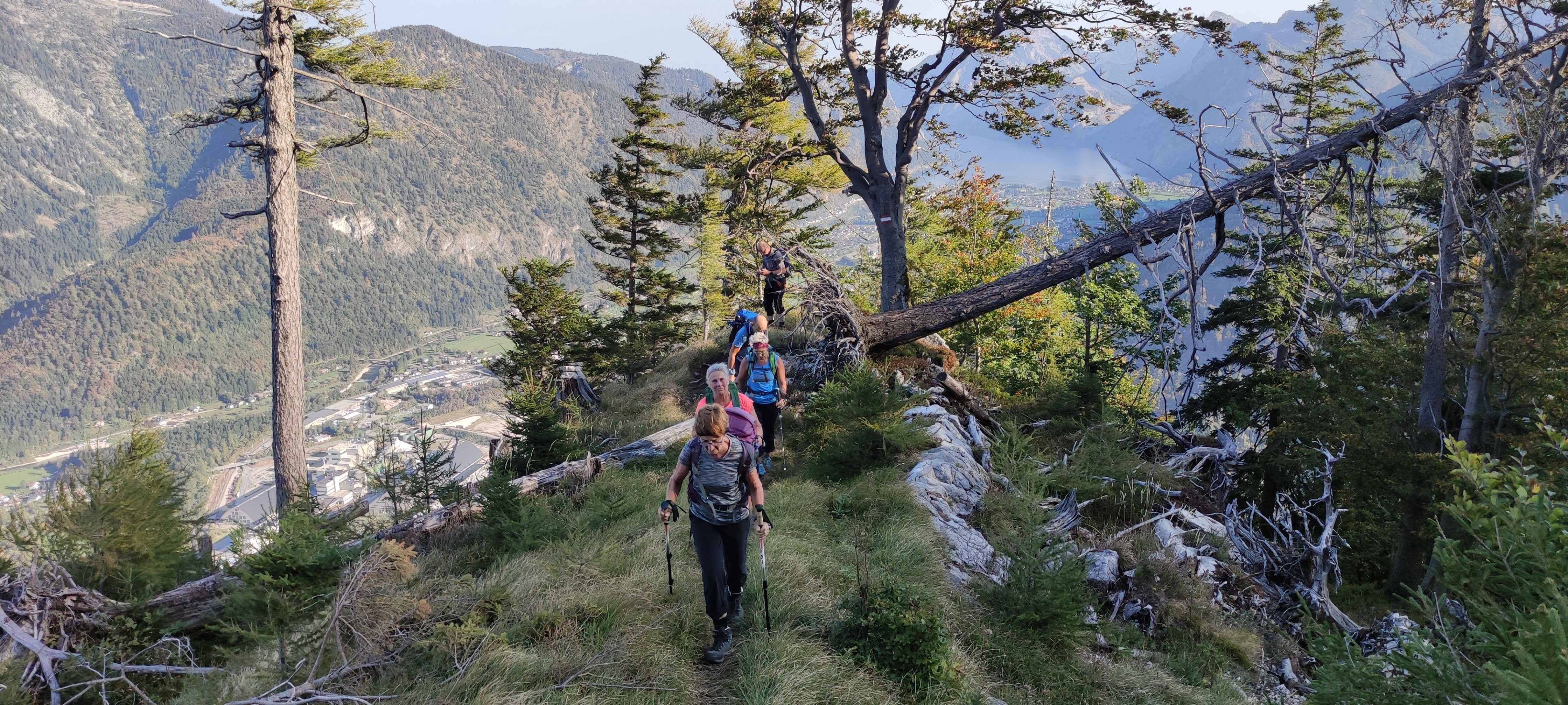 Eine 8-köpfige Wandergruppe der DAV Sektion Pfarrkirchen unternahm unter der Leitung von Jagdhuber Markus eine Herbsttour ins Höllengebirge. Vom Wanderparkplatz bei Frauenweißbach ging es auf einem steilen Weg durch den Wald hinauf zur Brombergalm und von dort weiter zum ersten Gipfel des Tages, den Petergupf. Nach einer kleinen Gipfelrast, folgte der Höhepunkt der Tour, die Gratüberschreitung zur Hohen Schrott. Ein oft ausgesetzter Weg der volle Trittsicherheit und Konzentration verlangte und einige mit Drahtseilen versicherte Kletterpassagen führte die Wanderer den atemberaubenden Grat entlang zur Hohen Schrott. Nach einer ausgiebigen Gipfelrast ging es über einen weiteren Nebengipfel, den Hochglegt, hinab nach Bad Ischl. Dort kehrte man noch ein, ehe es mit dem Zug zurück zum Ausgangspunkt ging.