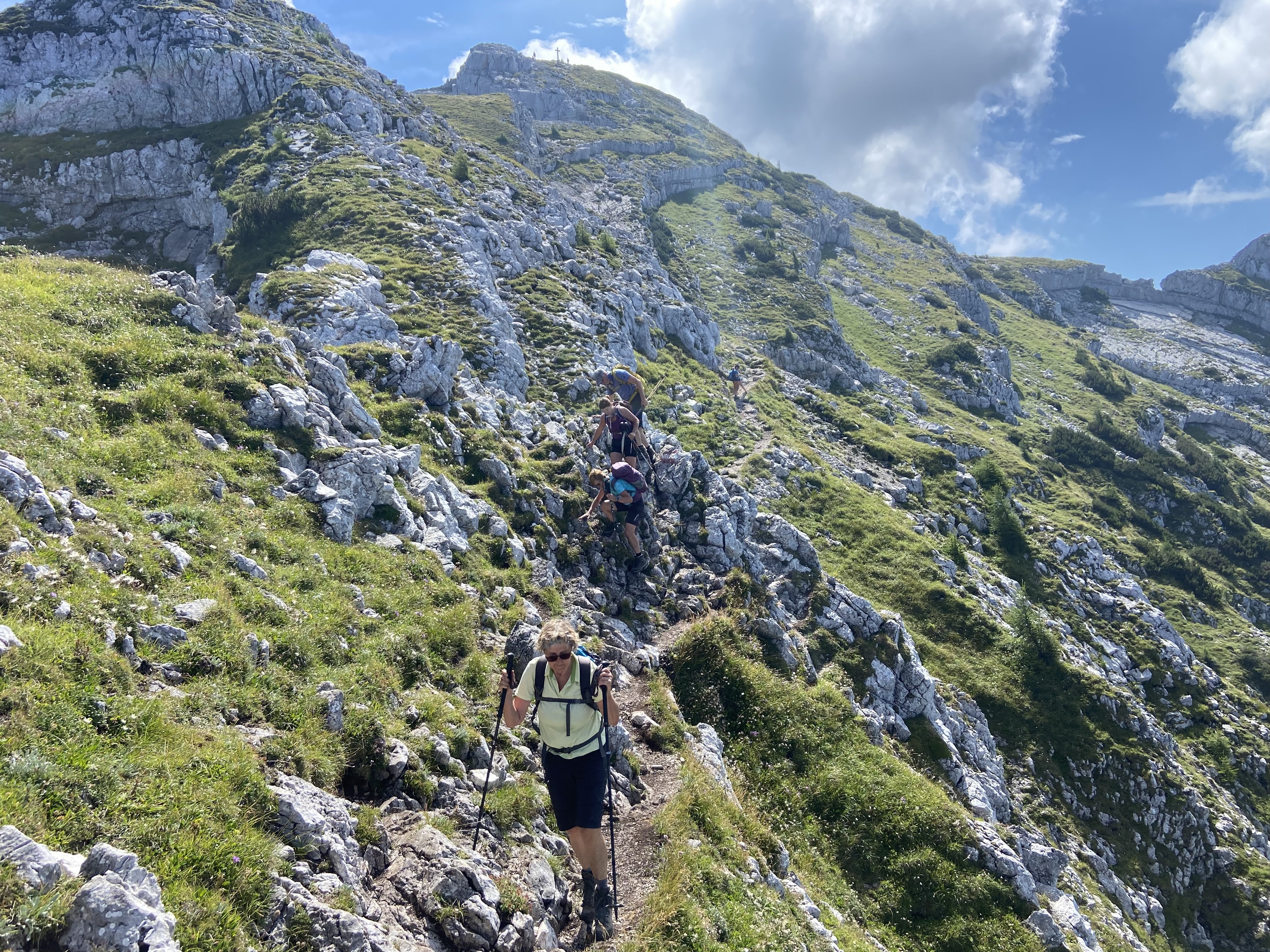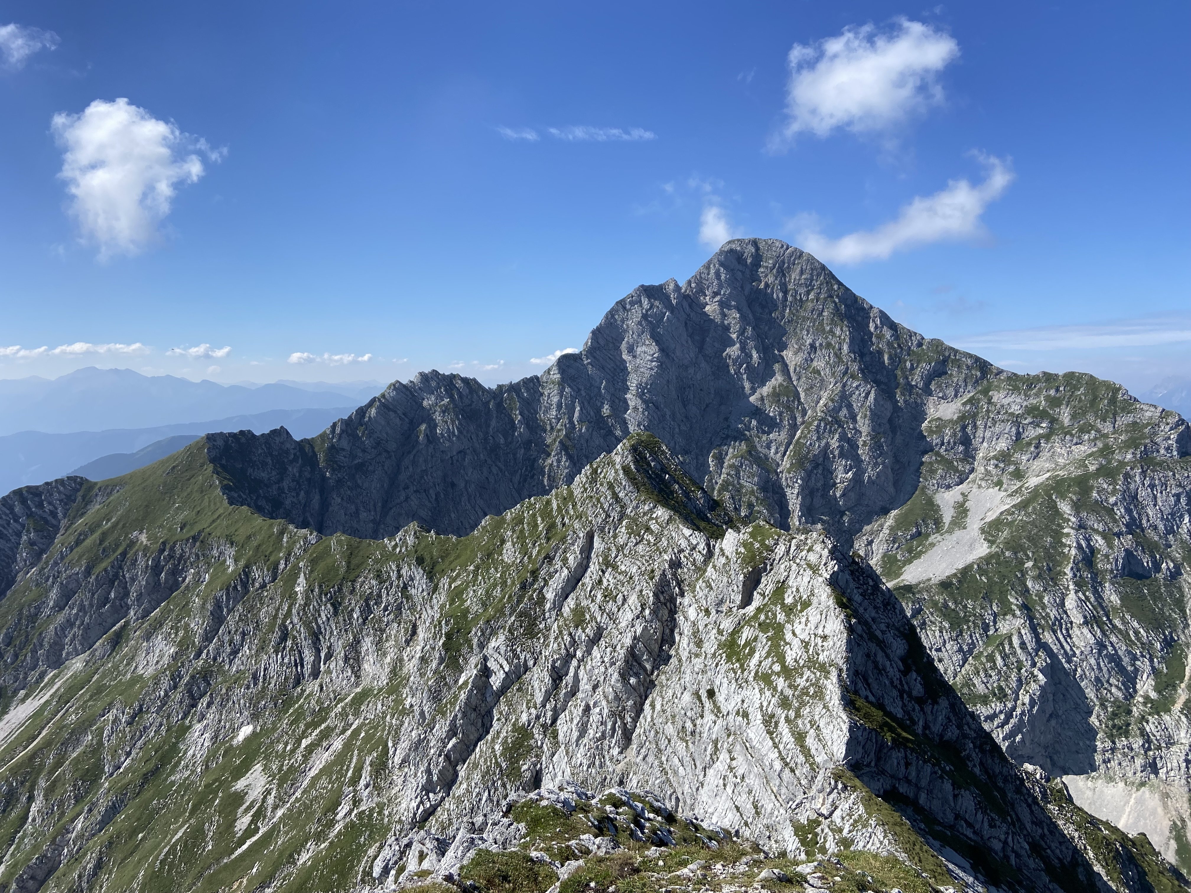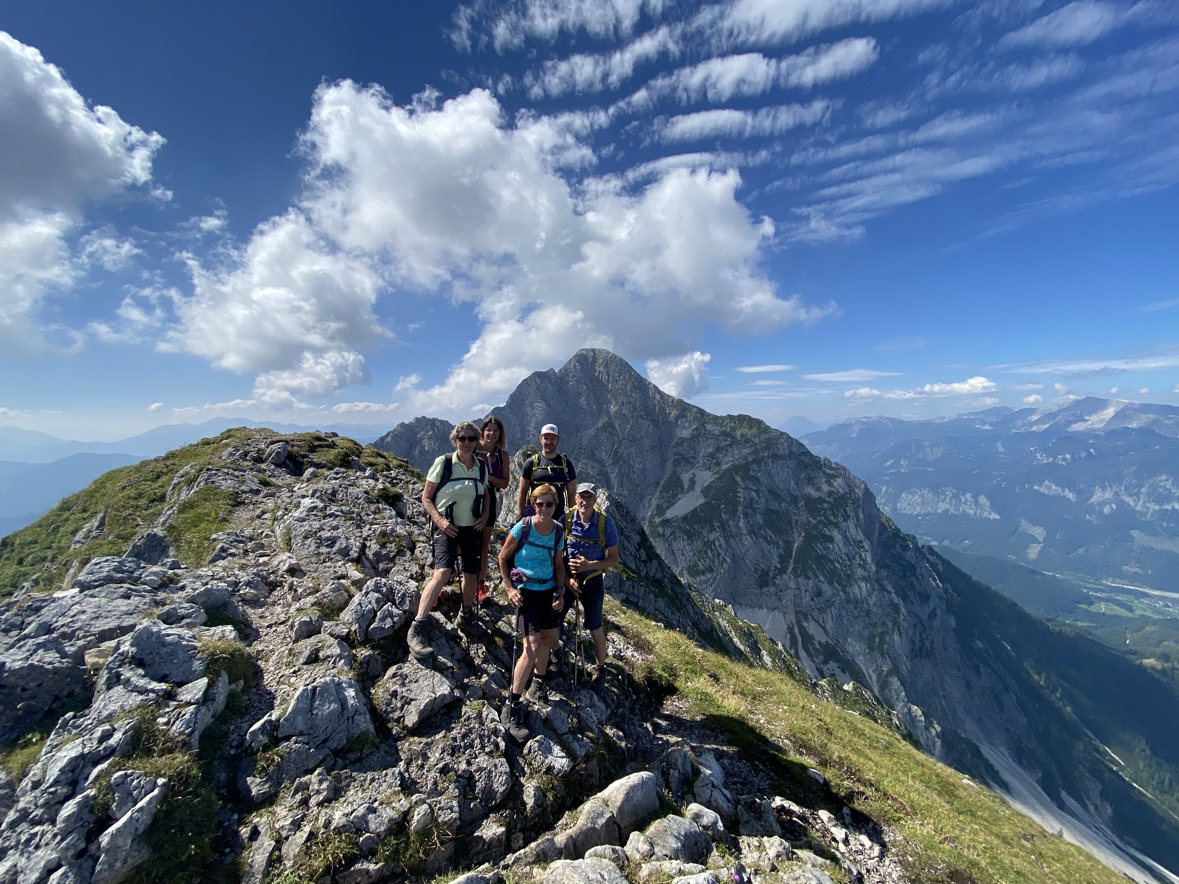 Bei strahlendem Sonnenschein und blauem Himmel bewältigten wir noch gut 800 Höhenmeter bis zu Gipfel und genoßen dort den wunderbaren Rundumblick über den Grat zum Großen Phyrgas – eine weglose Überschreitungsroute die wir an diesem Tag nicht machen wollten, die aber sicherlich reizvoll ist für eine Wiederkehr – und zu den weiteren Gipfel der Haller Mauern, wie dem Scheiblingstein. Aufgrund des guten Wetters reichte der Ausblick auf westlicher Seite bis in die Gebirgskette des großen Priel.
