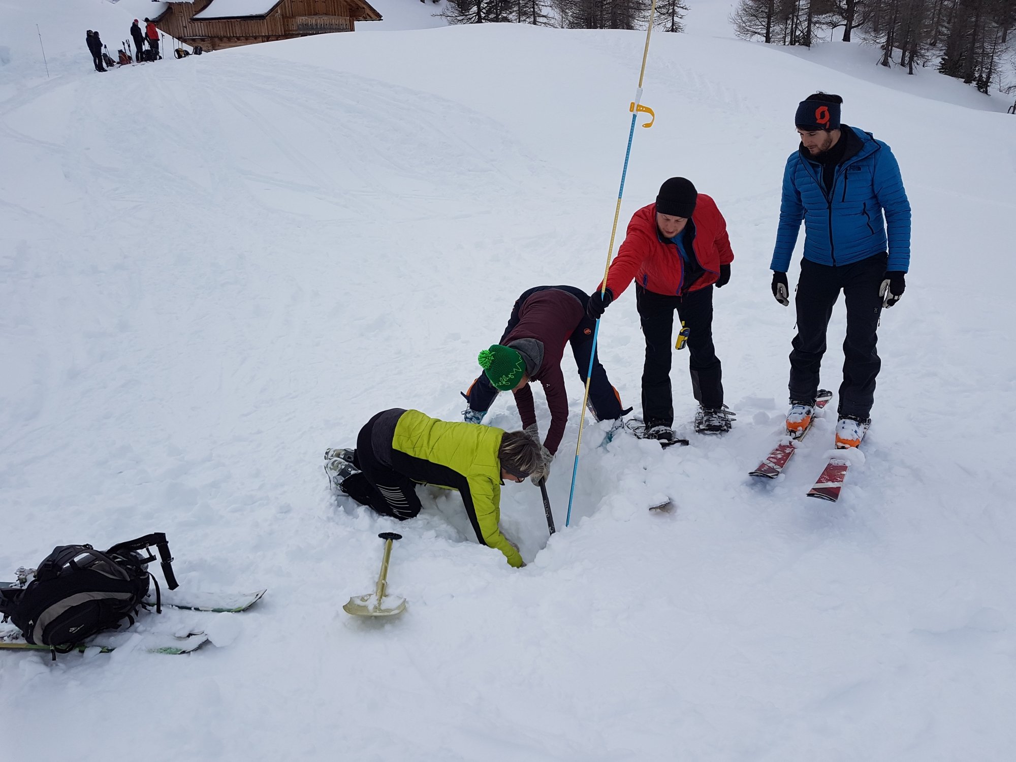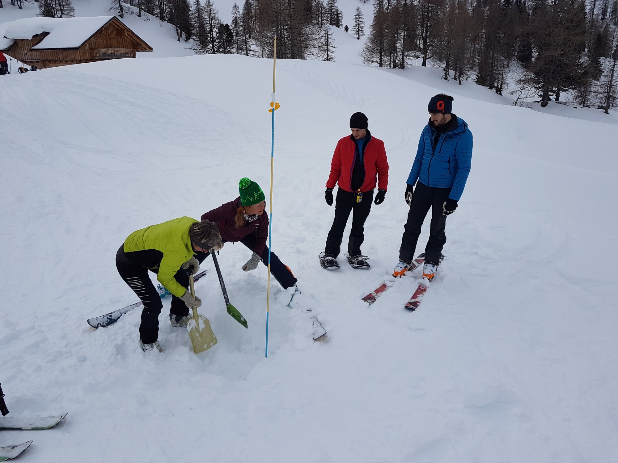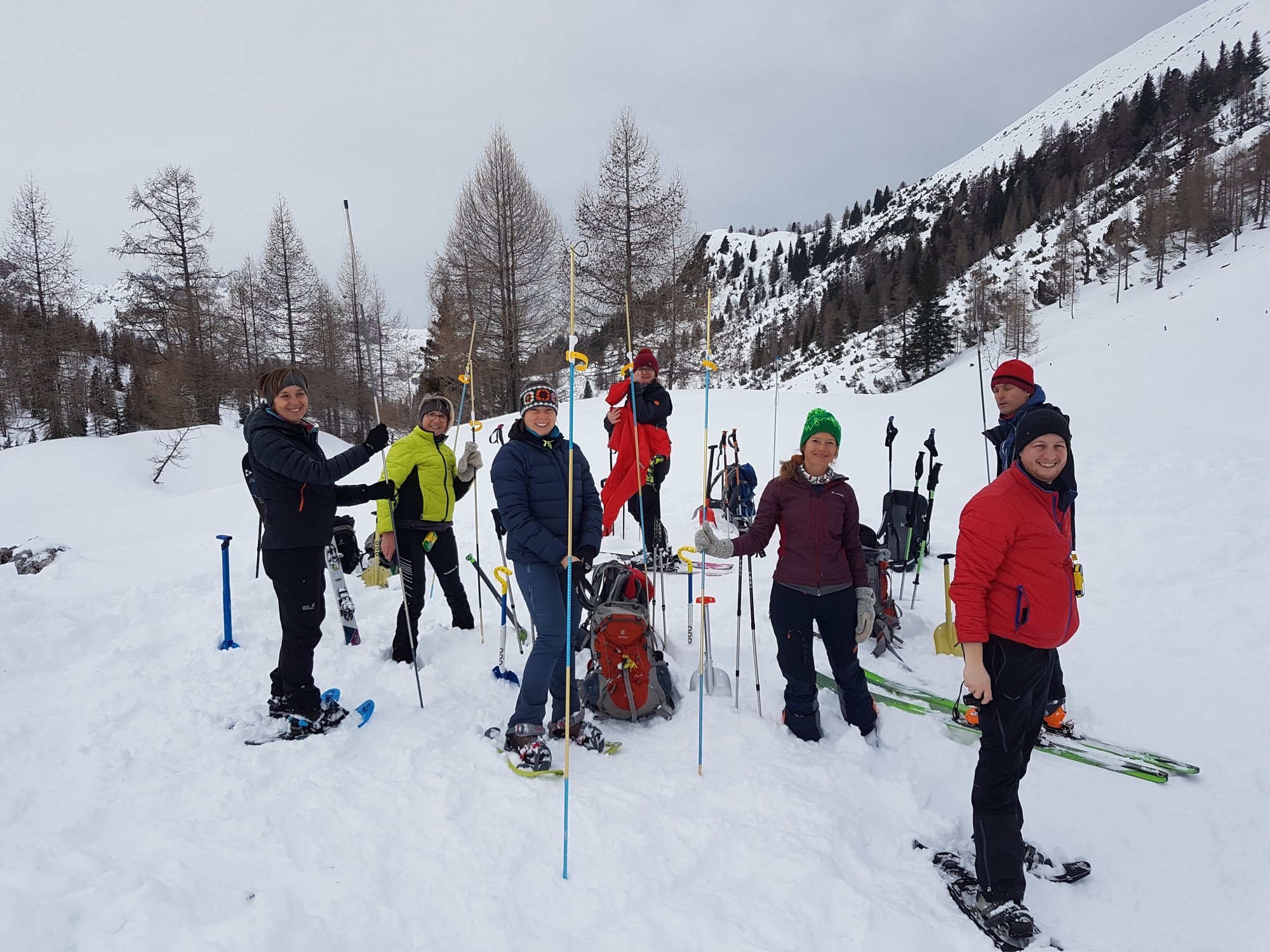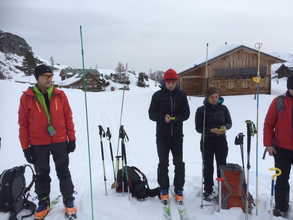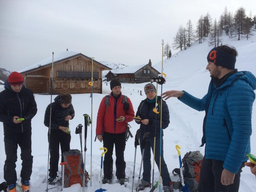 6 Skitouren- und 4 Schneeschuhgeher machten sich am Freitagnachmittag auf den Weg zum Parkplatz an der Vorderen Gnadenalm, kurz vor Obertauern. Von dort stiegen die zwei Gruppen am Abend rund 600 Höhenmeter zur Südwiener Hütte auf. Nach dem Abendessen zeigte Sebastian Seifert den Teilnehmern wie man den Lawinenlagebericht richtig liest und für die Tourenplanung anwendet. Am Samstagmorgen wurde dann ausgiebig der Umgang mit der obligatorischen Lawinen-Sicherheitsausrüstung für Tourengeher geübt. Von der Beobachtung eines Lawinenabgangs, über den Ablauf der Rettungskette, das Suchen mit dem Lawinenpiepser, das korrekte Anwenden der Sonde und effektives Schaufeln, konnte jeder Teilnehmer seine Kenntnisse erweitern.