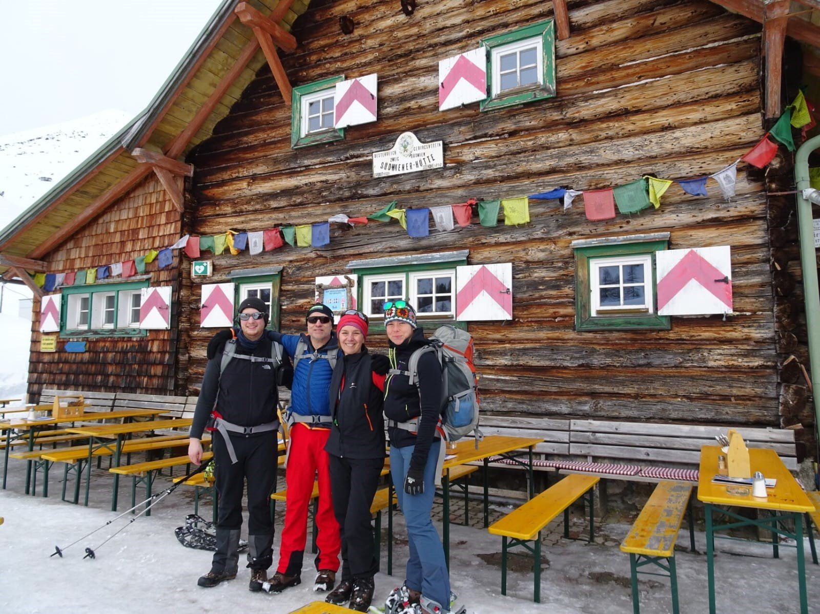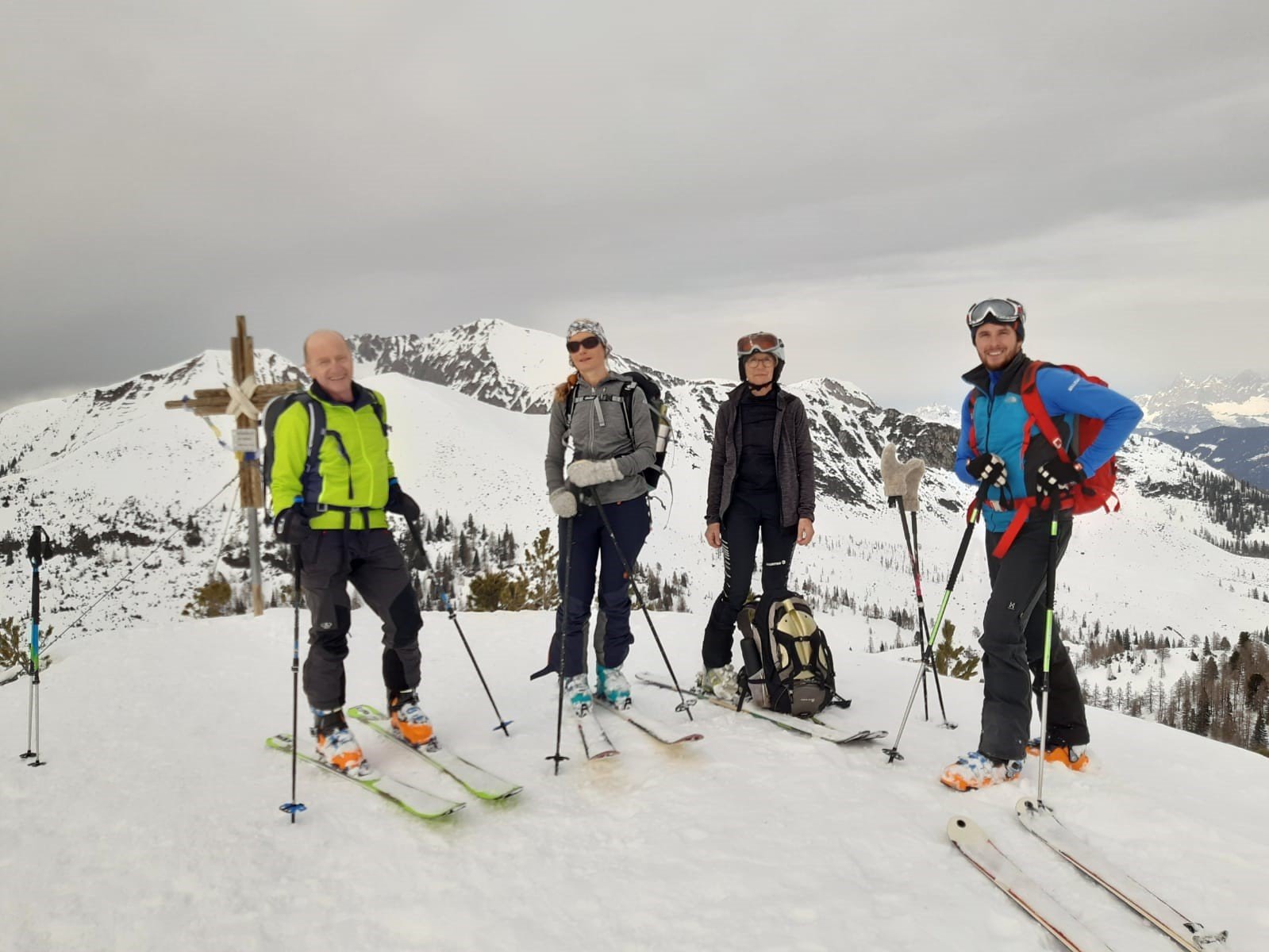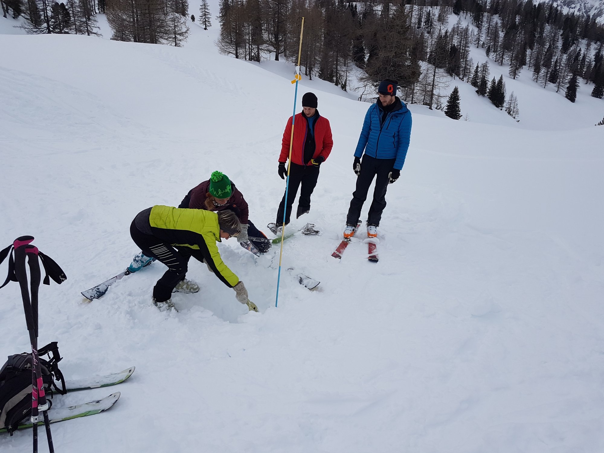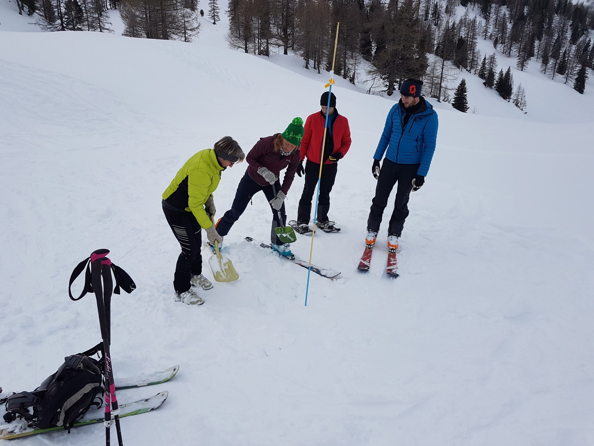 6 Skitouren- und 4 Schneeschuhgeher machten sich am Freitagnachmittag auf den Weg zum Parkplatz an der Vorderen Gnadenalm, kurz vor Obertauern. Von dort stiegen die zwei Gruppen am Abend rund 600 Höhenmeter zur Südwiener Hütte auf. Nach dem Abendessen zeigte Sebastian Seifert den Teilnehmern wie man den Lawinenlagebericht richtig liest und für die Tourenplanung anwendet. Am Samstagmorgen wurde dann ausgiebig der Umgang mit der obligatorischen Lawinen-Sicherheitsausrüstung für Tourengeher geübt. Von der Beobachtung eines Lawinenabgangs, über den Ablauf der Rettungskette, das Suchen mit dem Lawinenpiepser, das korrekte Anwenden der Sonde und effektives Schaufeln, konnte jeder Teilnehmer seine Kenntnisse erweitern.