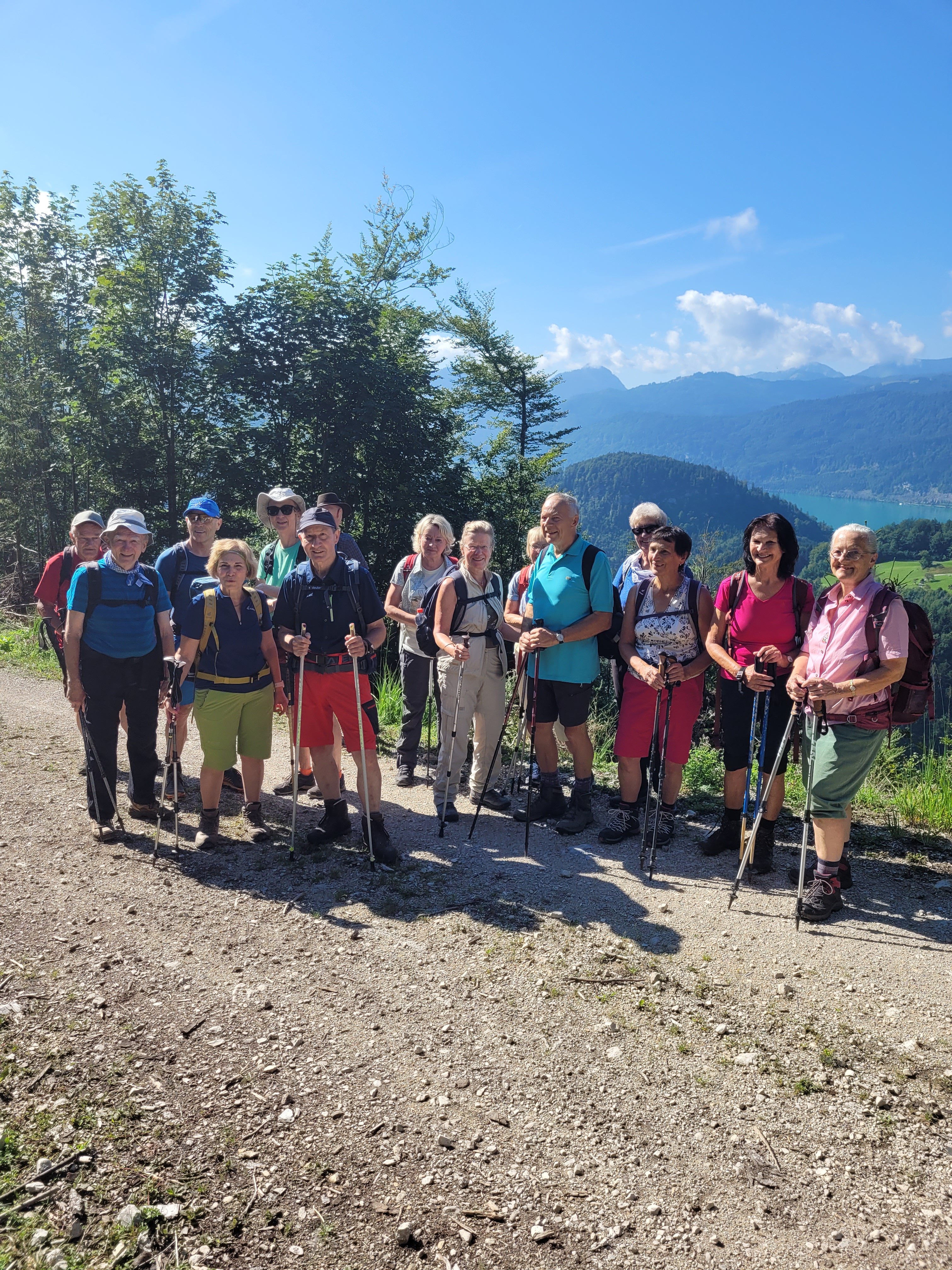 Gegenüber dem Parkplatz am Krotensee, Scharflinger Höhe, führte ein Steig durch schattigen Bergwald stetig bergauf, wobei sich immer wieder wunderschöne Ausblicke auf den Mondsee zeigten. Der Steig mündete nun in eine Forststraße. Hier wurde wegen einem losen Wegweiser-Schild zuerst die falsche Richtung eingeschlagen, was aber von den Teilnehmern mit Humor getragen wurde.