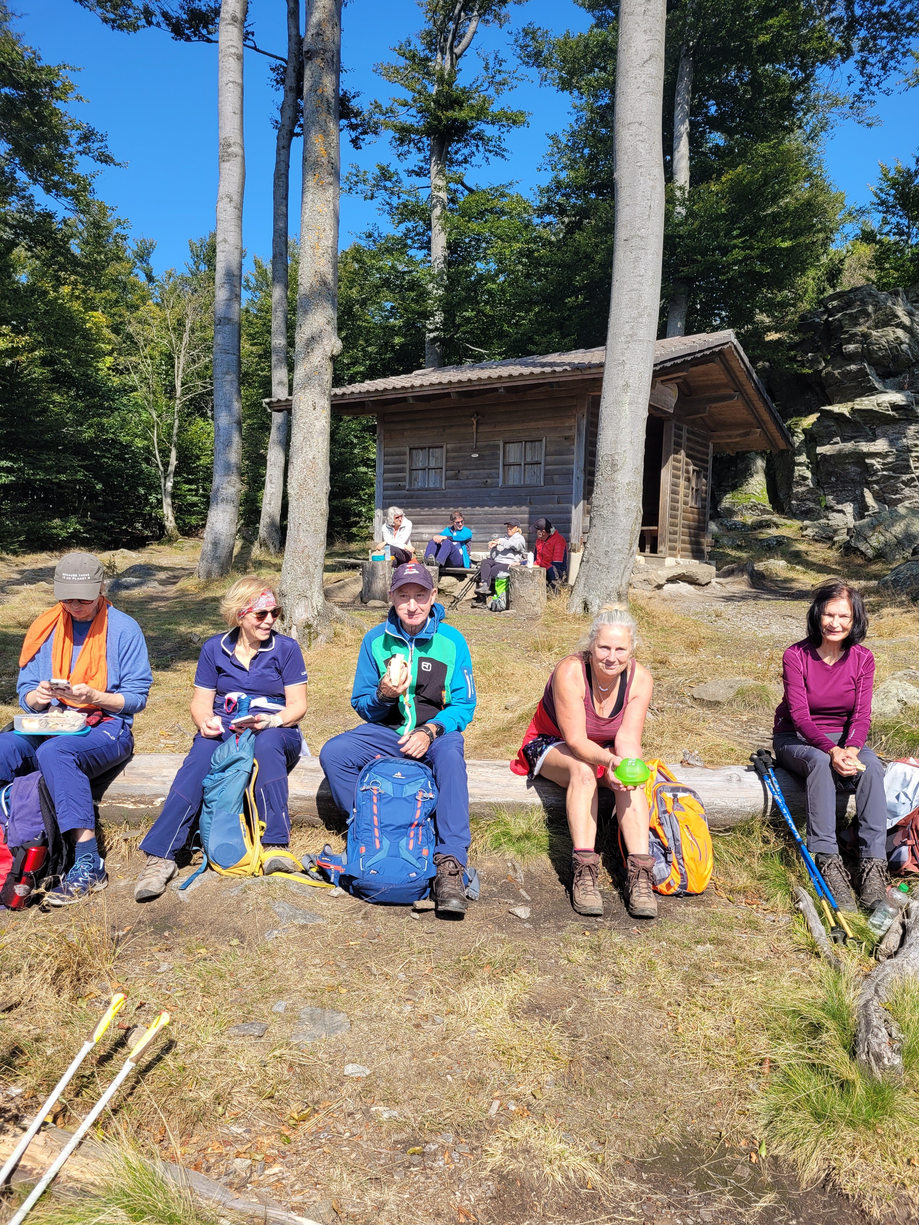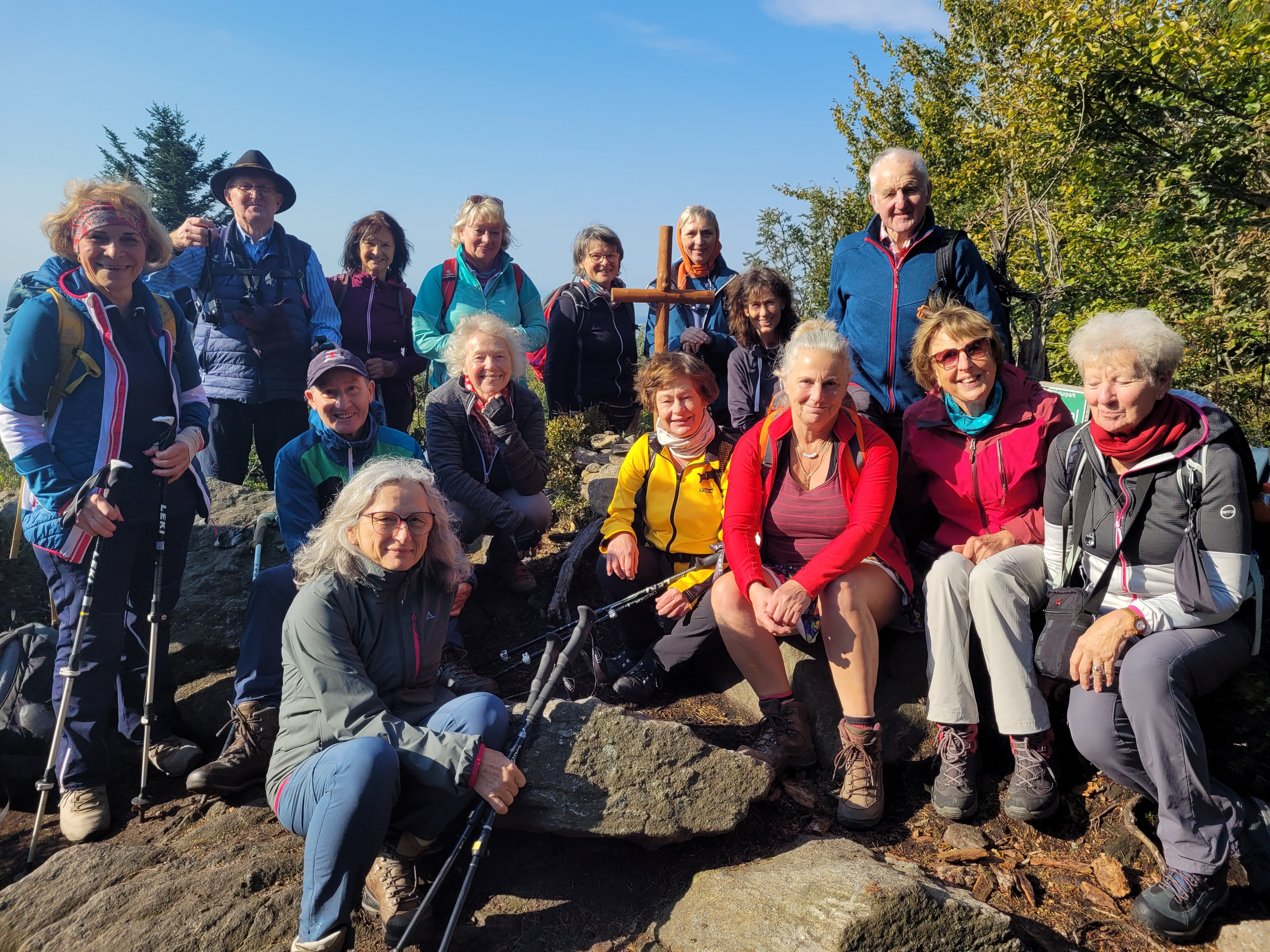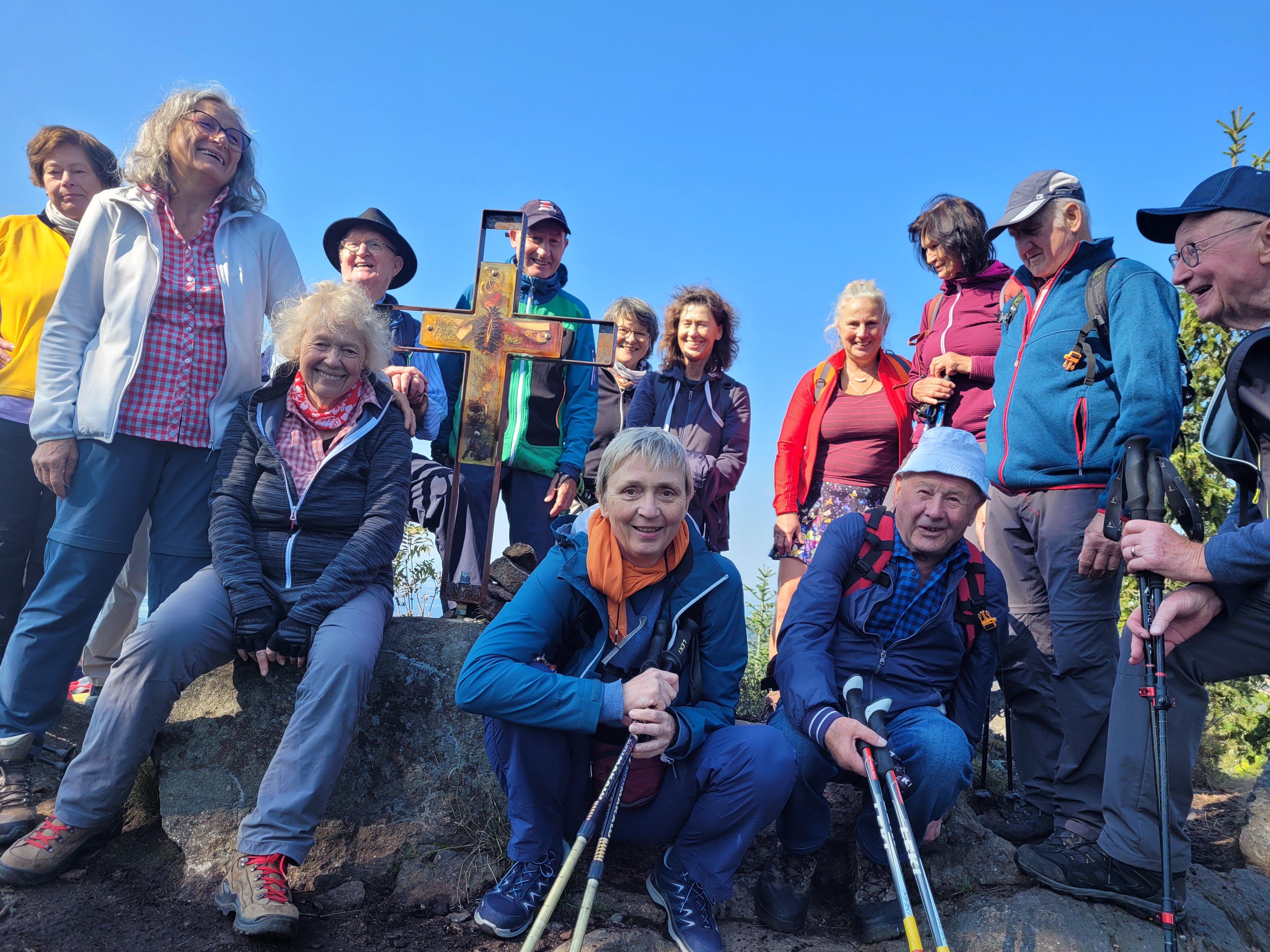 Zurück am Hauptwanderweg ging es dann weiter aufwärts, vorbei an einem Unterstand, der den Senioren als Orientierungspunkt für den zweiten Gipfel diente. Imposante Felsen und einzelne Begehungsspuren ließen den markierungslosen Aufstieg zum Klausenstein vermuten. Nach kurzer Suche wurde mit einigen Kletterzügen der Aussichtsfelsen mit dem einzigartigen Gipfelkreuz aus einer Metall-Glaskonstruktion erreicht. Nach dem Genuss der tollen Fernsicht ging es über eine steile Felspassage wieder abwärts in den Wald und zum Wanderweg.