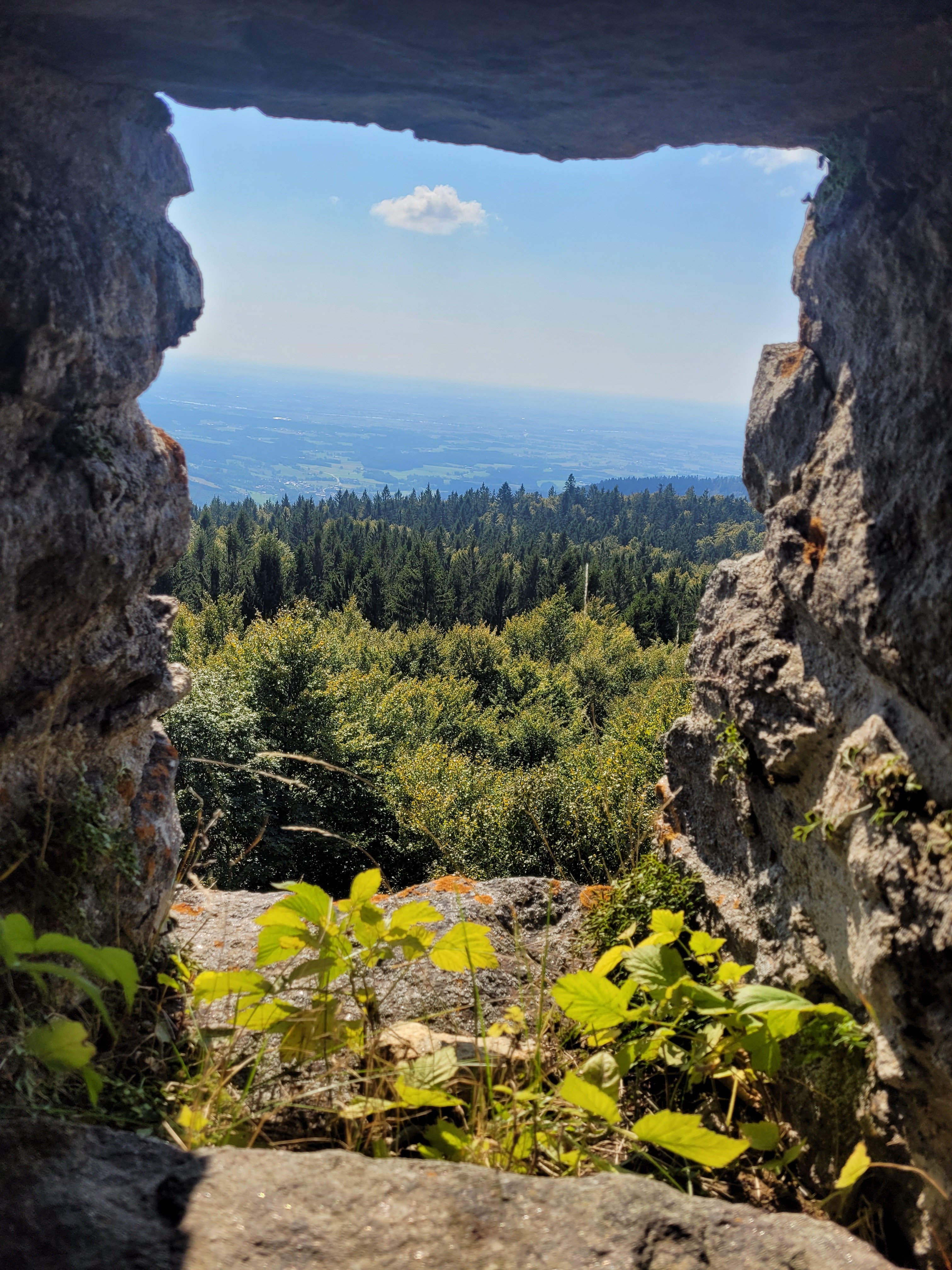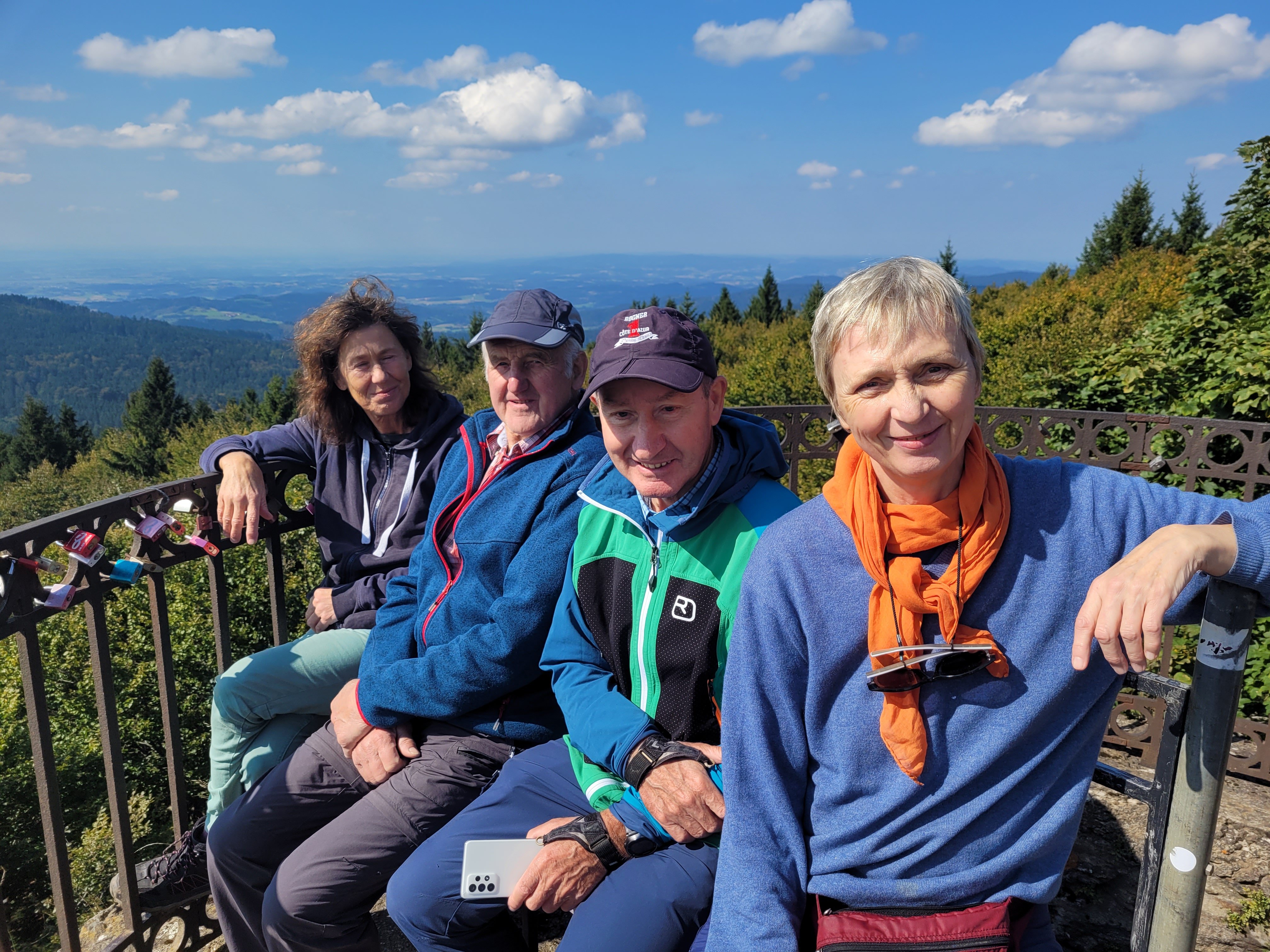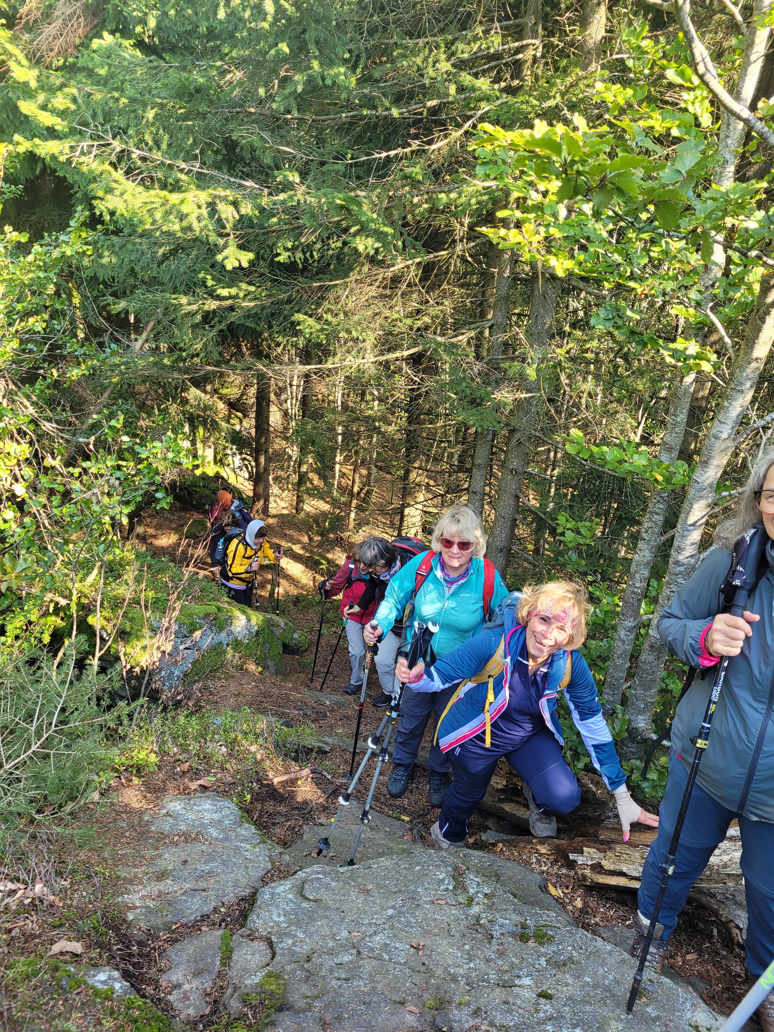 Zunächst führte ein Waldsteig stetig bergan. Auf breiten, moderat ansteigenden Waldwegen gewann man schnell an Höhe und bald zeigte sich die etwas versteckte Wegmarkierung zum Rauhen Kulm. Nach einer kurzen Klettereinlage wurde der Gipfel erreicht. Hier bot sich der Gruppe eine herrliche Fernsicht, bis hin zur Donau.