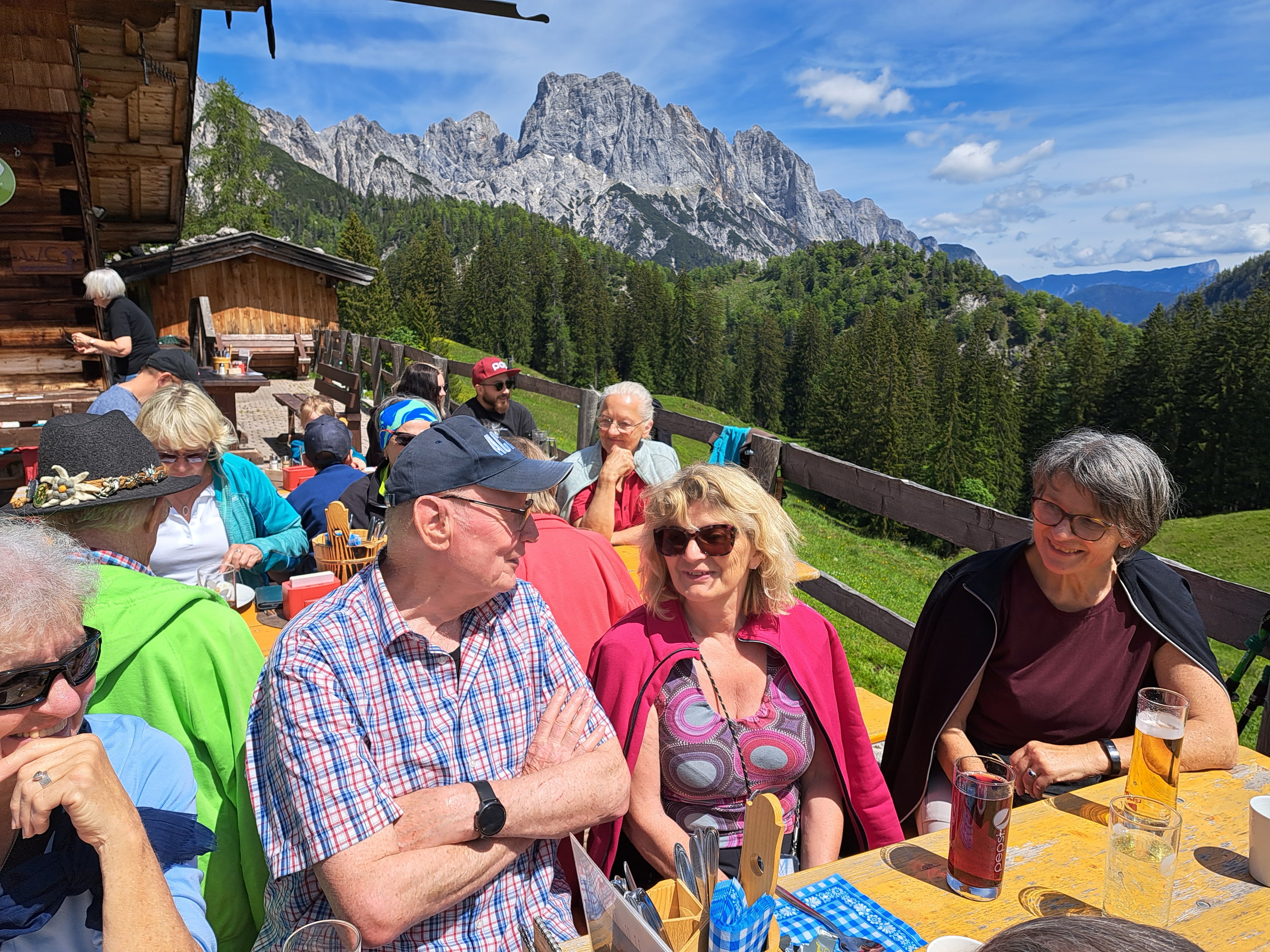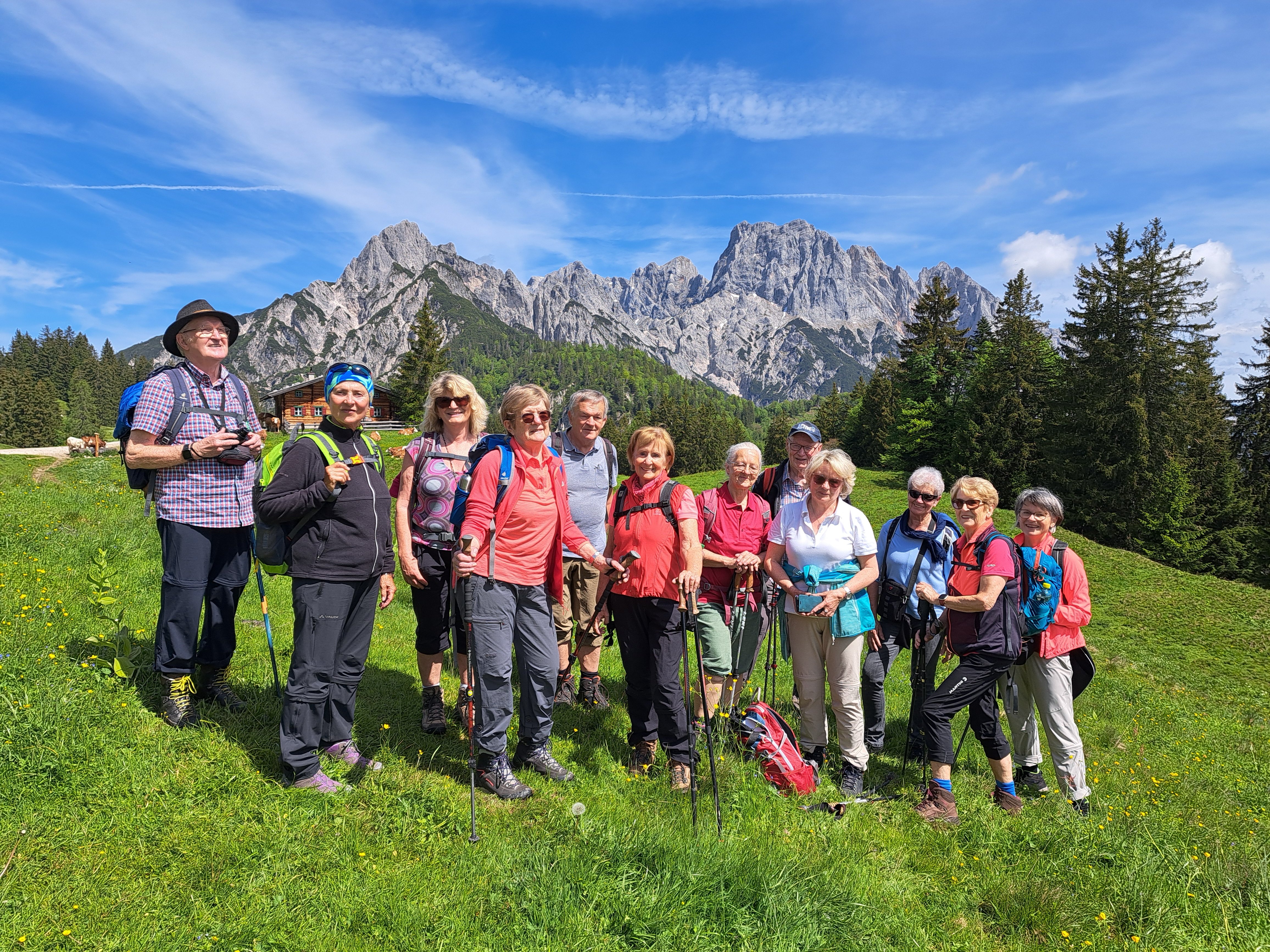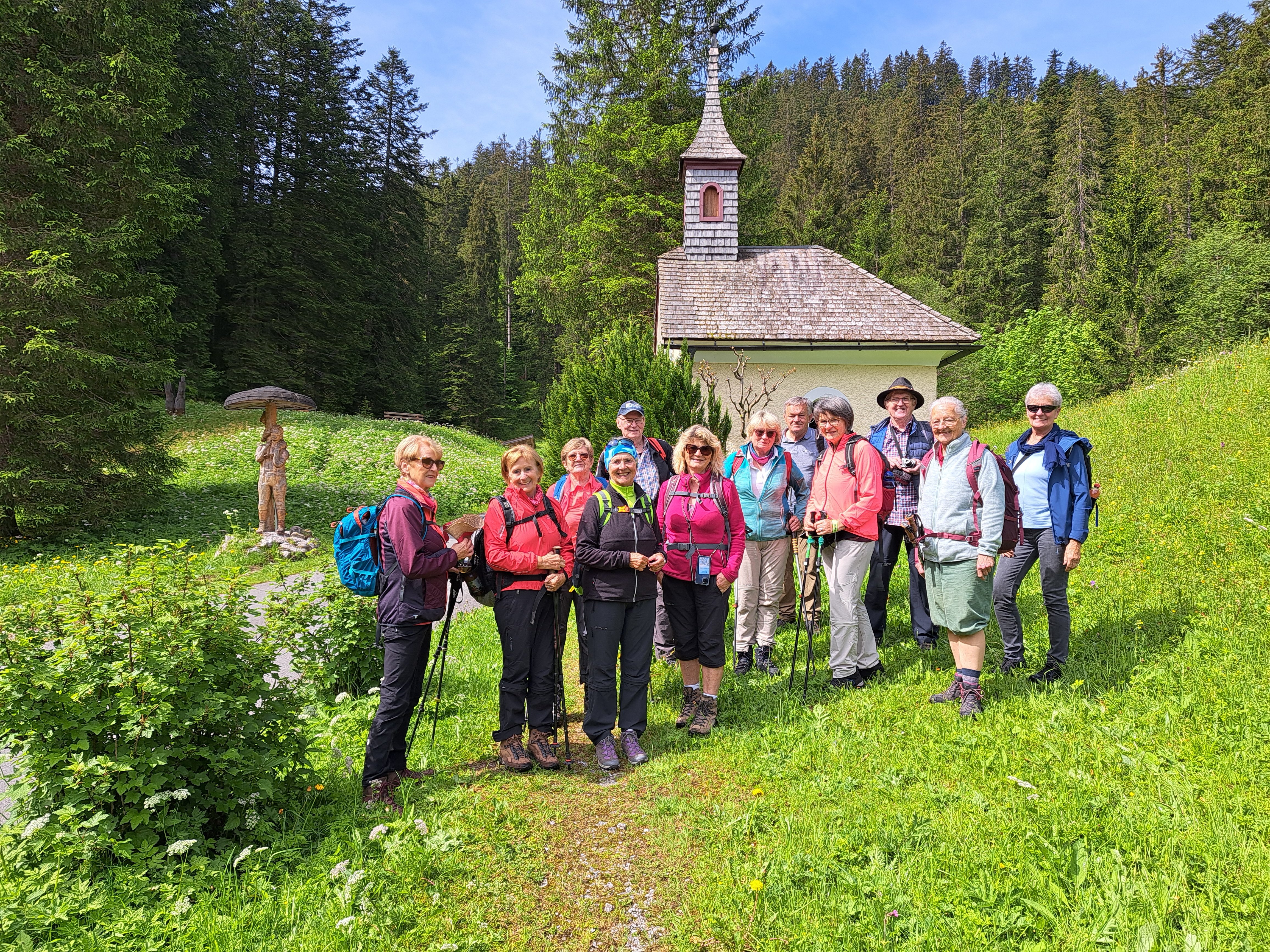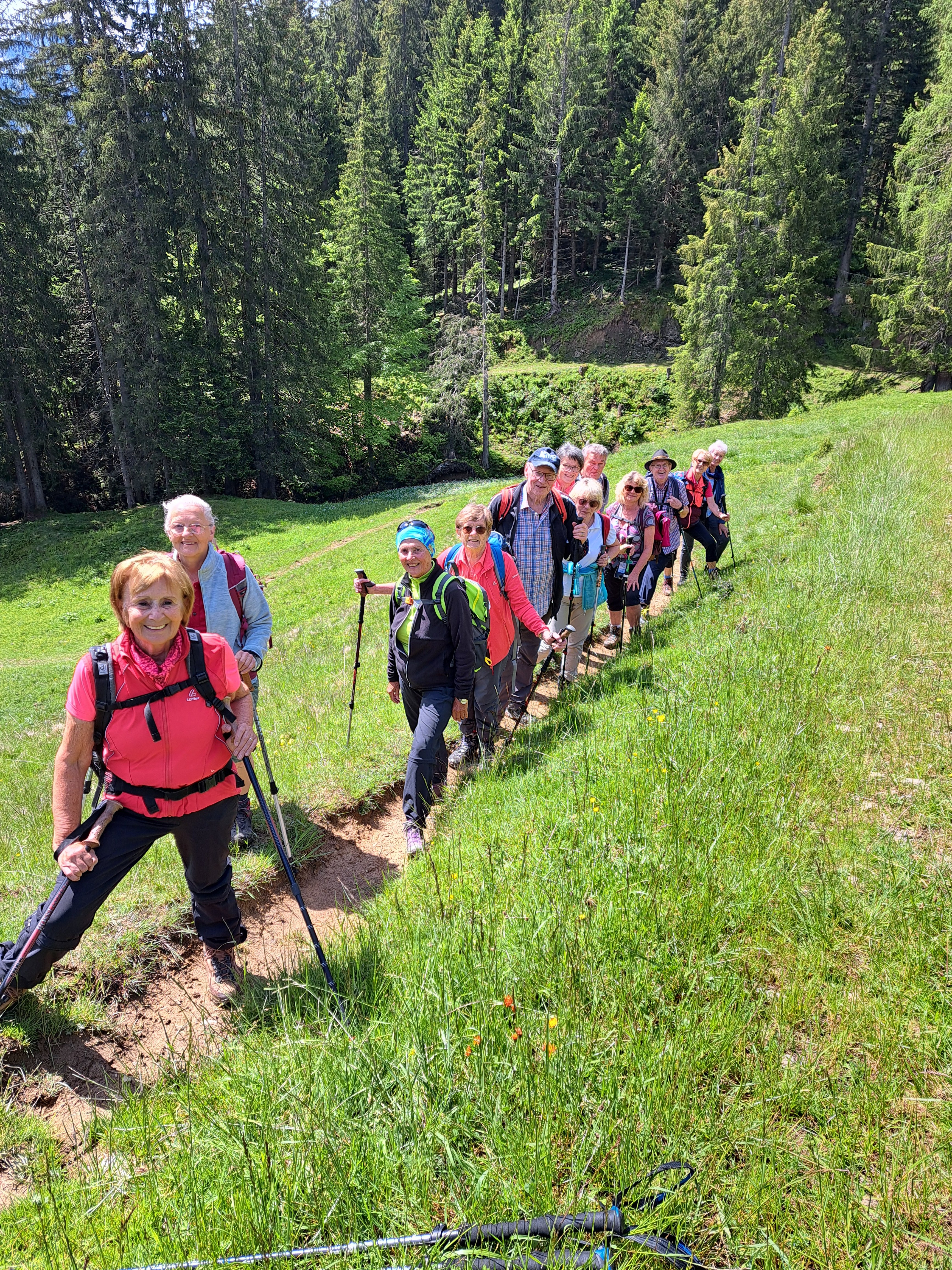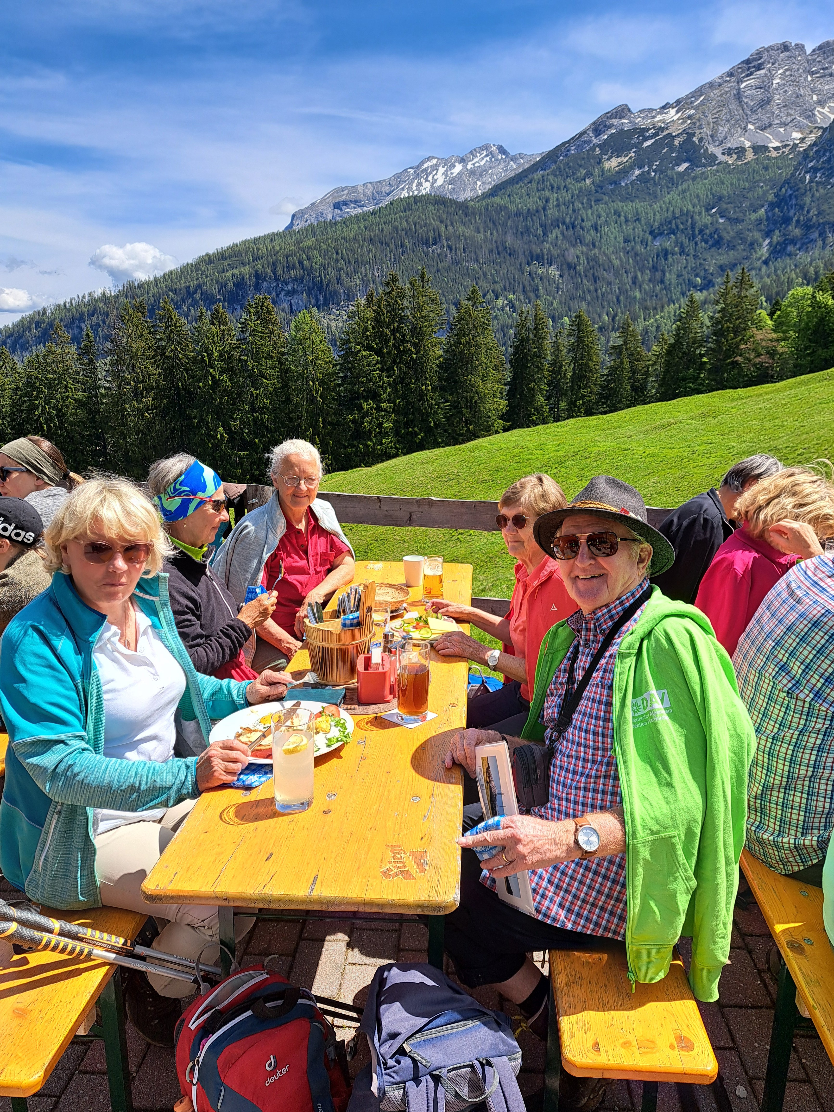 Ziel war die Litzlalm in den Berchtesgadener Alpen am Rande der Reiteralm. Die malerische Alm liegt in einer Höhe von 1310 m auf österreichischem Gebiet und gehört dort zum Pinzgau. Gestartet wurde am Nordende des Hintersees bei Ramsau. Mit dem Almerlebnisbus fuhr die Gruppe zunächst auf der für den normalen Verkehr gesperrten Straße hinauf nach Hirschbichl. Von dort ging es dann nach dem Grenzübertritt alpin weiter auf einem steilen Waldsteig bis zum unteren Ende der Litzlalm. Die Wanderer kamen in der Folge vorbei an blühenden Almwiesen und staunten über die zahlreichen über den Hang verstreuten Kaser. Bald war die Jausenstation am Querleitkaser erreicht. Dort konnten die Teilnehmer an der Wanderung mit einer ausgiebigen Rast nicht nur den Hunger stillen, sondern bei blauem Himmel auch das phantastische Gebirgspanorama genießen mit den mächtigen Gipfeln der Reiteralm und des Hochkalters sowie der Hocheisspitze und des Kammerlinghorns. Wegen der herrlichen Lage wurden auf der Litzlalm zahlreiche Heimatfilme und Serien gedreht. Auf einem Forstweg ging es wieder hinunter nach Hirschbichl und weiter auf gut gepflegten Wegen durch das beeindruckende Klausbachtal mit seinen Südabstürzen der Reiteralm. Vorbei an der Bindalm und über die Hängebrücke führte der Weg zurück zum Parkplatz am Klausbachtal-Haus. Von dort erfolgte die Rückfahrt nach Pfarrkirchen.