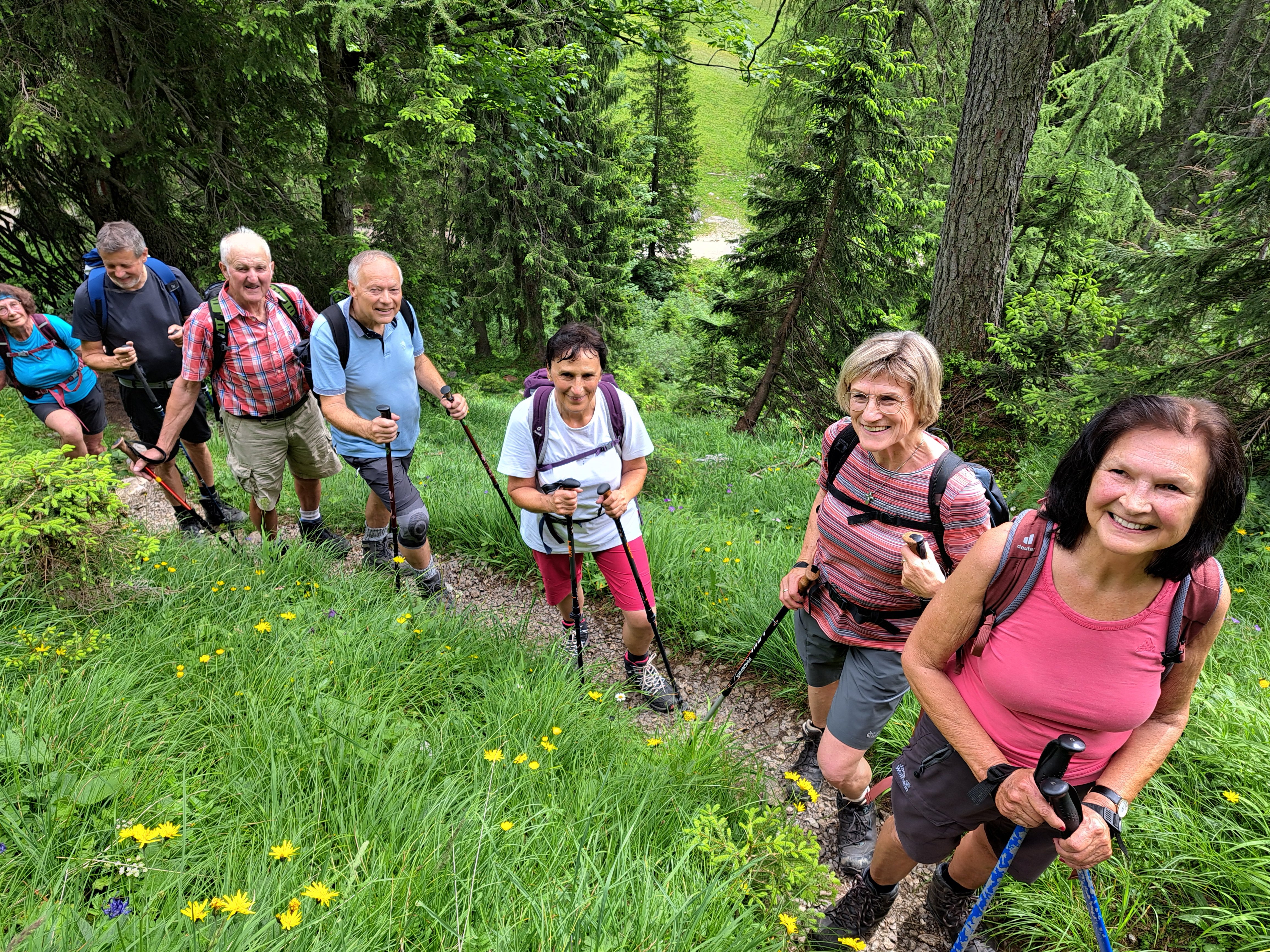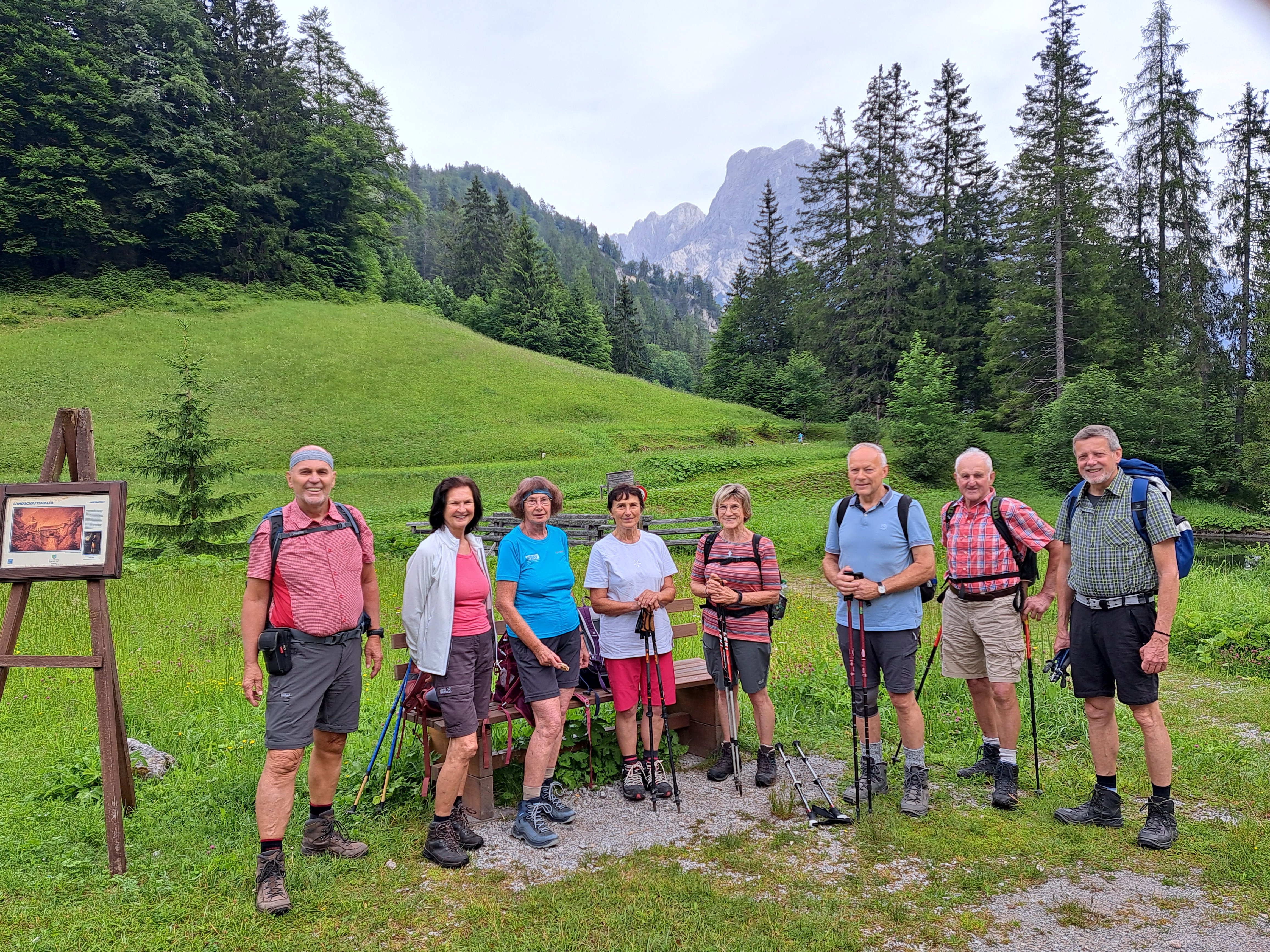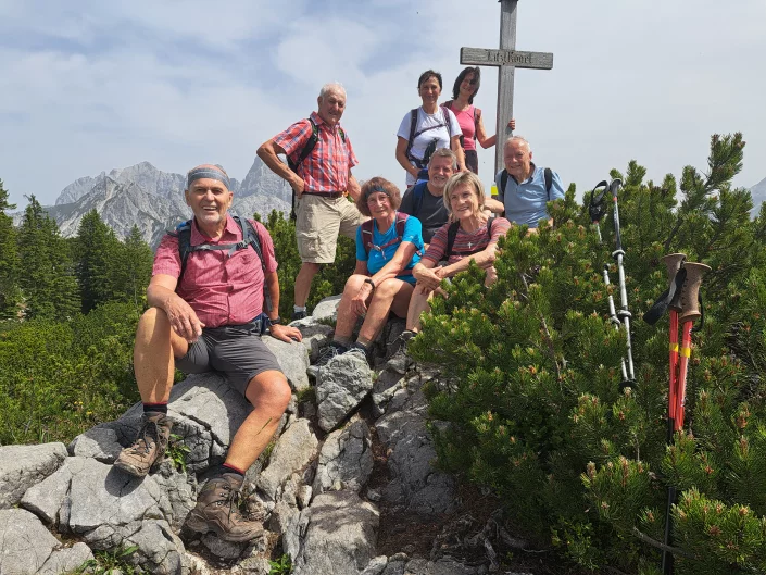 Am Morgen trübte der Sahara-Staub noch den Himmel. Pünktlich zum Start der Wanderung kam die Sonne heraus und versteckte sich den ganzen Tag auch nicht mehr, auch wenn der Himmel leider nicht immer blau war, weil viele Wolken umherzogen. Es wurde im Laufe des Tages immer wärmer (26° C). Ausgangspunkt der Wanderung war Hintersee bei Ramsau. Mit dem Almerlebnisbus fuhren wir von dem Parkplatz am Klausbachhaus bis Hirschbichl. Von dort ging es dann erst Richtung Westen auf der Teerstraße Richtung Weißbach über die österreichische Grenze. Nach ca. 500 m zweit rechts ein Steig in den Wald ab, der stetig steil bis zur Litzlalm führt. Diese erreichten wir nach einer halben Stunde. Eine weiter halbe Stunde benötigten wir, um an das Ende der Litzlalm zu gelangen, vorbei an zahlreichen schönen Kasern, die über die gesamte Alm verteilt stehen. Am Ende führte ein Forstweg bergauf bis zu einer Kuppe. Bevor es dort wieder bergab geht, zweigt rechts der Felsensteig zum Gipfel ab. Dieser war in einer halben Stunde erreicht. Dabei war ein wenig Klettergeschick nötig, auch wenn ein Drahtseil als Aufstiegshilfe diente. Aber kurz vor dem Gipfel waren nur die Wurzeln der Latschen hilfreich, um die schwierigen Kletter-Passagen zu meistern. Alle haben es problemlos geschafft. Treffliche Rundumsicht belohnte für die Strapazen des Aufstieges: Im Westen die Loferer- und Leoganger Steinberge, der Hochkranz in der Nachbarschaft, das Seehorn, das Kammerlinghorn, Steintal- und Ofentalhröndl, Hochkalter, Berchtesgadener Hochthron, Mühlsturzhörner, Stadlhorn, Mayrbergscharte, Wagendrischelhorn, Häuselhörner und einige weitere Gipfel der Reiteralm.