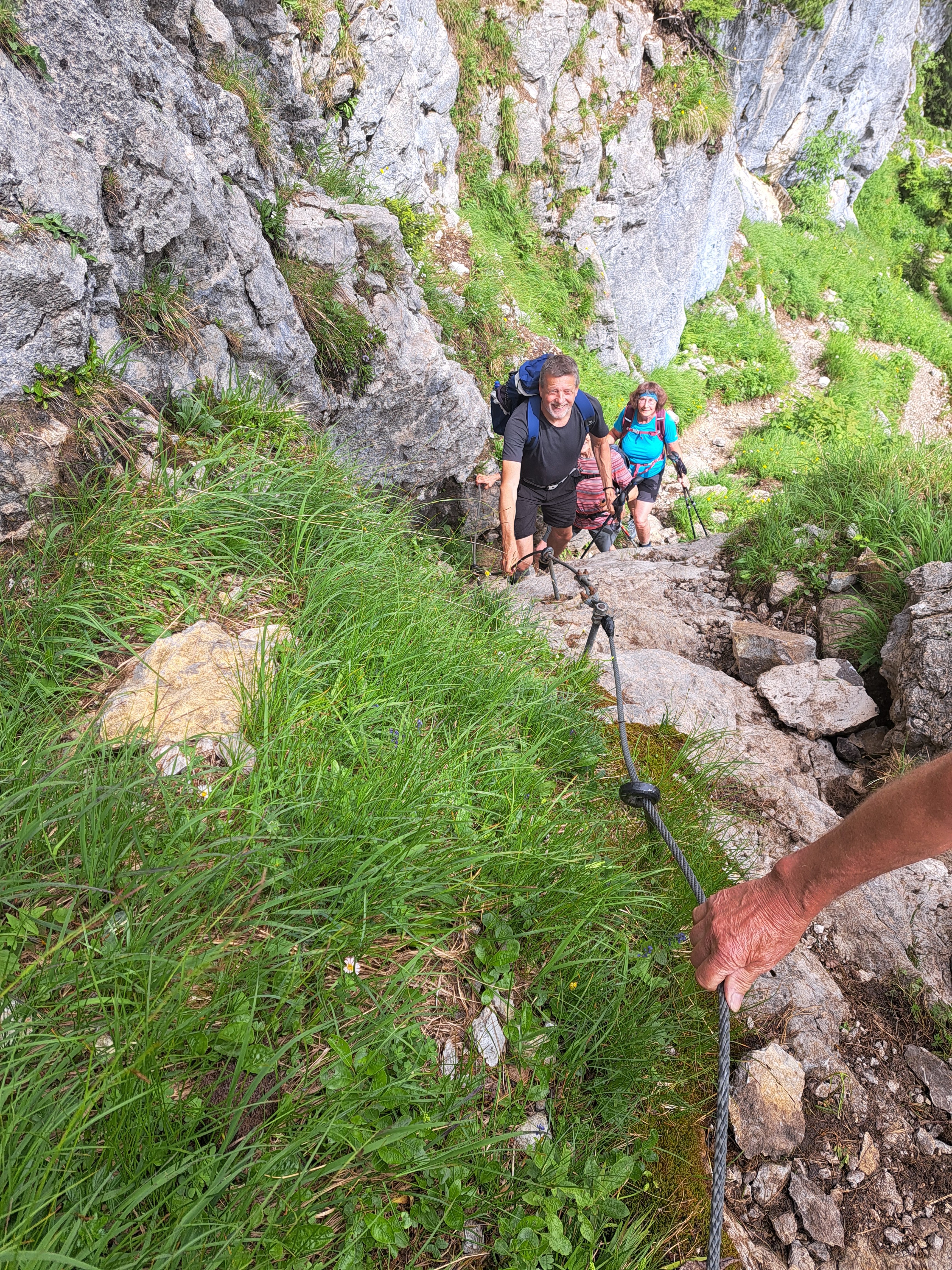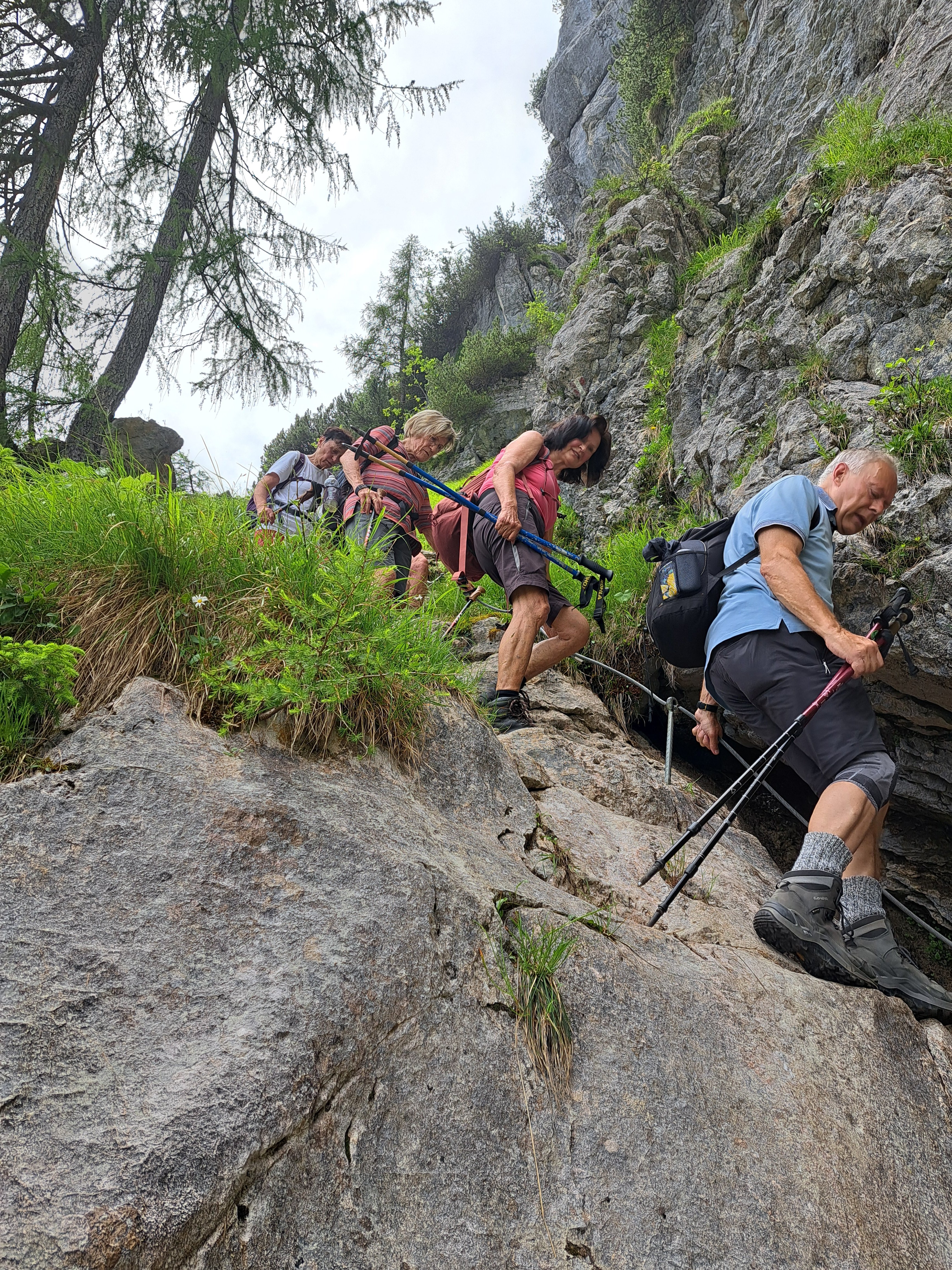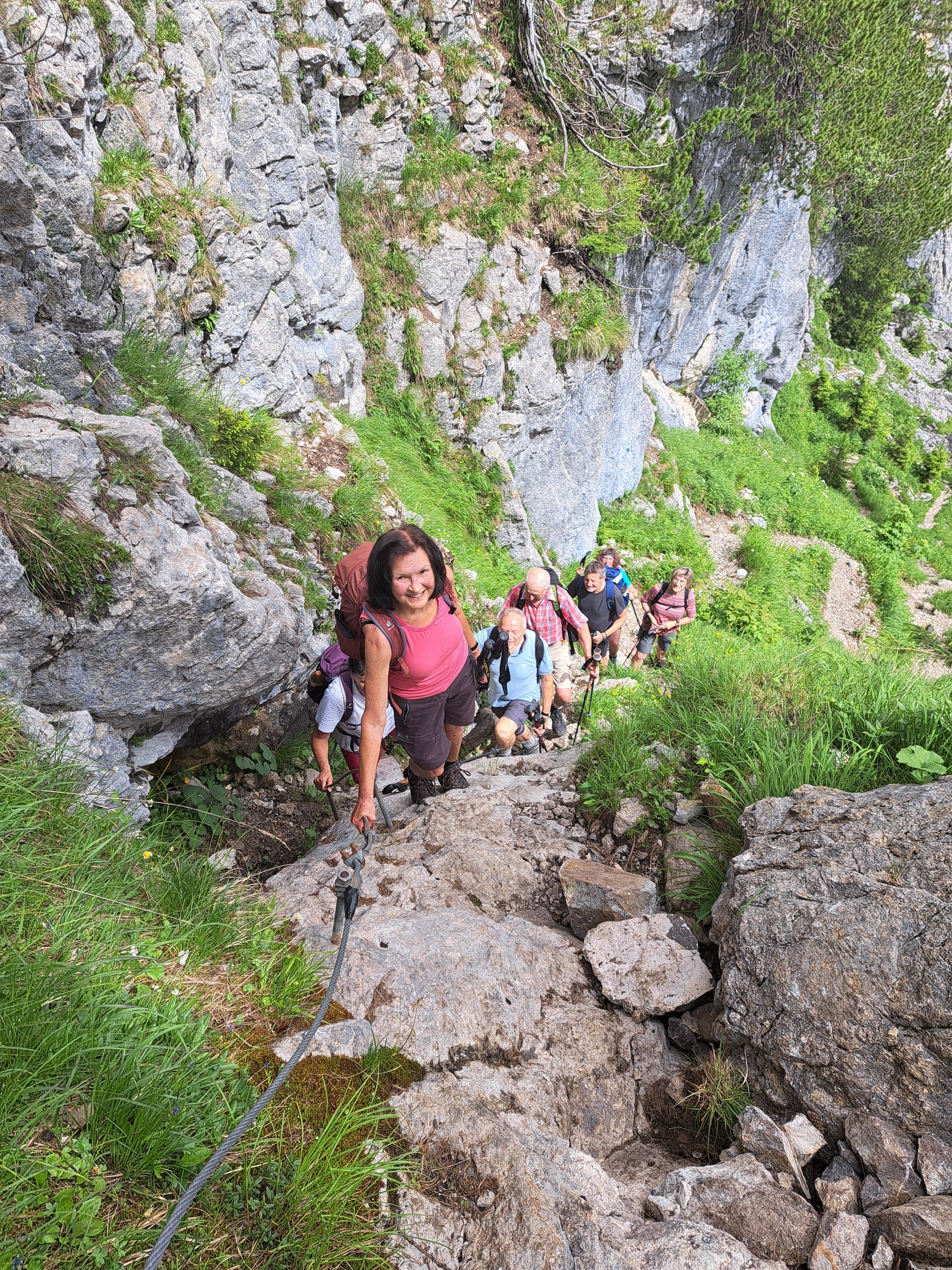 Am Morgen trübte der Sahara-Staub noch den Himmel. Pünktlich zum Start der Wanderung kam die Sonne heraus und versteckte sich den ganzen Tag auch nicht mehr, auch wenn der Himmel leider nicht immer blau war, weil viele Wolken umherzogen. Es wurde im Laufe des Tages immer wärmer (26° C). Ausgangspunkt der Wanderung war Hintersee bei Ramsau. Mit dem Almerlebnisbus fuhren wir von dem Parkplatz am Klausbachhaus bis Hirschbichl. Von dort ging es dann erst Richtung Westen auf der Teerstraße Richtung Weißbach über die österreichische Grenze. Nach ca. 500 m zweit rechts ein Steig in den Wald ab, der stetig steil bis zur Litzlalm führt. Diese erreichten wir nach einer halben Stunde. Eine weiter halbe Stunde benötigten wir, um an das Ende der Litzlalm zu gelangen, vorbei an zahlreichen schönen Kasern, die über die gesamte Alm verteilt stehen. Am Ende führte ein Forstweg bergauf bis zu einer Kuppe. Bevor es dort wieder bergab geht, zweigt rechts der Felsensteig zum Gipfel ab. Dieser war in einer halben Stunde erreicht. Dabei war ein wenig Klettergeschick nötig, auch wenn ein Drahtseil als Aufstiegshilfe diente. Aber kurz vor dem Gipfel waren nur die Wurzeln der Latschen hilfreich, um die schwierigen Kletter-Passagen zu meistern. Alle haben es problemlos geschafft. Treffliche Rundumsicht belohnte für die Strapazen des Aufstieges: Im Westen die Loferer- und Leoganger Steinberge, der Hochkranz in der Nachbarschaft, das Seehorn, das Kammerlinghorn, Steintal- und Ofentalhröndl, Hochkalter, Berchtesgadener Hochthron, Mühlsturzhörner, Stadlhorn, Mayrbergscharte, Wagendrischelhorn, Häuselhörner und einige weitere Gipfel der Reiteralm.