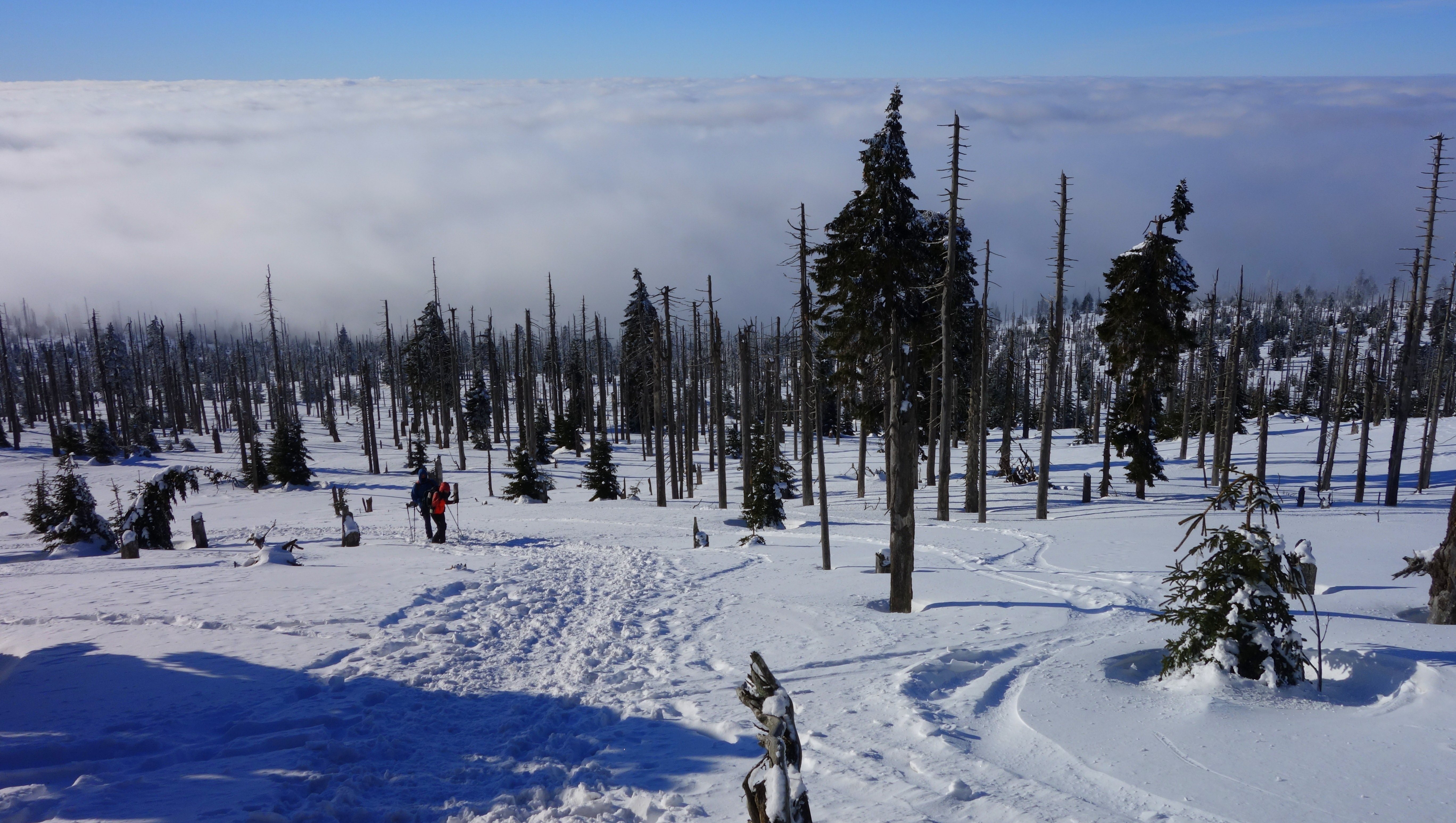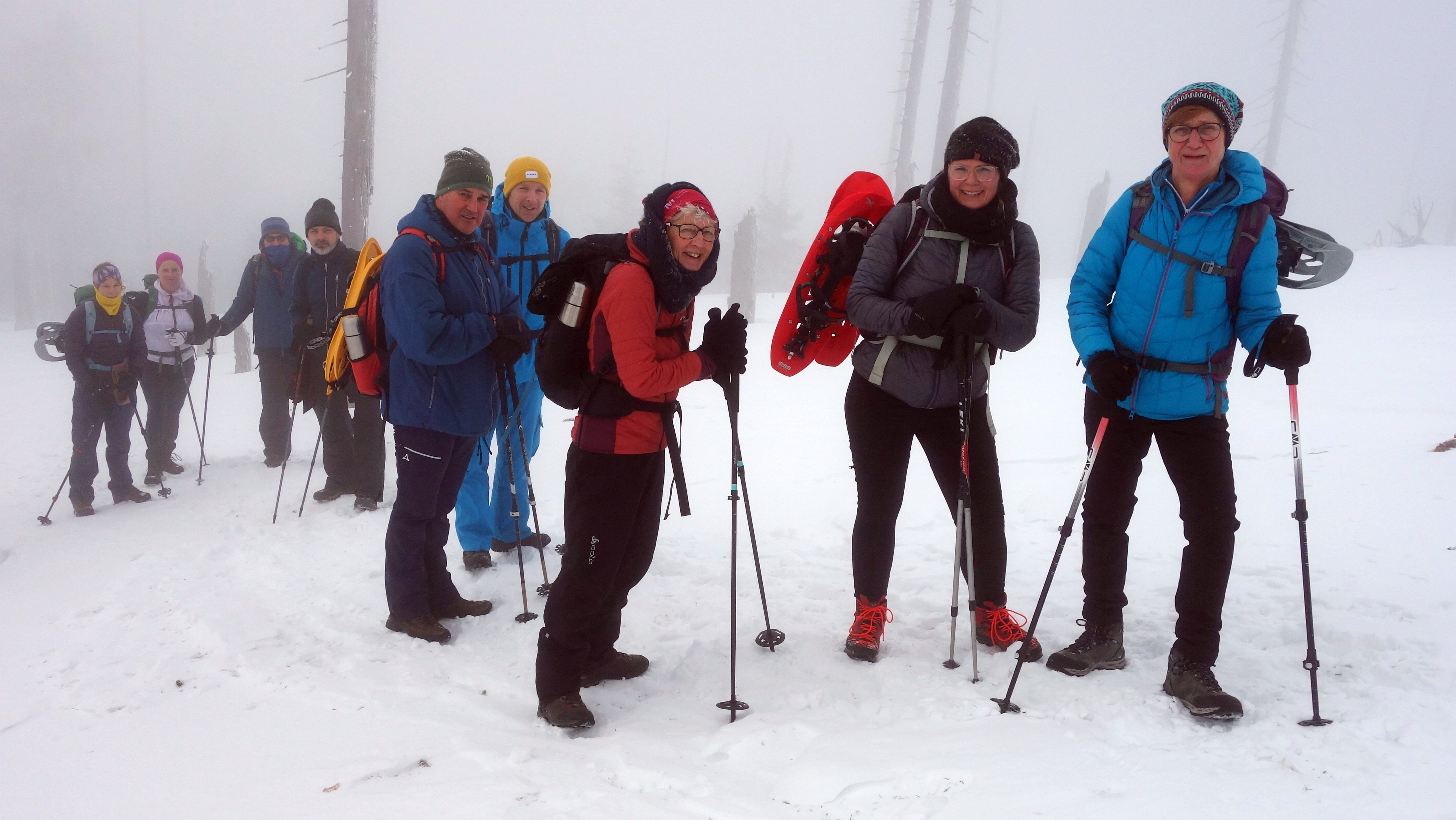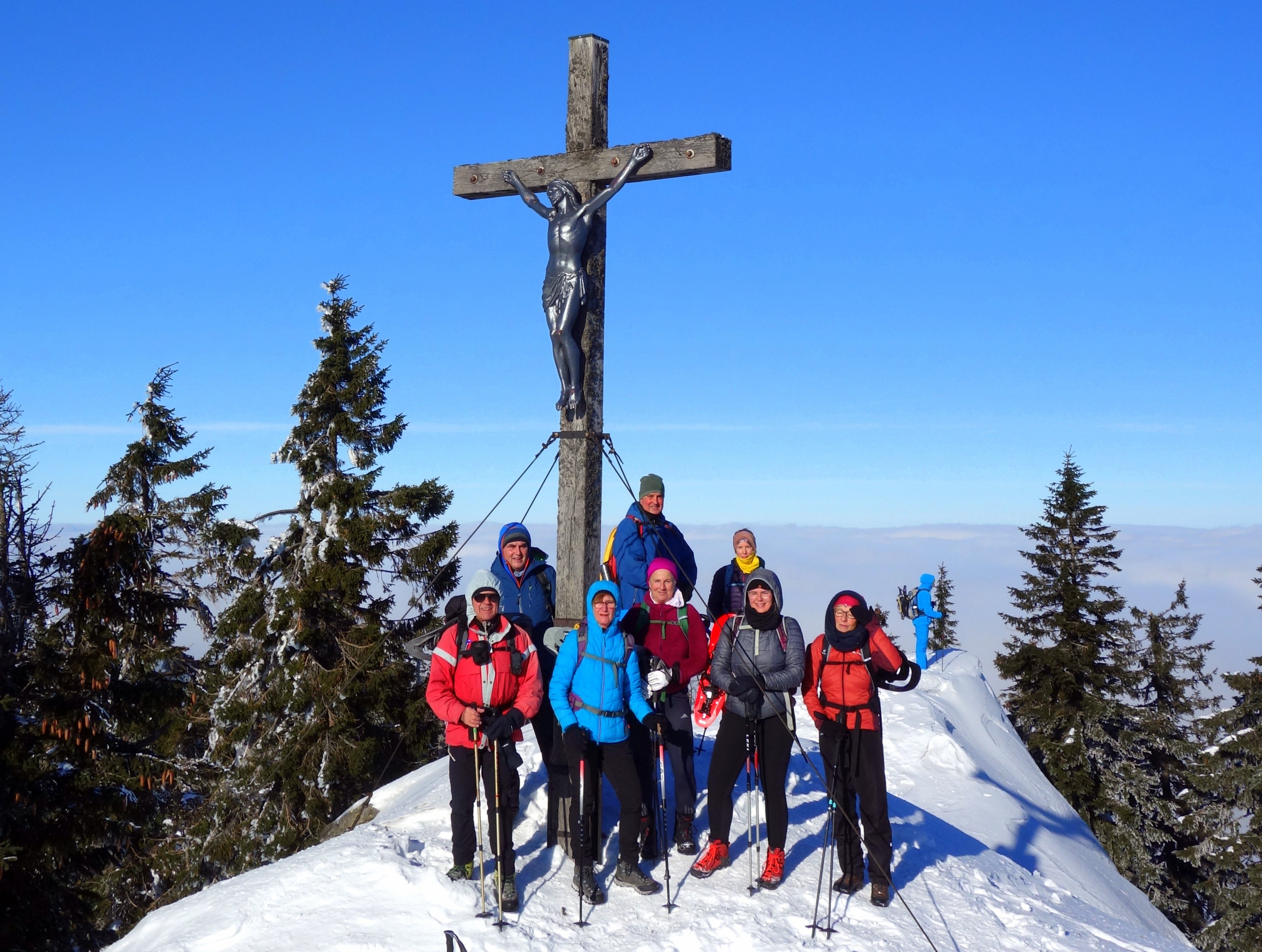 10 Mitglieder der DAV Sektion Pfarrkirchen stiegen unter der Leitung von Karl-Heinz Hager bei kalten Winterwetter auf den Großen Rachel (1452m). Der zweithöchste Gipfel im Bayerwald ist zwar nicht so bekannt, wie der Große Arber, hat aber gerade deswegen seine eigenen Reize: Unberührte Natur, kilometerlange Wege im Kerngebiet des Nationalparks Bayerischer Wald. Ausgangspunkt für diese herrliche Tour war der Parkplatz Klingenbrunn Bahnhof. Der untere Abschnitt des Weges war komplett schneefrei. Etwa auf Höhe der Unterstandshütte lag dann Schnee, der hart gefroren war, sodass auf ausgetretener Spur die Schneeschuhe nicht zum Einsatz kamen. Etwa auf Höhe des Waldschmidthauses wurde die Wolkenschicht durchdrungen, und es wurde immer sonniger. Leider hinderte ein eisiger Wind die Gruppe, hier eine Pause einzulegen. Nach einer Gehzeit von 2 1/2 Stunden wurde der Gipfel erreicht. Die Gipfelpause wurde im Windschatten auf der Sonnenseite der Bergwachthütte genossen. Der Abstieg zum Parkplatz wurde auf dem selben Weg durchgeführt.