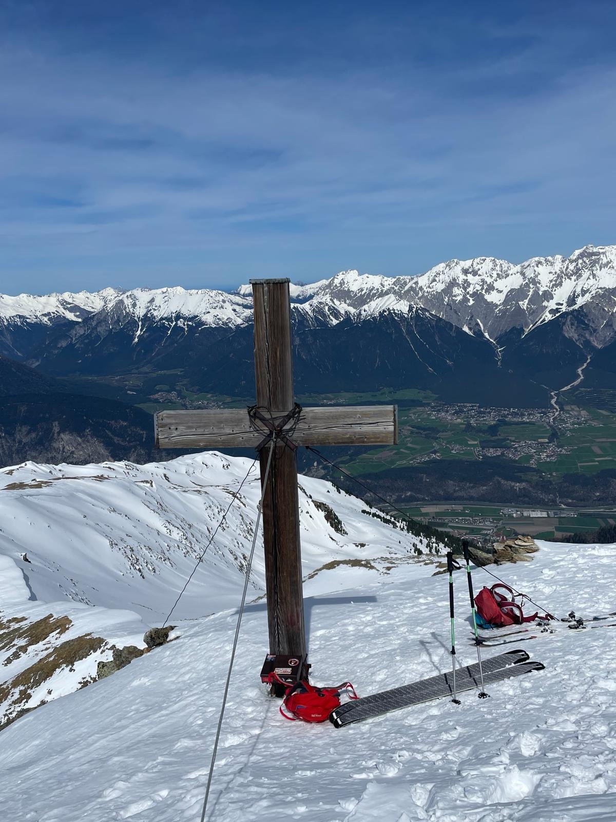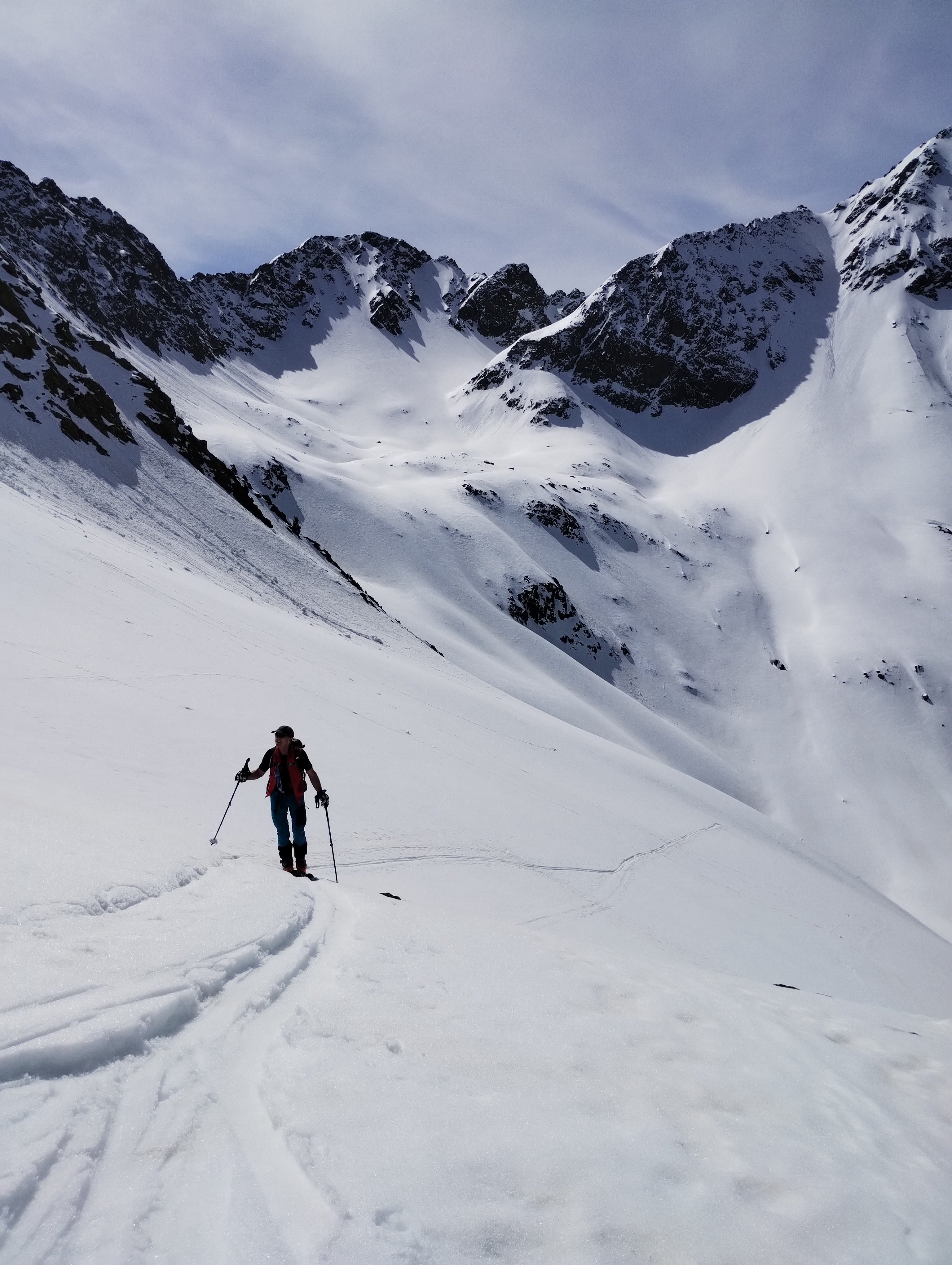 07.04.: Auffahrt mit der Kaiserbahn, Aufstieg zum Pirchkogel von Osten, Abfahrt nach Osten und Norden durch das Schneetal Richtung Stamser Alm (oben windgepresster Pulver! unten tiefer Sulz). Wiederaufstieg in das Kreuzjoch, zuletzt sehr steil. Abfahrt nach Süden bis kurz vor die Kühtaier Straße, zuletzt kurz Ski tragen (sulzig, aber fahrbar). Mit dem Bus zurück zur Hütte. Heimfahrt.