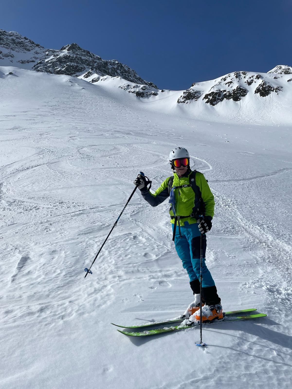 06.04.: Fahrt zum Sattele (Nähe Ochsengarten), Aufstieg von Westen zum Pirchkogel (2828 m) über die Feldringalm und Schafjoch. Abfahrt über Aufstiegsweg, oben guter Firn unten tiefer Sulz. Einkehrschwung auf der Sonnenterasse der Feldringalm. (insg. 1200 hm, 16 km)