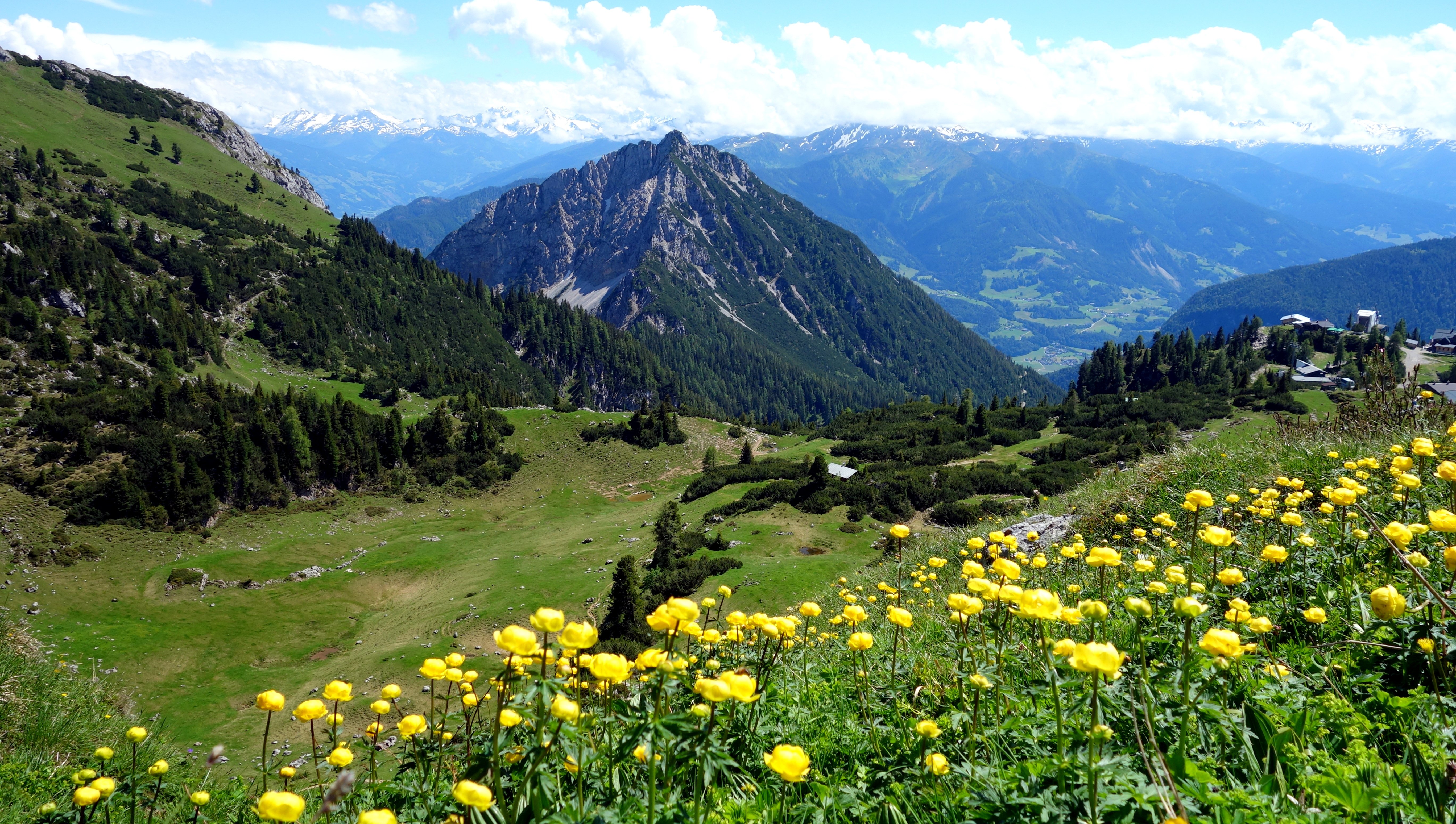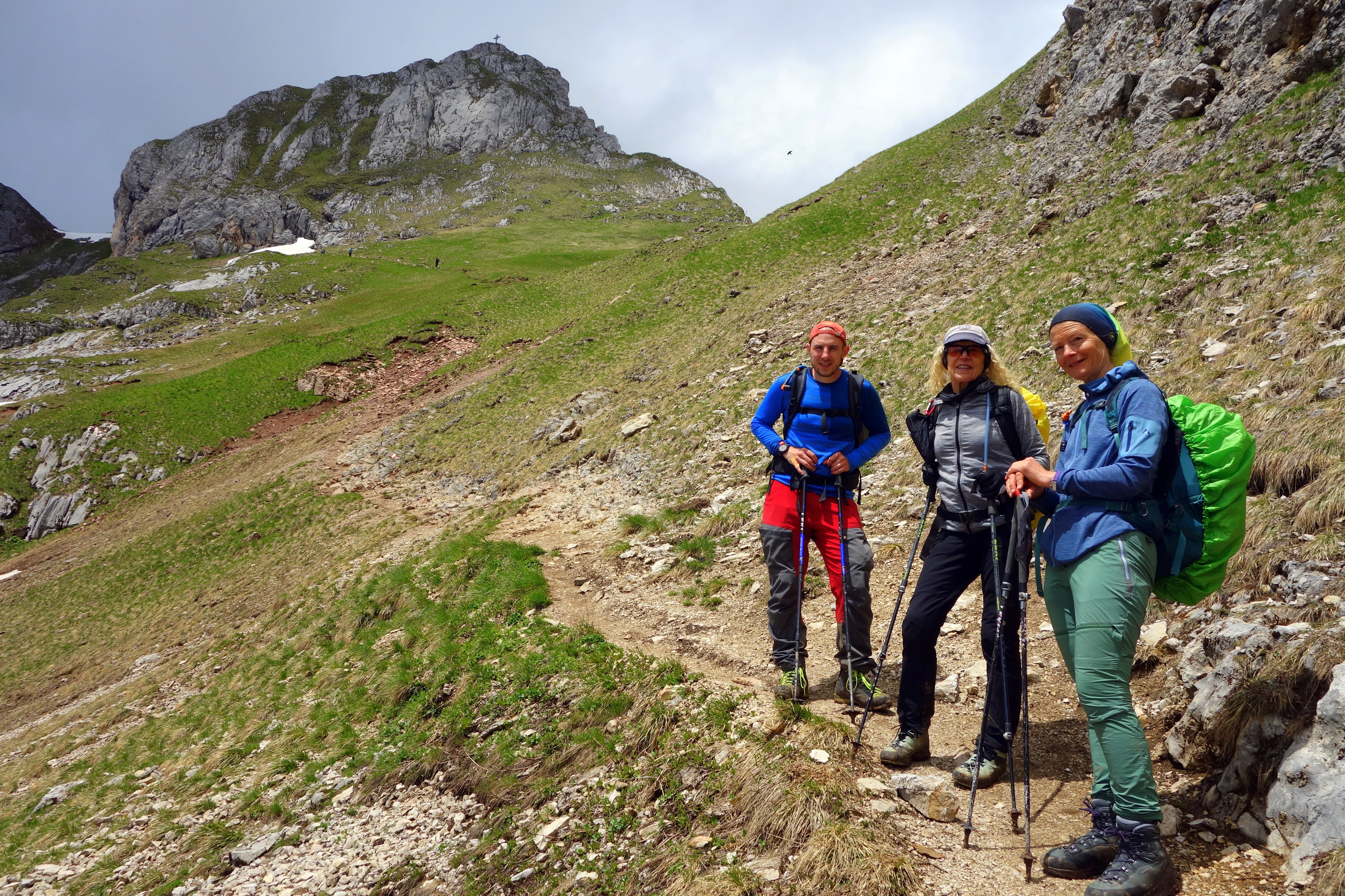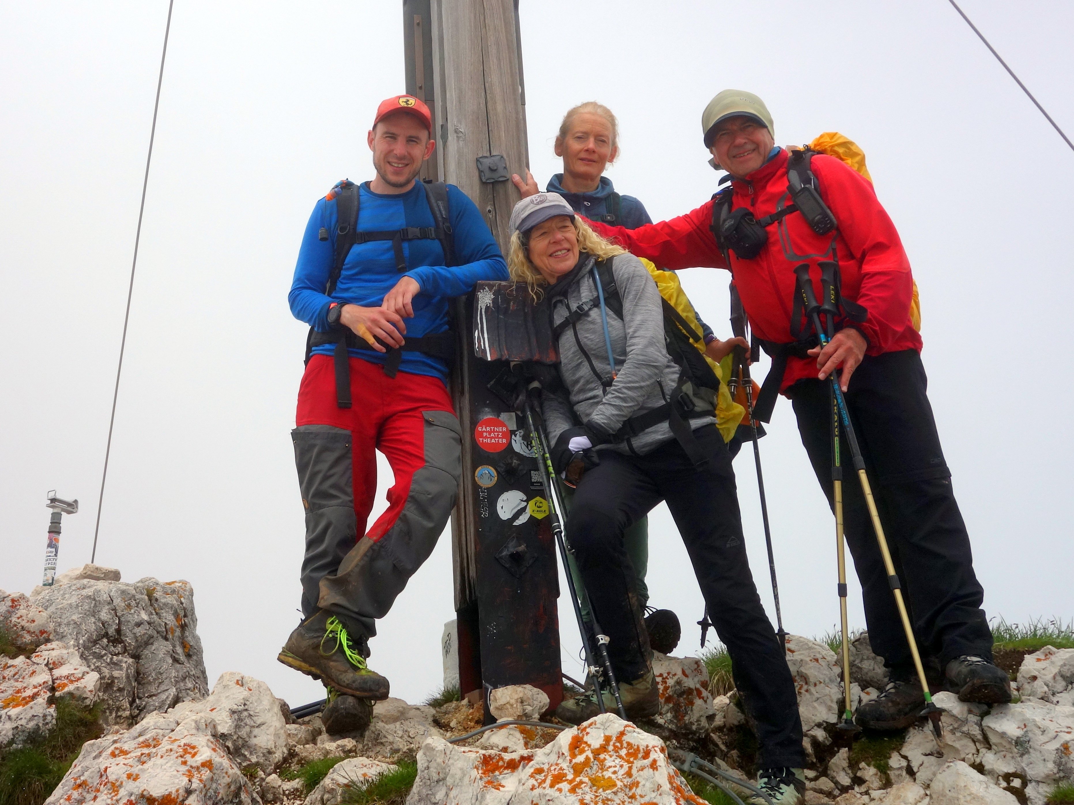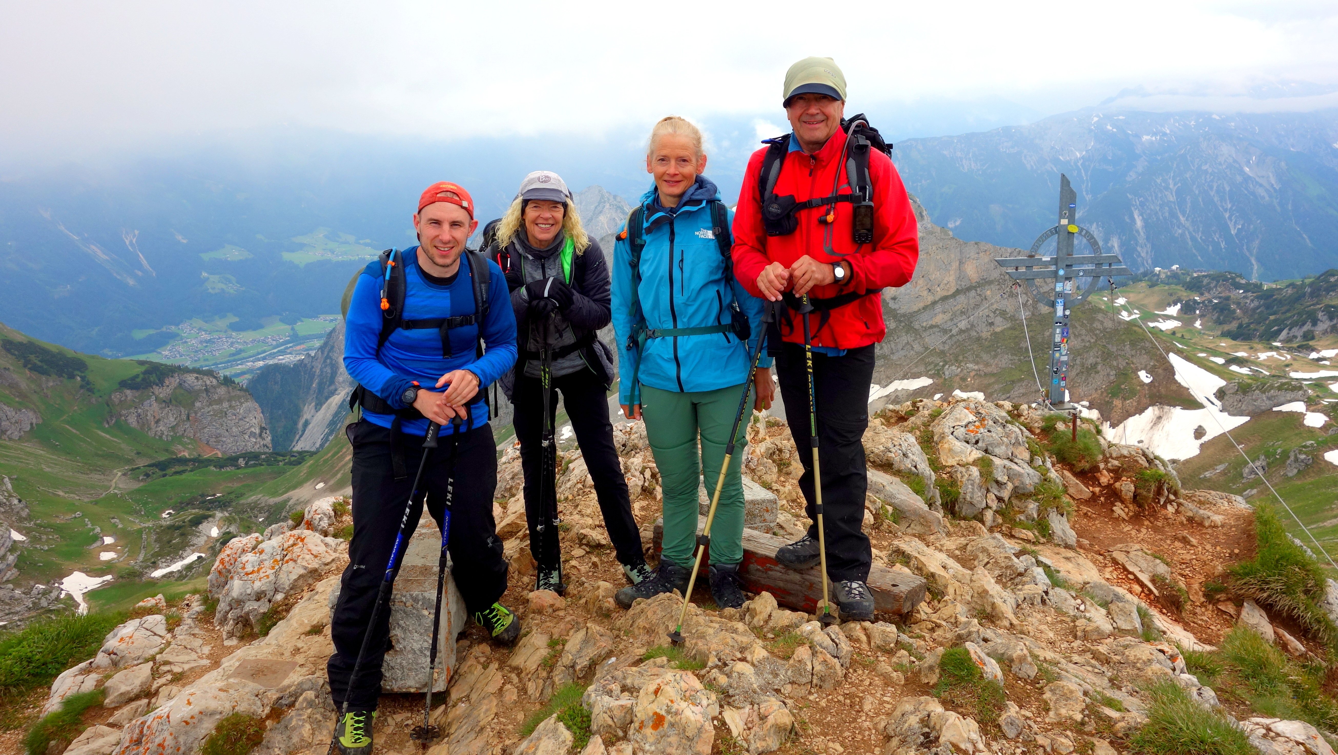Vier wetterfeste Bergsteiger fuhren zwei Tage ins Rofangebirge. Ausgangspunkt für diese Tour war der Parkplatz an der Seilbahn. Mit dieser fuhren die Bergsteiger hinauf zur Erfurter Hütte (1831m), die direkt neben der Bergstation der Seilbahn liegt. Gleich nach dem Einchecken ging es los zur Rofanspitze (2259m), die nach ca. 1 ½ Std. erreicht wurde. Nach einer kurzen Pause wurde der nächste Gipfel, der Zagzahn (2228m) ins Visier genommen. Der Aufstieg über den Klettersteig war aber zu rutschig, so dass der Tourenleiter Karl-Heinz Hager entschied, über den Normalweg hinauf zusteigen. Auch hier war Trittsicherheit angesagt, da auch dieser Steig wegen der Nässe sehr anspruchsvoll war. Der Dritte Gipfel an diesem Tag, das Vordere Sonnwendjoch (2224m) wurde nach 3 ½ Std. Gehzeit erreicht. Auf diesem Wegabschnitt boten sich immer wieder tolle Ausblicke hinunter zum Inntal. Der vom Wetterbericht angesagte Regen fiel nicht so ergiebig aus, aber trotzdem war der gesamte Weg immer wieder sehr schlammig. Der Rückweg zur Hütte erfolgte vorbei an der Schermsteinalm (1870m), dann hinauf zum Krahnsattel (2230m), und über den Adlerweg zurück zur Hütte, die nach 12 km Wegstrecke und knapp 1000 Höhenmetern Auf- und Abstieg erreicht wurde. Da es in der Nacht zum Sonntag starken Niederschlag gab, waren die Wege am Sonntag immer noch sehr rutschig, sodass die Klettersteigausrüstung nicht zum Einsatz kam. Das erste Ziel, der Rosskopf (2246m) wurde in ca. 2 Std. erreicht. Hier war der rutschige und ausgesetzte Normalanstieg schon eine Herausforderung an die Bergsteiger. Etwas einfacher war der Aufstieg zur Seekarlspitze (2261m), hier steht ein 3,3 m hohes Gipfelkreuz aus Granit. Dieses Gipfelkreuz (2700 kg Granit, 2500 kg Beton und 700 Arbeitsstunden) hat ein ganz besondere Entstehungsgeschichte, siehe Internet. Auf dem Weg zum nächsten Gipfel, dem Spieljoch (2236m) wurde das Wetter immer besser, und ein böiger Wind trocknete die Wege zunehmend. Am höchsten Gipfel, die Hochiss (2299m) wurde dann die Mittagspause genossen und die Aussicht auf die umliegenden Berge wurde immer besser. Am letzten Gipfel, dem Gschöllkopf (2039m) mit der Adlerhorst-Aussichtsplattform konnte zum Abschluss dieser Tour die Aussicht auf alle bestiegenen Gipfel genossen werden, bevor es wieder zurück zur Erfuter Hütte ging. Hier fand noch eine kurze Einkehr statt, bevor es mit der Seilbahn wieder hinunter zum Parkplatz ging.