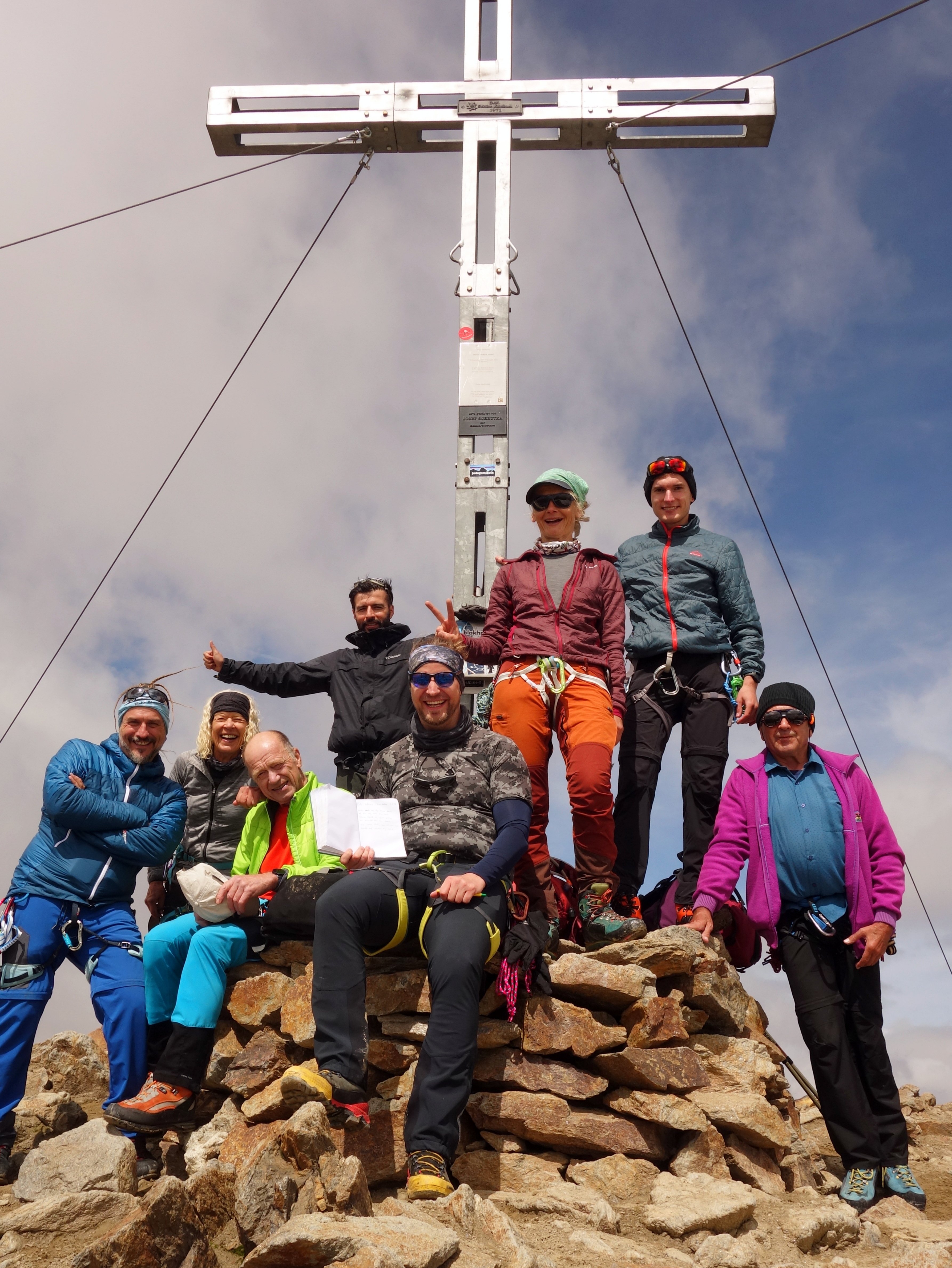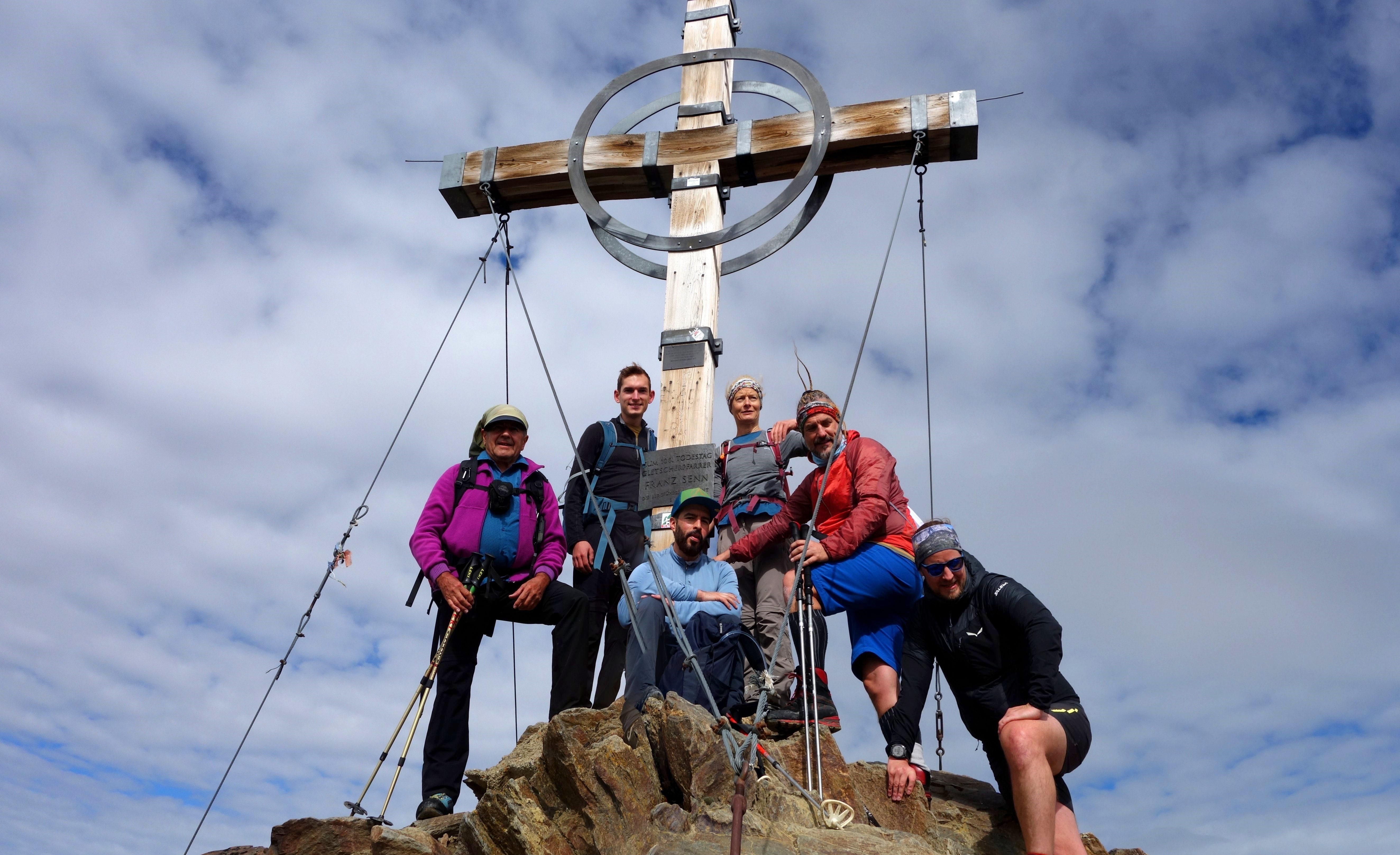 Am nächsten Morgen stiegen die Bergsteiger auf die Kreuzspitze (3455m) den Hausberg der Hütte. Auf diesem Gipfel wird keine Gletscherausrüstung benötigt, so dass mit leichtem Rucksack der Gipfel in knapp 2 ½ Std. erklommen werden konnte. Auch auf diesem Gipfel hatte man eine herrliche Aussicht, die von der Weißkugel bis zu den Stubaier Alpen reichte. In ca. 2 Std. Abstiegszeit wurde die Hütte wieder erreicht. Nach einer weiteren Pause wurden die Rucksäcke wieder voll bepackt und es ging wieder 8 km hinunter nach Vent, weiter mit dem Vereinsbus zurück nach Pfarrkirchen. Auf dieser Hochtour wurden in knapp 40 km Wegstrecke etwa 2800 Höhenmeter überwunden.