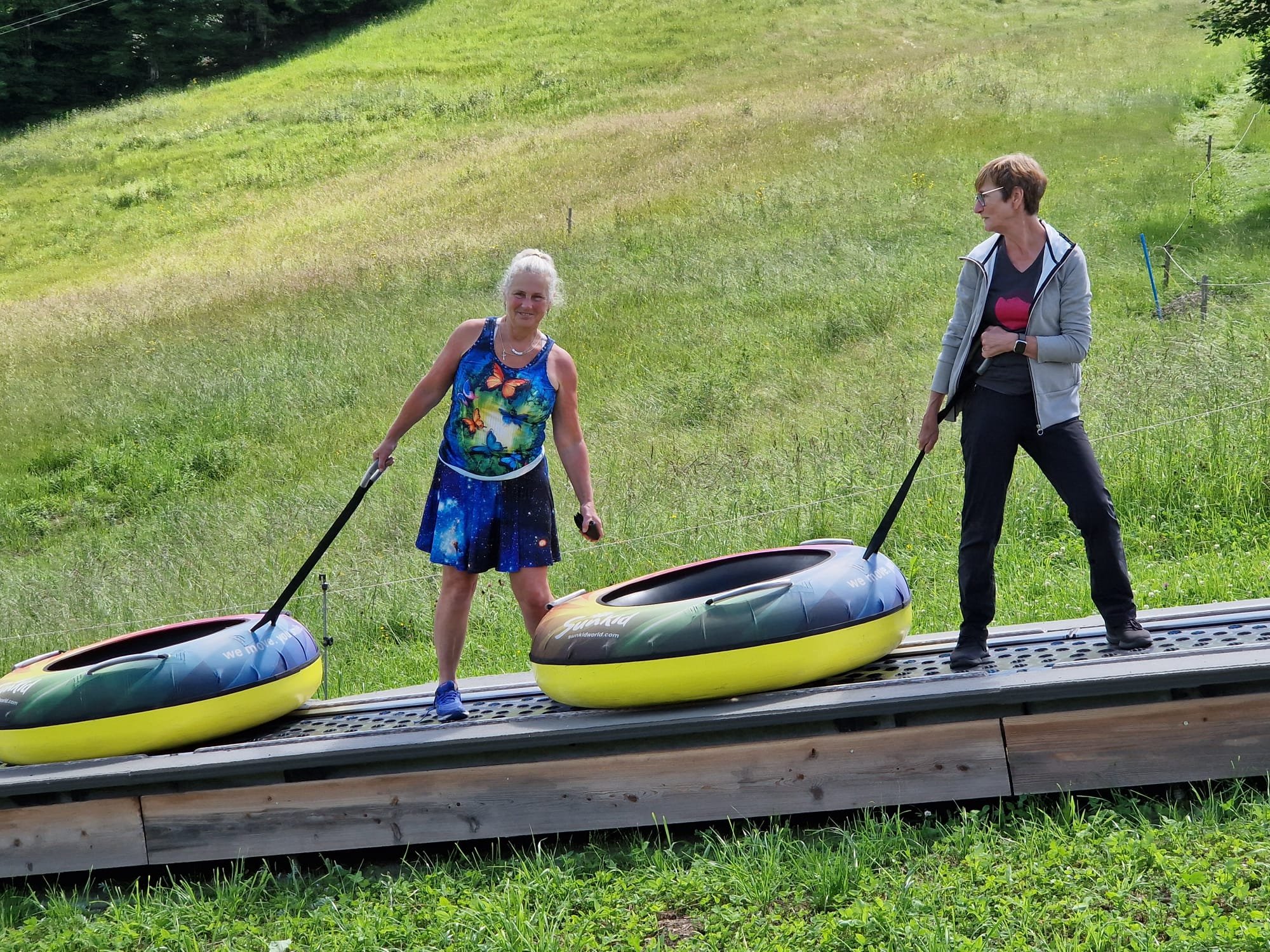Somit war man eher wieder am Parkplatz Schmelz und konnte im Tal noch eine gepflegte Einkehr auf der Sonnenterasse der Kessel-Alm folgen lassen, wo zwei Teilnehmerinnen sogar noch die Riesenreifenrutsche ausprobierten.